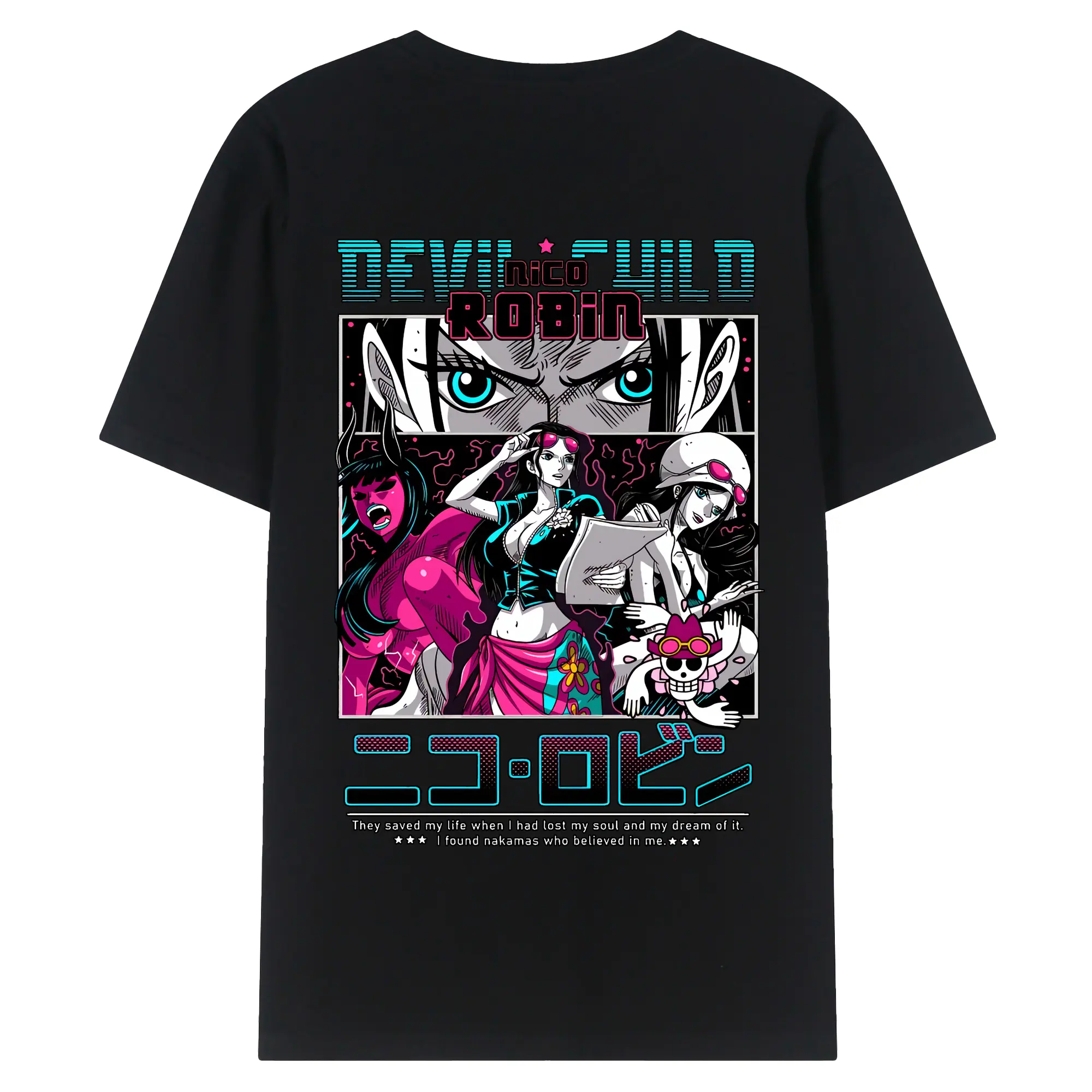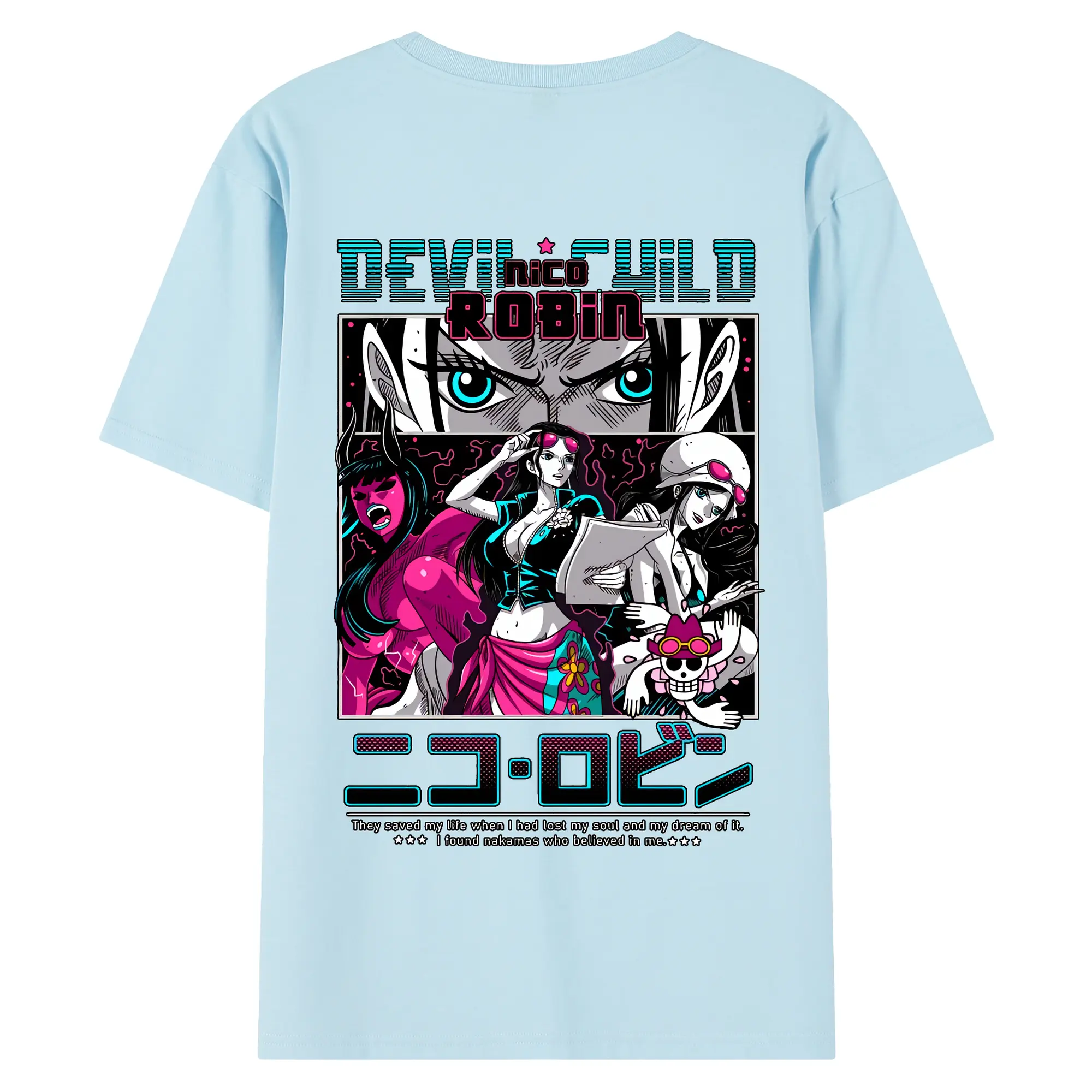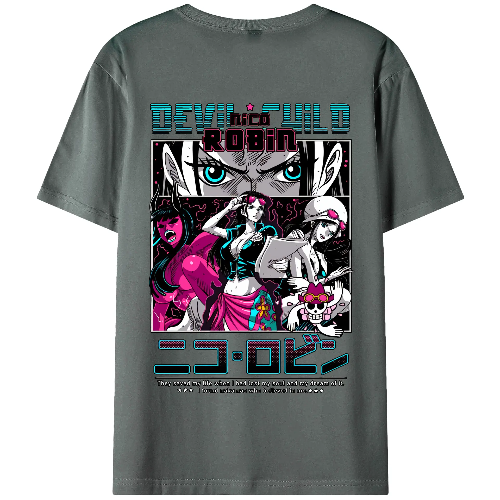 ワンピース グッズ ニコ・ロビン - 綿100% ヴィンテージ風 半袖Tシャツ ・ 背面プリント ・ 柔らか肌触り ・ 通気性 快適 ・ スポーツ カジュアル 外出用