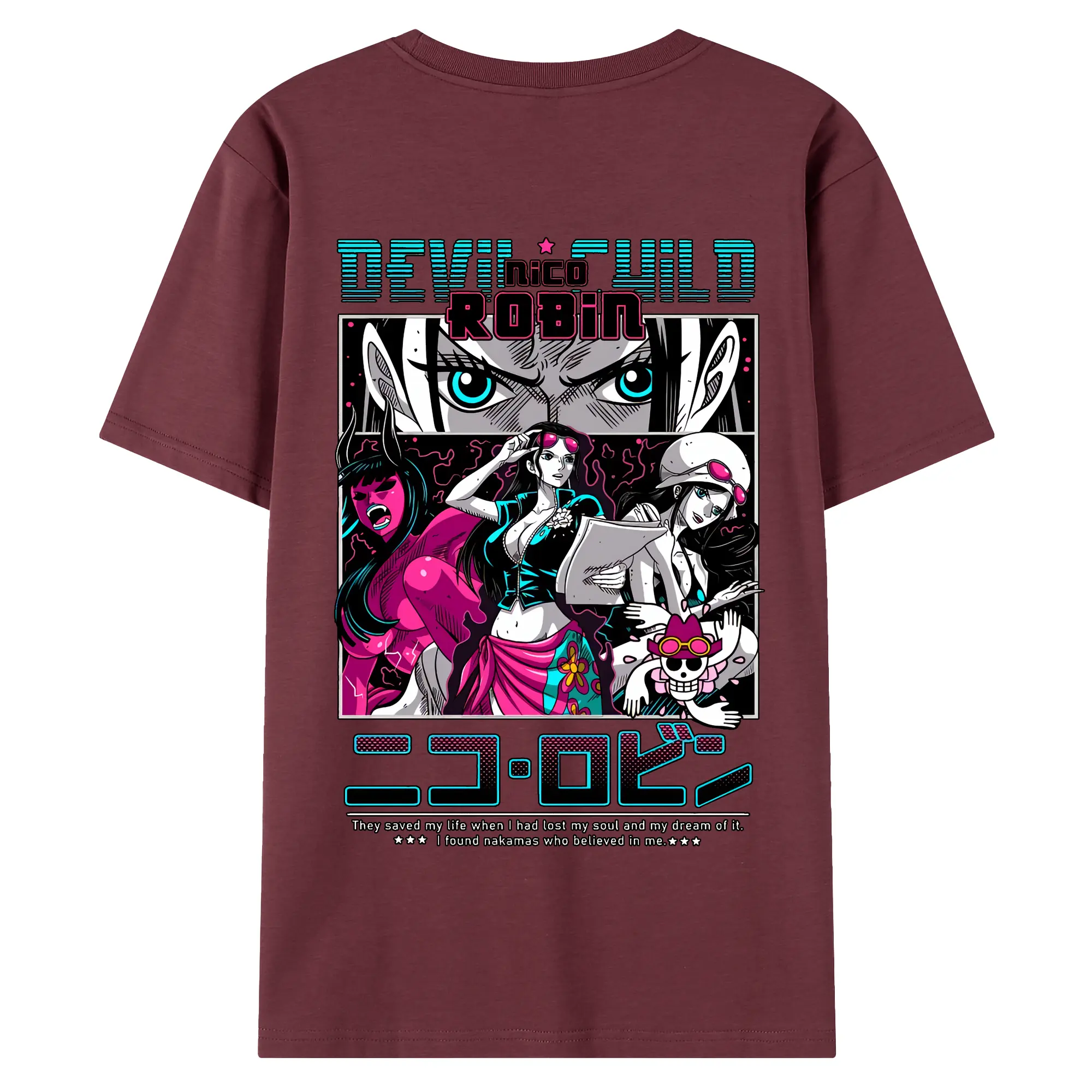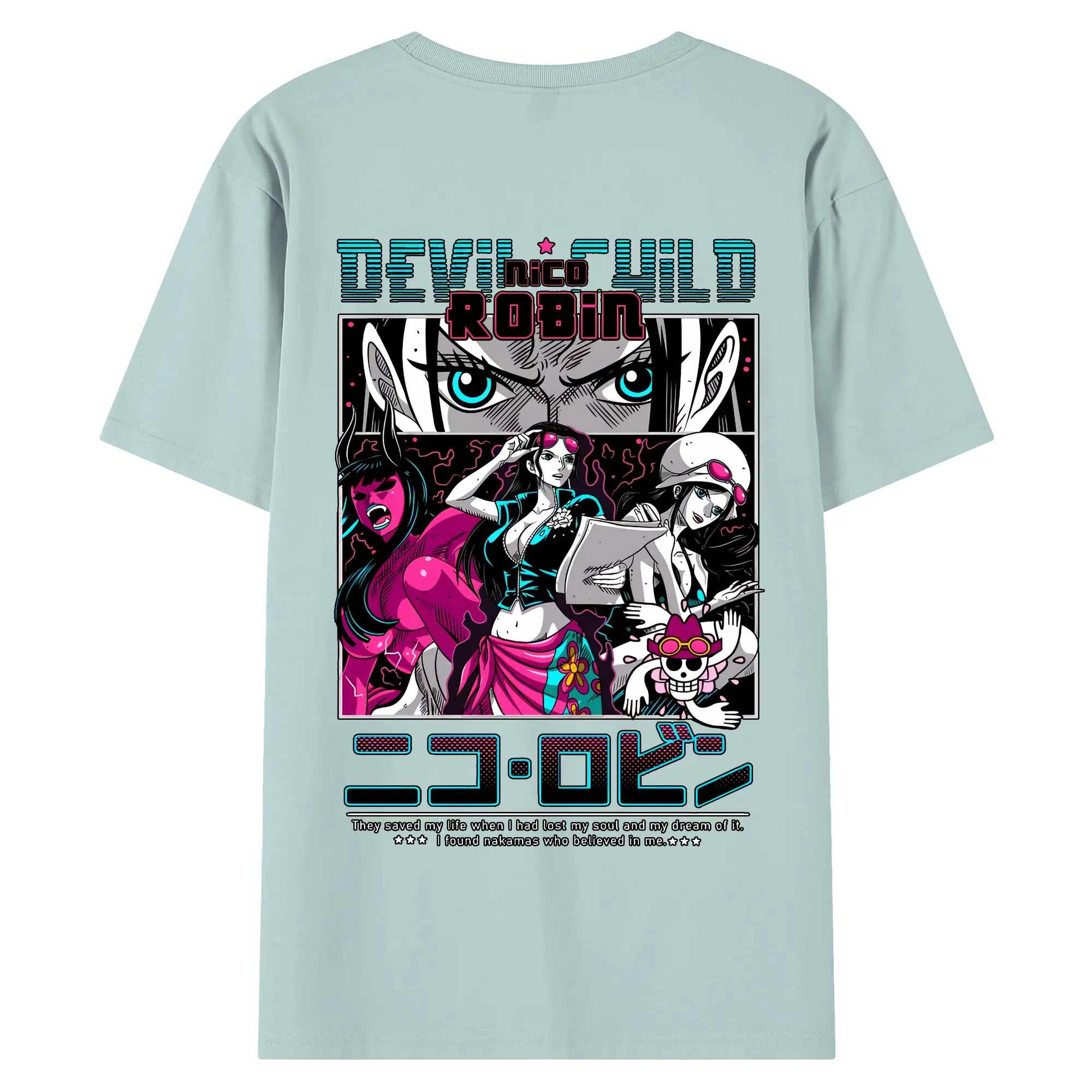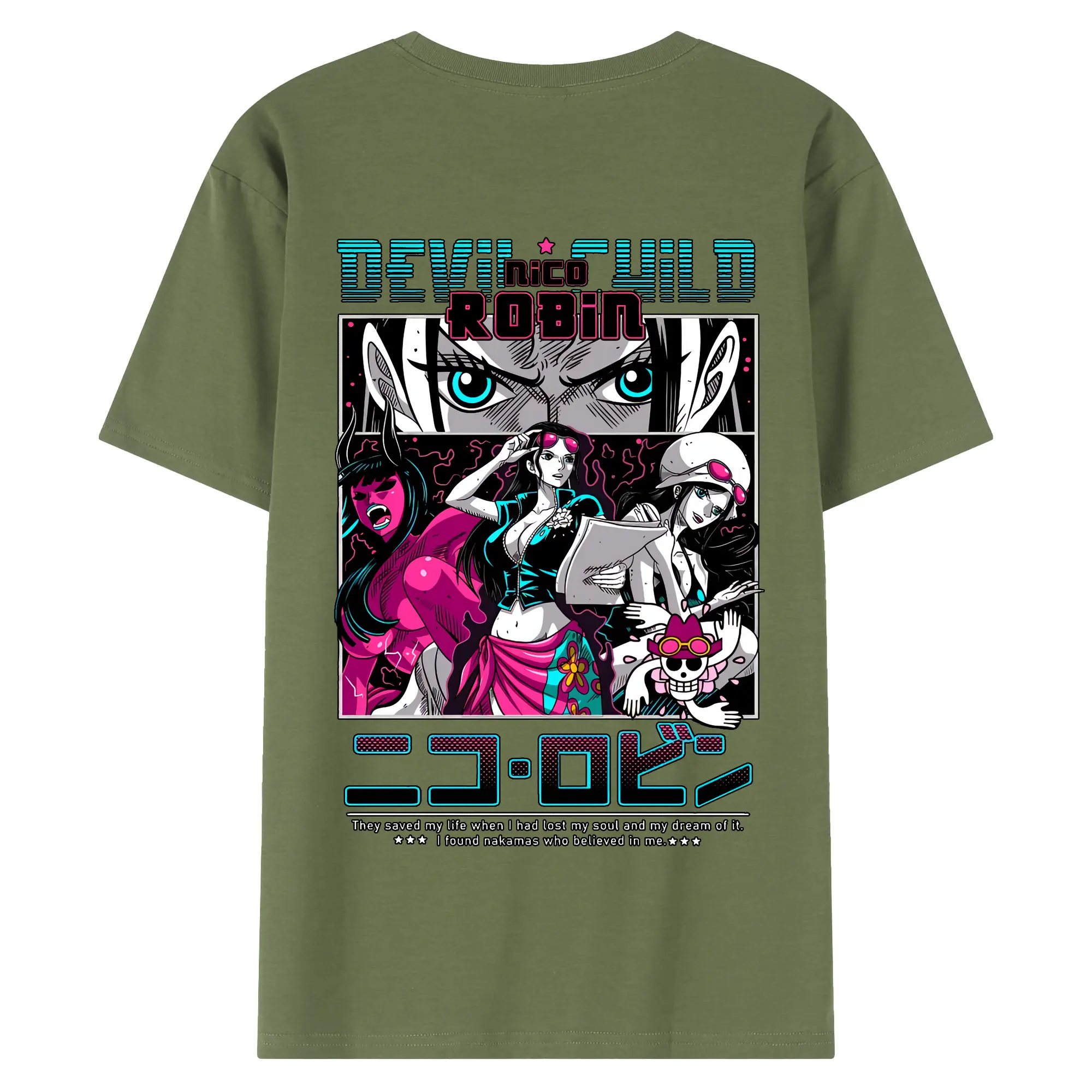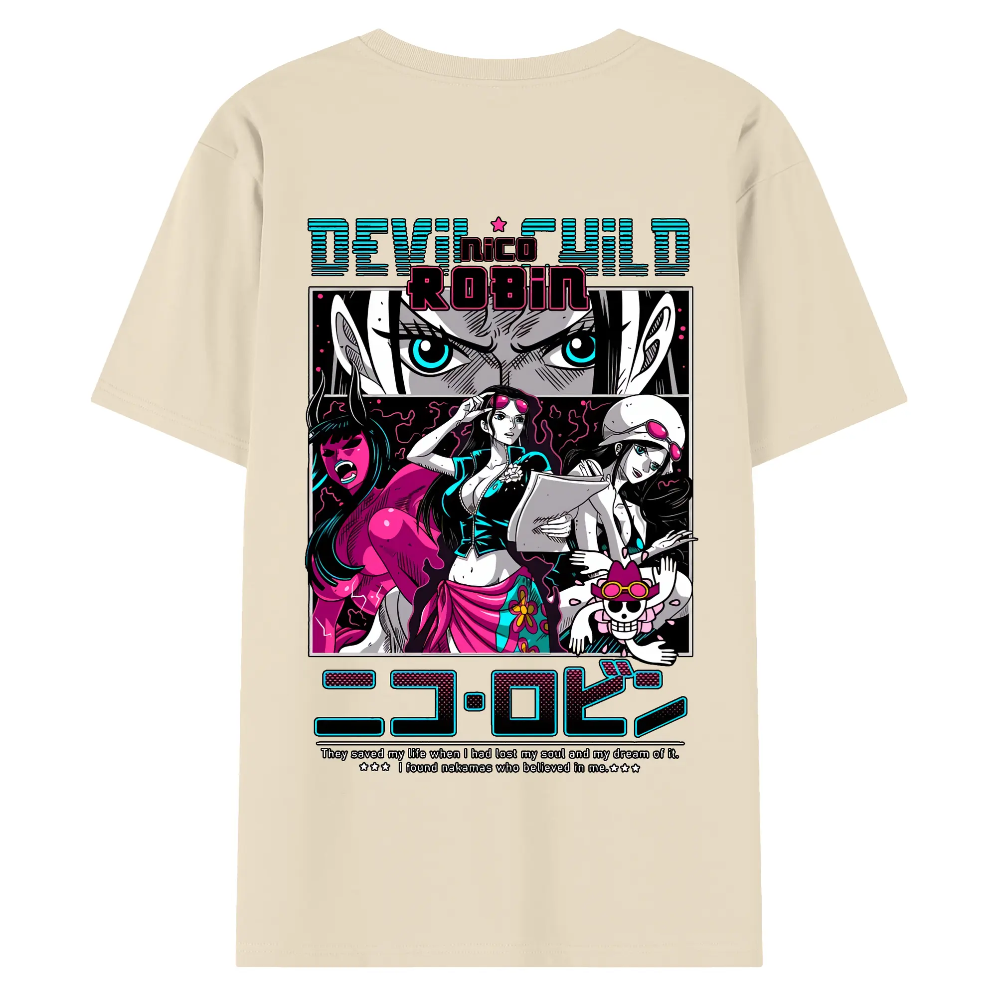 ワンピース グッズ ニコ・ロビン - 綿100% ヴィンテージ風 半袖Tシャツ ・ 背面プリント ・ 柔らか肌触り ・ 通気性 快適 ・ スポーツ カジュアル 外出用