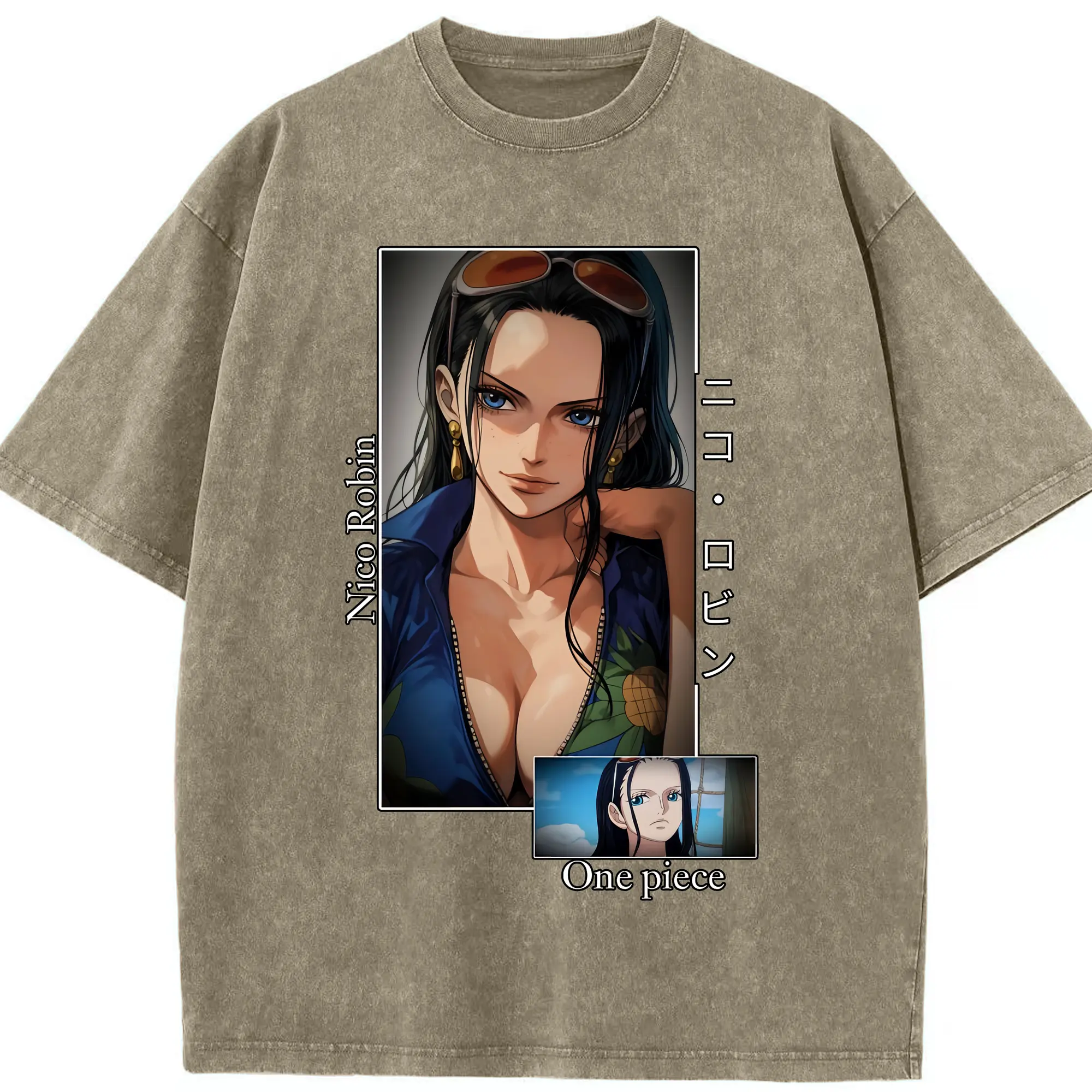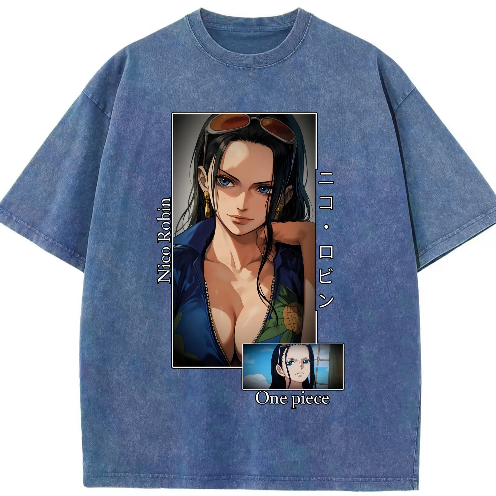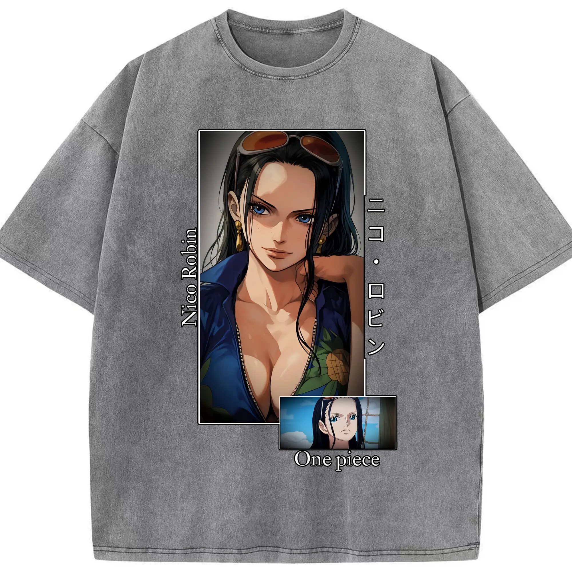 ワンピース グッズ ニコ・ロビン - 綿100% ヴィンテージ風 半袖Tシャツ ・ 背面プリント ・ 柔らか肌触り ・ 通気性 快適 ・ スポーツ カジュアル 外出用