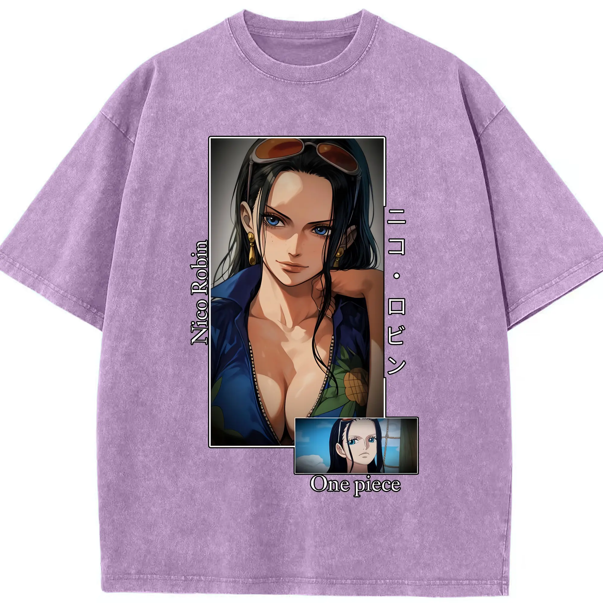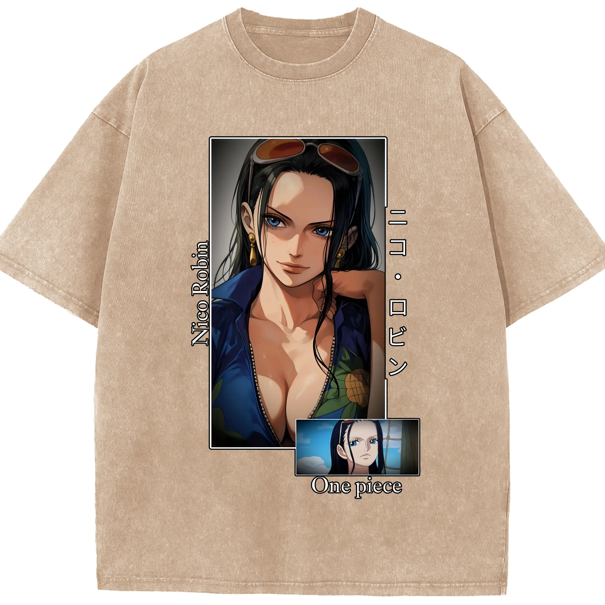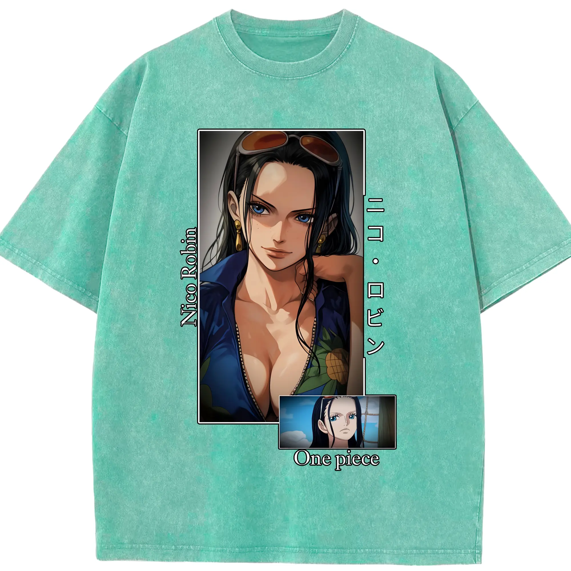 ワンピース グッズ ニコ・ロビン - 綿100% ヴィンテージ風 半袖Tシャツ ・ 背面プリント ・ 柔らか肌触り ・ 通気性 快適 ・ スポーツ カジュアル 外出用