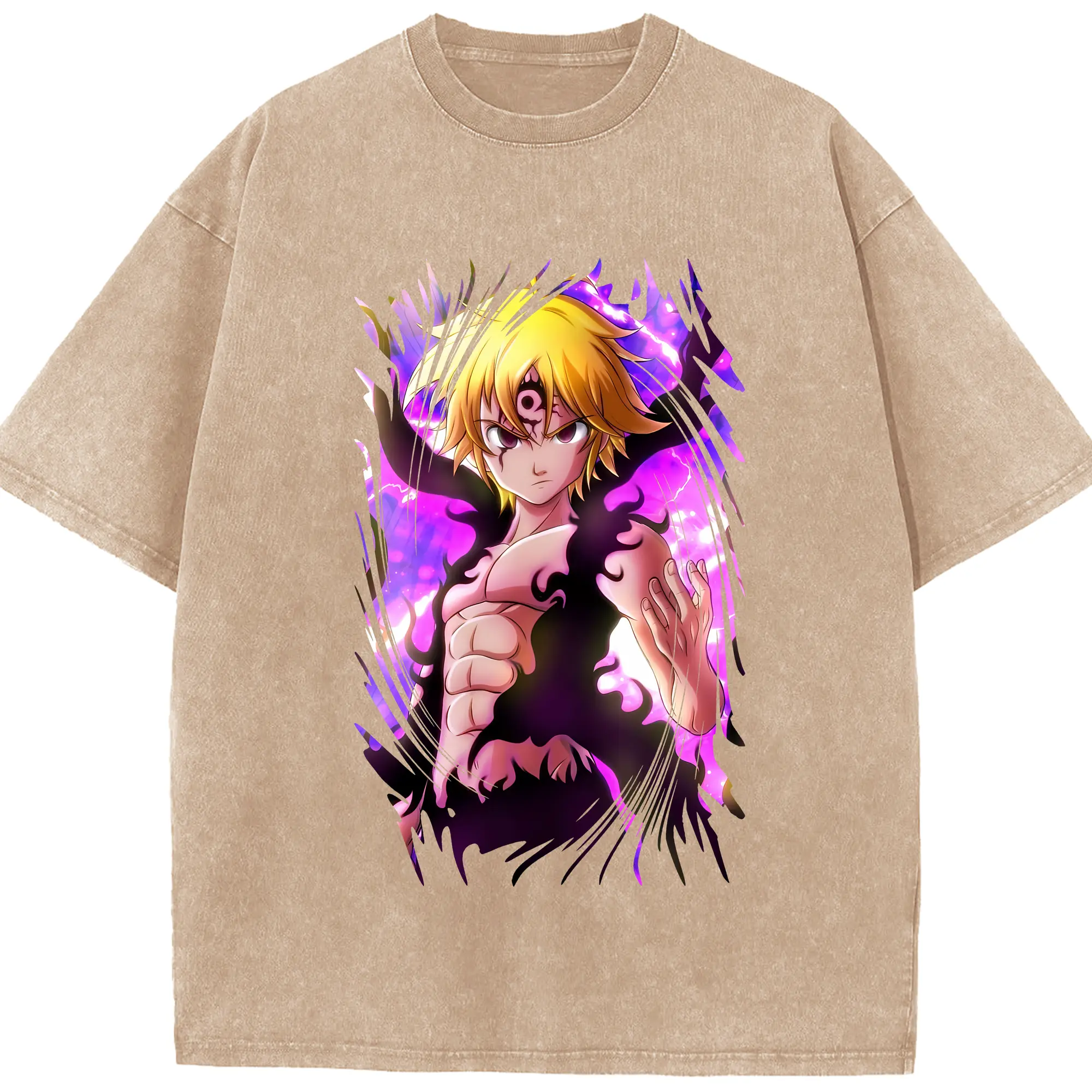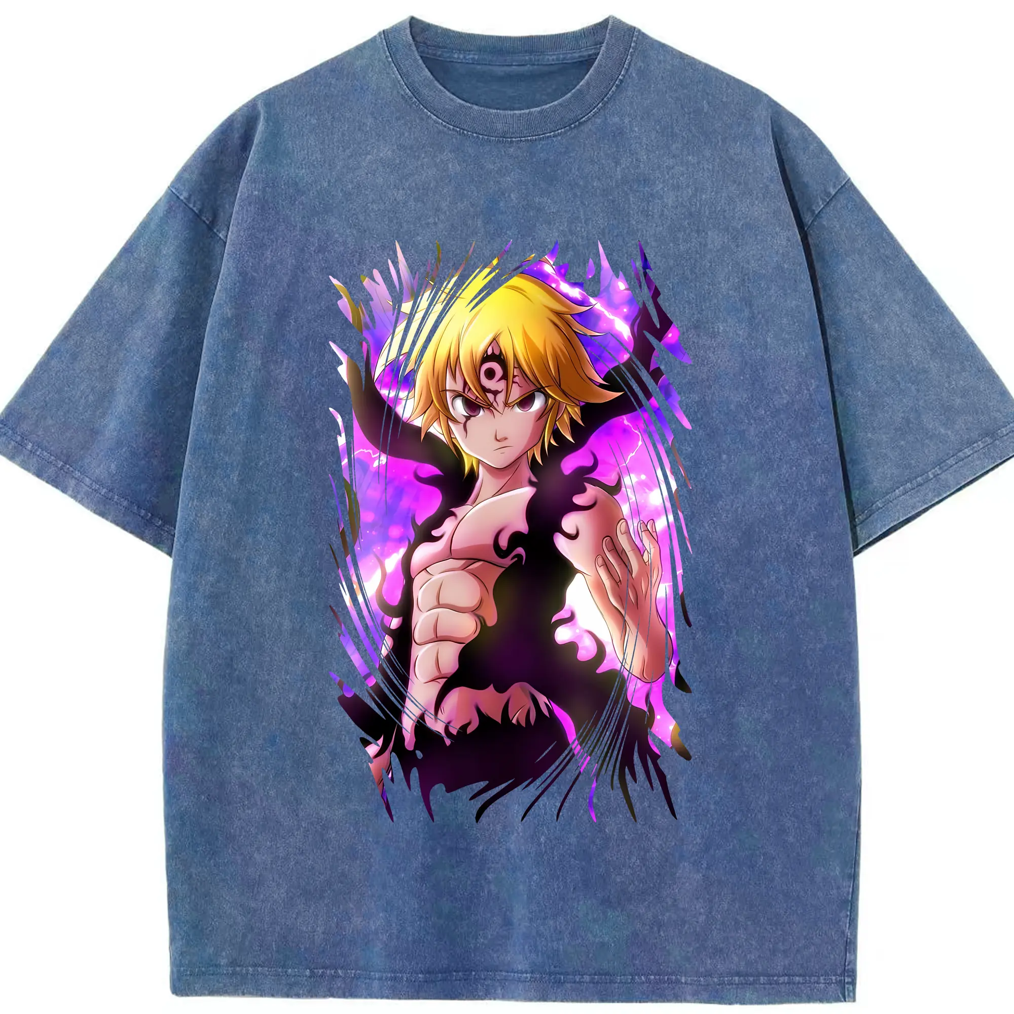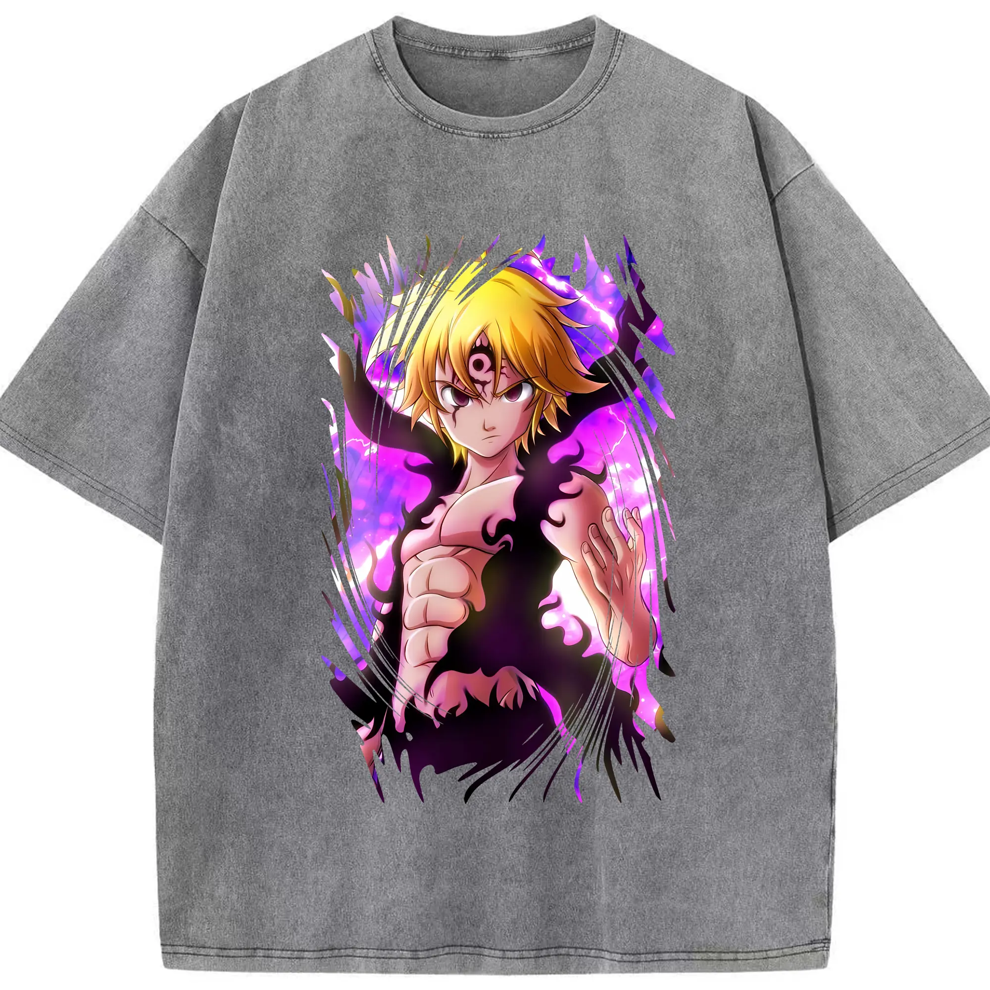 七つの大罪 グッズ メリオダス - 綿100% ヴィンテージ風 半袖Tシャツ ・ 背面プリント ・ 柔らか肌触り ・ 通気性 快適 ・ スポーツ カジュアル 外出用