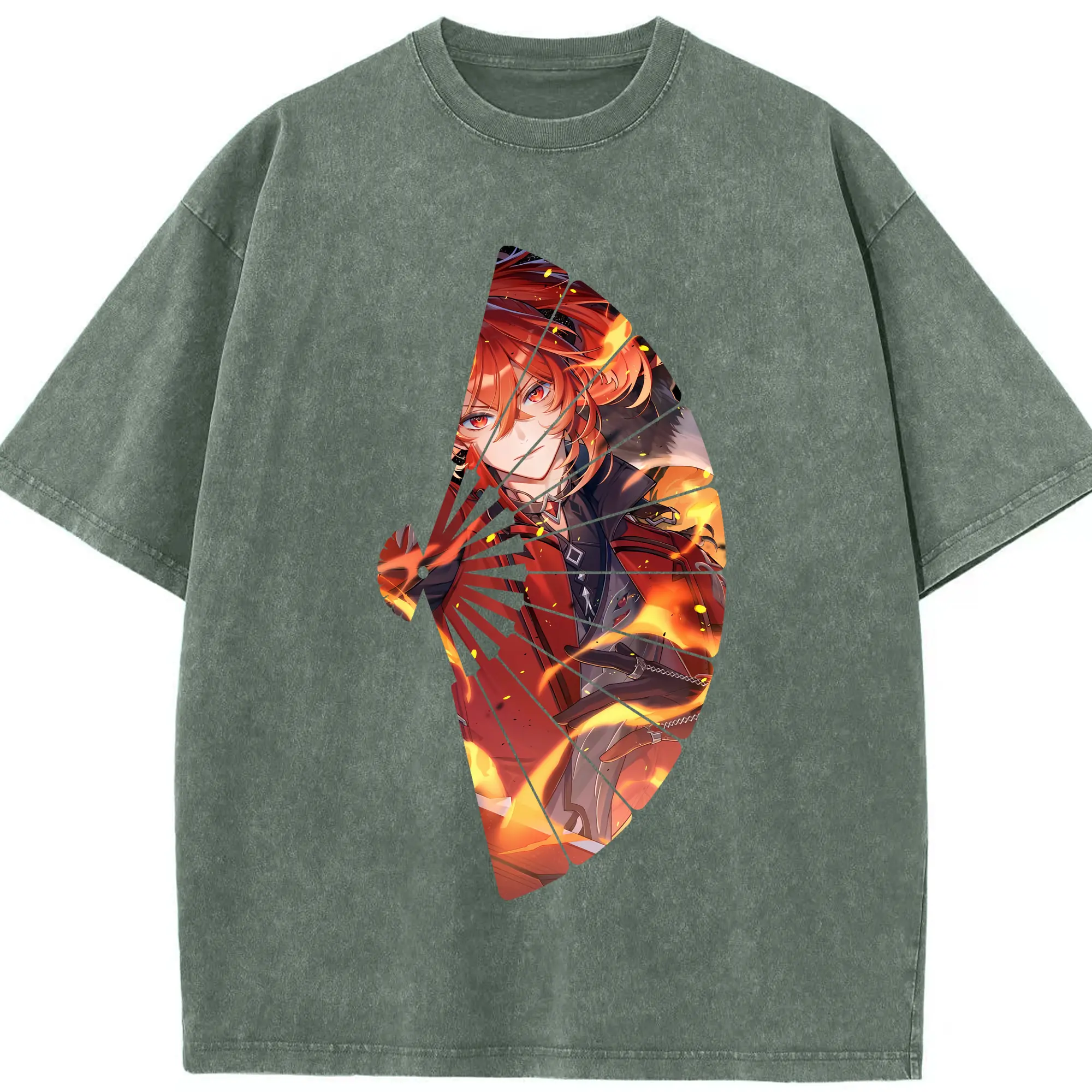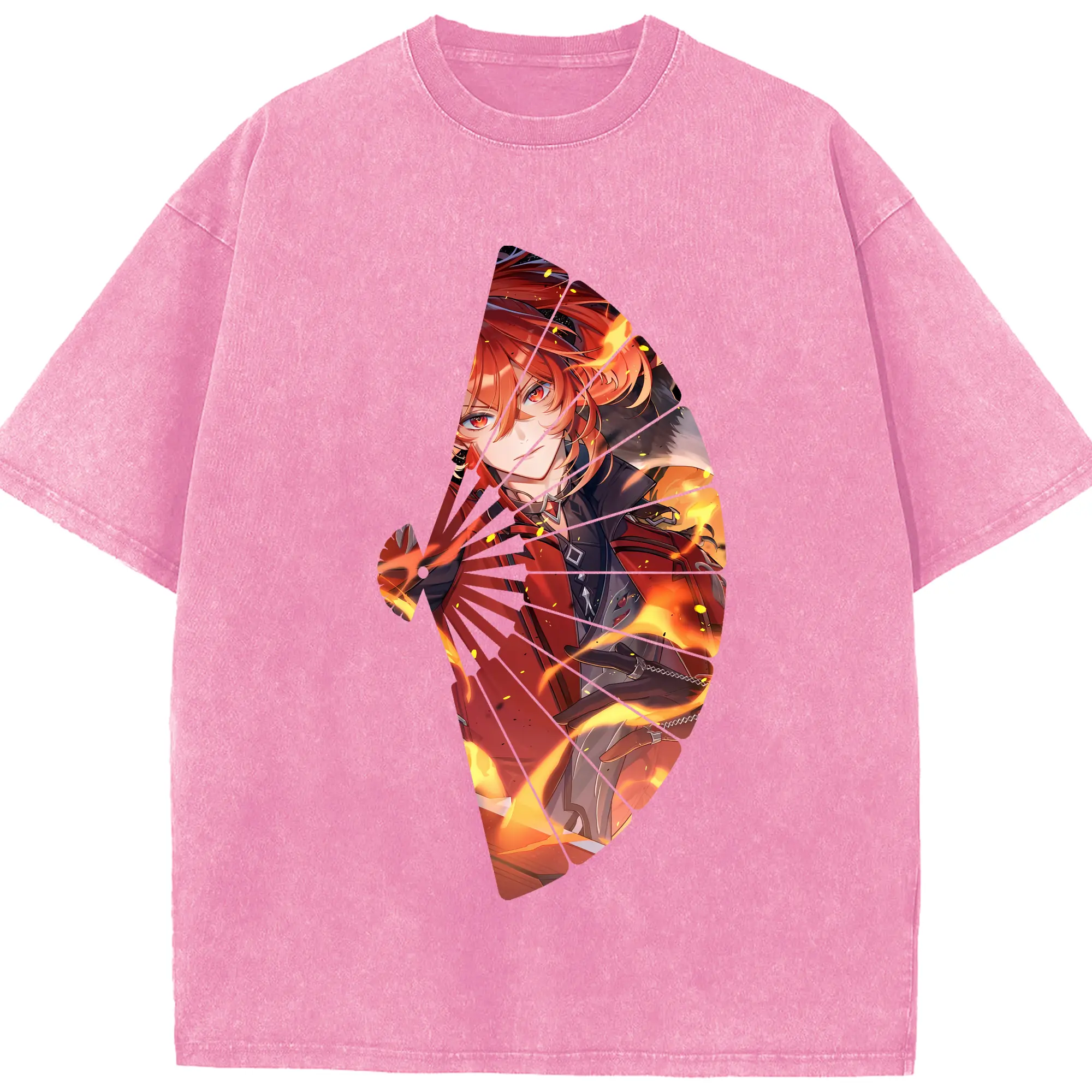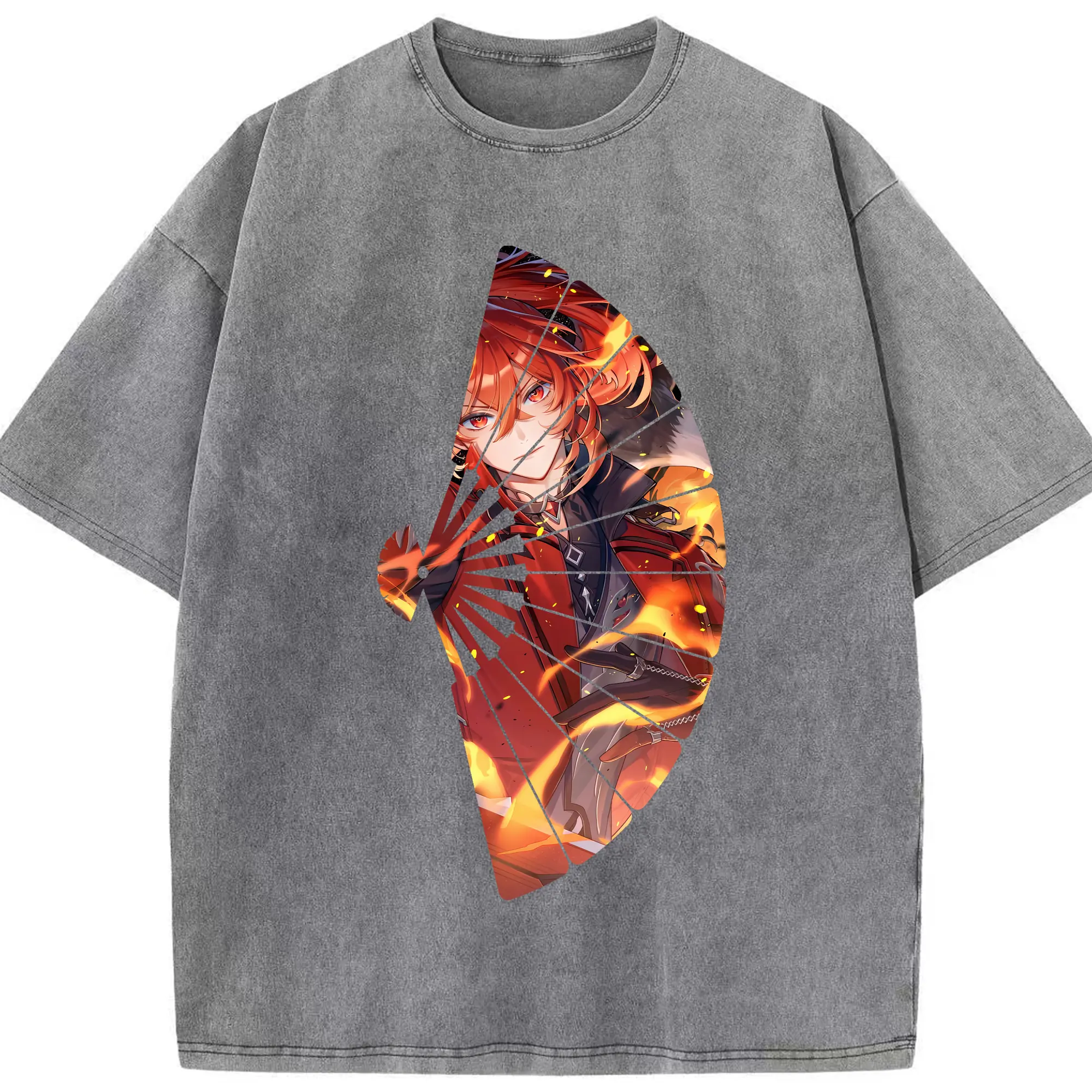 原 神 グッズ ディルック - 綿100% ヴィンテージ風 半袖Tシャツ ・ 背面プリント ・ 柔らか肌触り ・ 通気性 快適 ・ スポーツ カジュアル 外出用