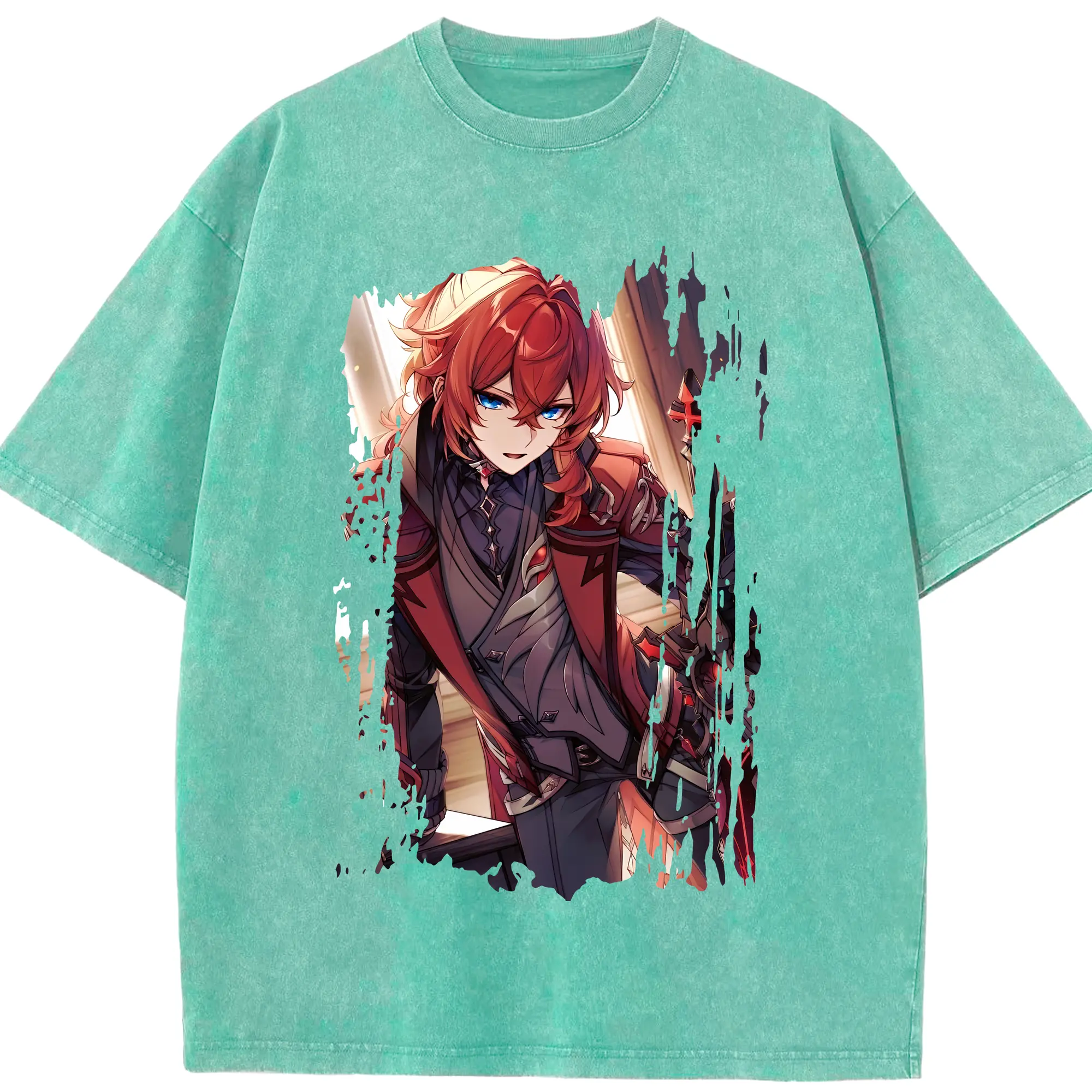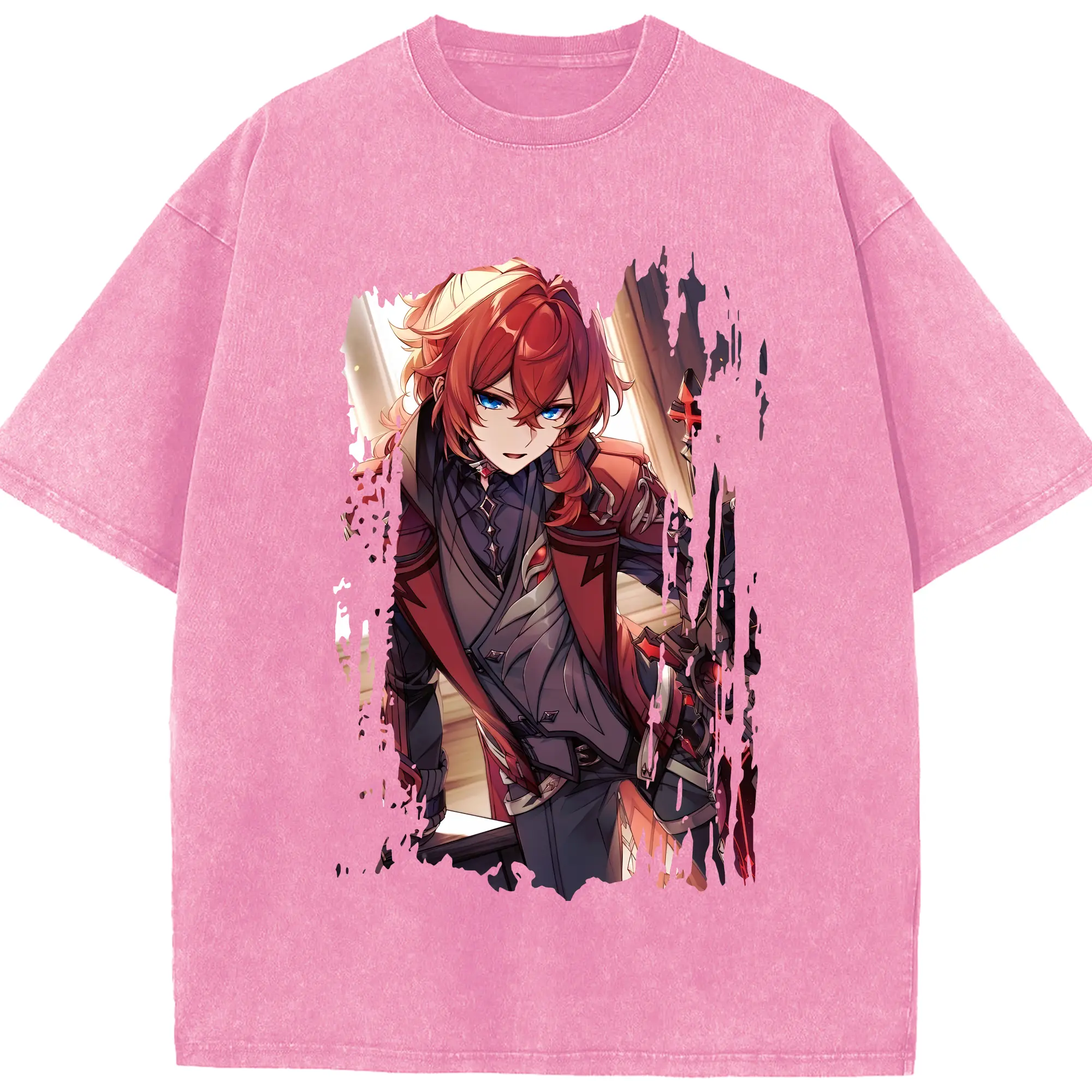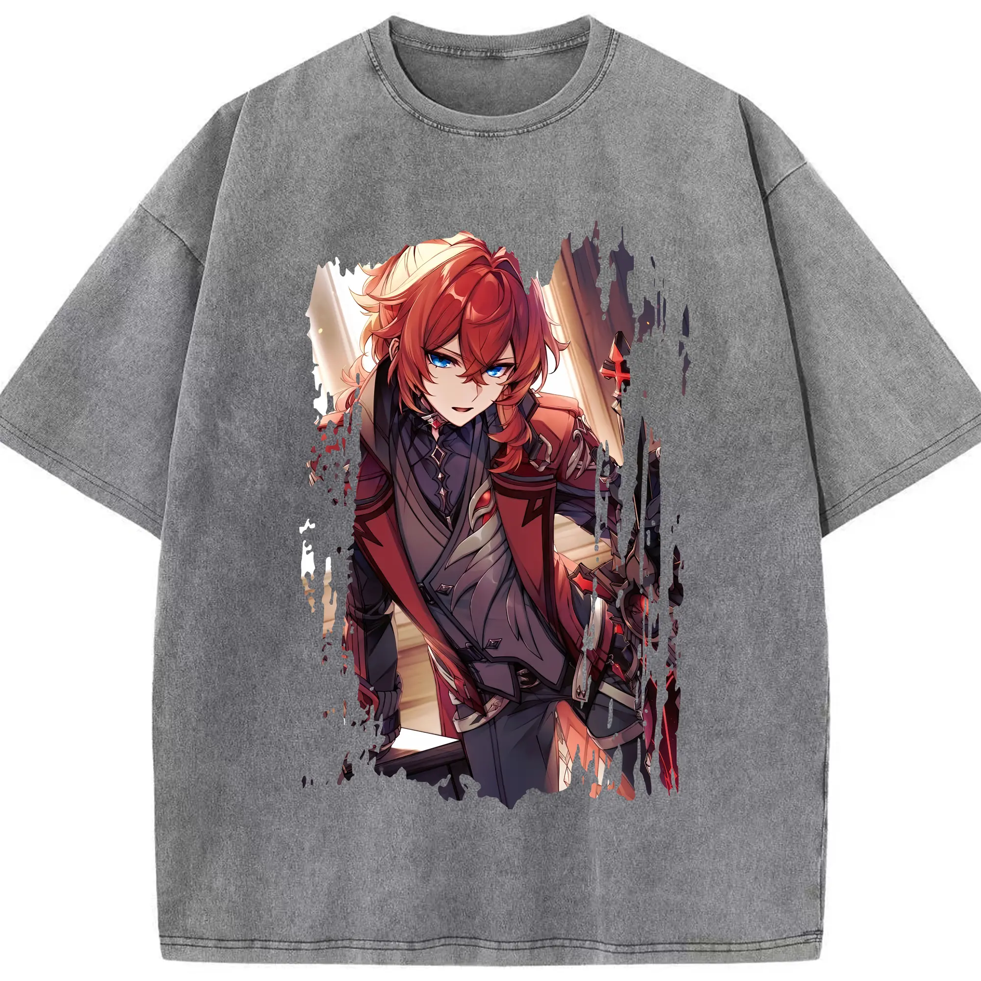原 神 グッズ ディルック - 綿100% ヴィンテージ風 半袖Tシャツ ・ 背面プリント ・ 柔らか肌触り ・ 通気性 快適 ・ スポーツ カジュアル 外出用