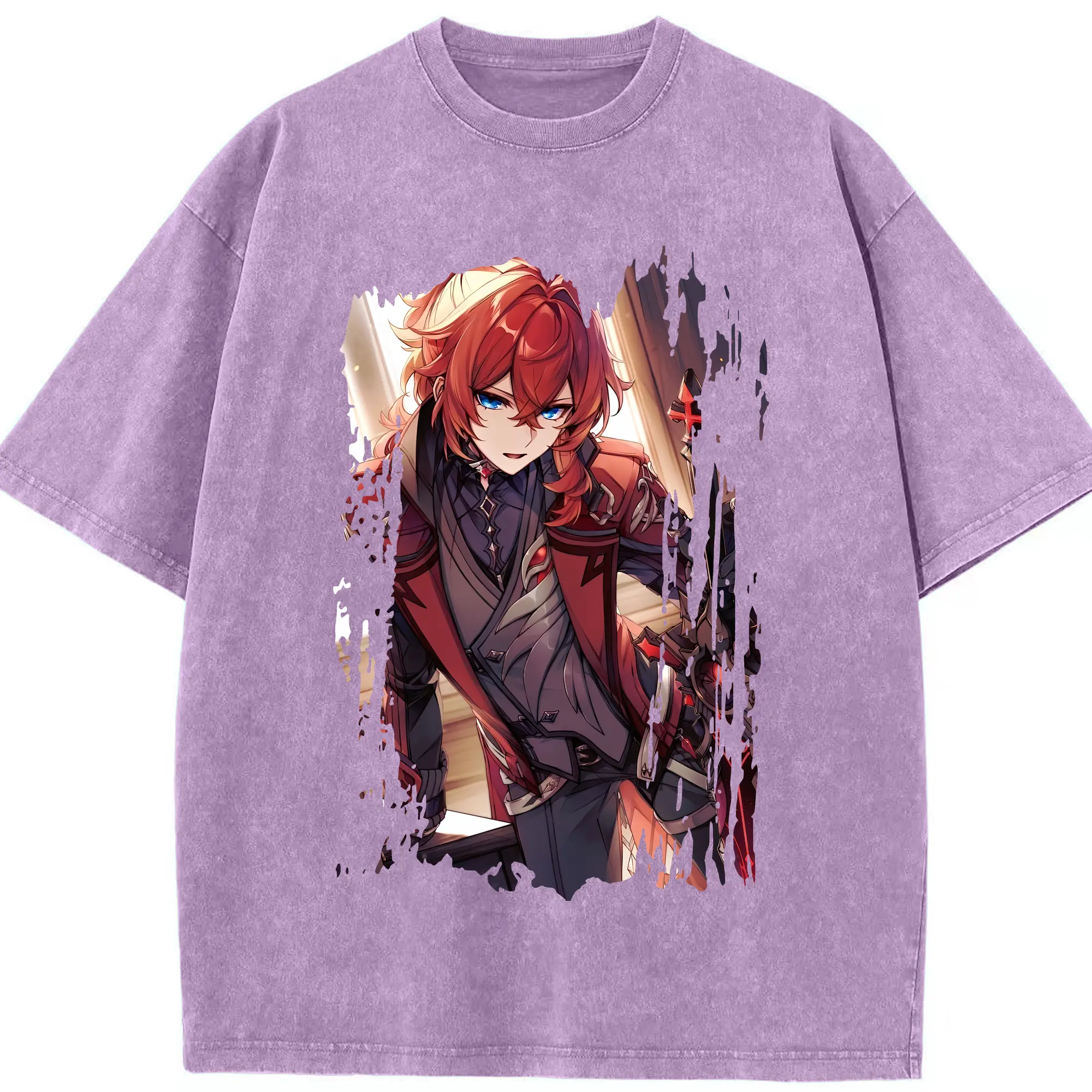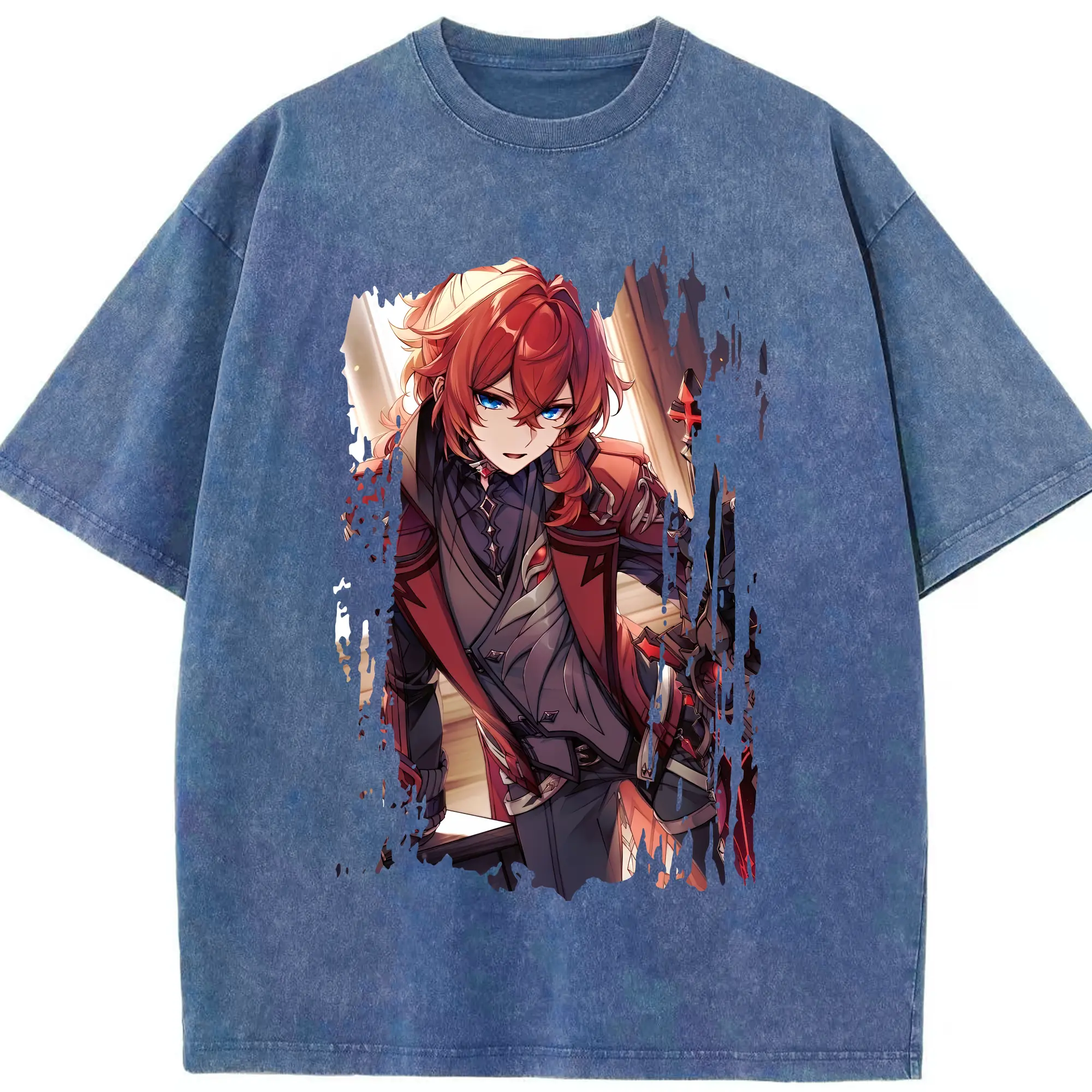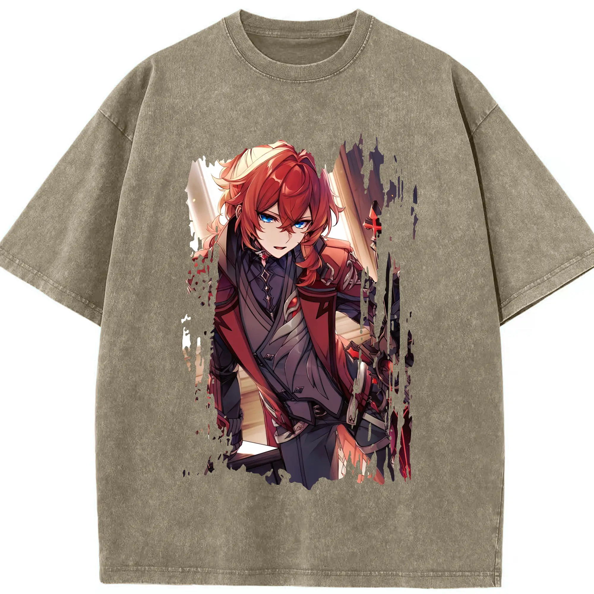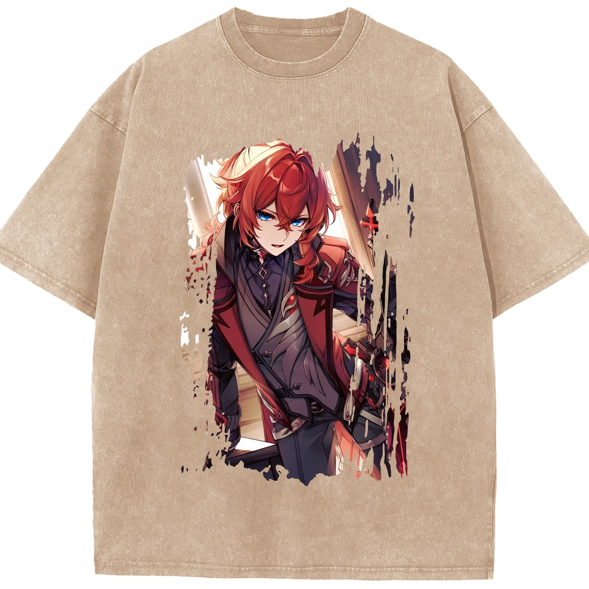 原 神 グッズ ディルック - 綿100% ヴィンテージ風 半袖Tシャツ ・ 背面プリント ・ 柔らか肌触り ・ 通気性 快適 ・ スポーツ カジュアル 外出用
