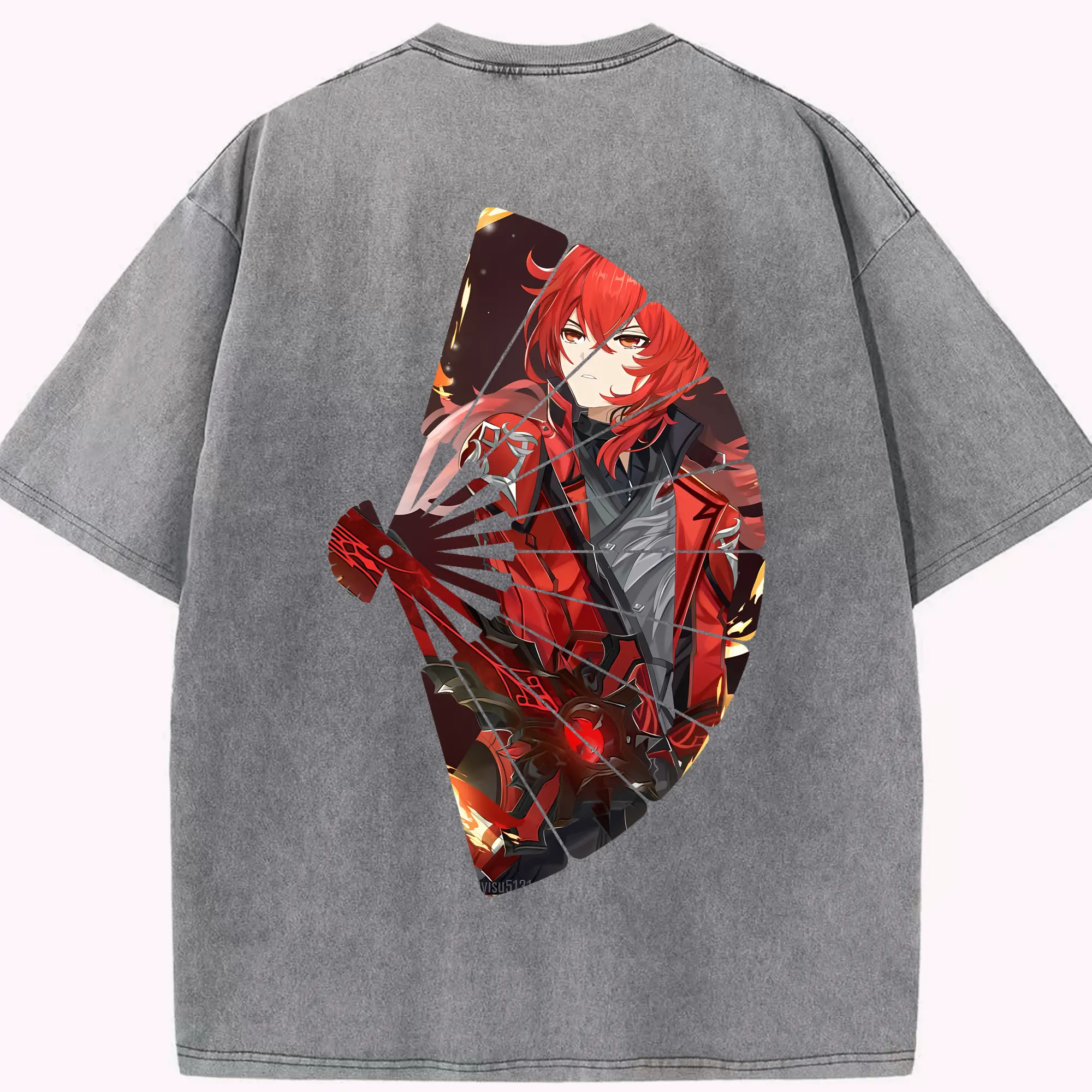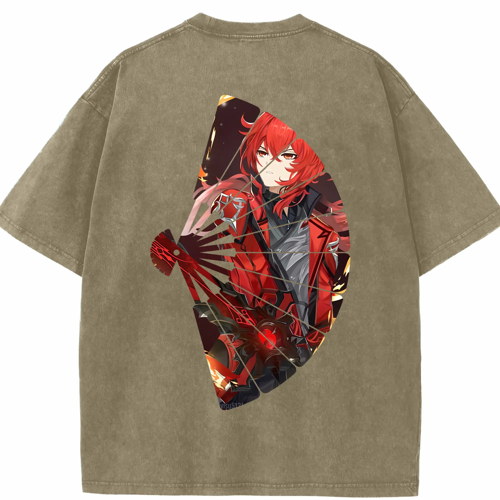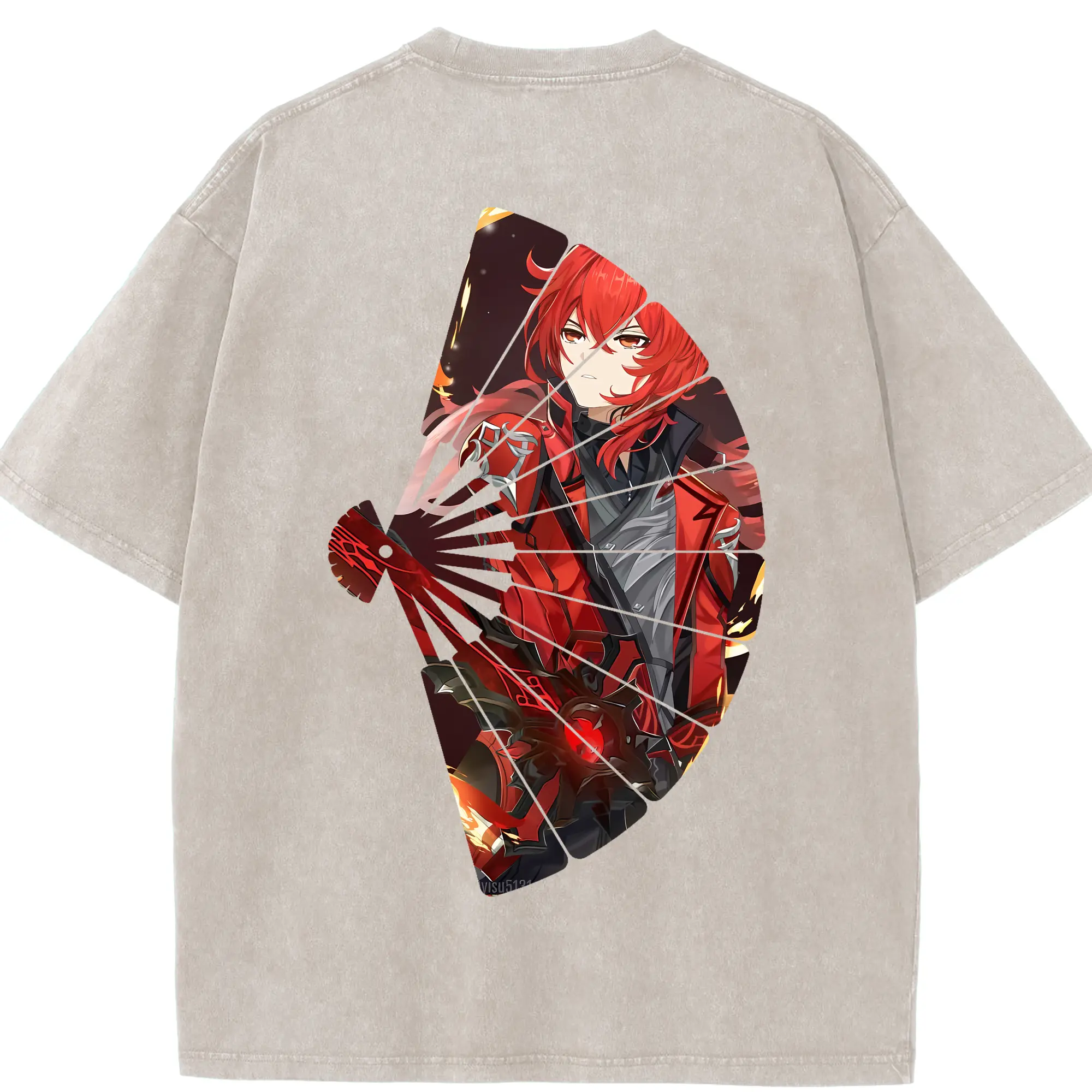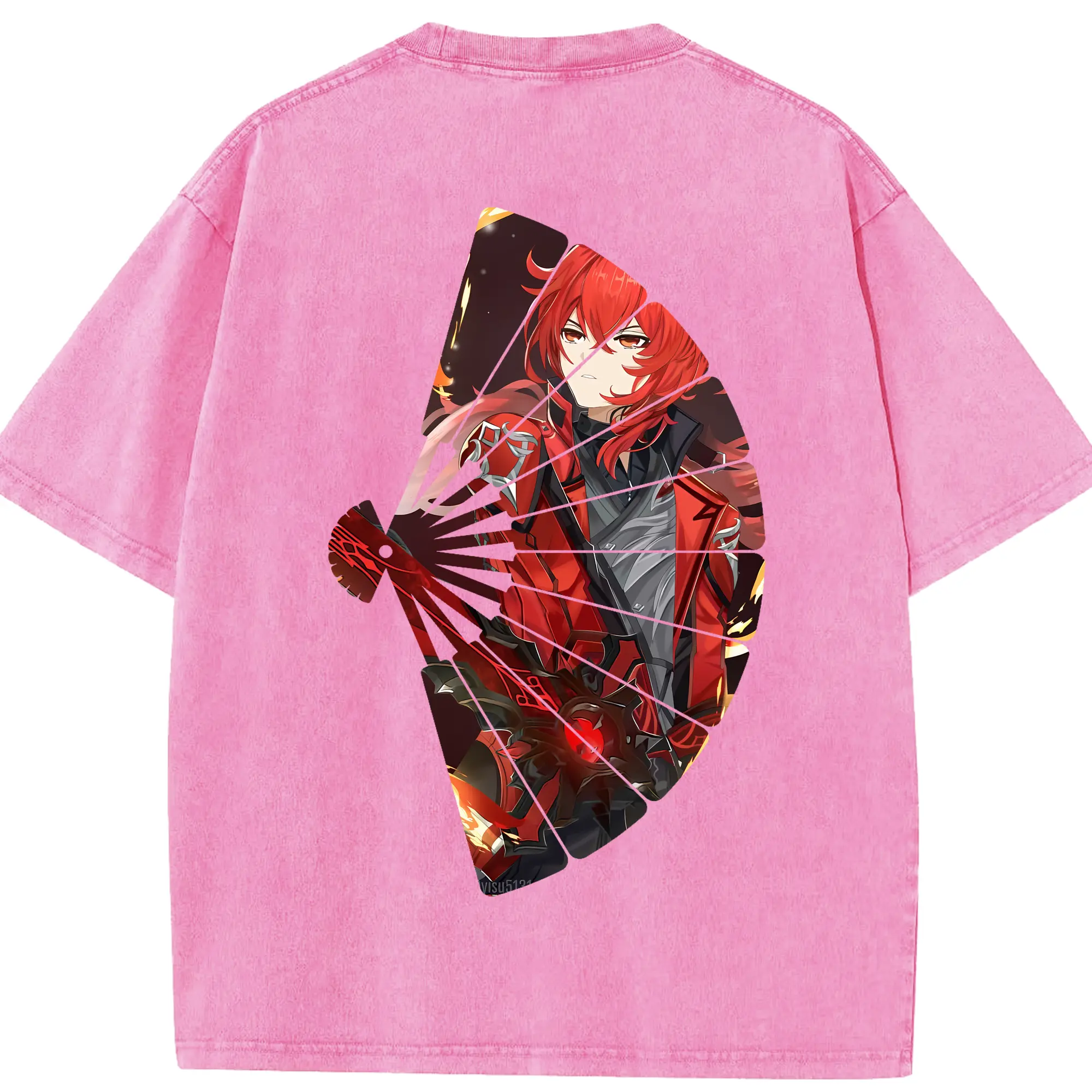 原 神 グッズ ディルック - 綿100% ヴィンテージ風 半袖Tシャツ ・ フロントプリント ・ 柔らか肌触り ・ 通気性 快適 ・ スポーツ カジュアル 外出用