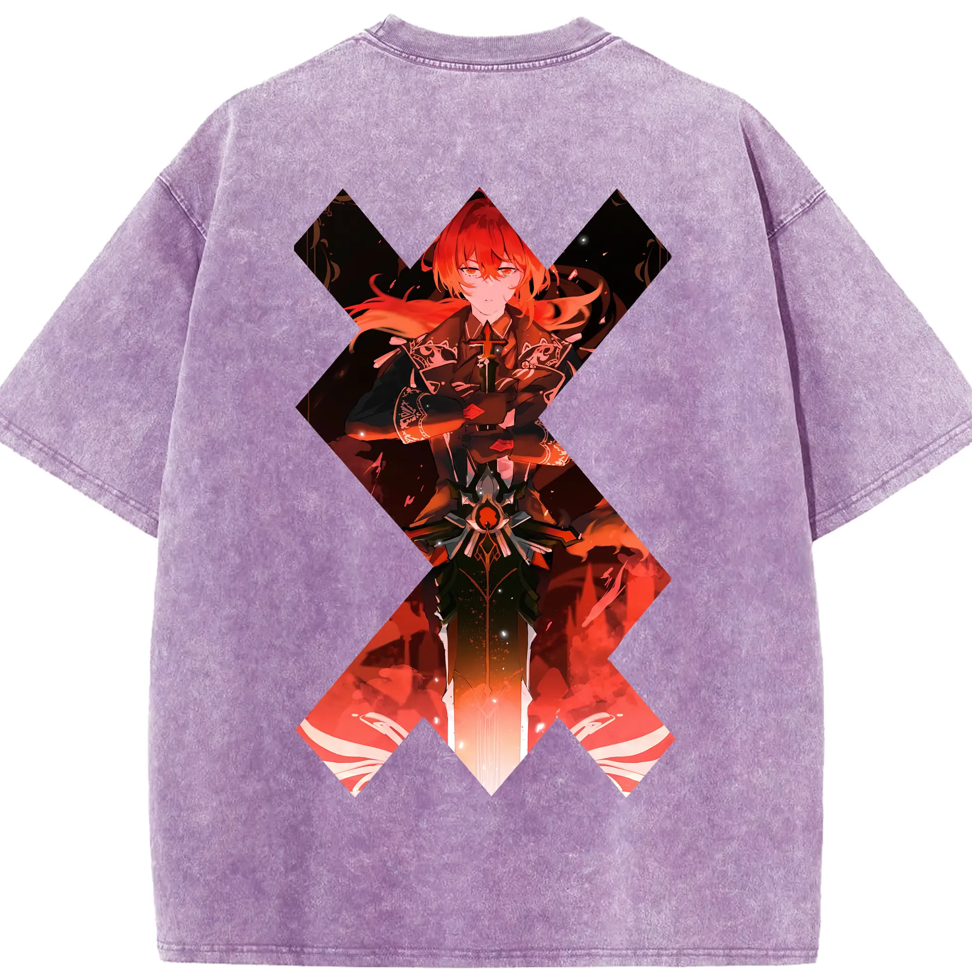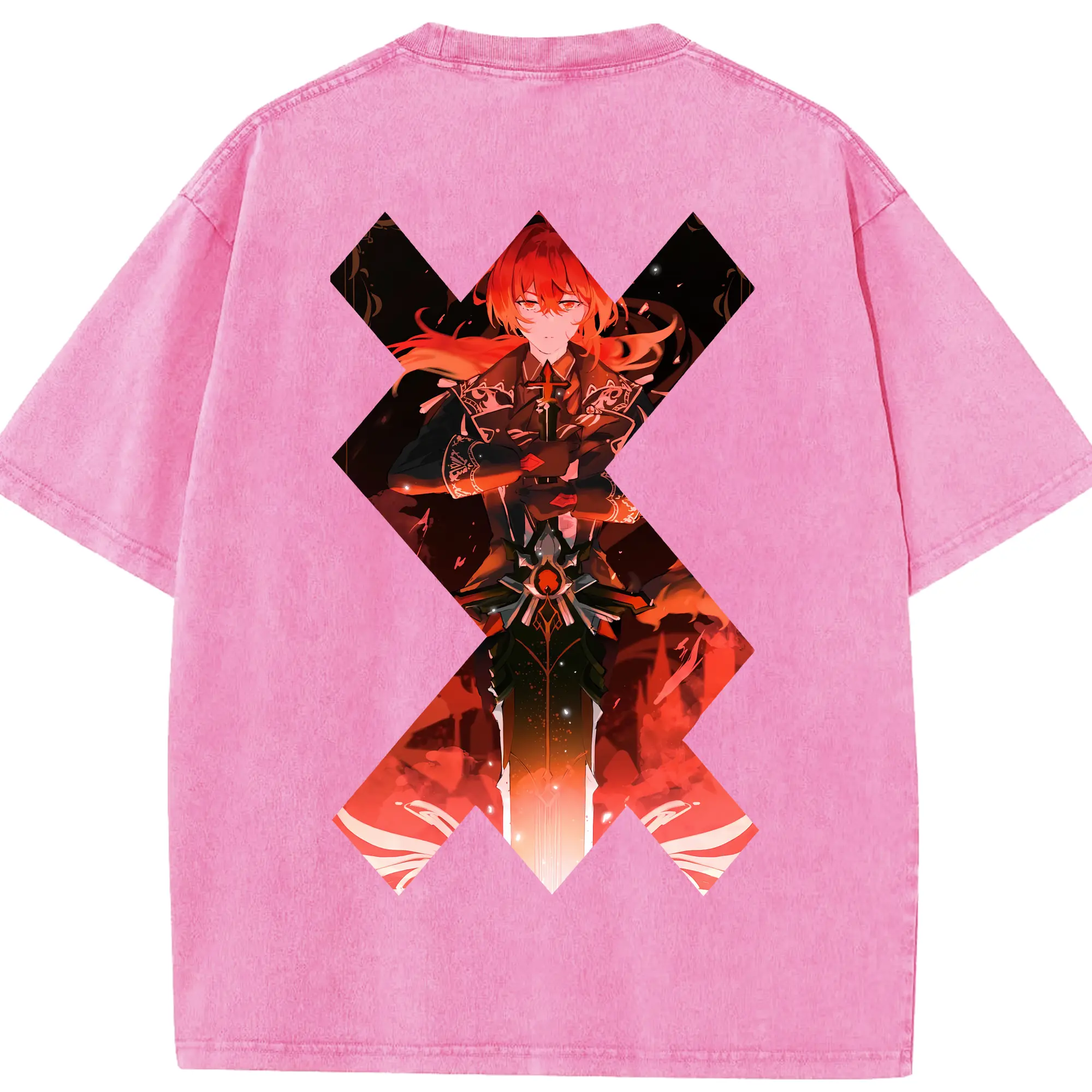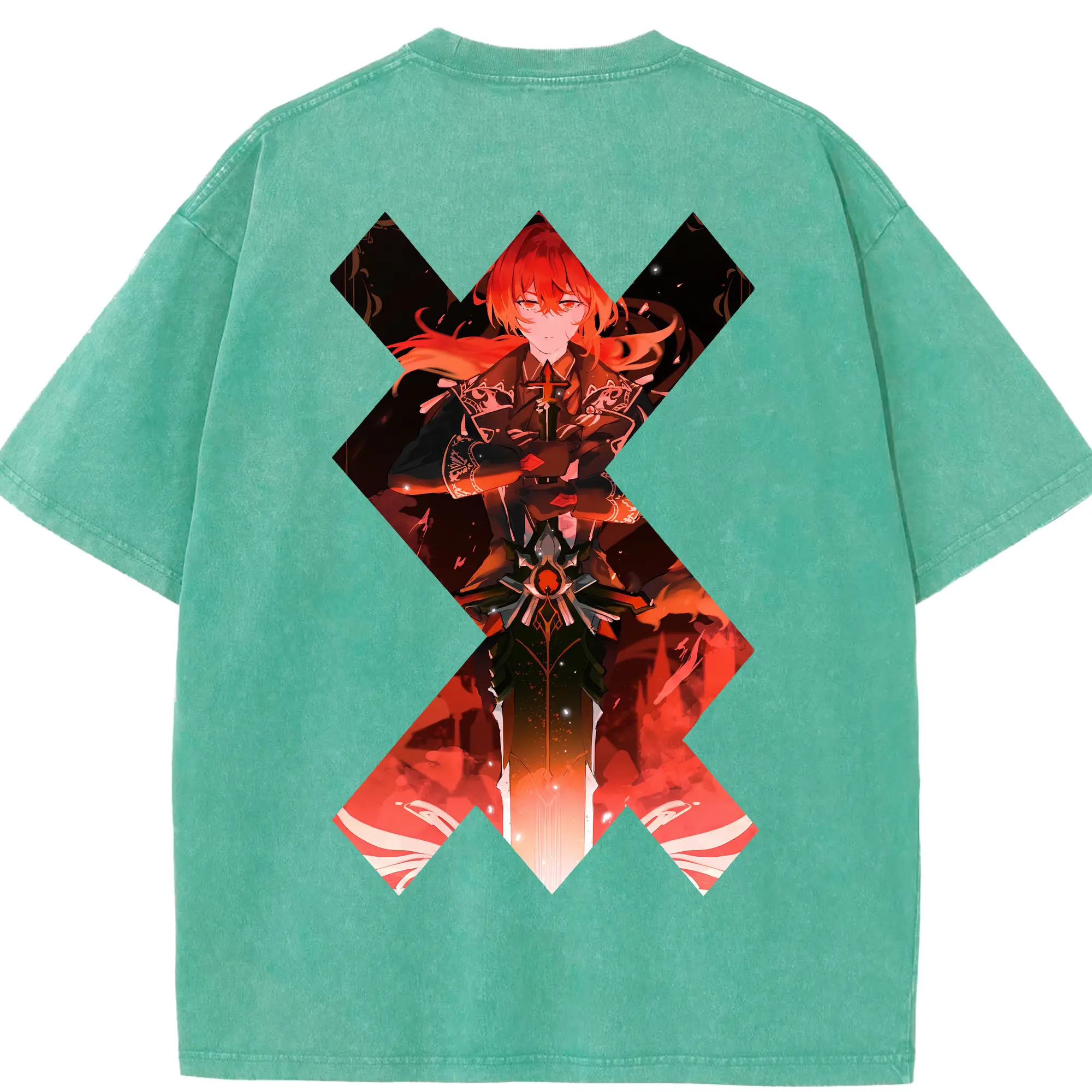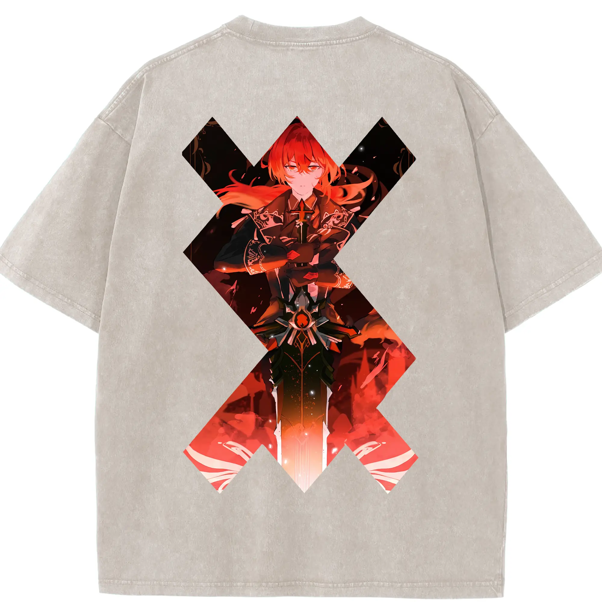 原 神 グッズ ディルック - 綿100% ヴィンテージ風 半袖Tシャツ ・ フロントプリント ・ 柔らか肌触り ・ 通気性 快適 ・ スポーツ カジュアル 外出用