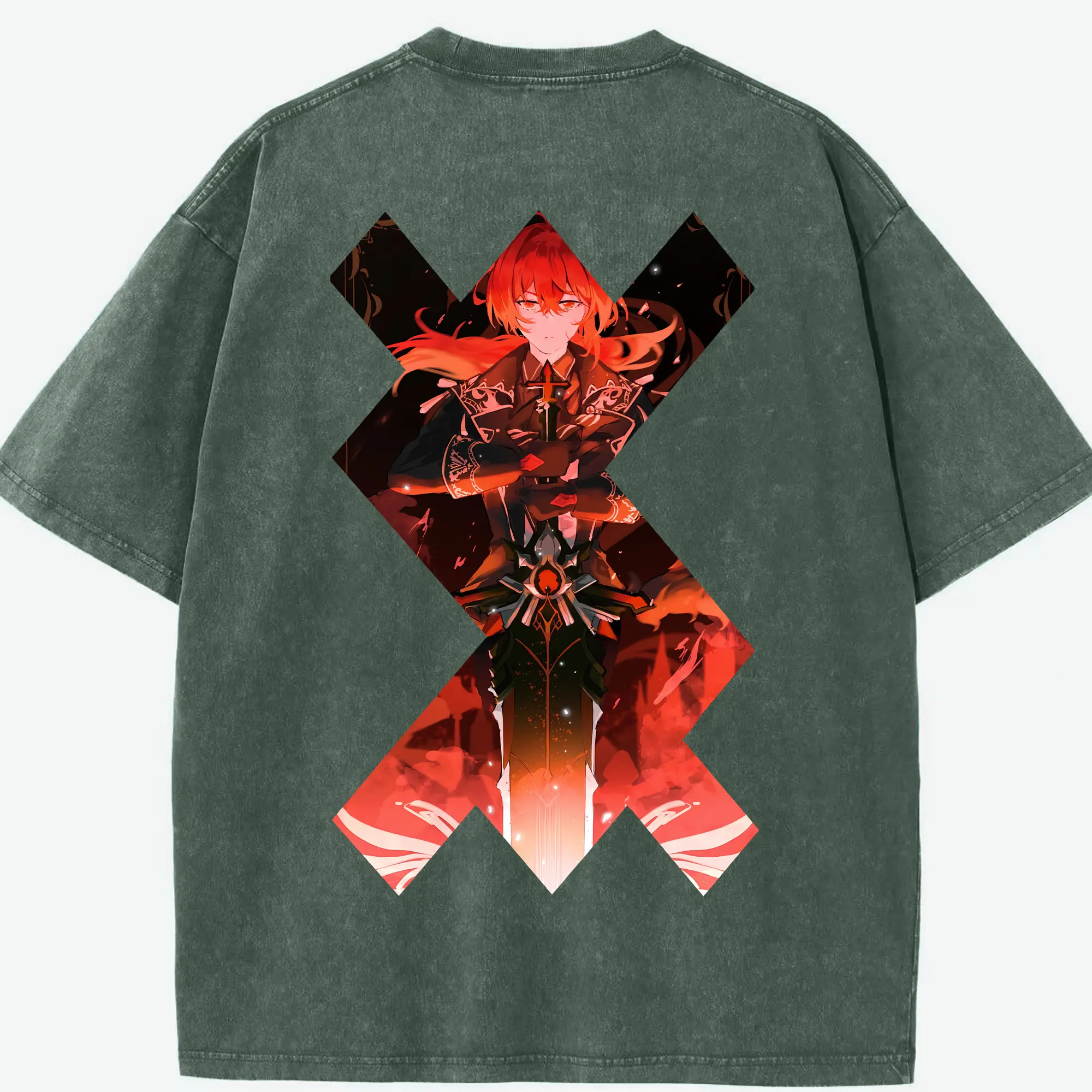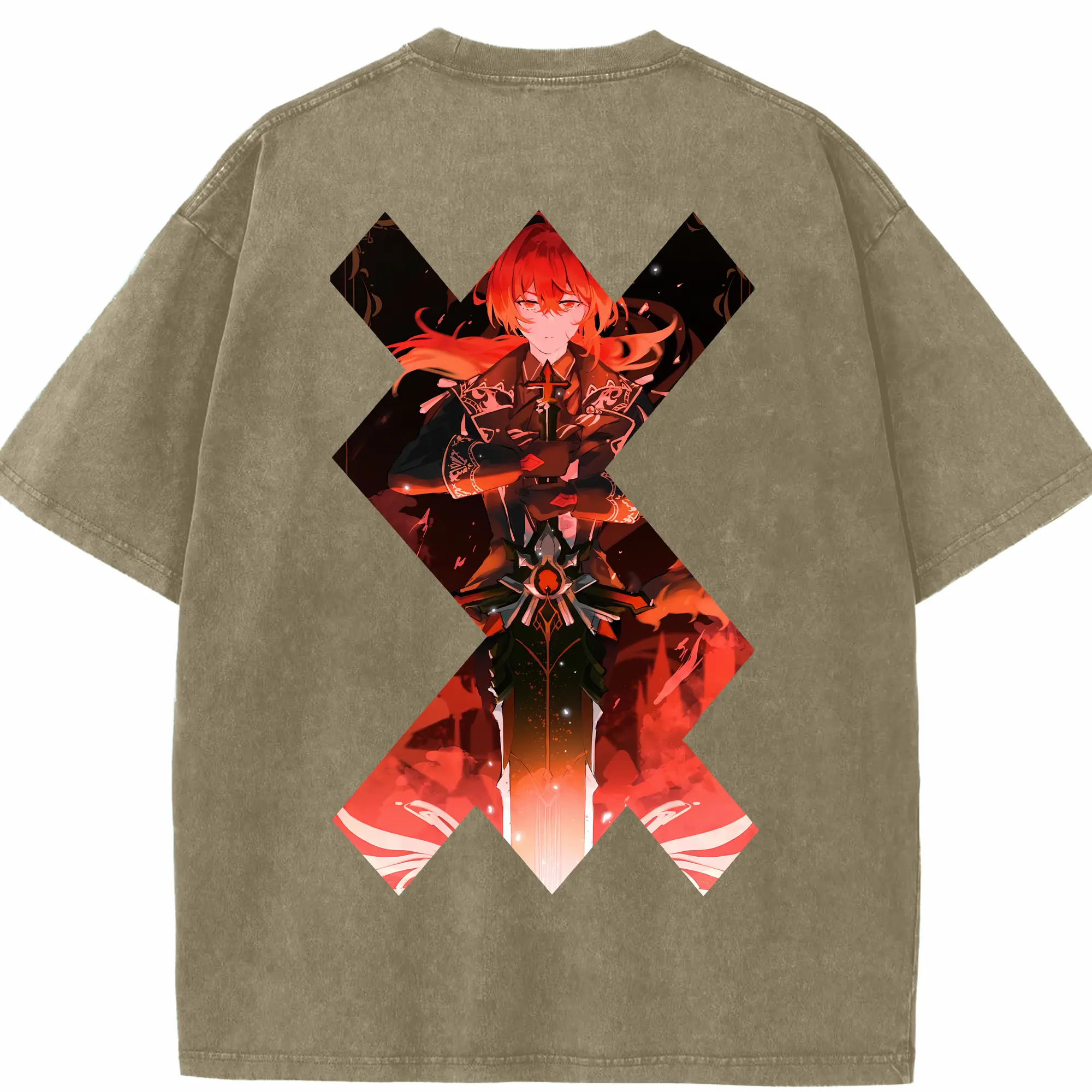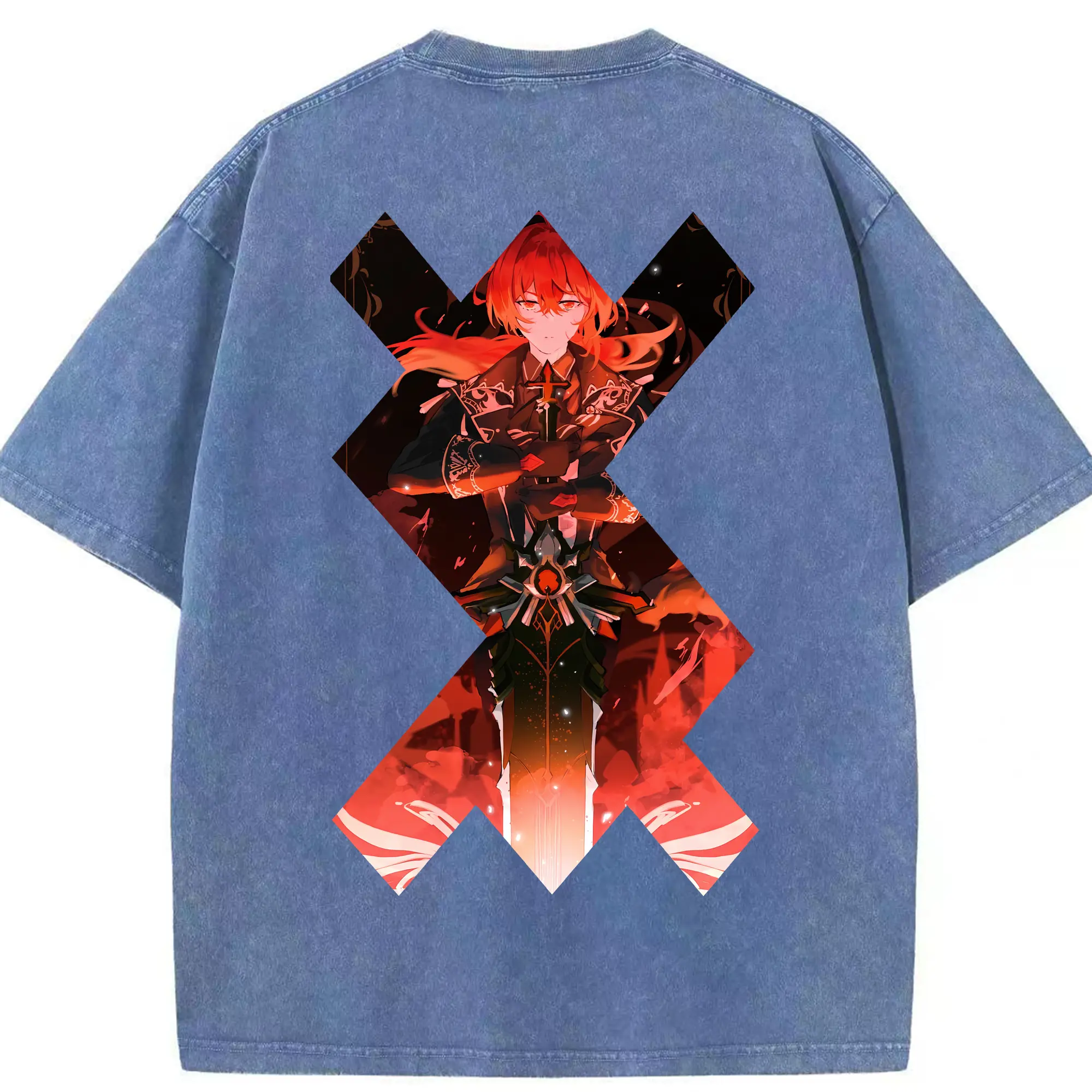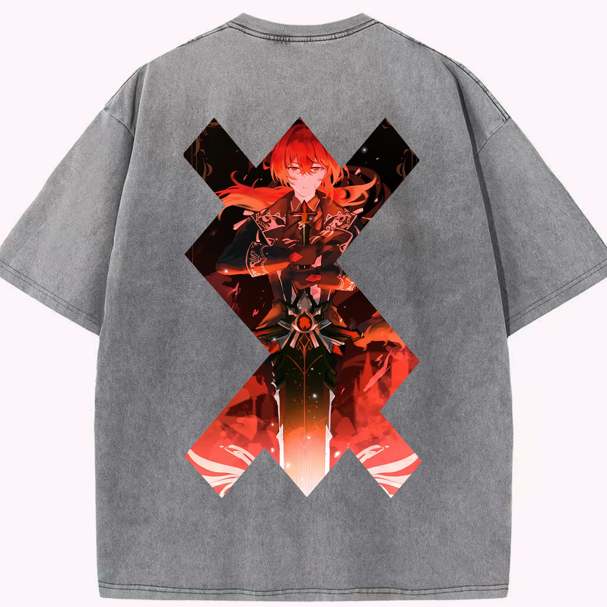 原 神 グッズ ディルック - 綿100% ヴィンテージ風 半袖Tシャツ ・ フロントプリント ・ 柔らか肌触り ・ 通気性 快適 ・ スポーツ カジュアル 外出用