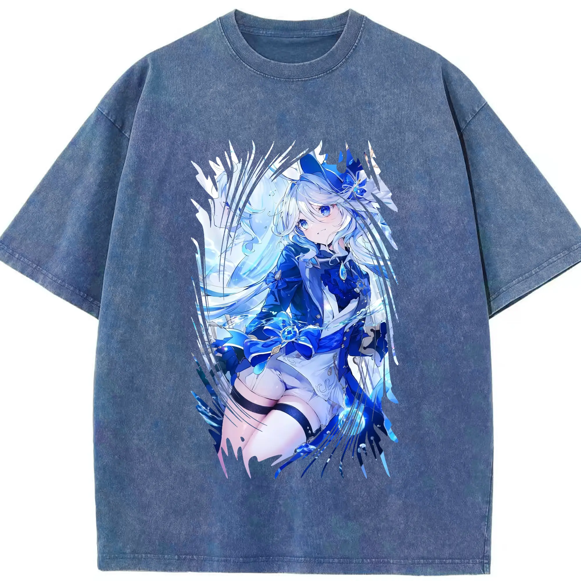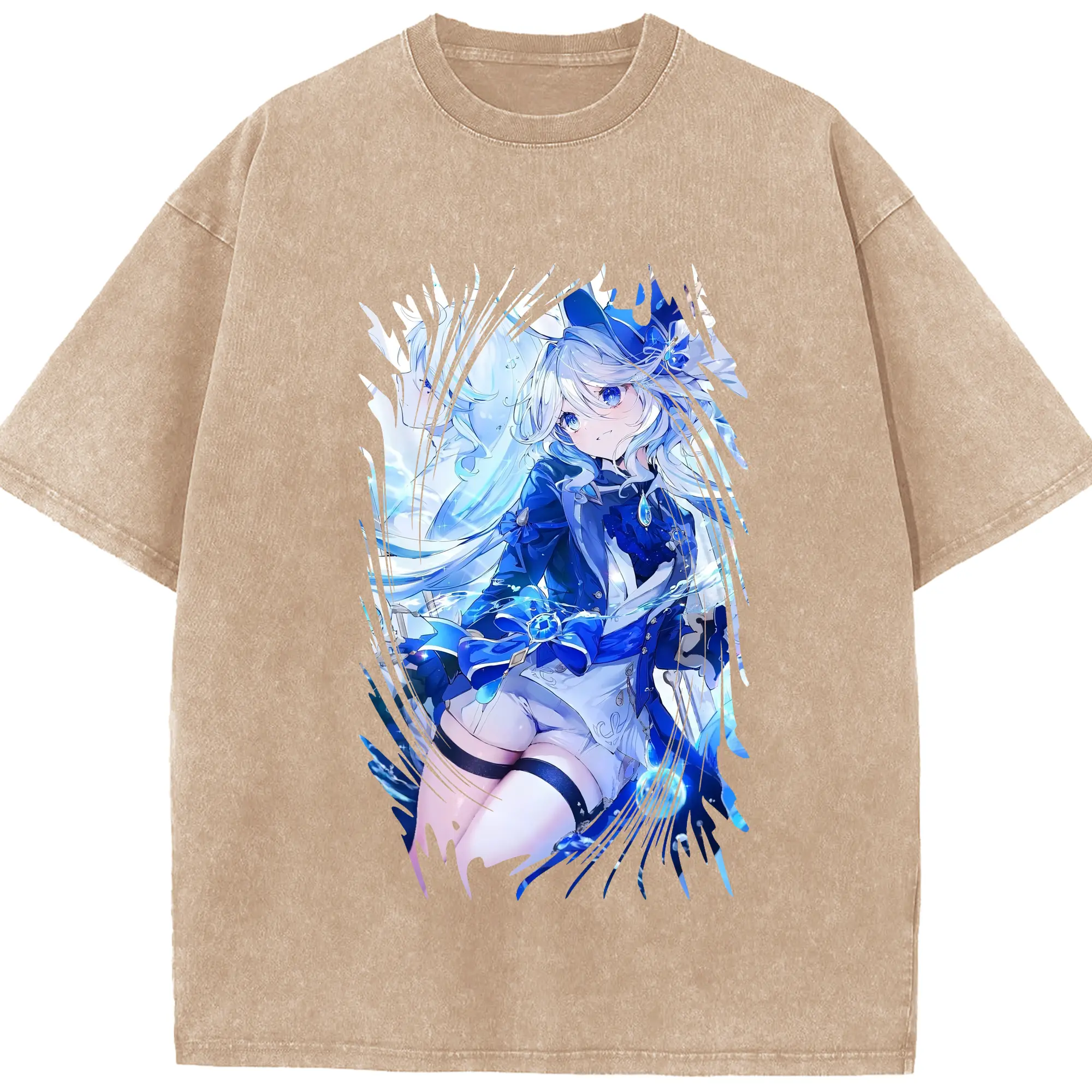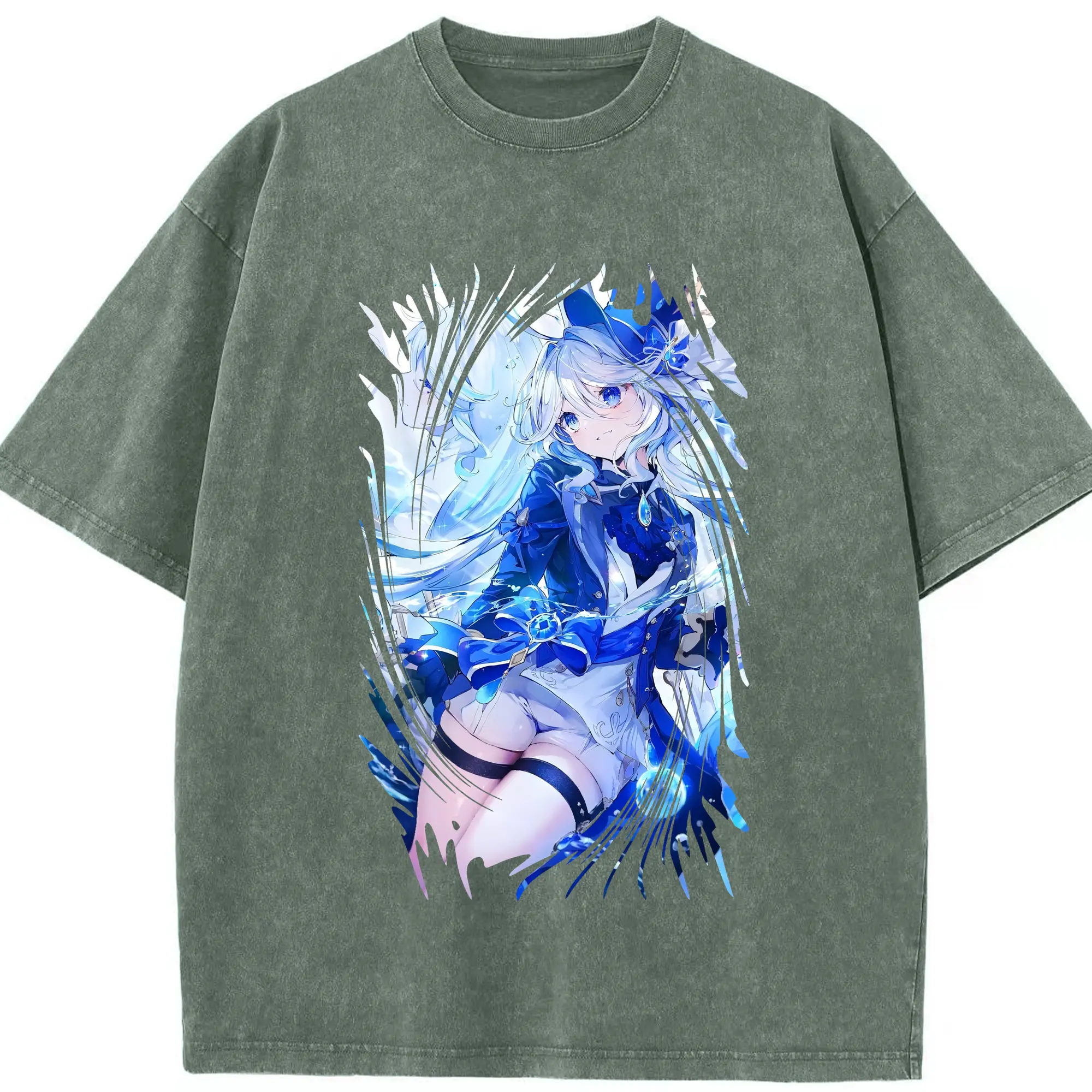 原 神 グッズ フリーナ - 綿100% ヴィンテージ風 半袖Tシャツ ・ 背面プリント ・ 柔らか肌触り ・ 通気性 快適 ・ スポーツ カジュアル 外出用