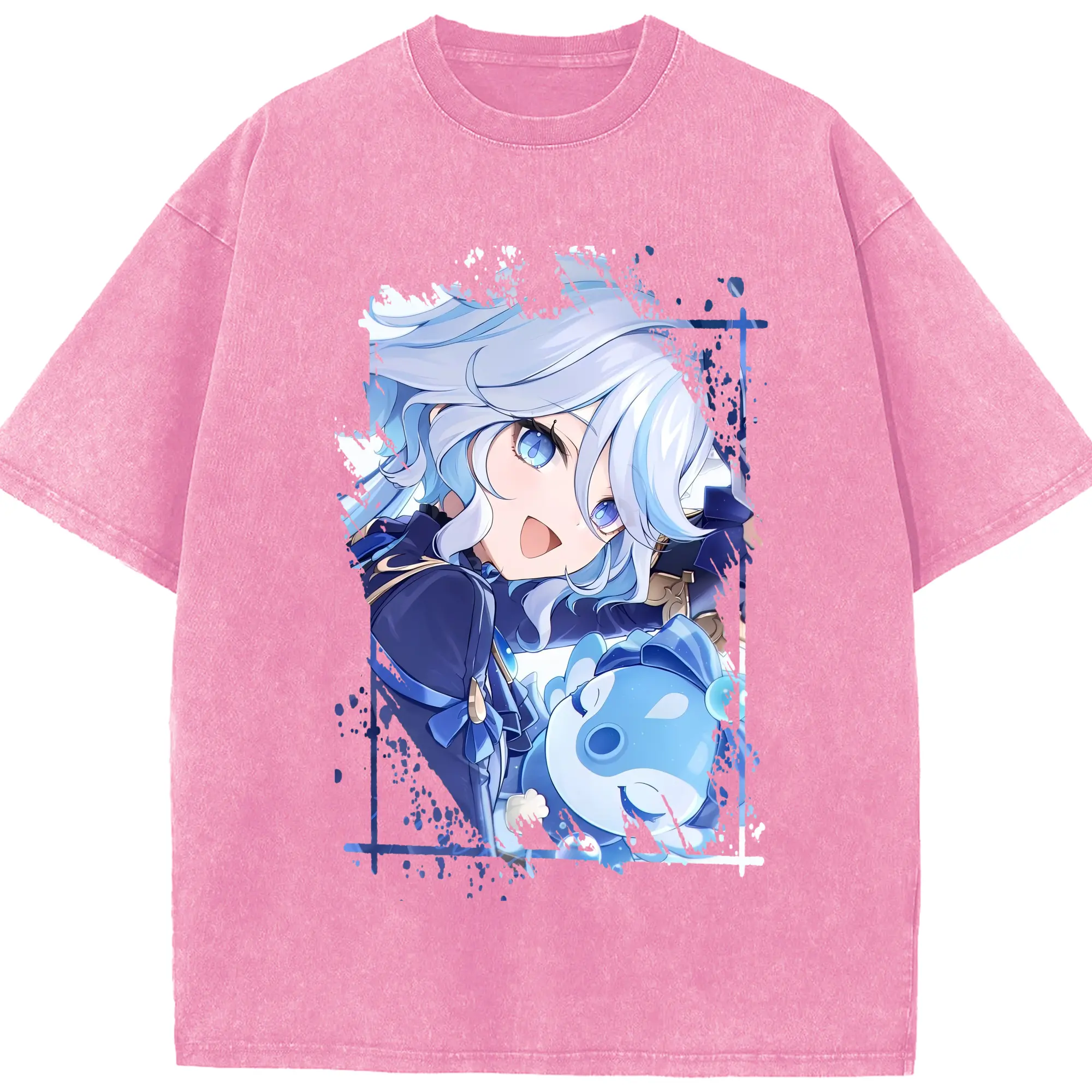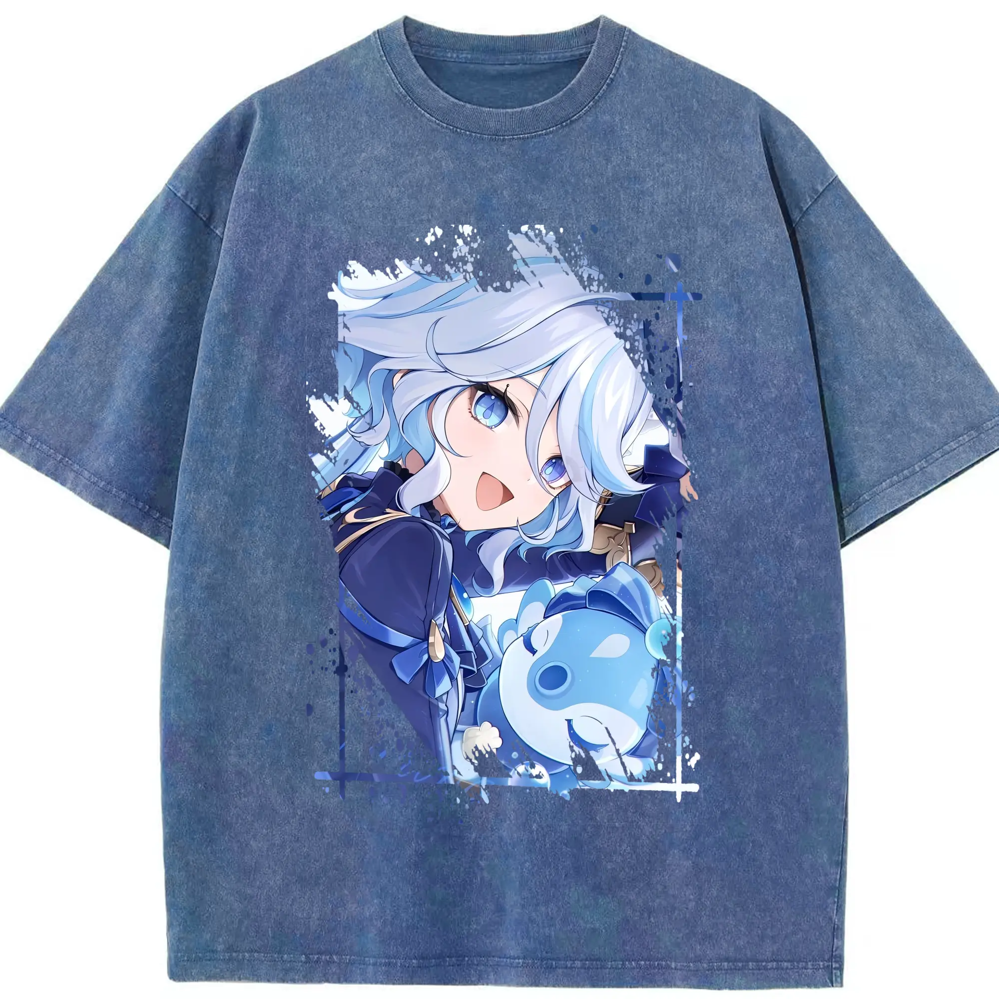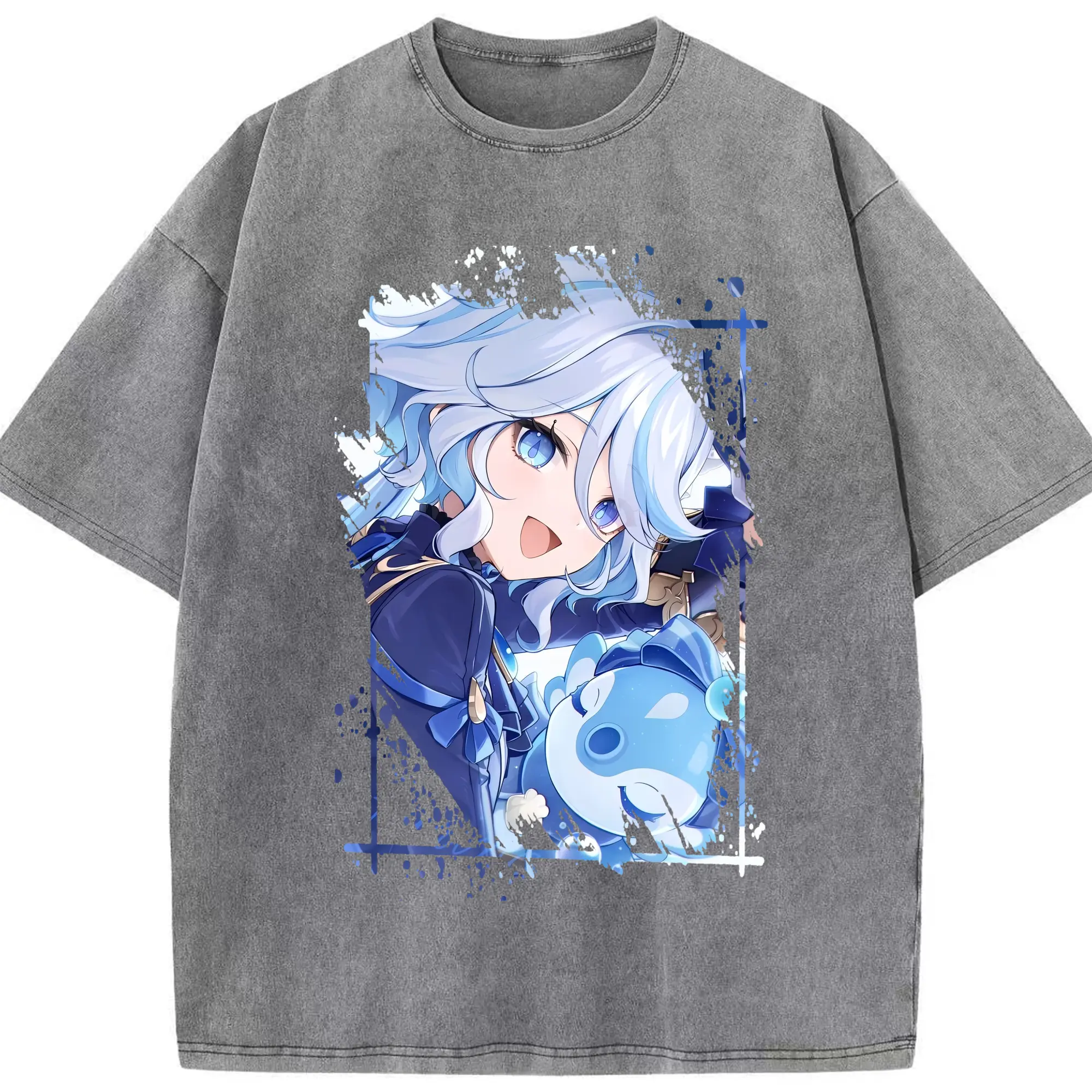 原 神 グッズ フリーナ - 綿100% ヴィンテージ風 半袖Tシャツ ・ 背面プリント ・ 柔らか肌触り ・ 通気性 快適 ・ スポーツ カジュアル 外出用