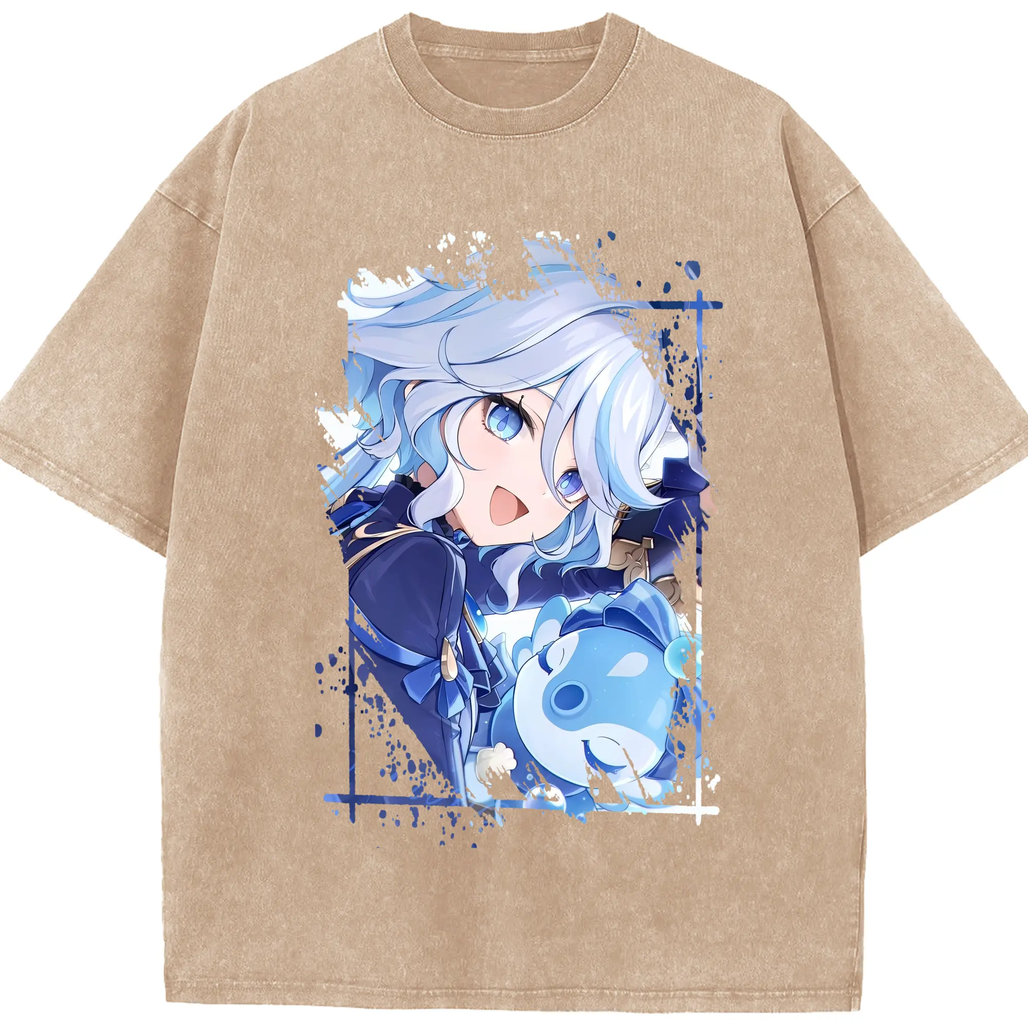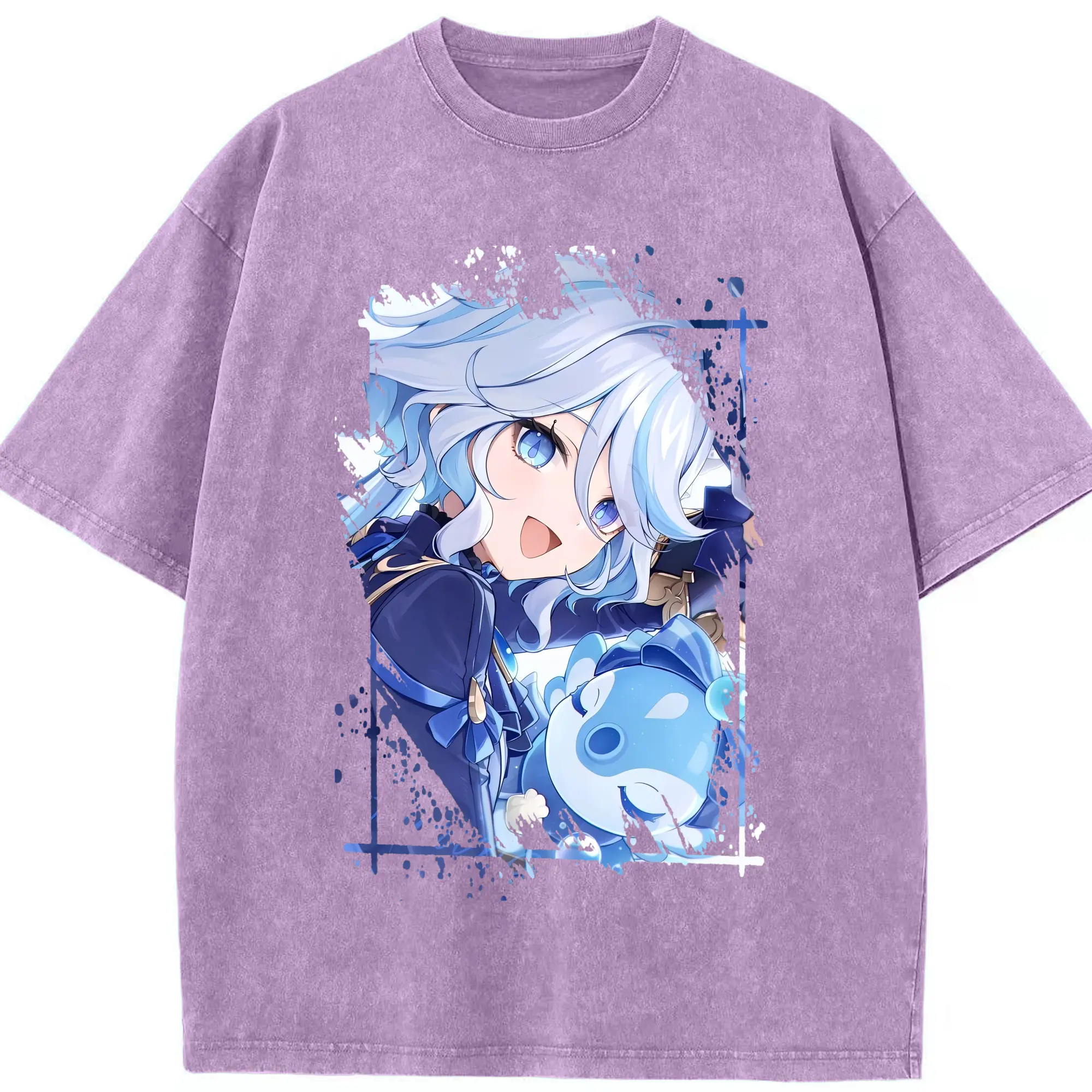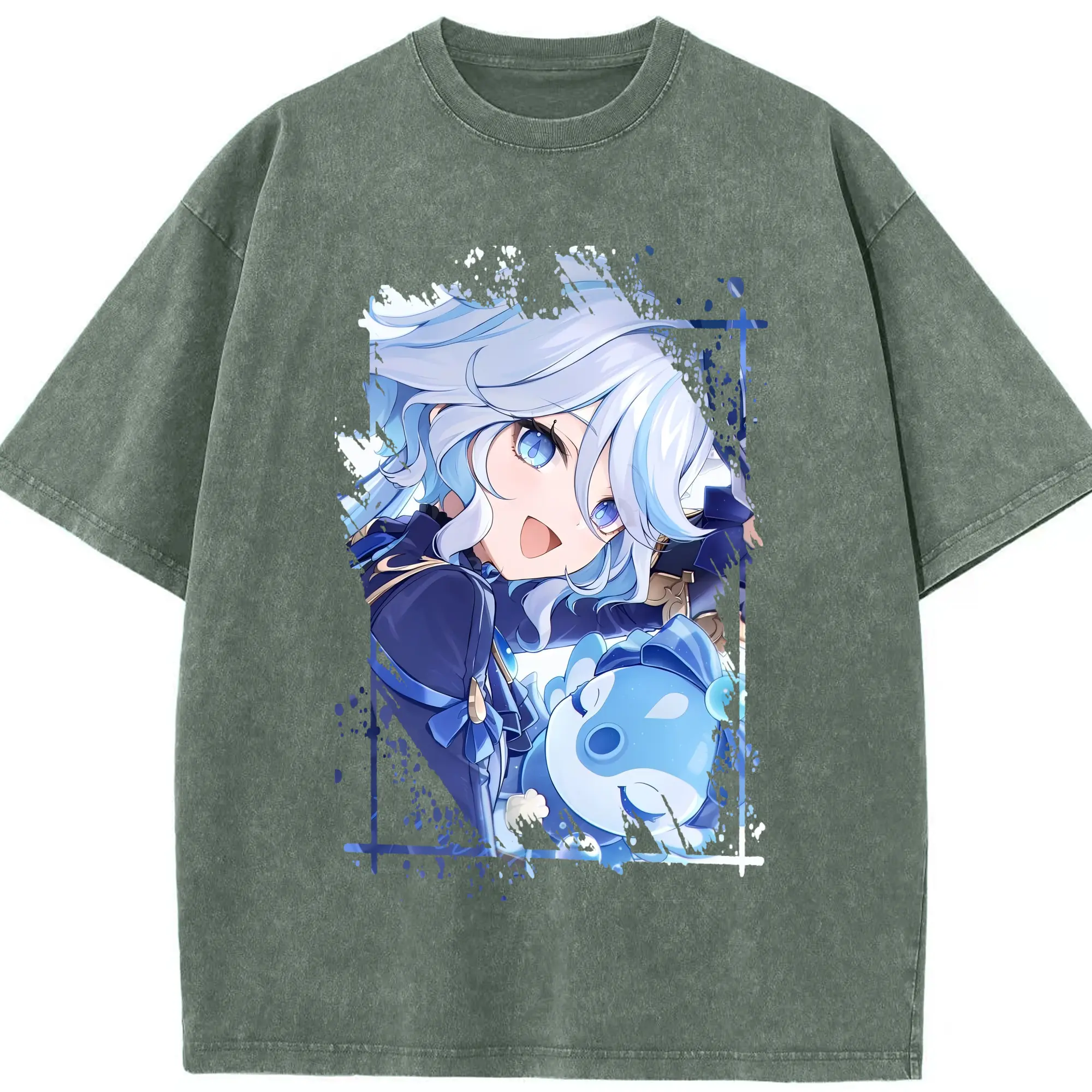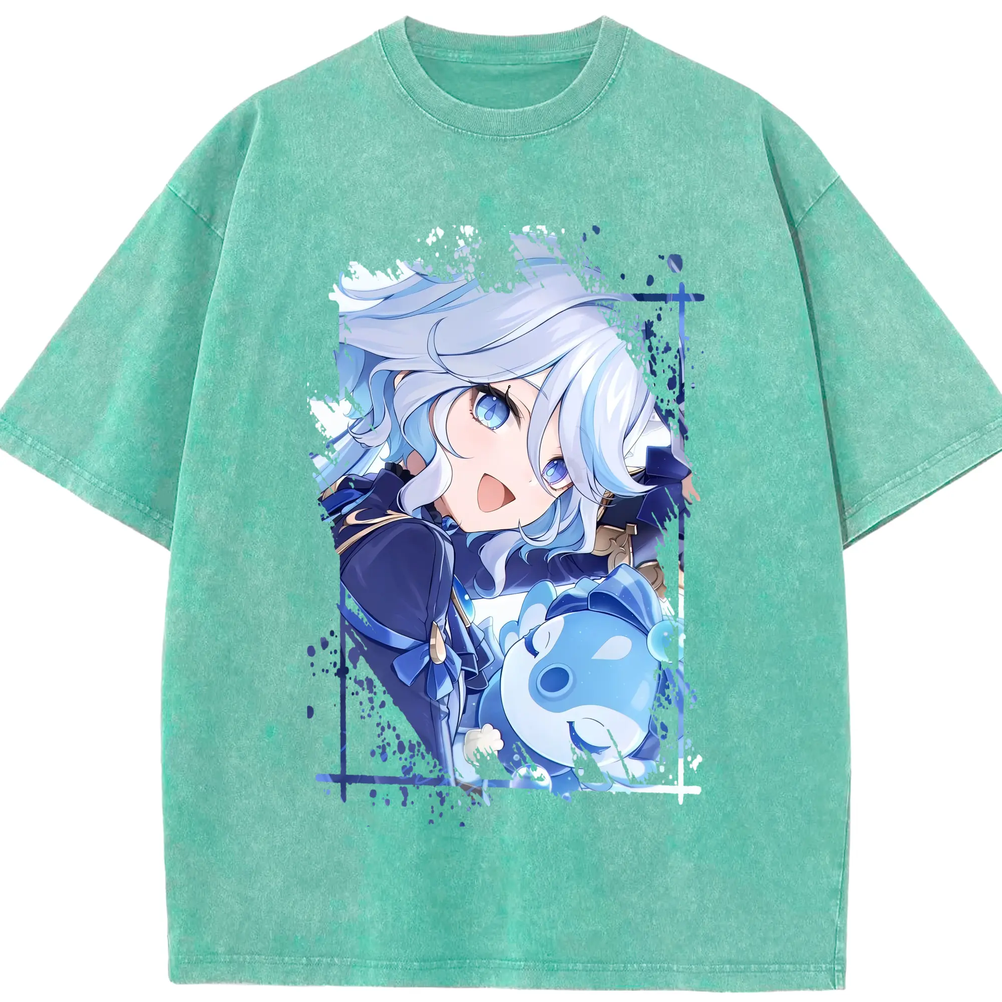 原 神 グッズ フリーナ - 綿100% ヴィンテージ風 半袖Tシャツ ・ 背面プリント ・ 柔らか肌触り ・ 通気性 快適 ・ スポーツ カジュアル 外出用