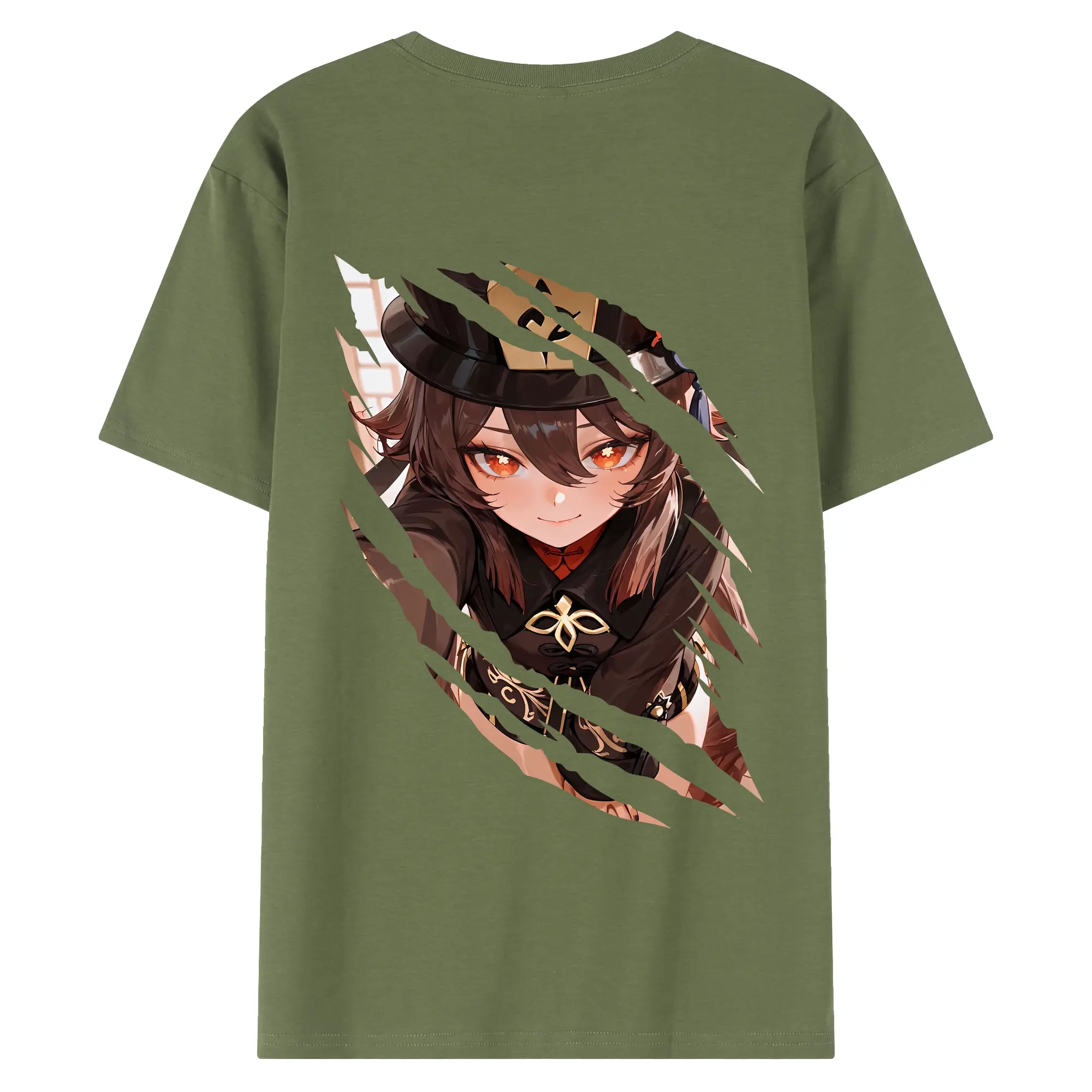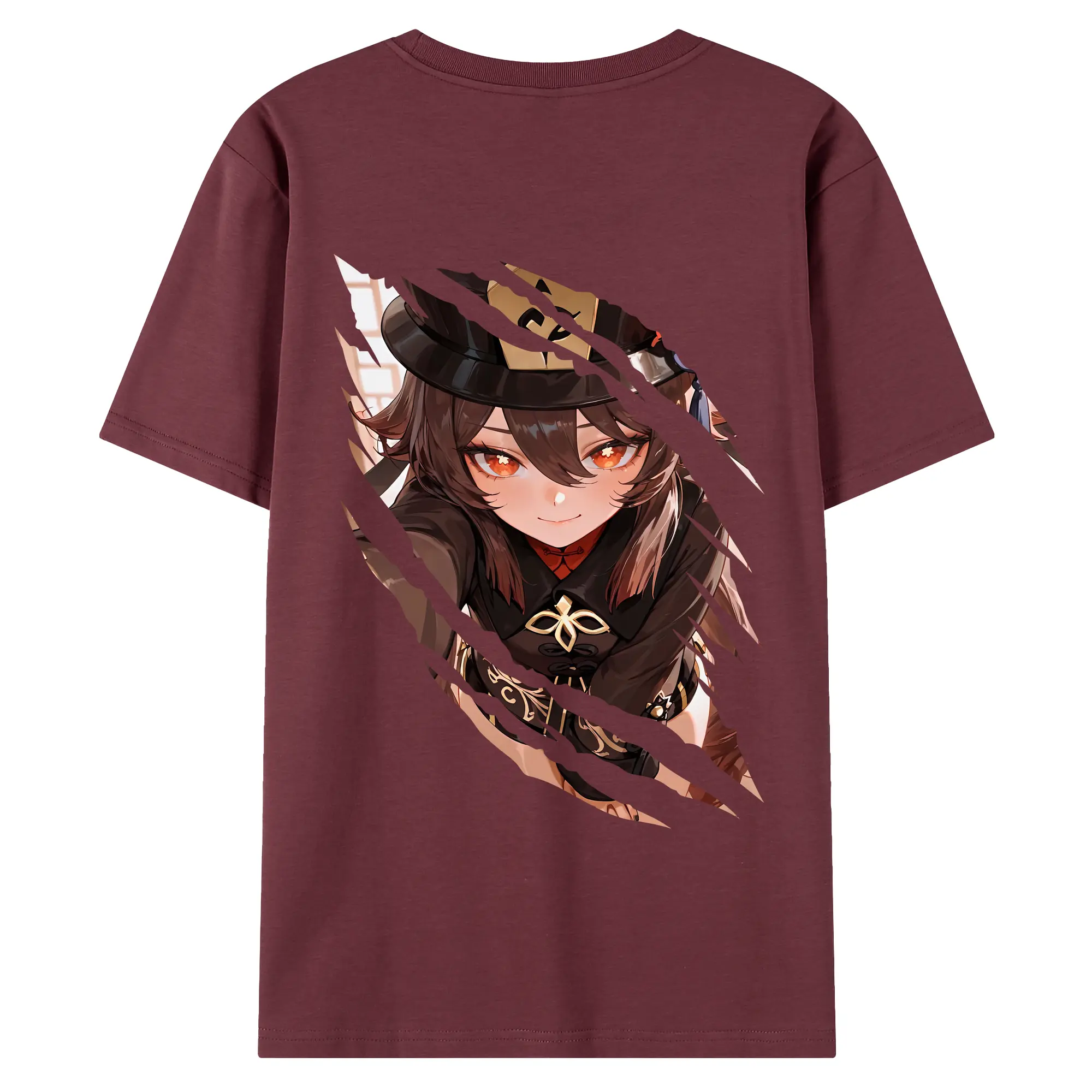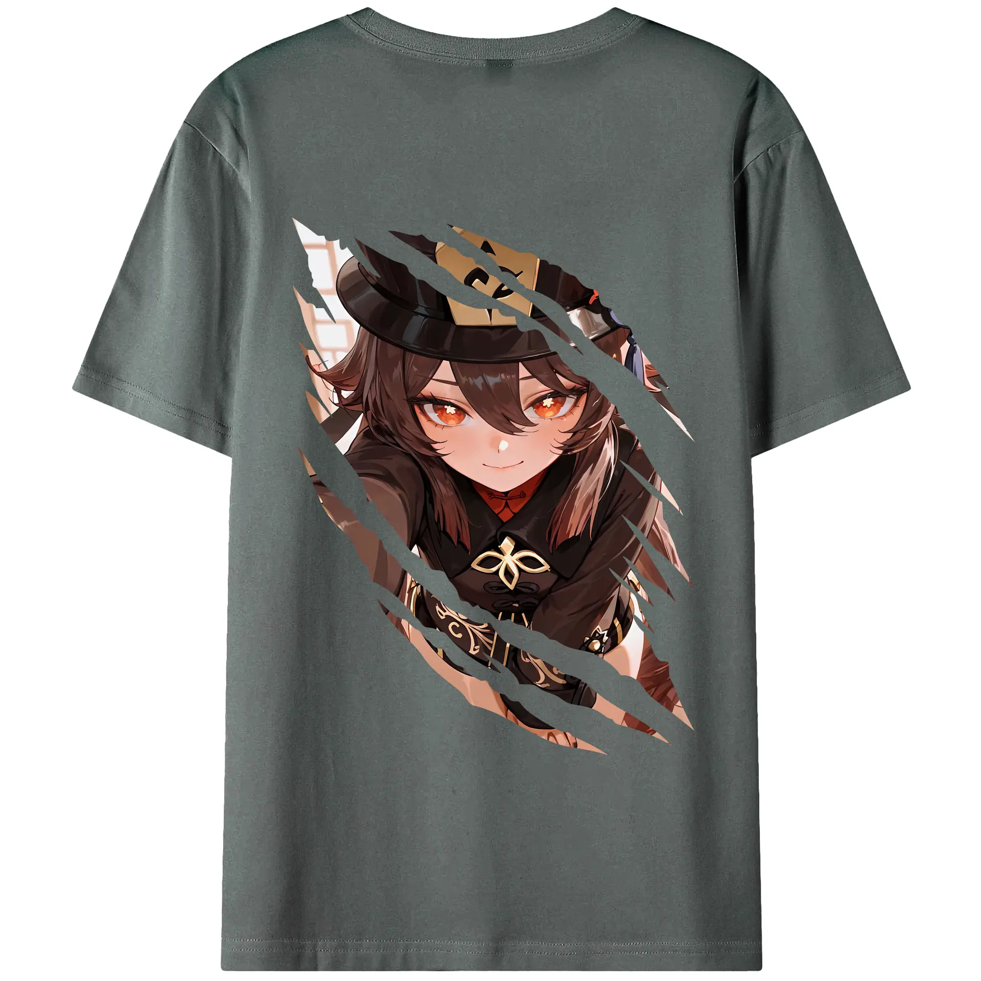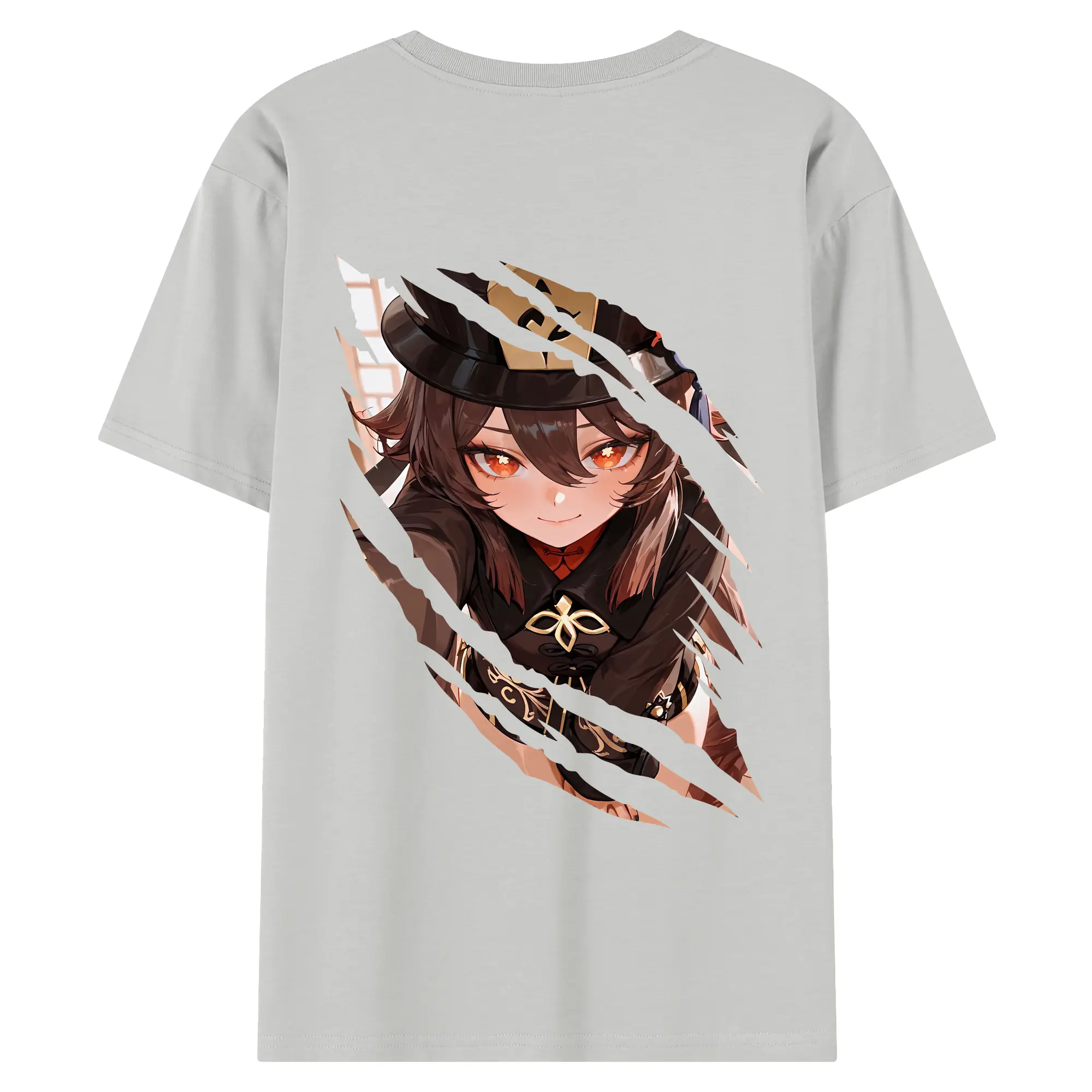 原 神 グッズ フータオ - 綿100% ヴィンテージ風 半袖Tシャツ ・ 背面プリント ・ 柔らか肌触り ・ 通気性 快適 ・ スポーツ カジュアル 外出用
