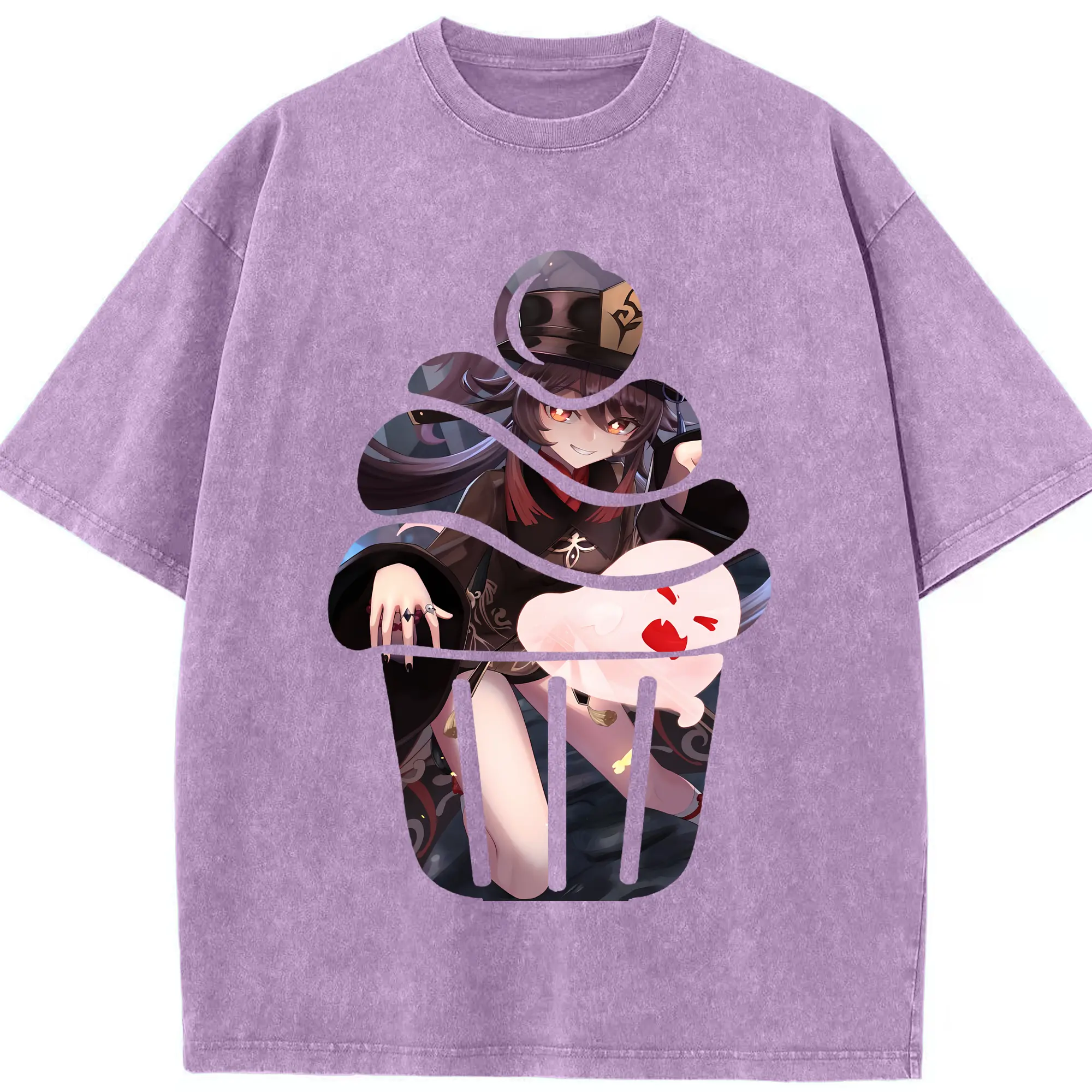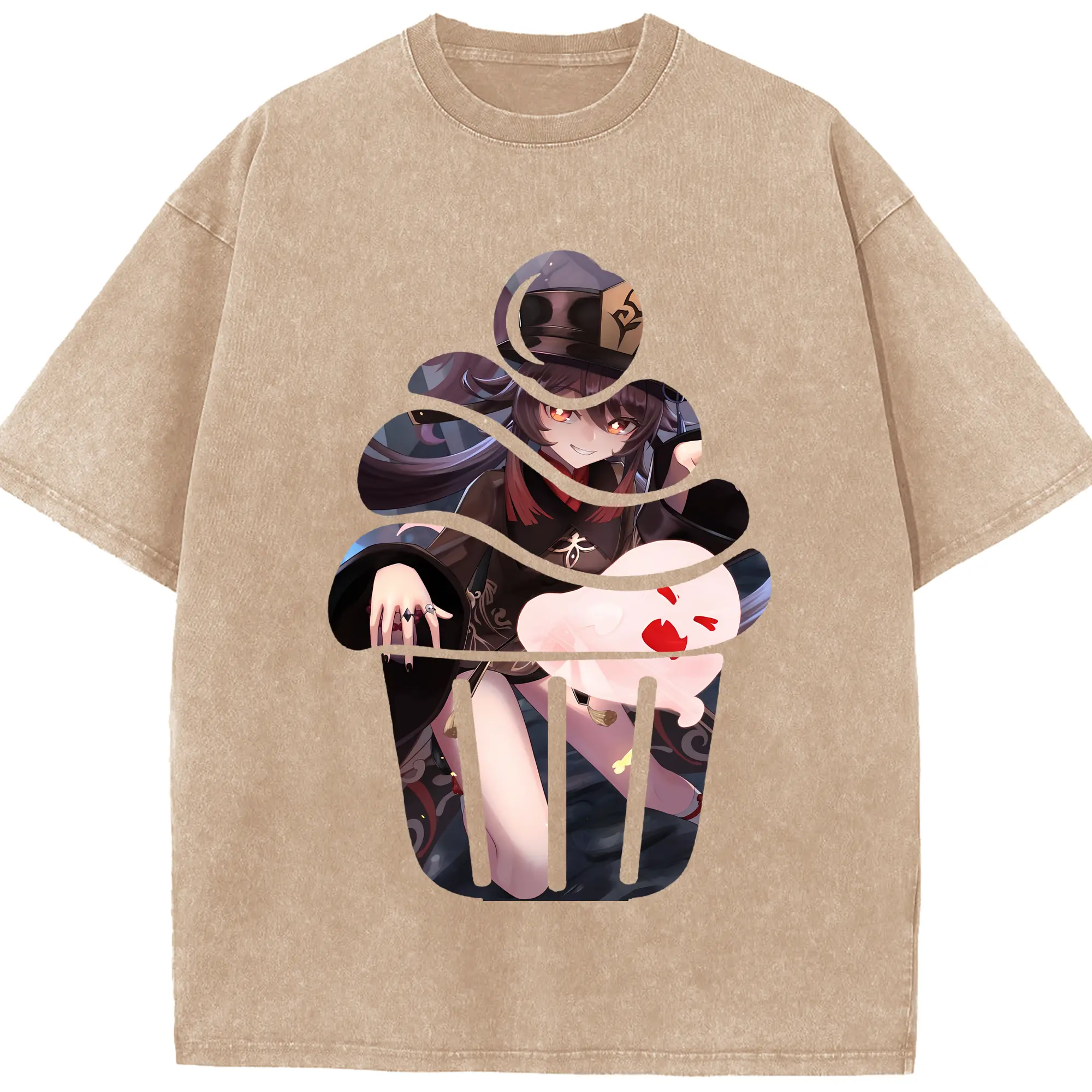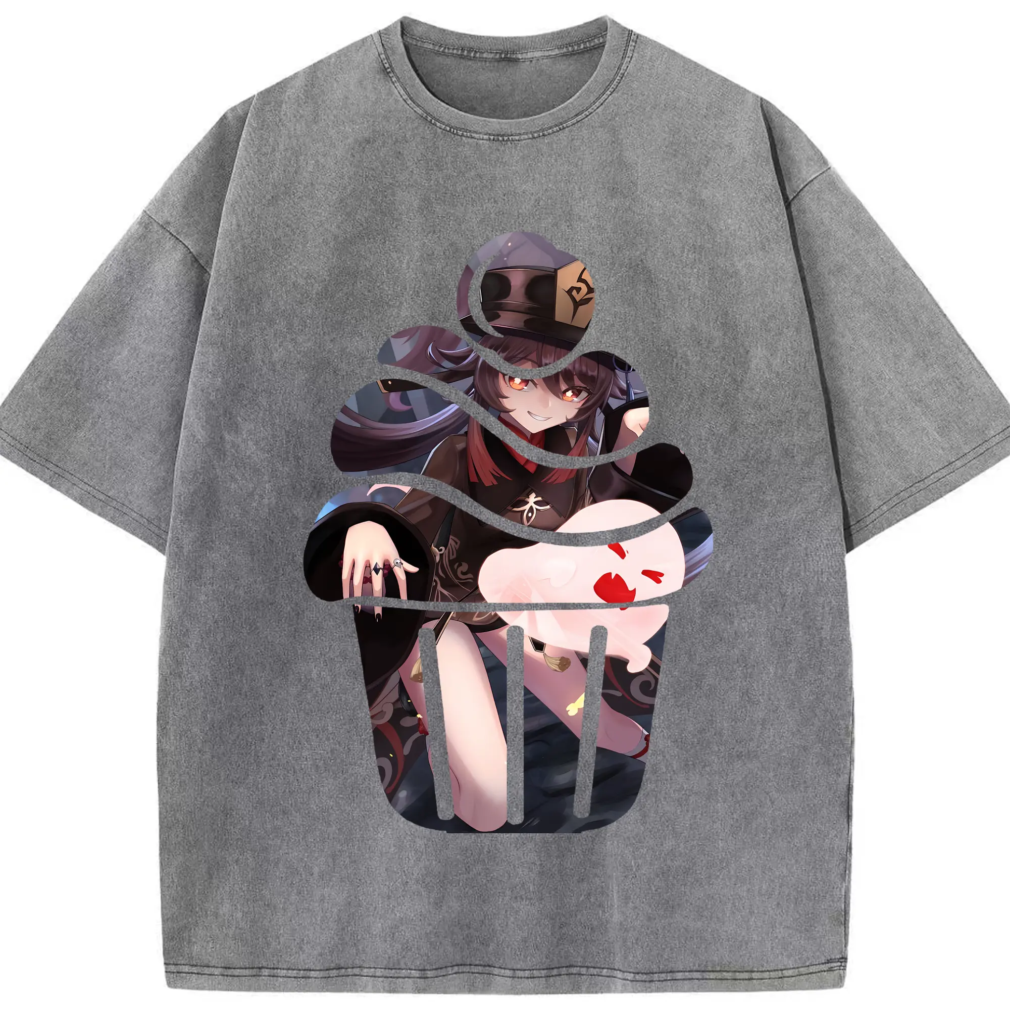 原 神 グッズ フータオ - 綿100% ヴィンテージ風 半袖Tシャツ ・ 背面プリント ・ 柔らか肌触り ・ 通気性 快適 ・ スポーツ カジュアル 外出用