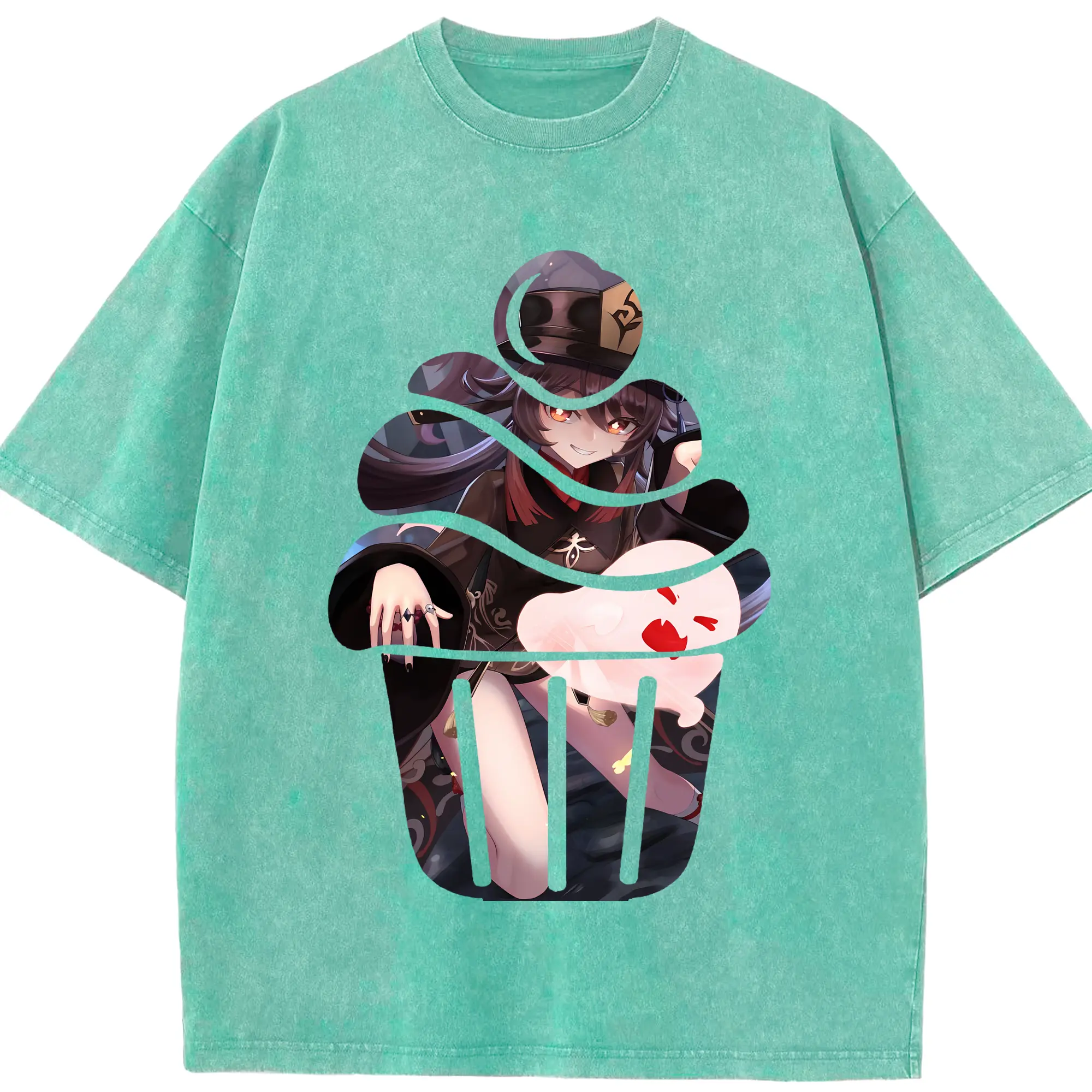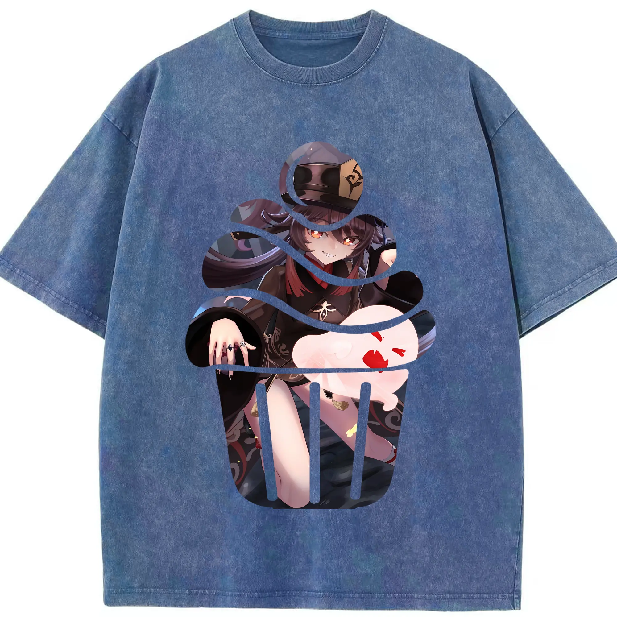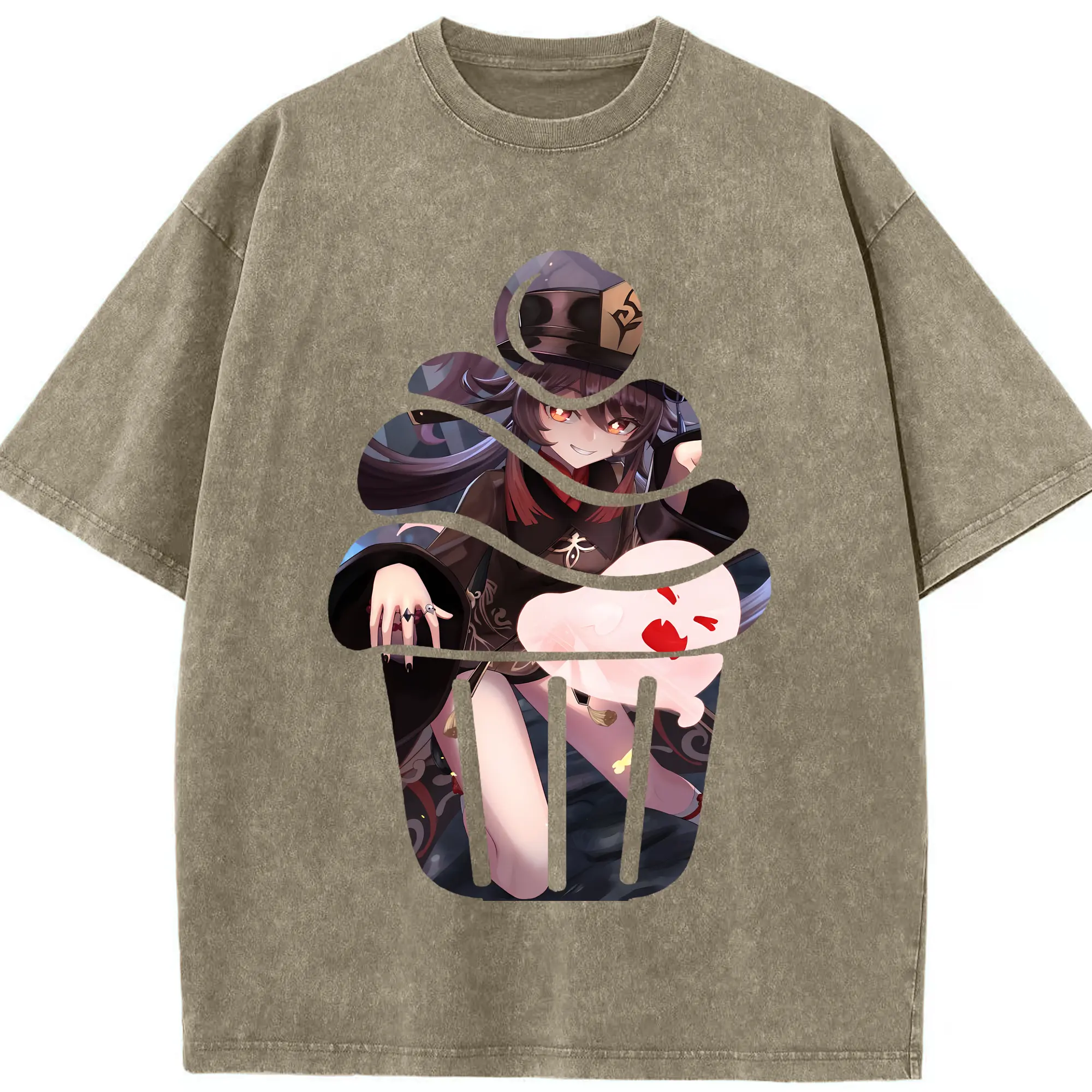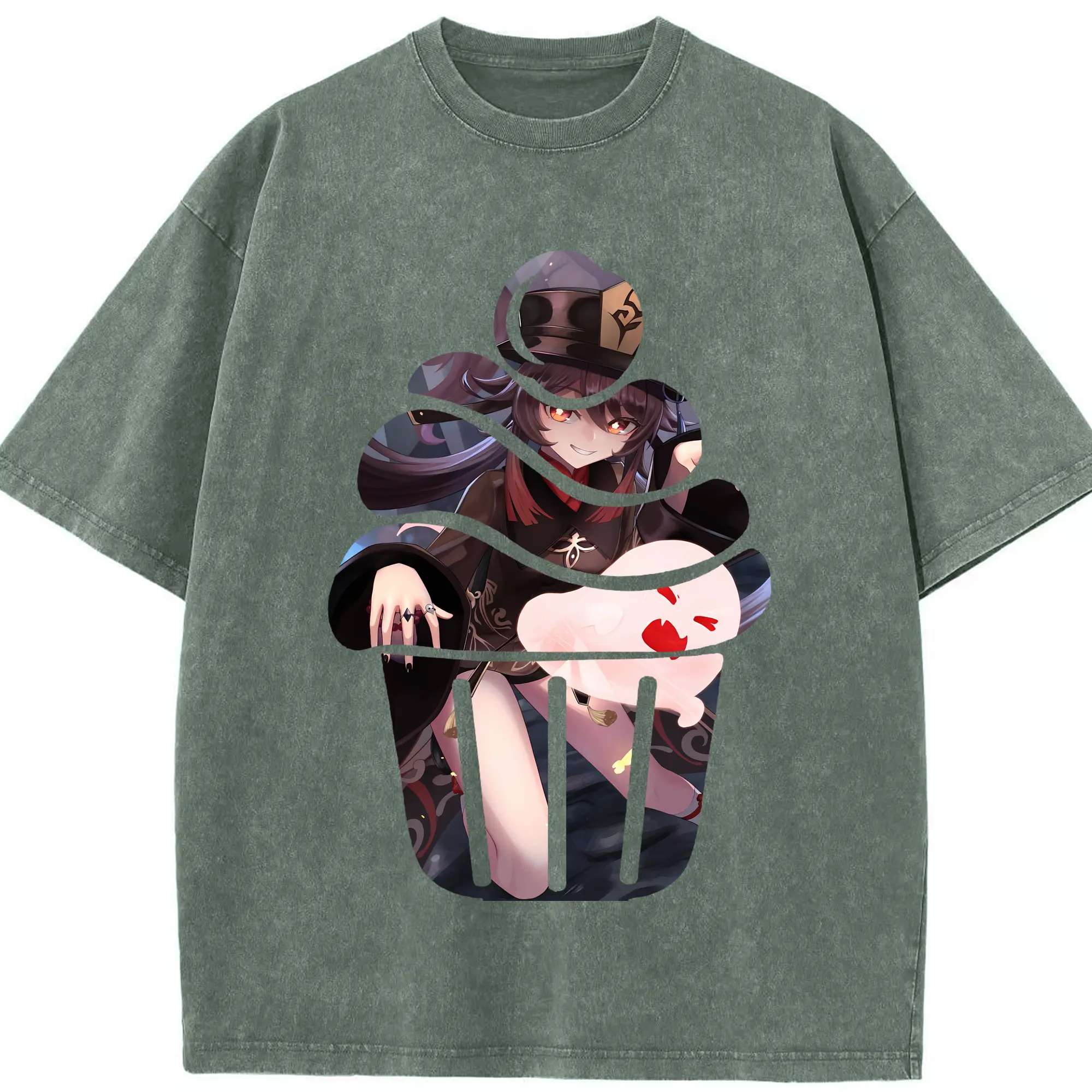 原 神 グッズ フータオ - 綿100% ヴィンテージ風 半袖Tシャツ ・ 背面プリント ・ 柔らか肌触り ・ 通気性 快適 ・ スポーツ カジュアル 外出用