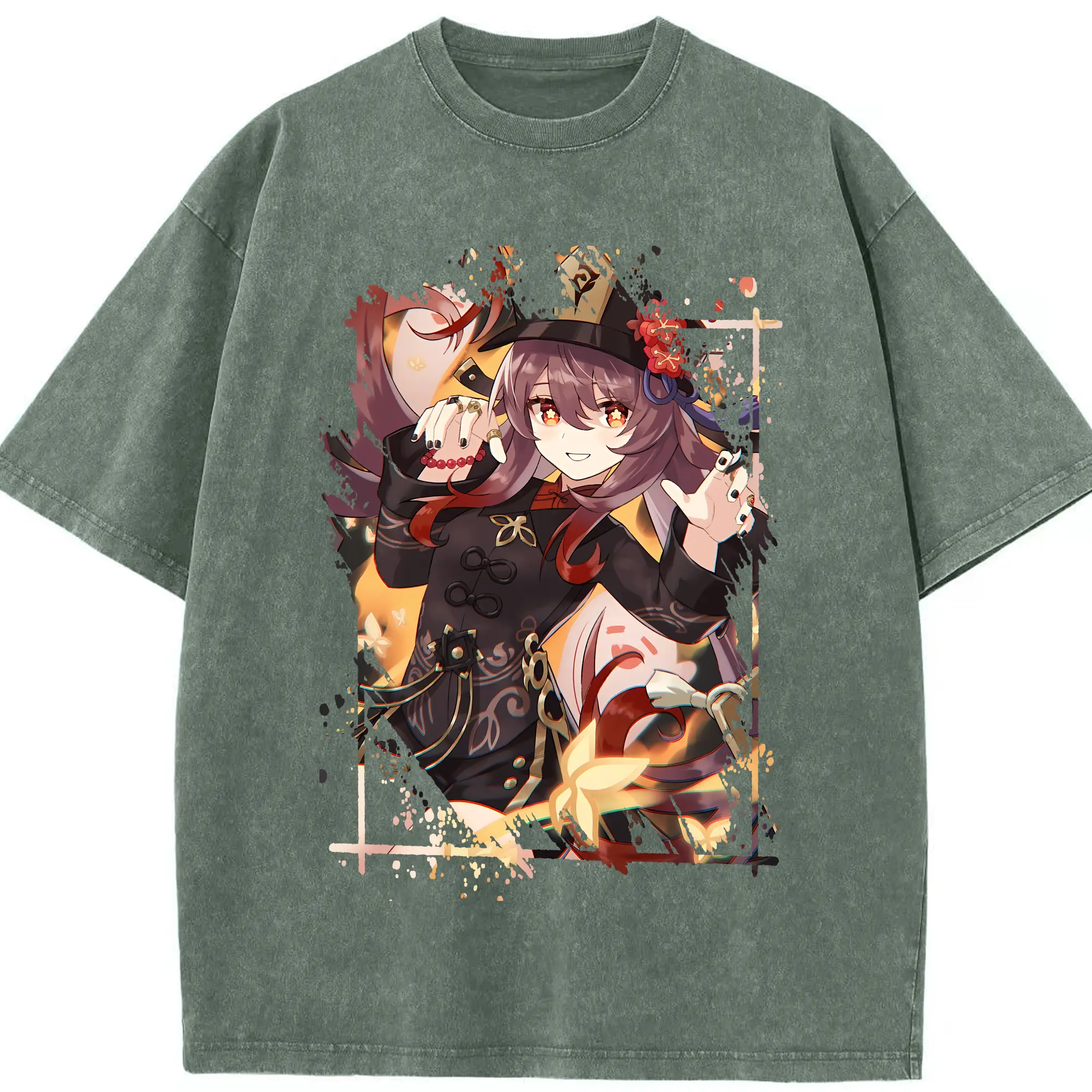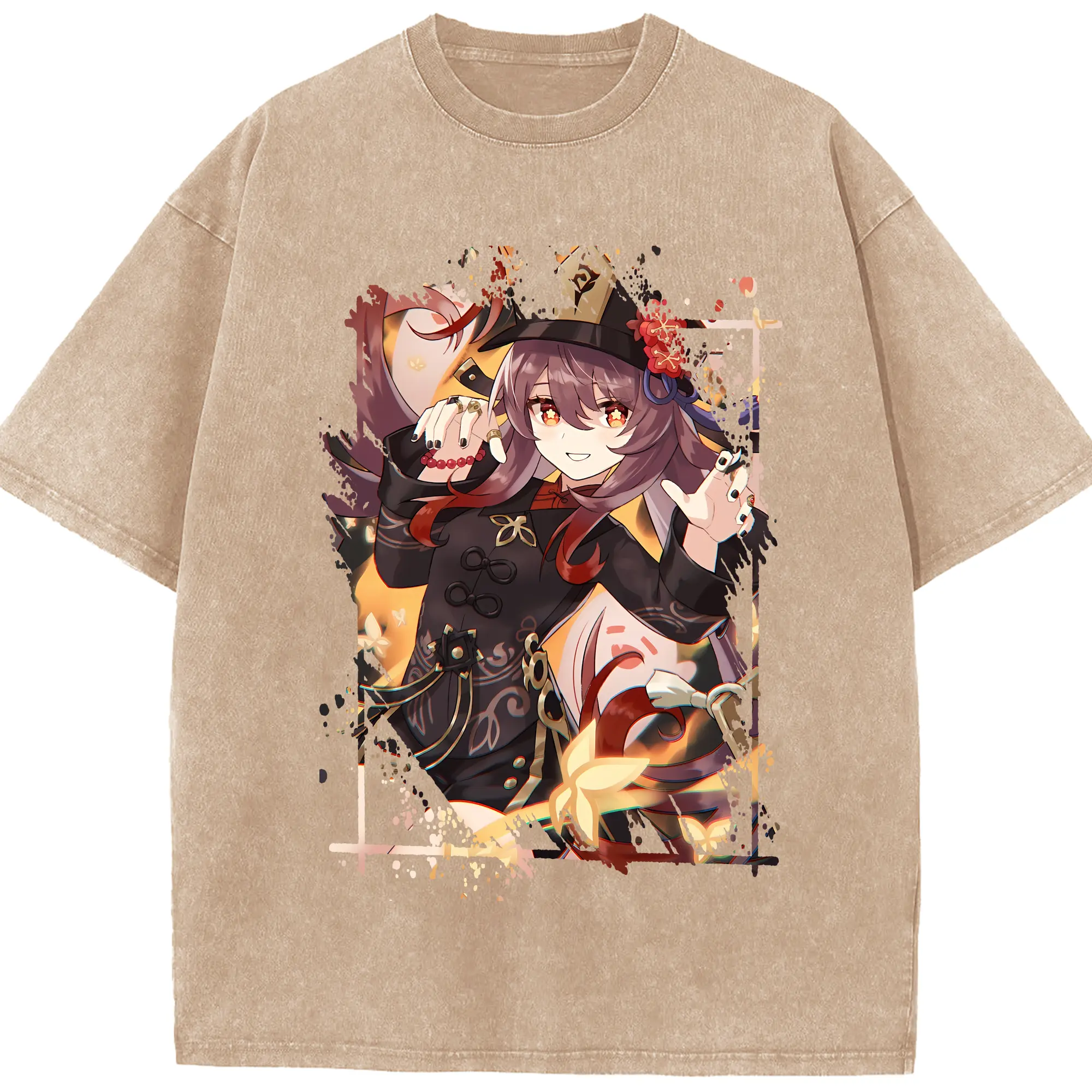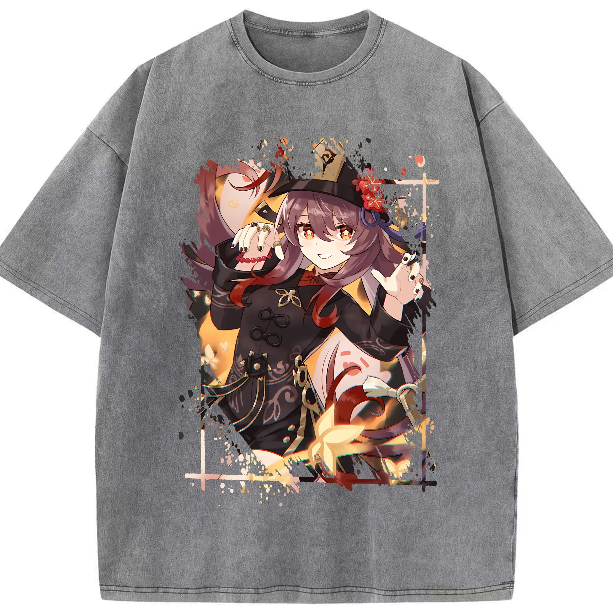 原 神 グッズ フータオ - 綿100% ヴィンテージ風 半袖Tシャツ ・ 背面プリント ・ 柔らか肌触り ・ 通気性 快適 ・ スポーツ カジュアル 外出用