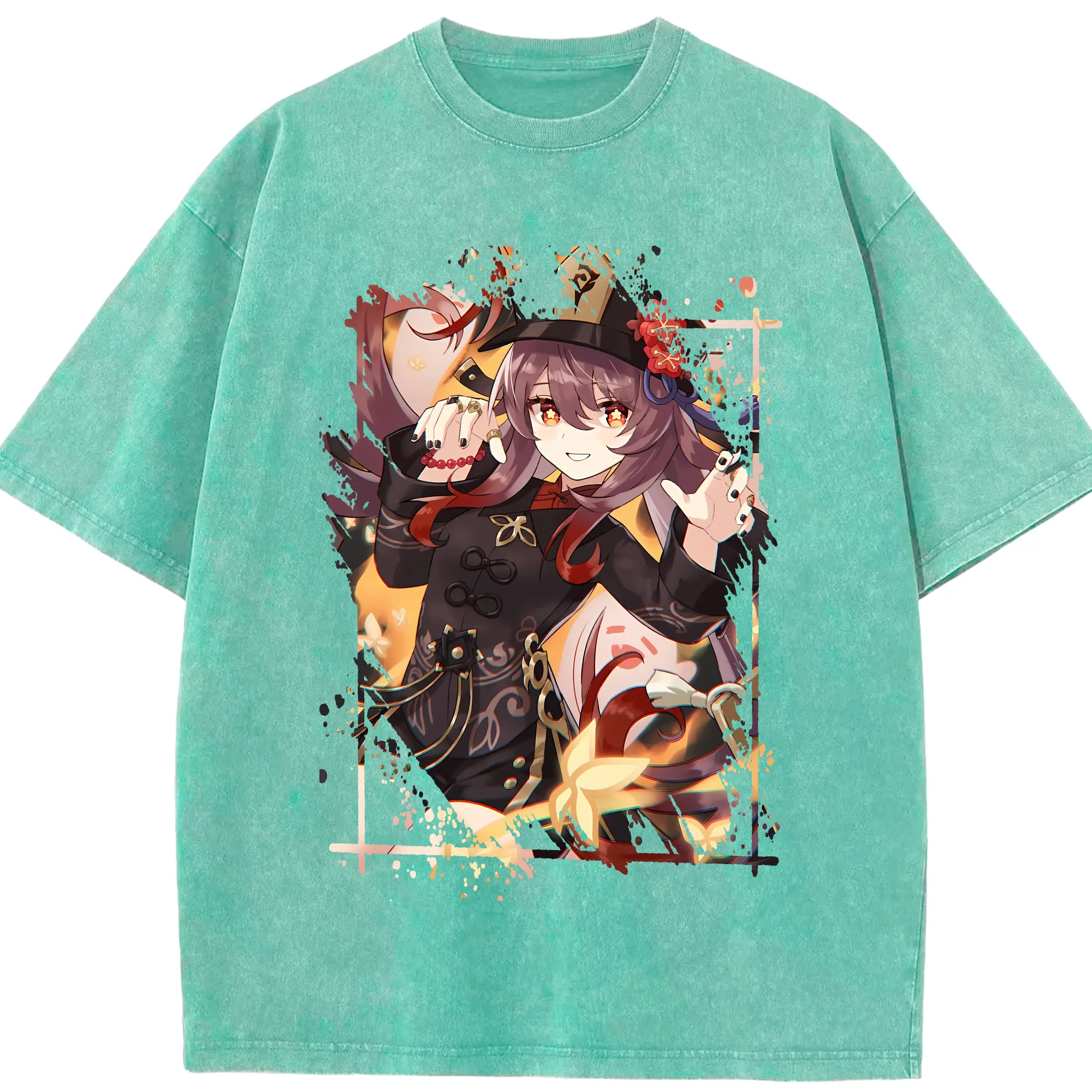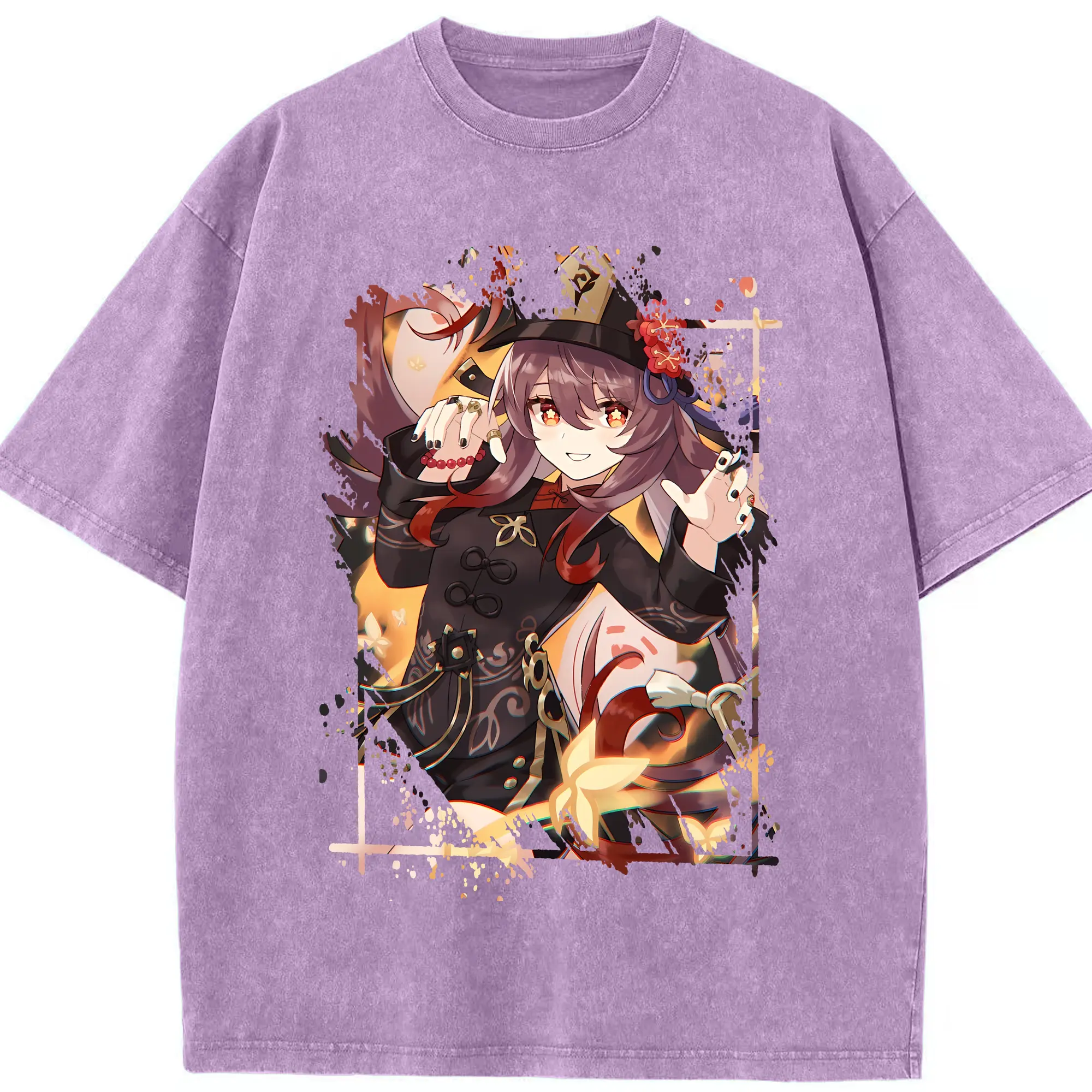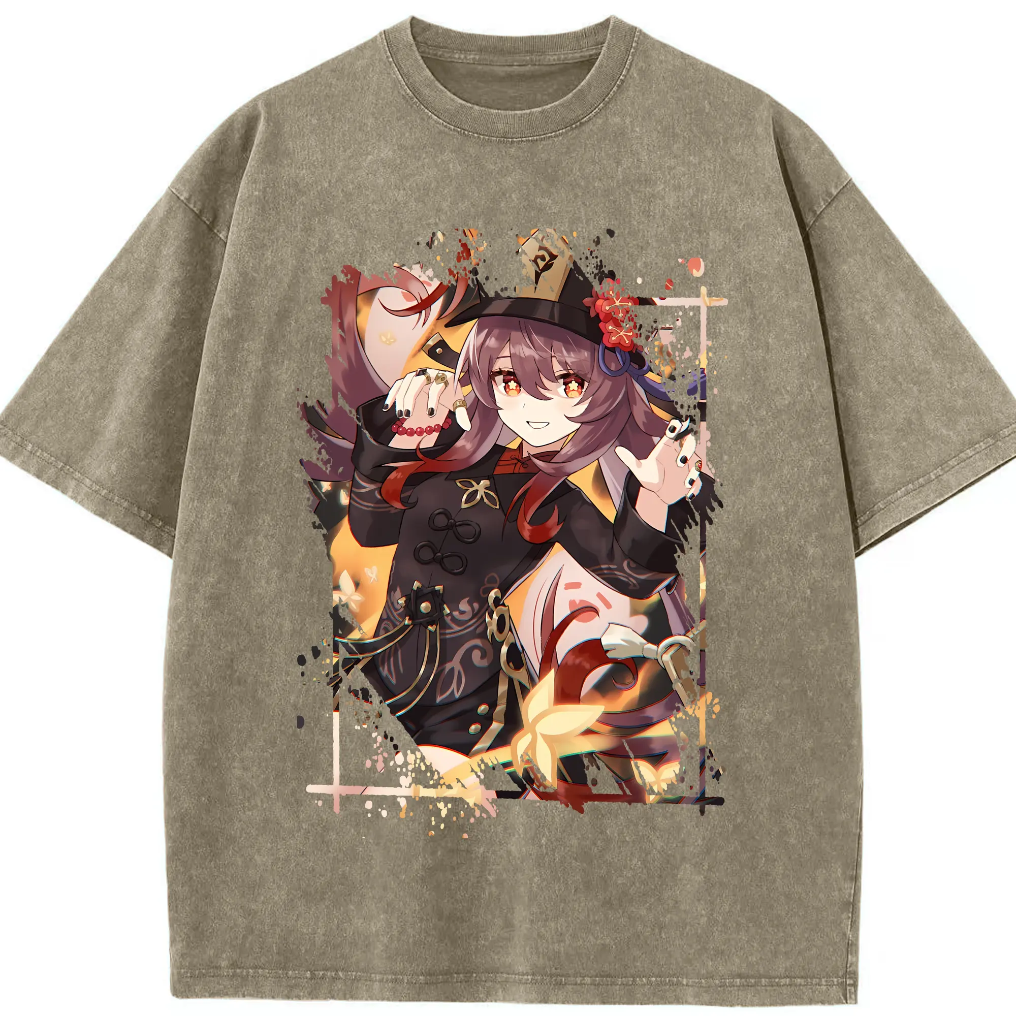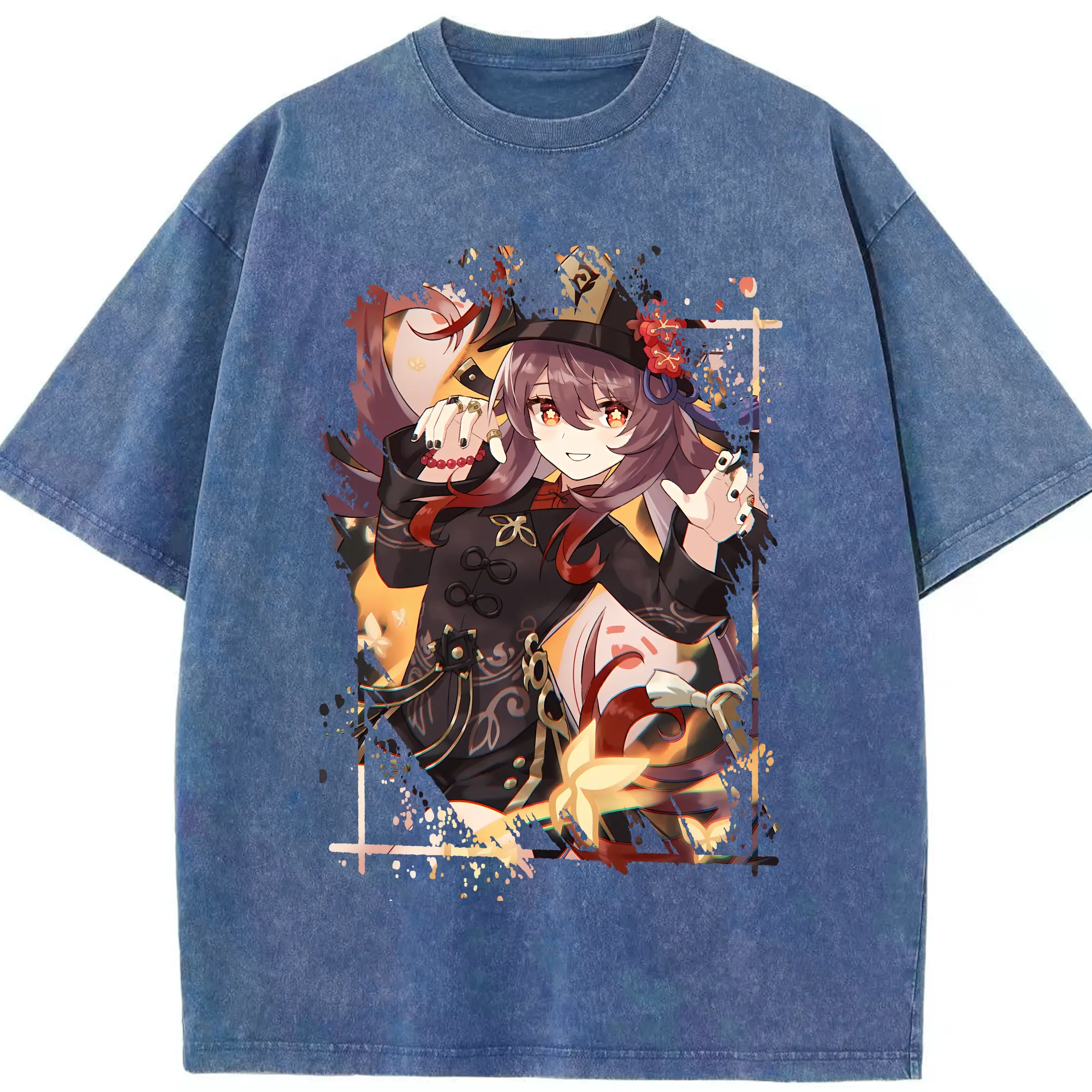 原 神 グッズ フータオ - 綿100% ヴィンテージ風 半袖Tシャツ ・ 背面プリント ・ 柔らか肌触り ・ 通気性 快適 ・ スポーツ カジュアル 外出用