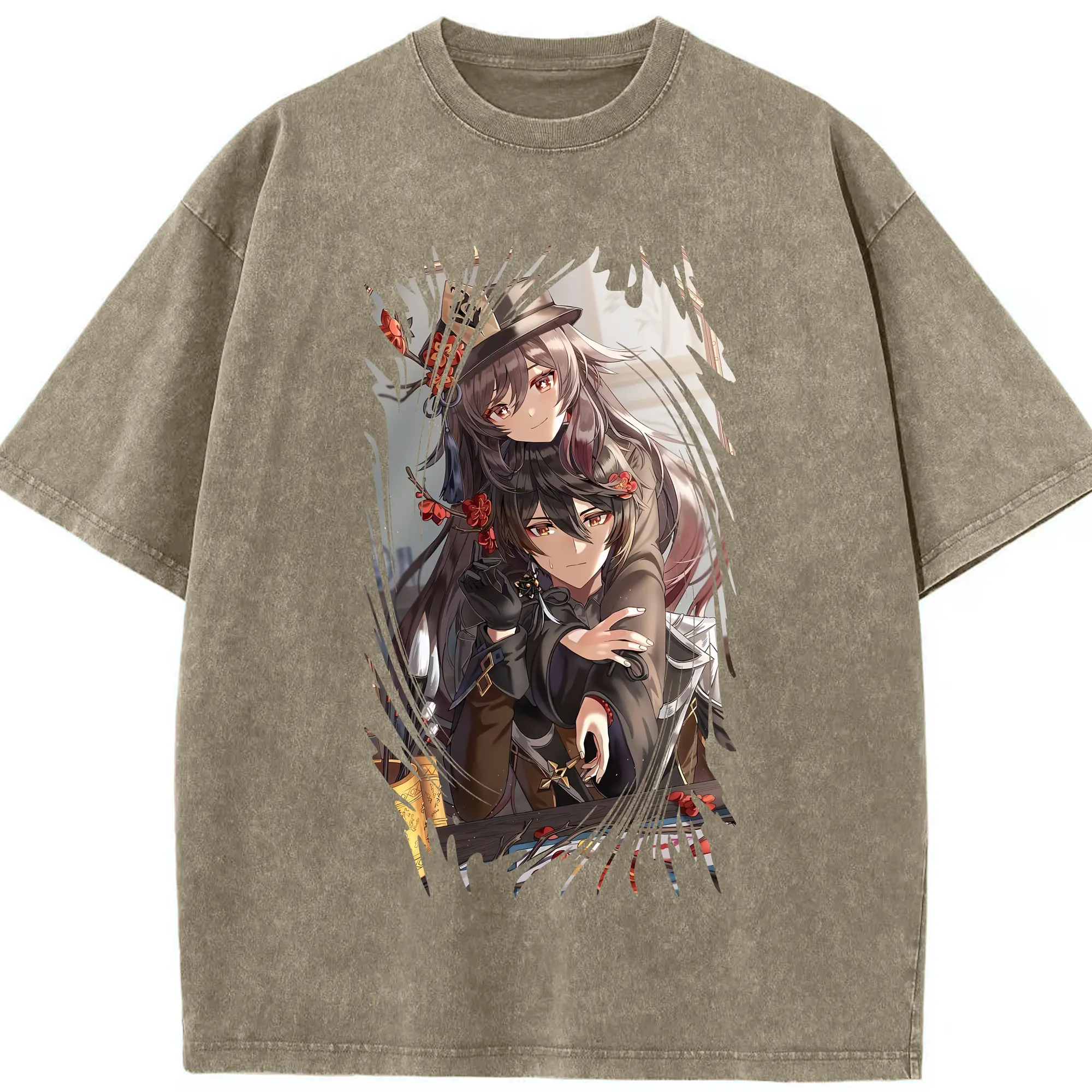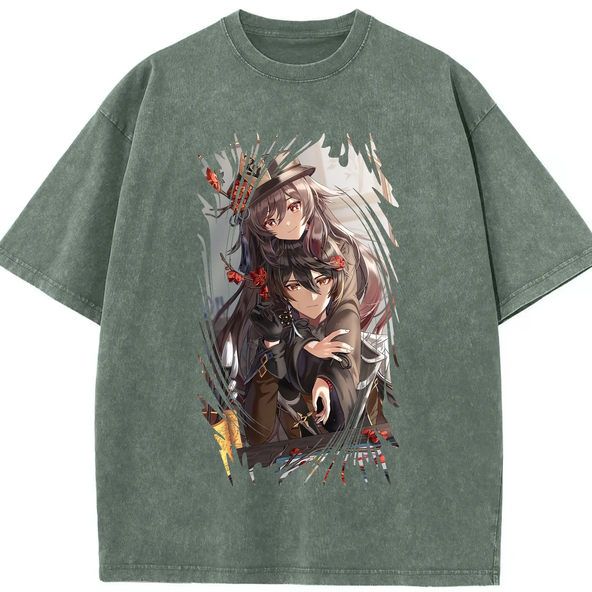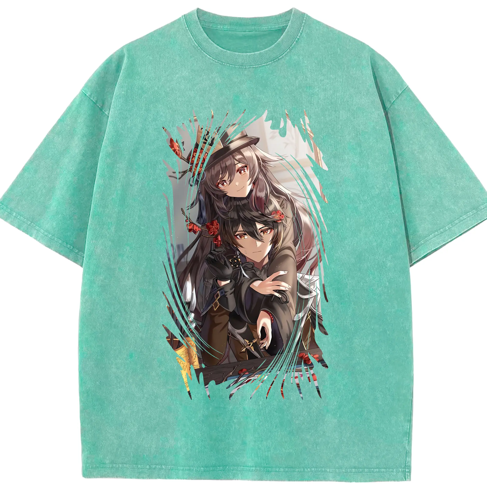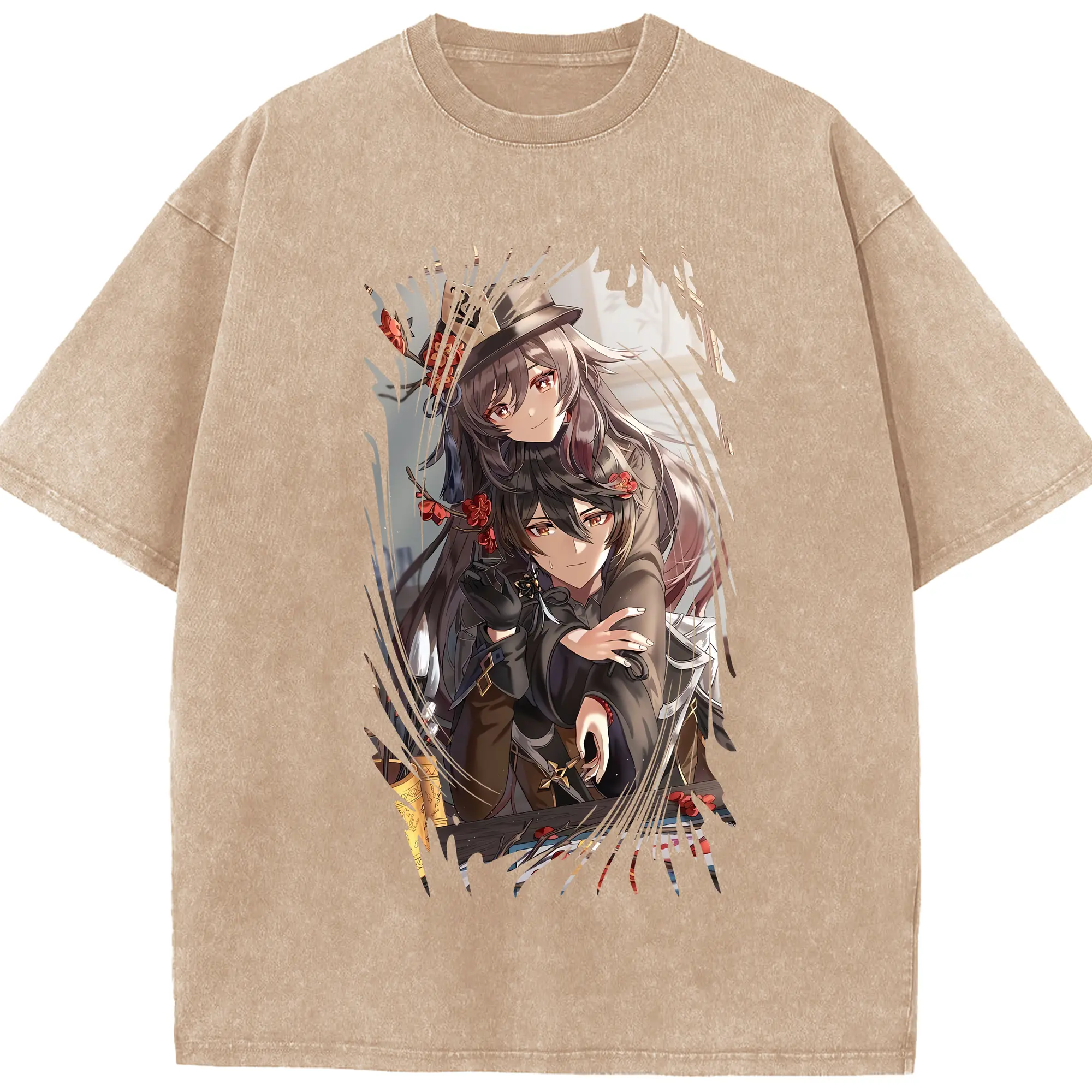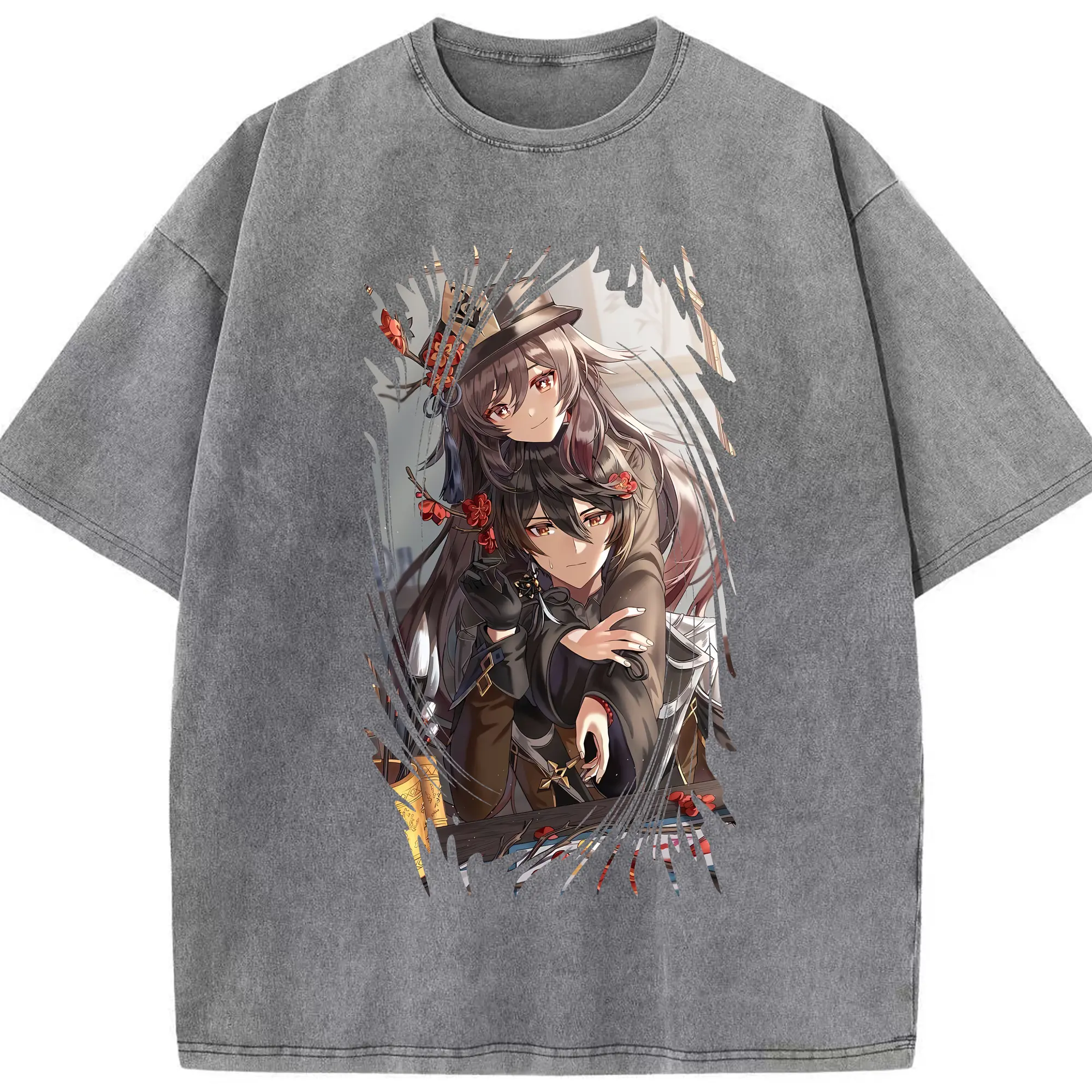 原 神 グッズ フータオ - 綿100% ヴィンテージ風 半袖Tシャツ ・ 背面プリント ・ 柔らか肌触り ・ 通気性 快適 ・ スポーツ カジュアル 外出用