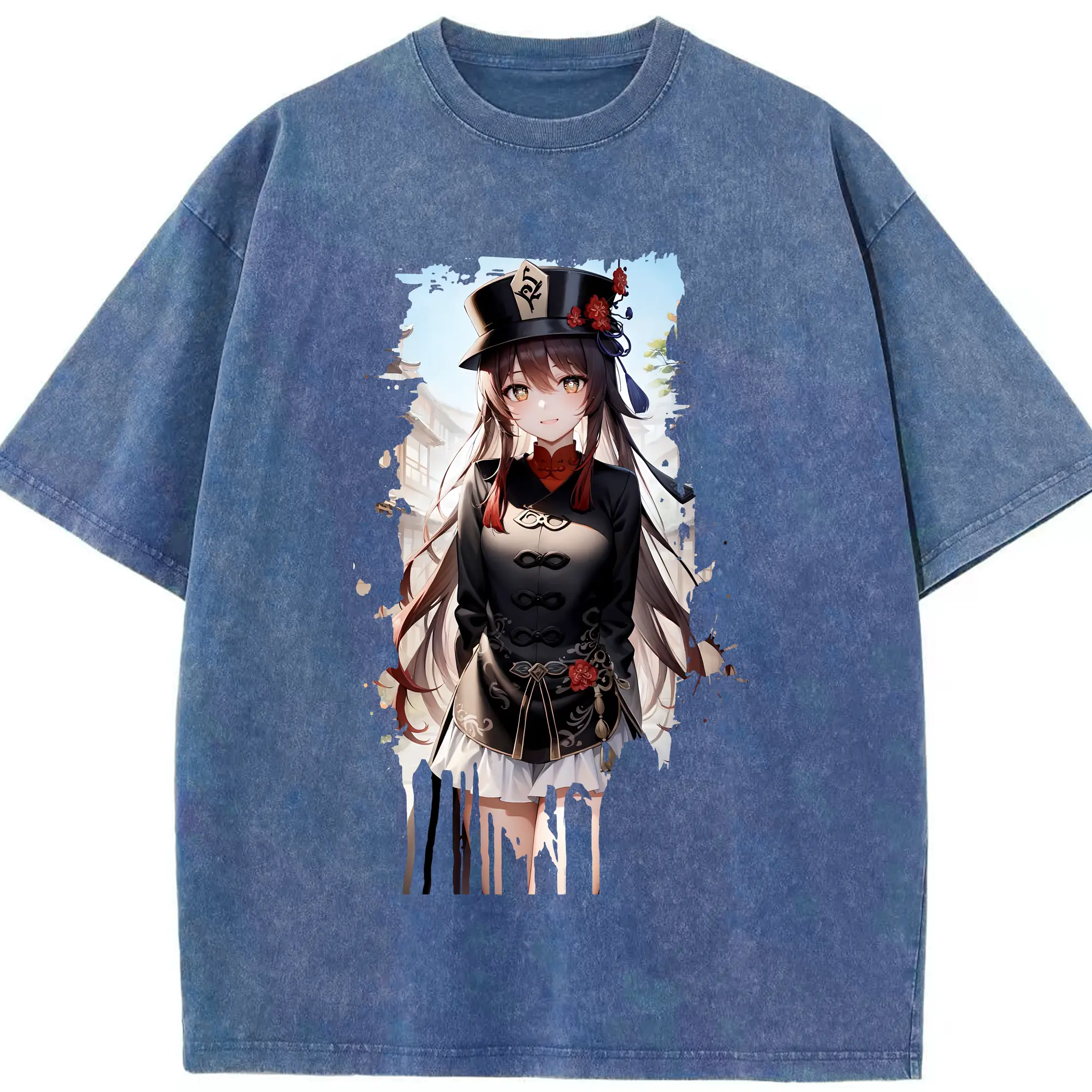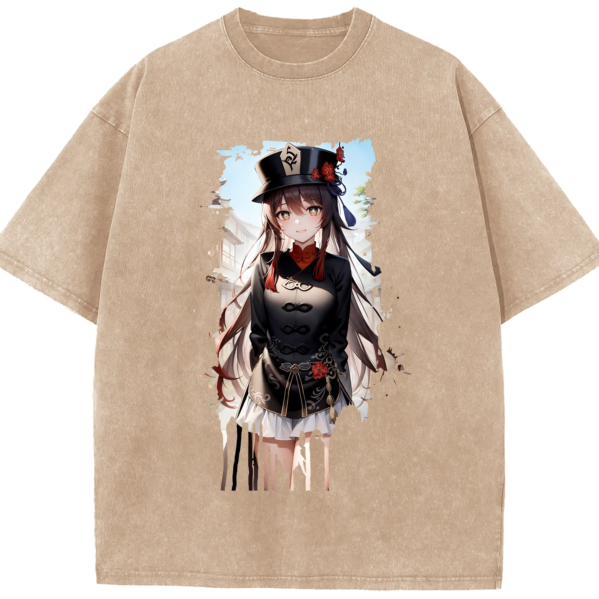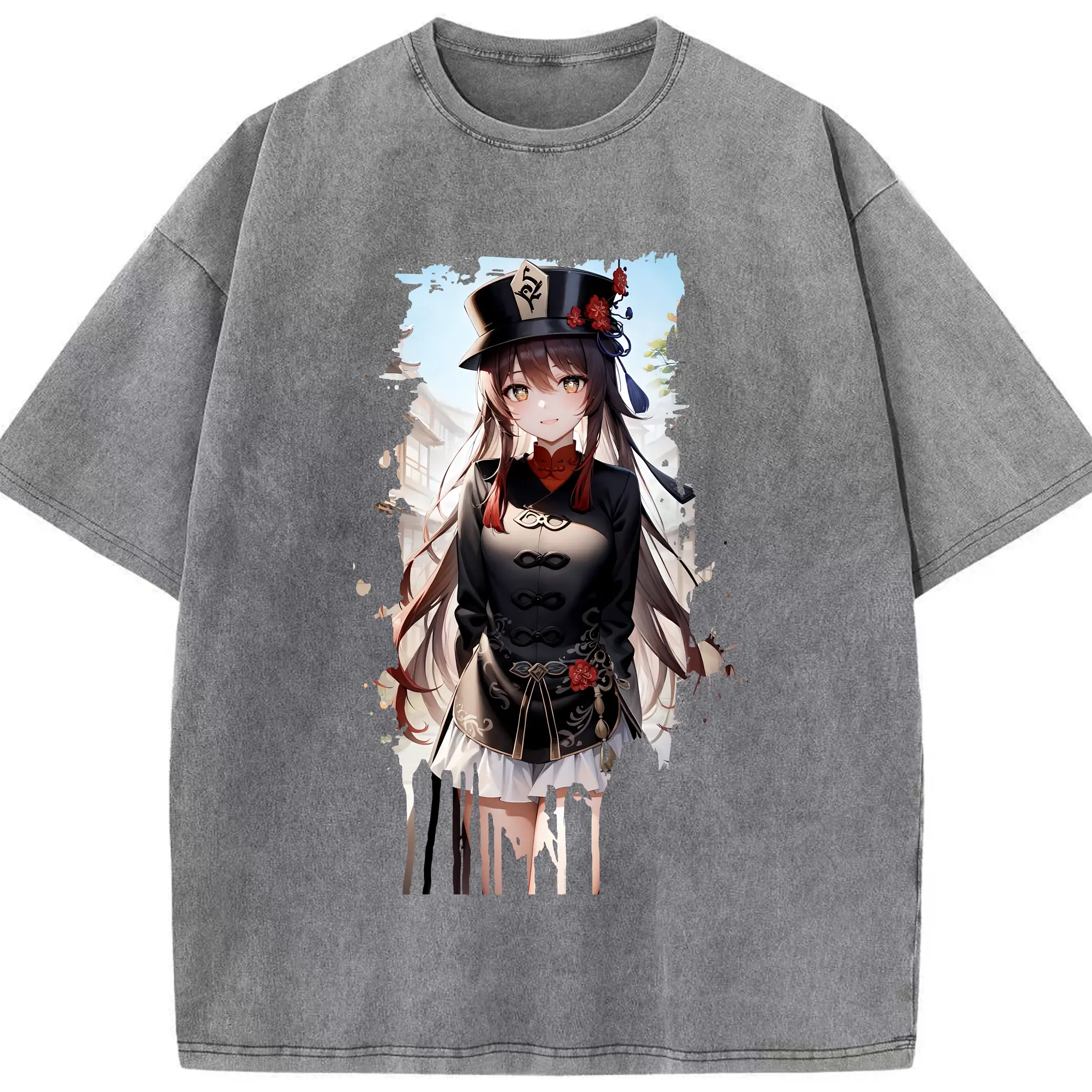 原 神 グッズ フータオ - 綿100% ヴィンテージ風 半袖Tシャツ ・ 背面プリント ・ 柔らか肌触り ・ 通気性 快適 ・ スポーツ カジュアル 外出用