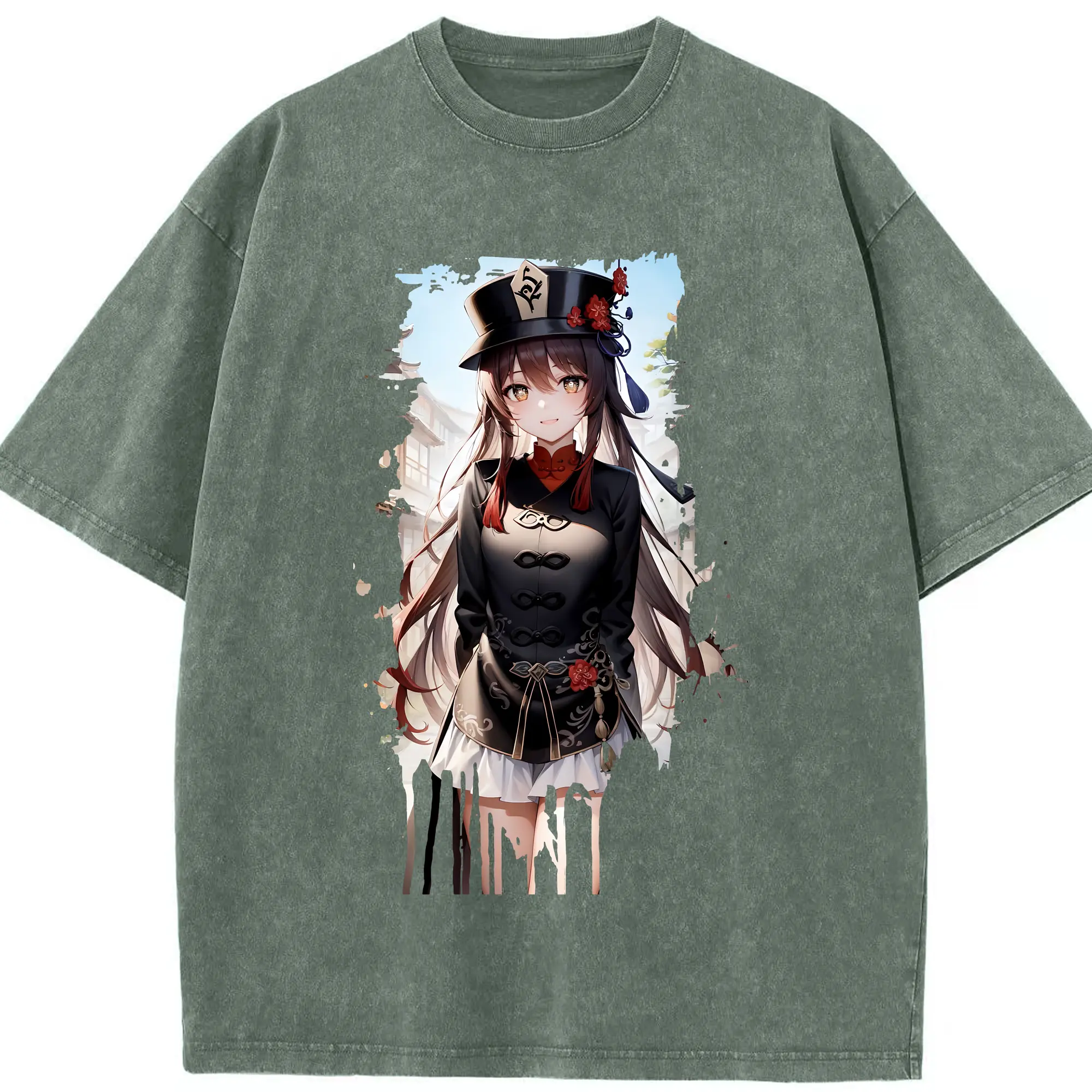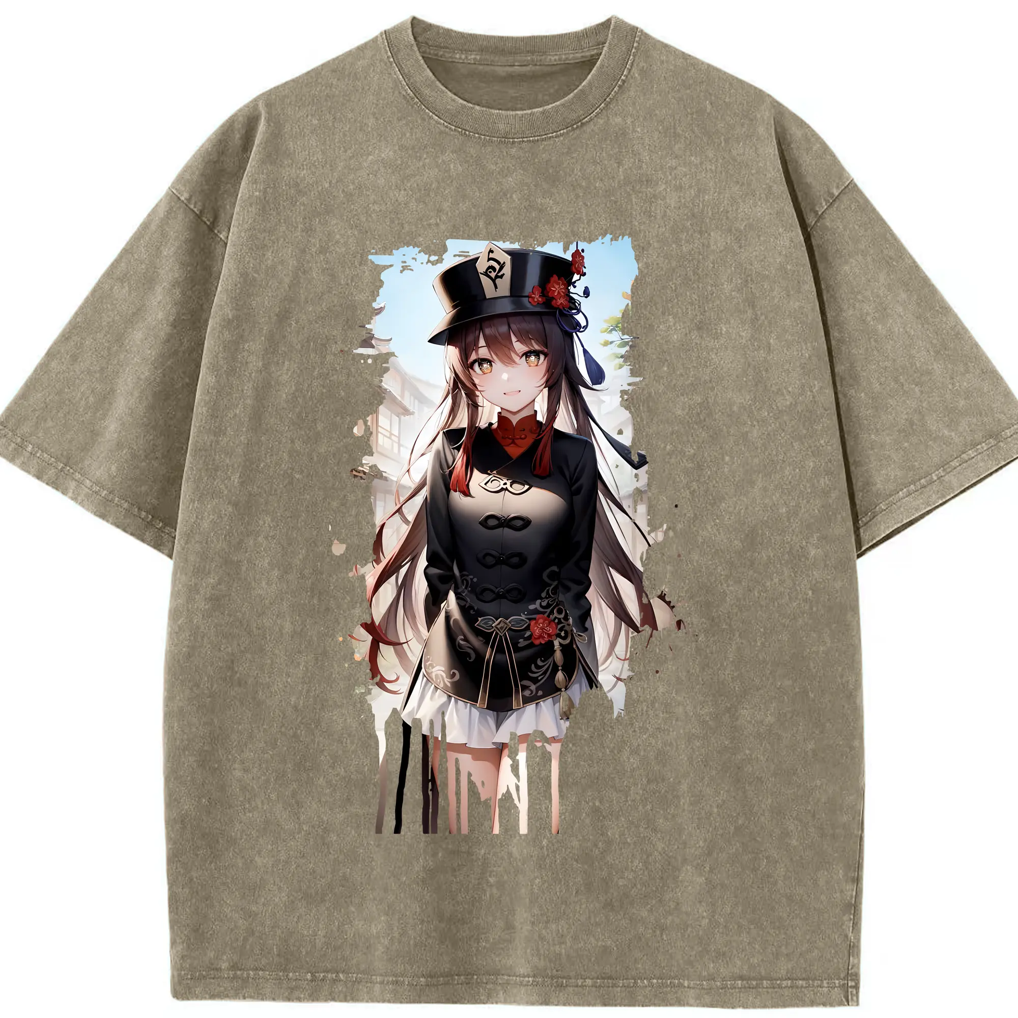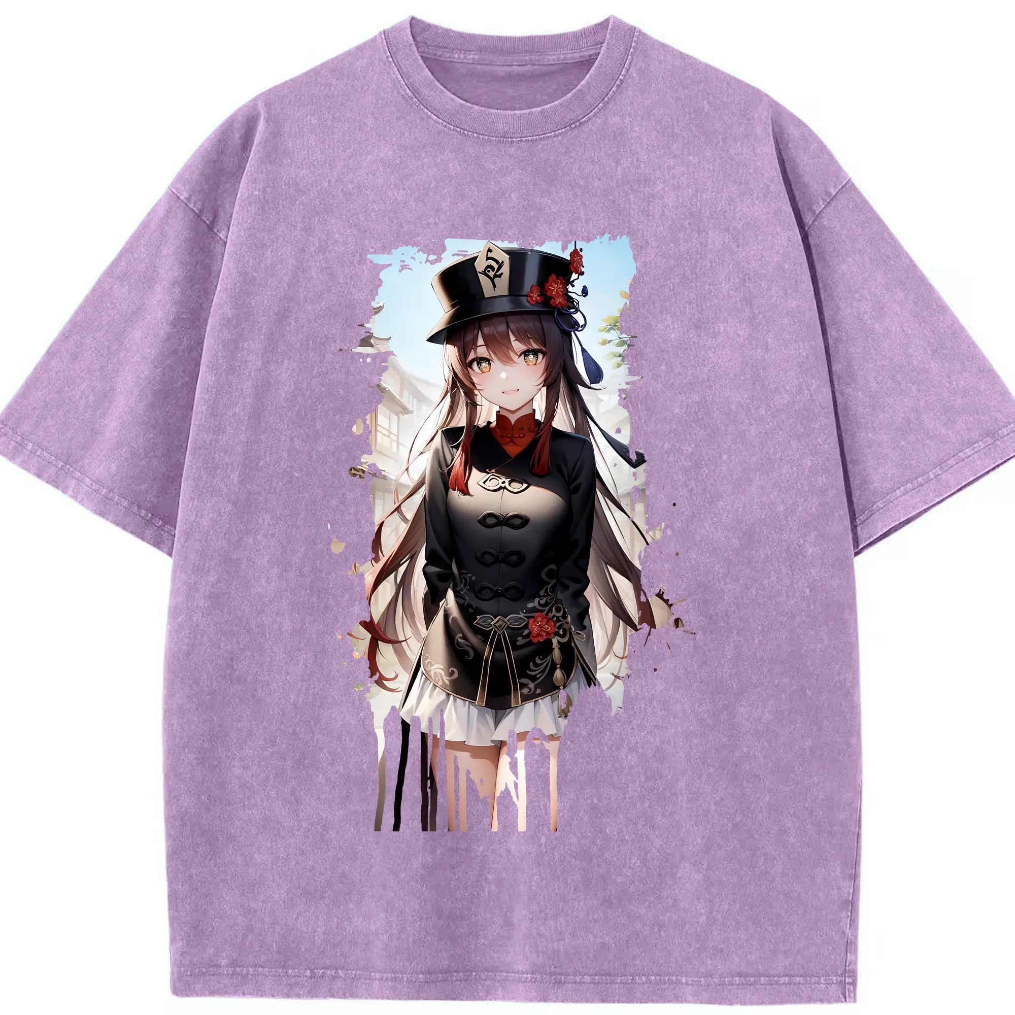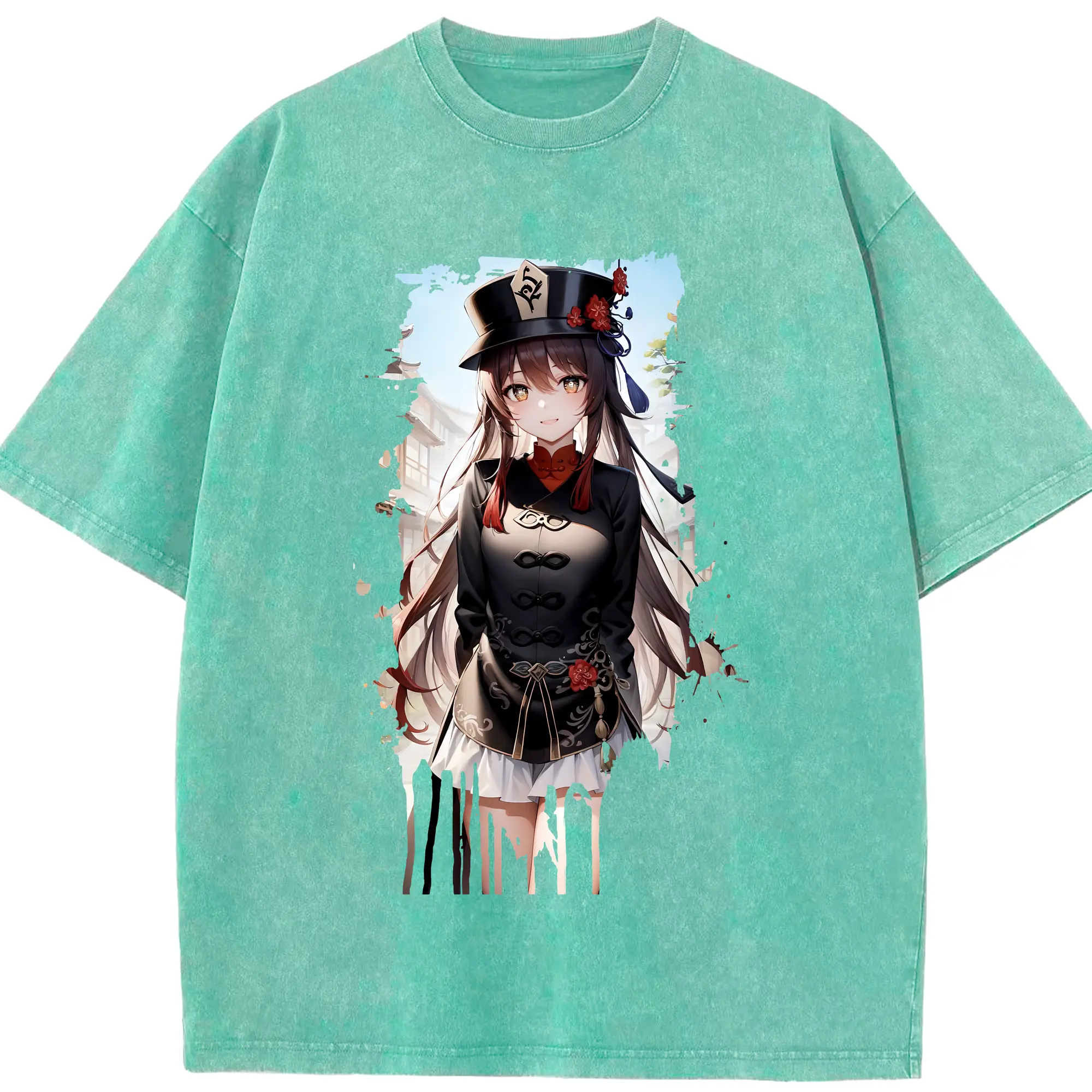 原 神 グッズ フータオ - 綿100% ヴィンテージ風 半袖Tシャツ ・ 背面プリント ・ 柔らか肌触り ・ 通気性 快適 ・ スポーツ カジュアル 外出用
