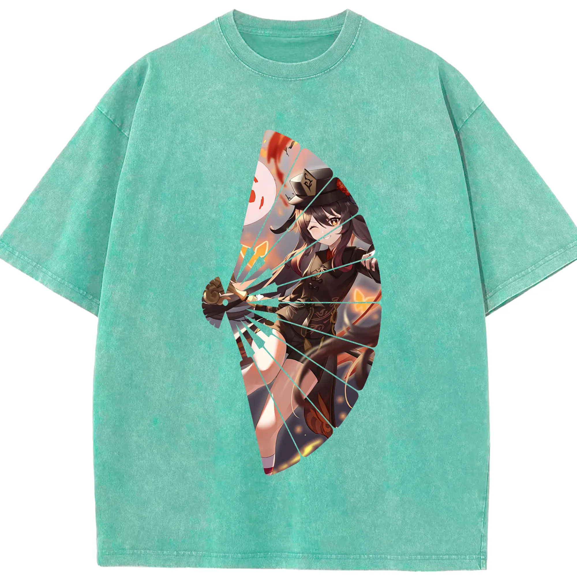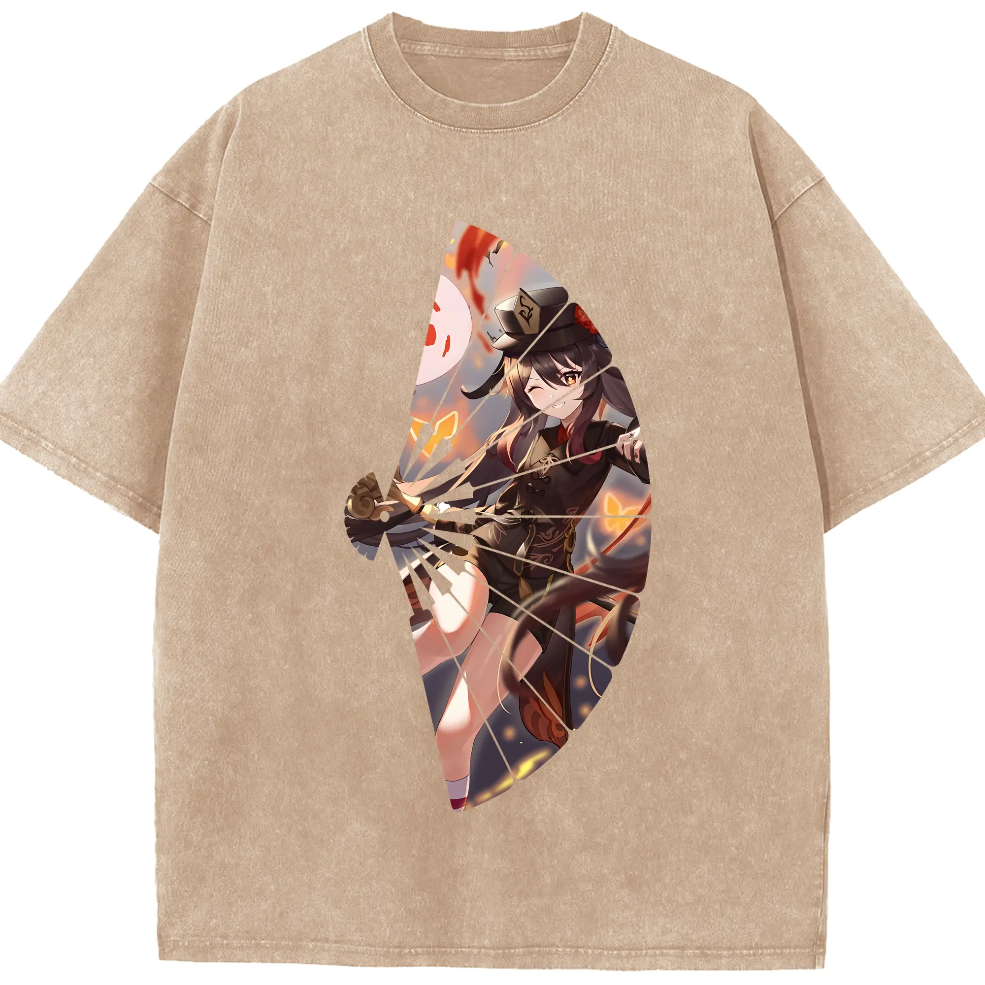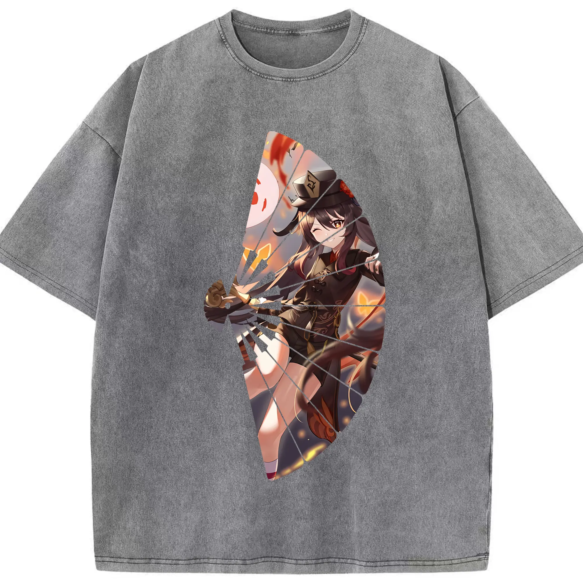 原 神 グッズ フータオ - 綿100% ヴィンテージ風 半袖Tシャツ ・ 背面プリント ・ 柔らか肌触り ・ 通気性 快適 ・ スポーツ カジュアル 外出用