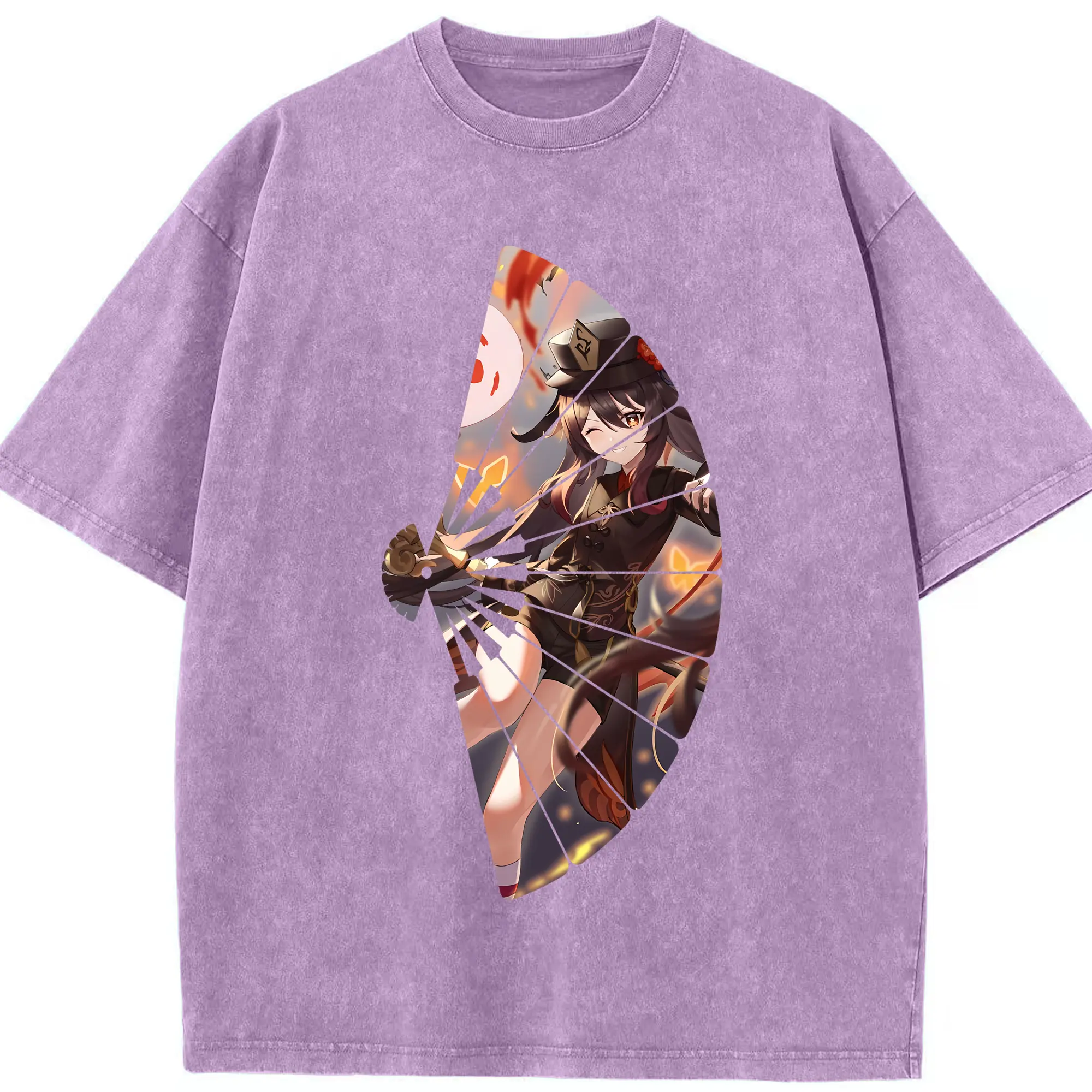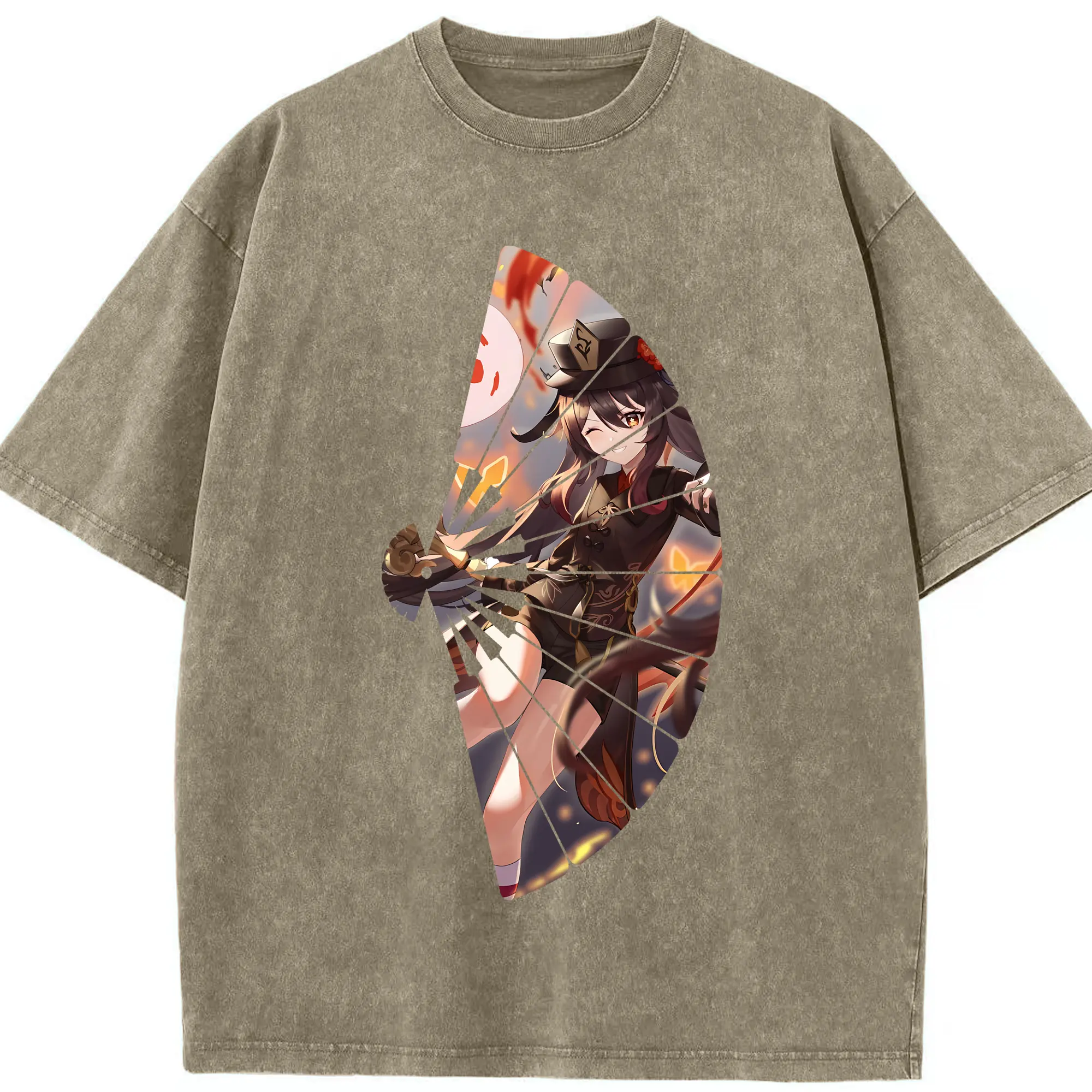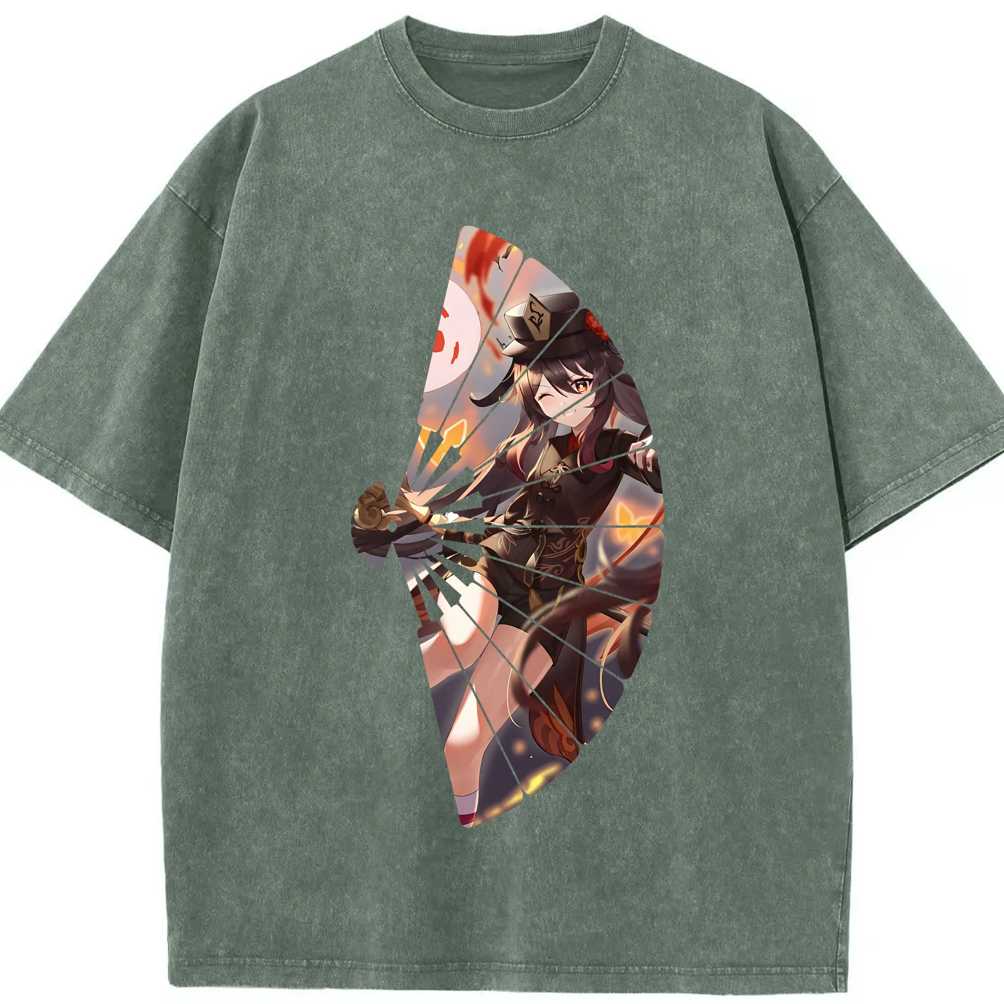 原 神 グッズ フータオ - 綿100% ヴィンテージ風 半袖Tシャツ ・ 背面プリント ・ 柔らか肌触り ・ 通気性 快適 ・ スポーツ カジュアル 外出用