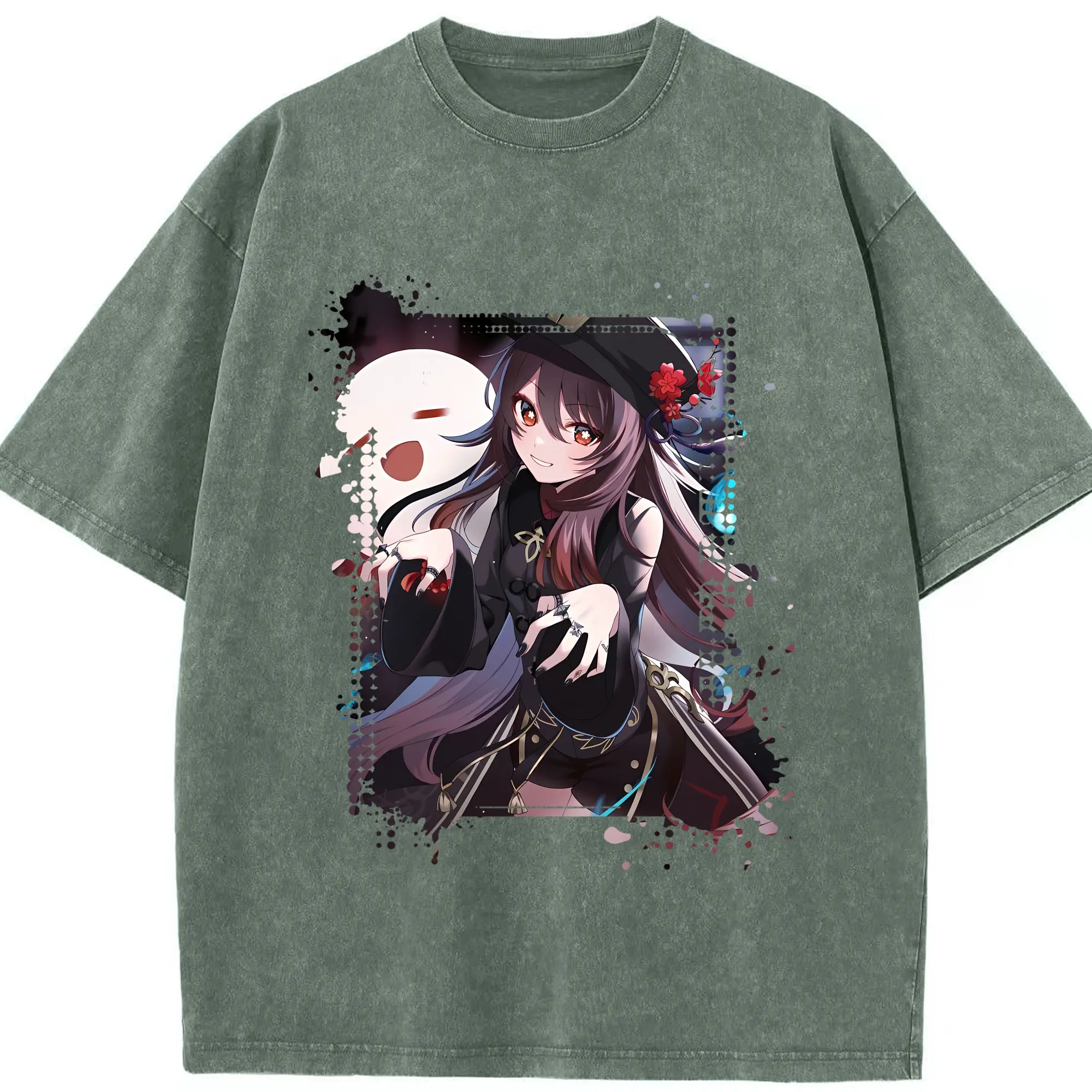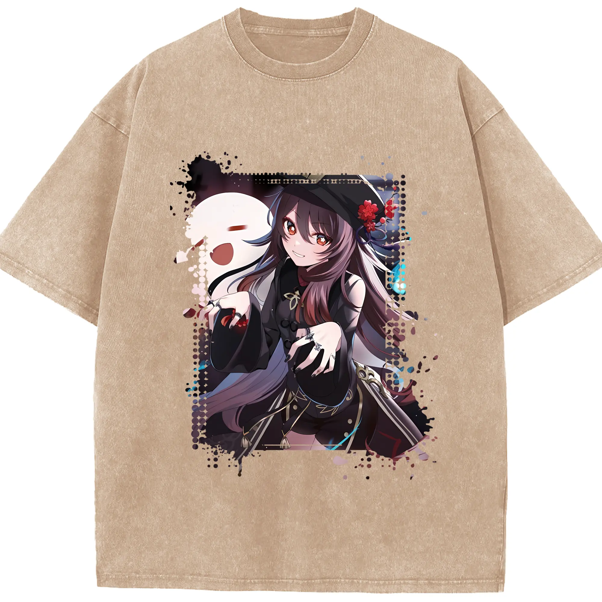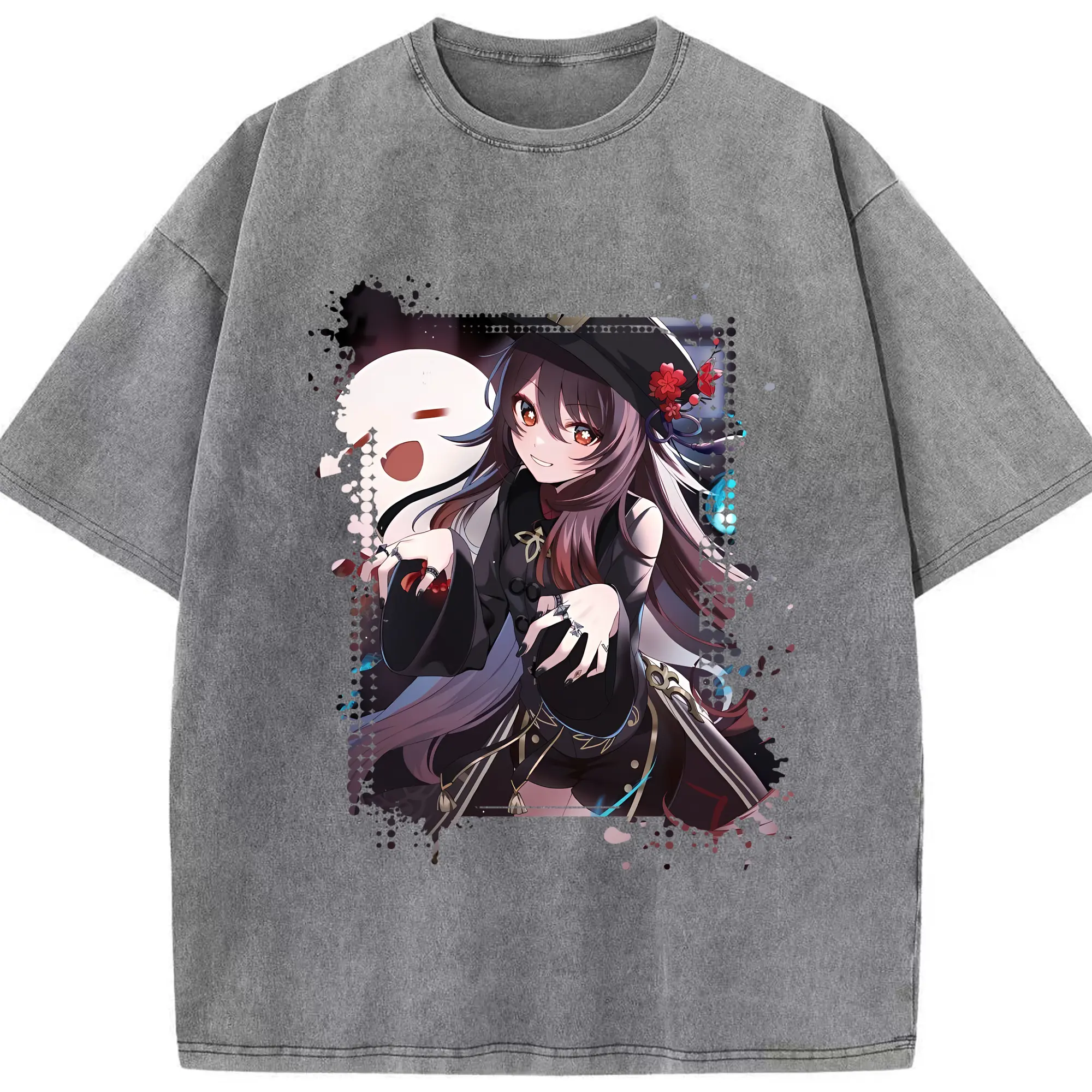 原 神 グッズ フータオ - 綿100% ヴィンテージ風 半袖Tシャツ ・ 背面プリント ・ 柔らか肌触り ・ 通気性 快適 ・ スポーツ カジュアル 外出用