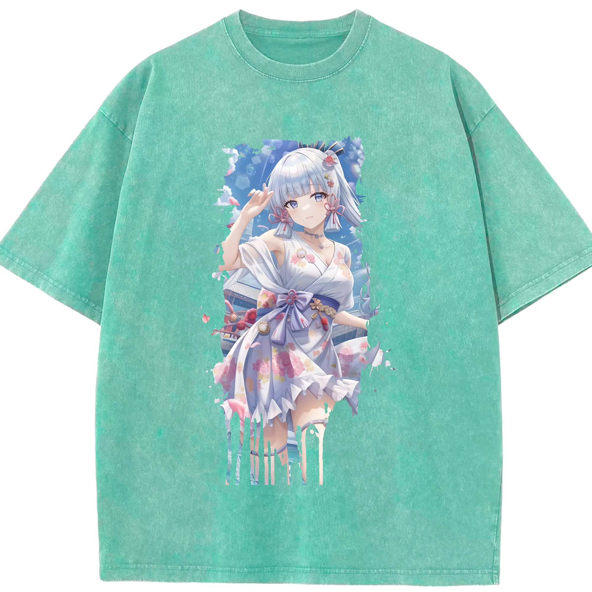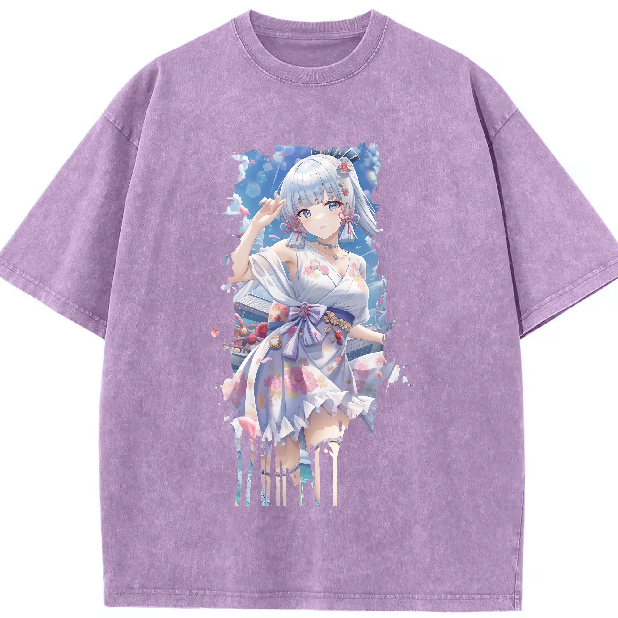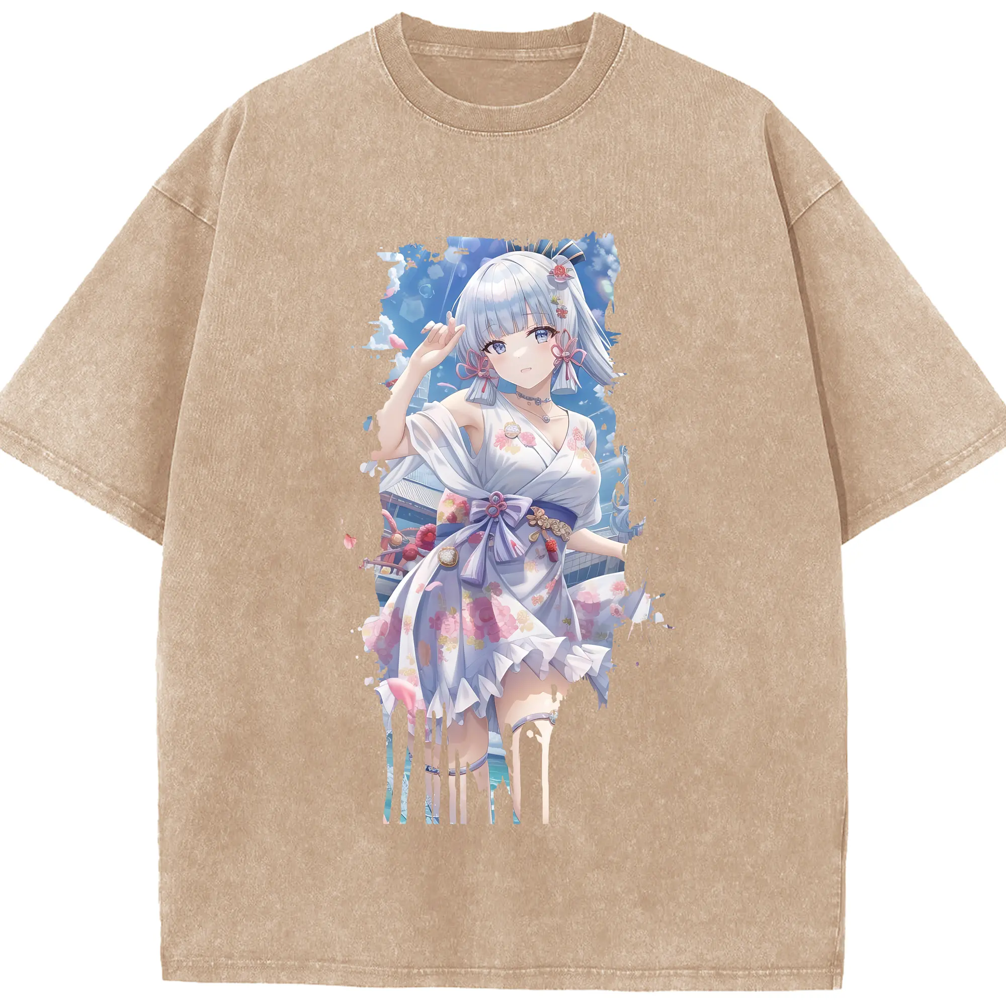 原 神 グッズ 神里綾華 - 綿100% ヴィンテージ風 半袖Tシャツ ・ 背面プリント ・ 柔らか肌触り ・ 通気性 快適 ・ スポーツ カジュアル 外出用