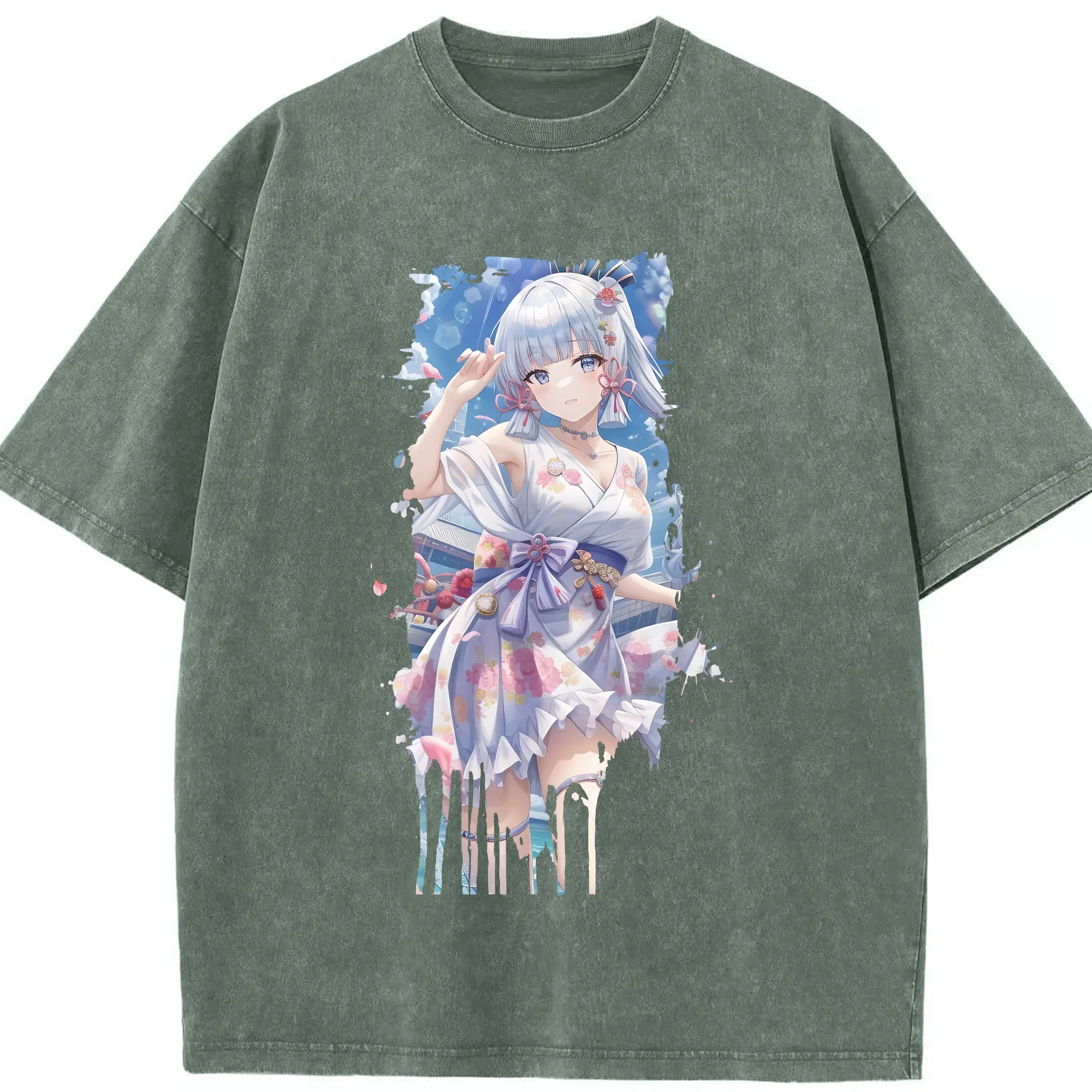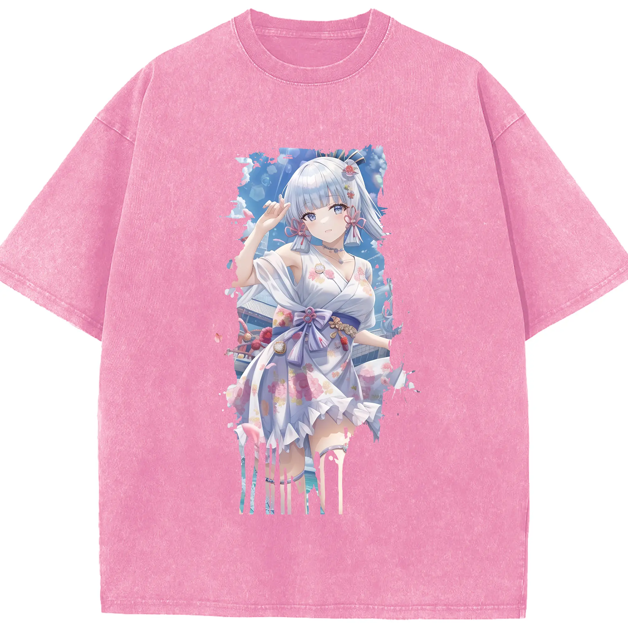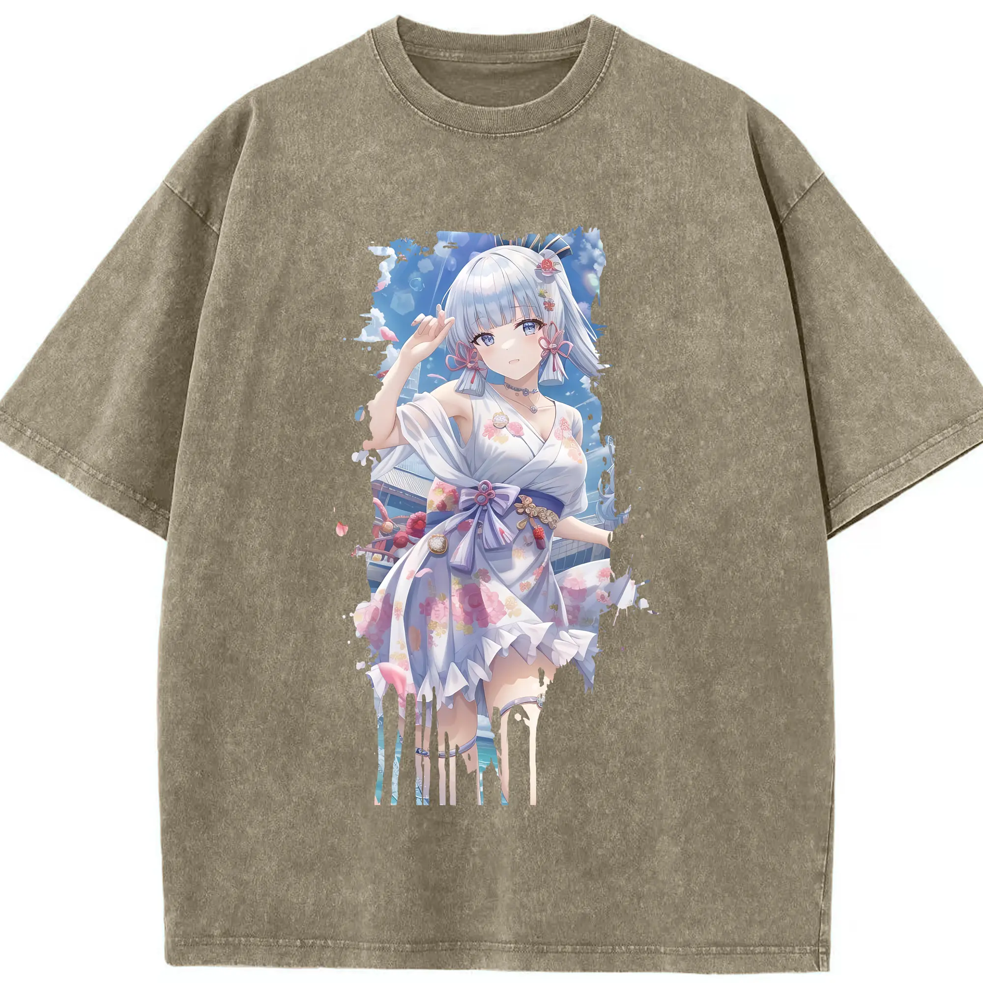 原 神 グッズ 神里綾華 - 綿100% ヴィンテージ風 半袖Tシャツ ・ 背面プリント ・ 柔らか肌触り ・ 通気性 快適 ・ スポーツ カジュアル 外出用
