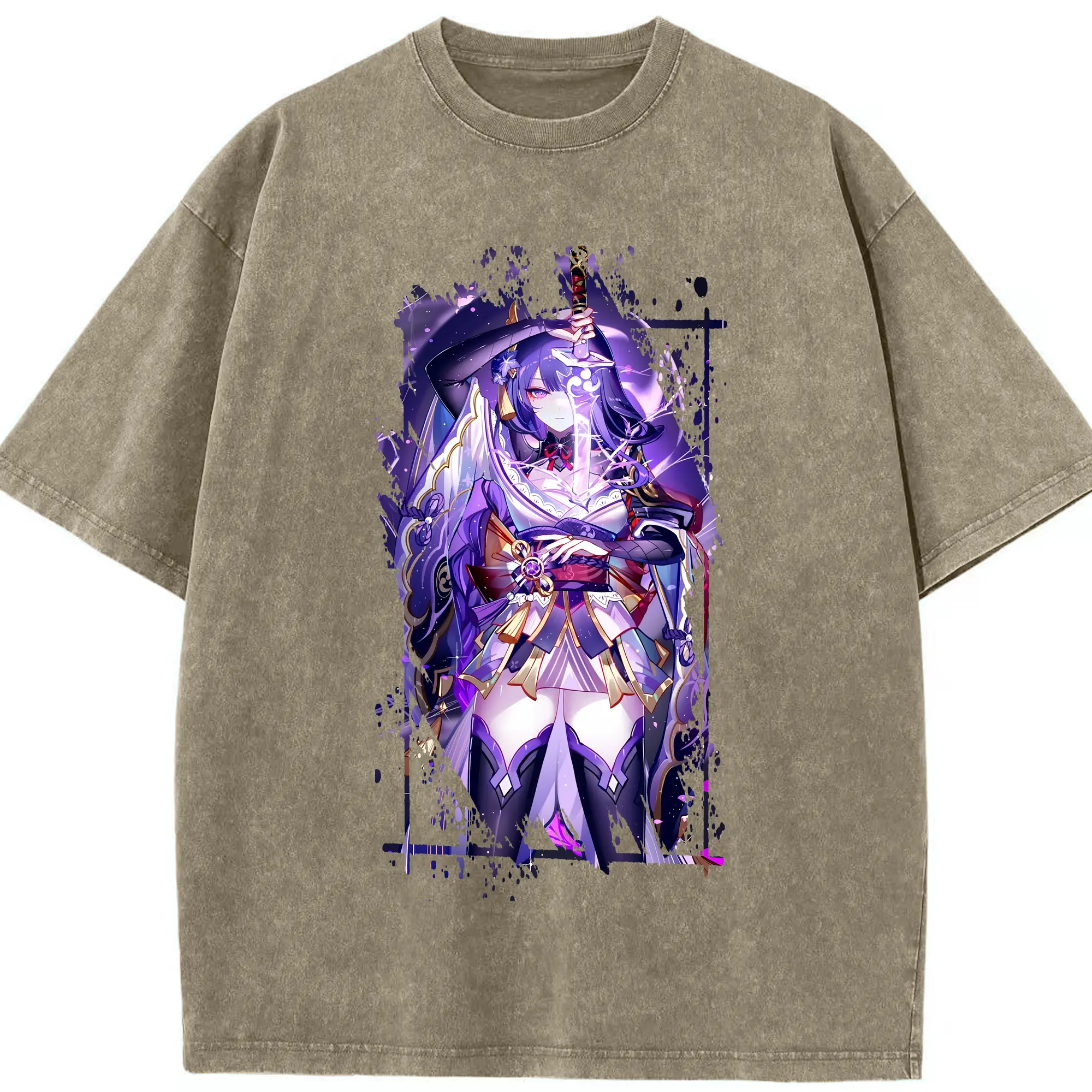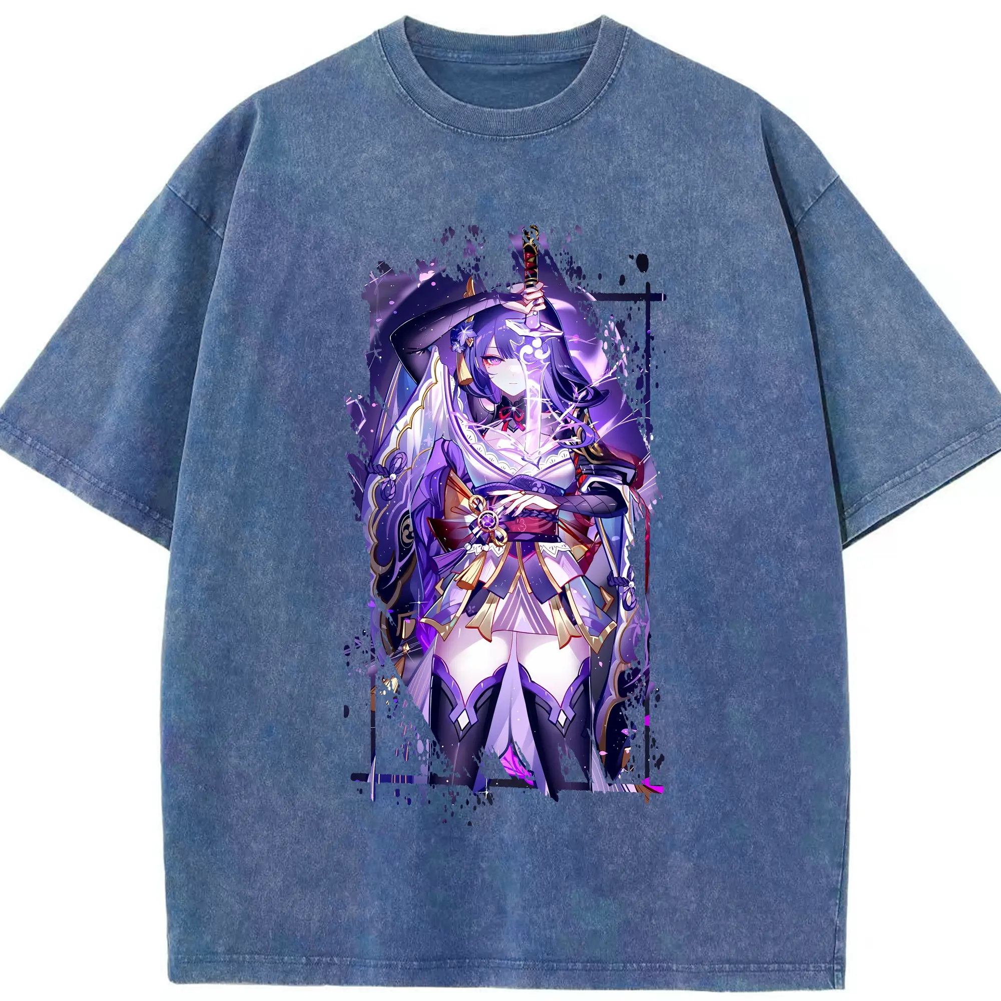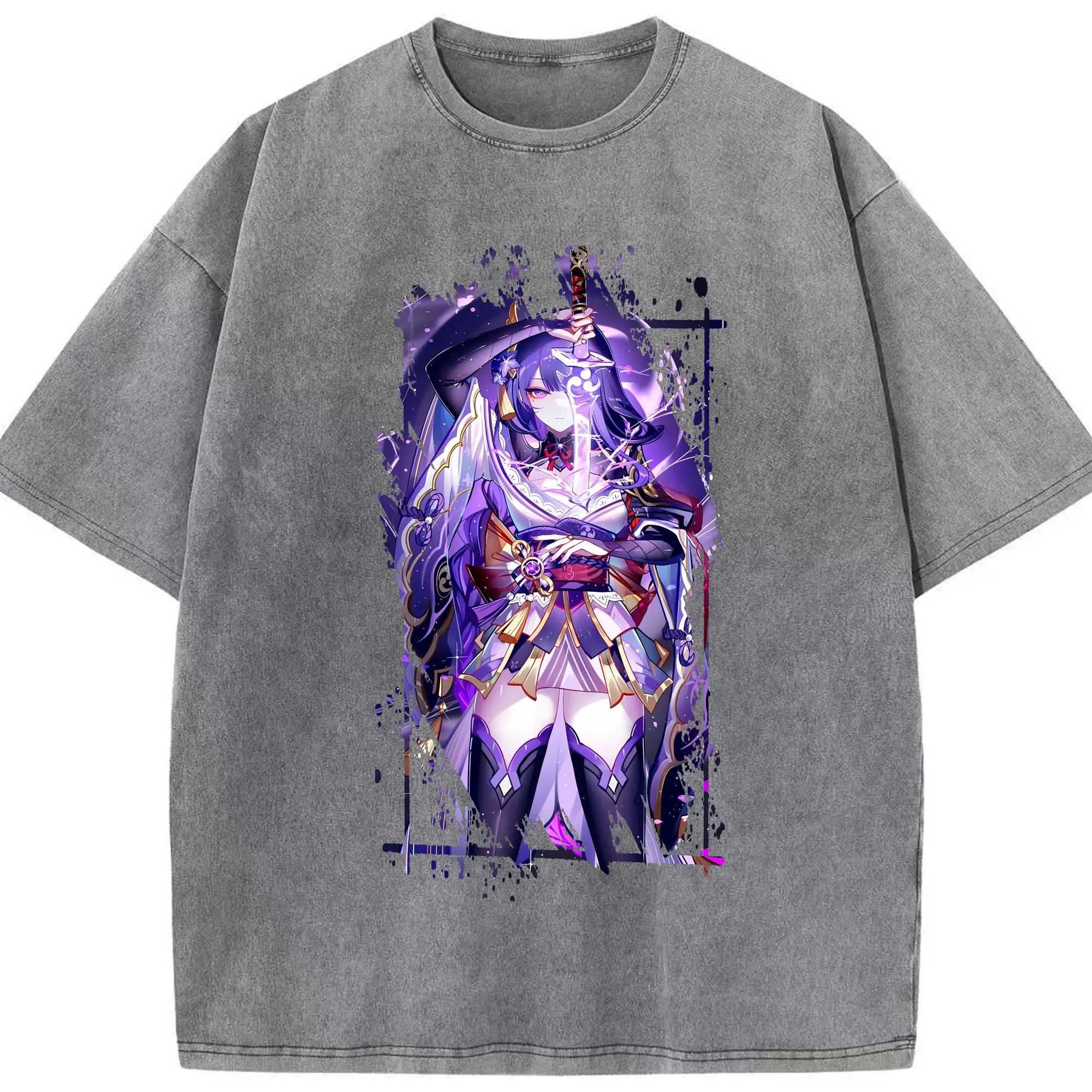 原 神 グッズ 雷電将軍 - 綿100% ヴィンテージ風 半袖Tシャツ ・ 背面プリント ・ 柔らか肌触り ・ 通気性 快適 ・ スポーツ カジュアル 外出用