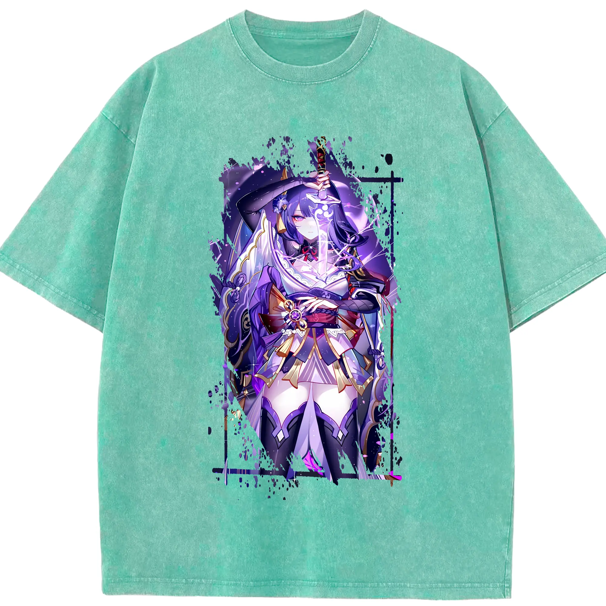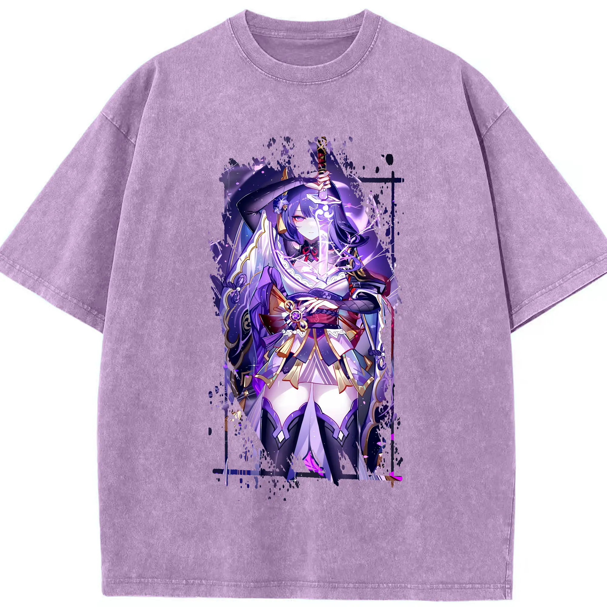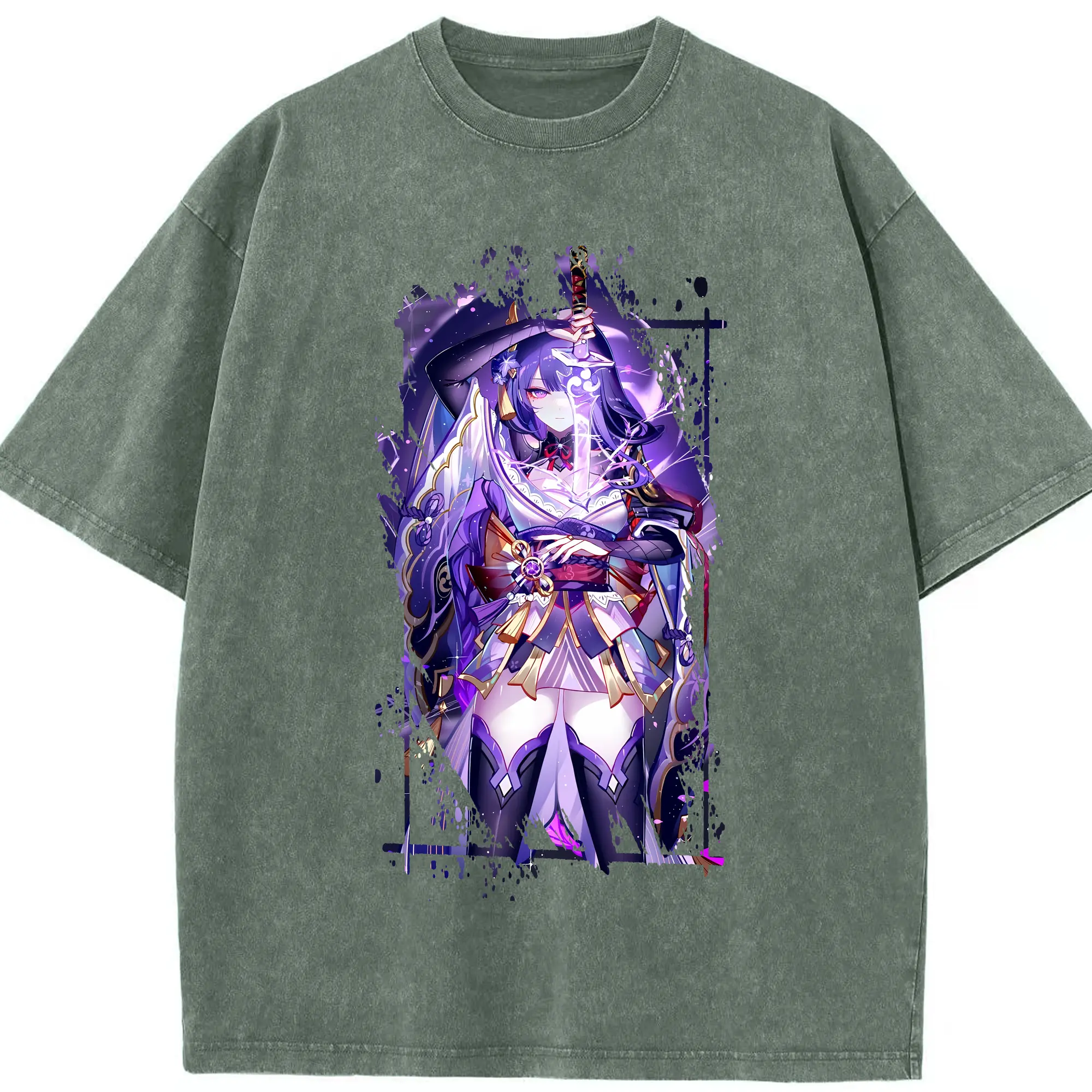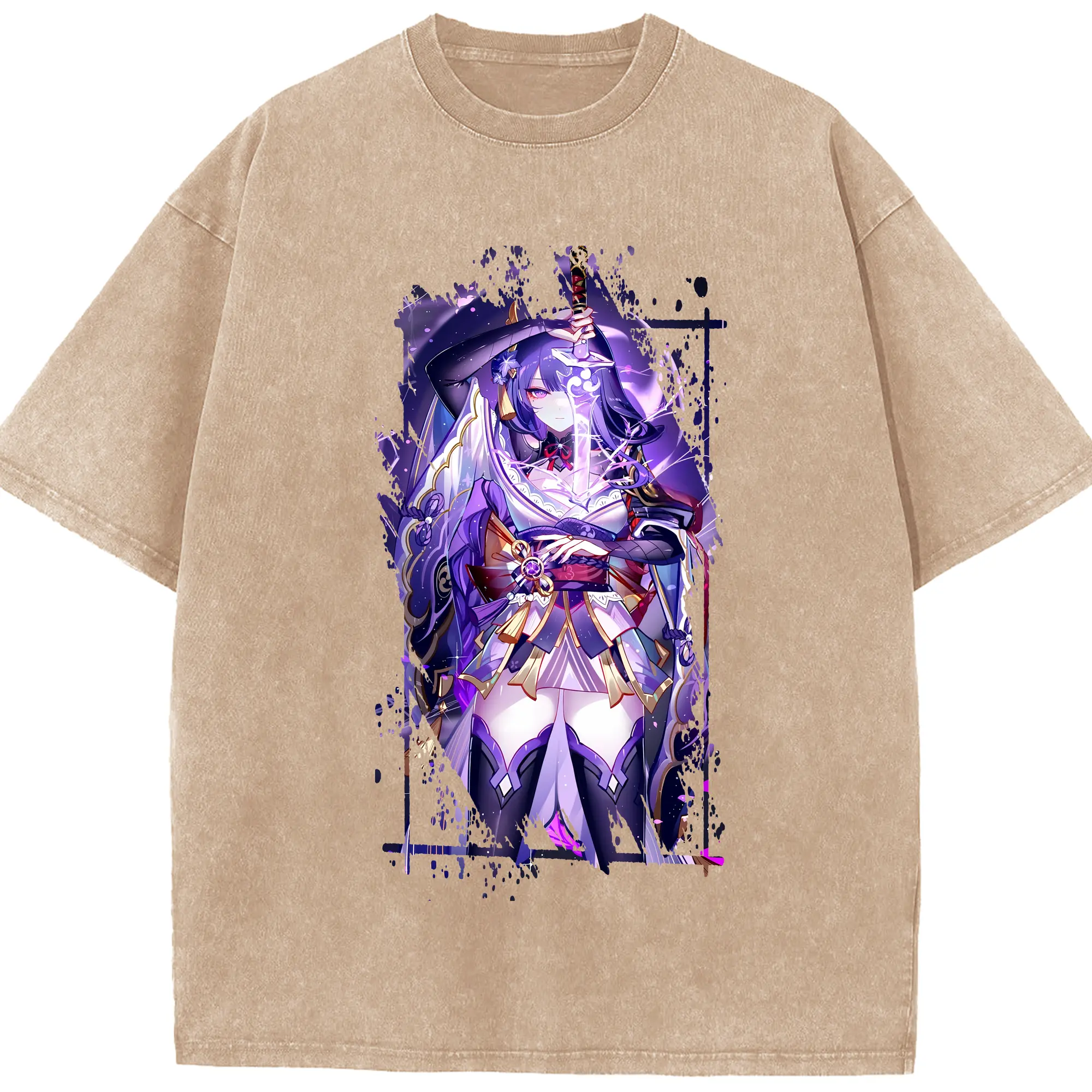 原 神 グッズ 雷電将軍 - 綿100% ヴィンテージ風 半袖Tシャツ ・ 背面プリント ・ 柔らか肌触り ・ 通気性 快適 ・ スポーツ カジュアル 外出用