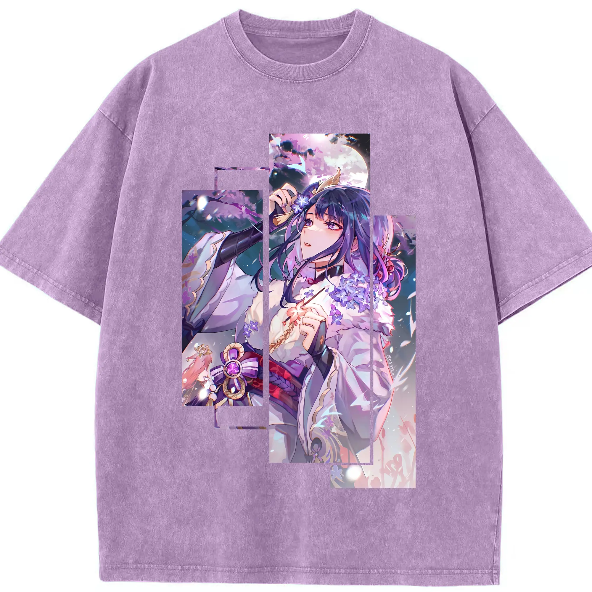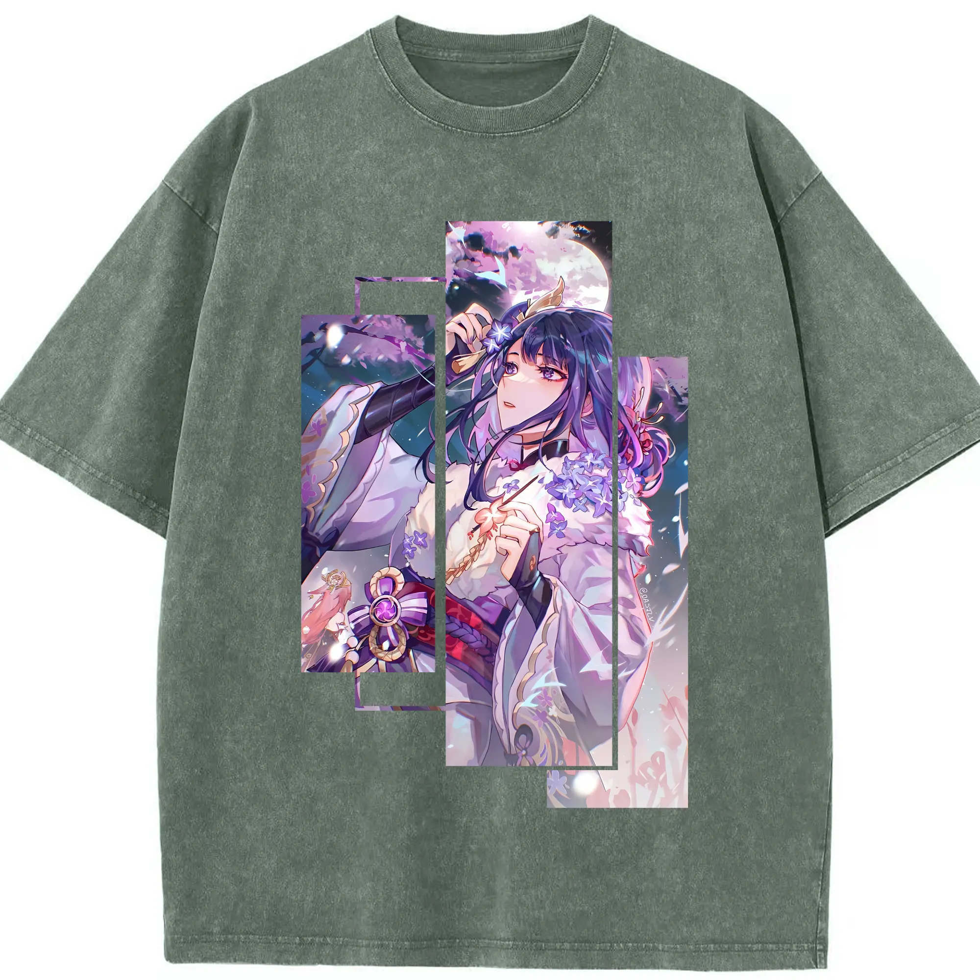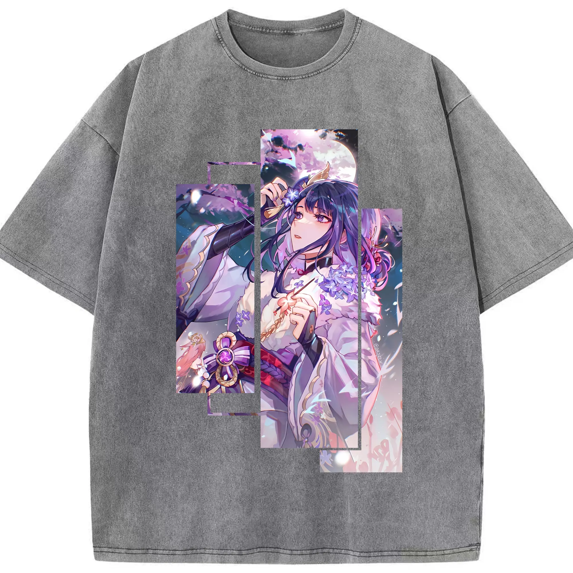 原 神 グッズ 雷電将軍 - 綿100% ヴィンテージ風 半袖Tシャツ ・ 背面プリント ・ 柔らか肌触り ・ 通気性 快適 ・ スポーツ カジュアル 外出用