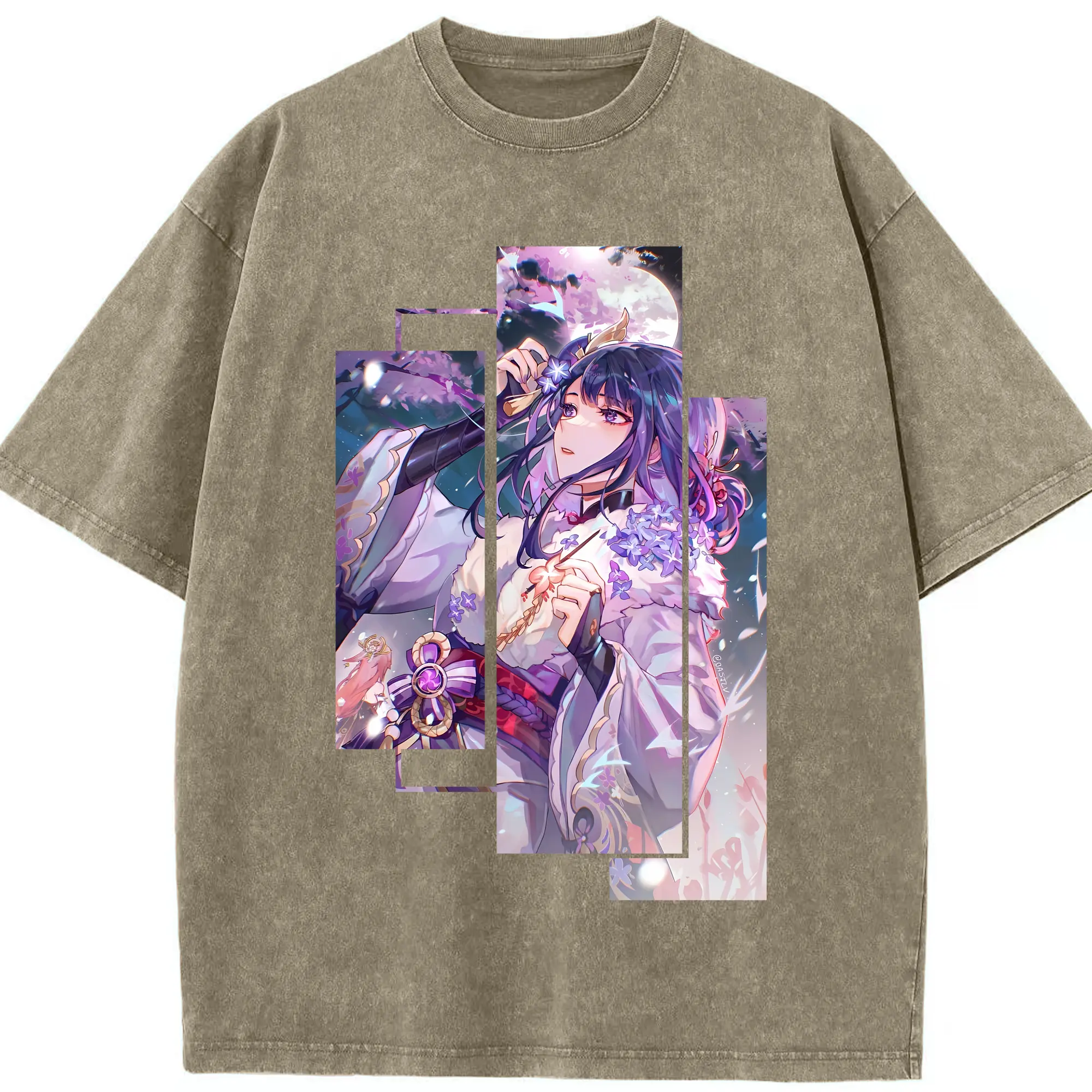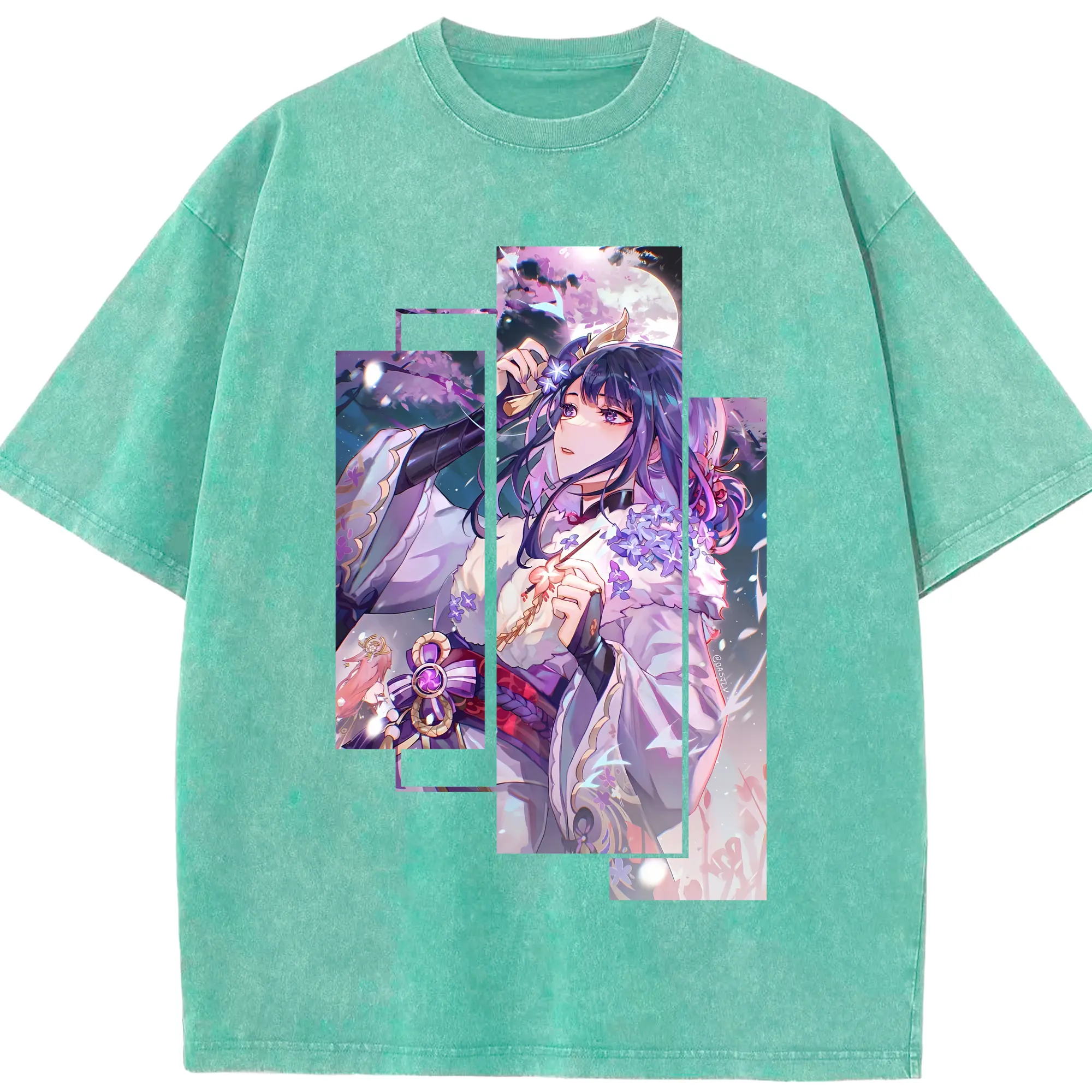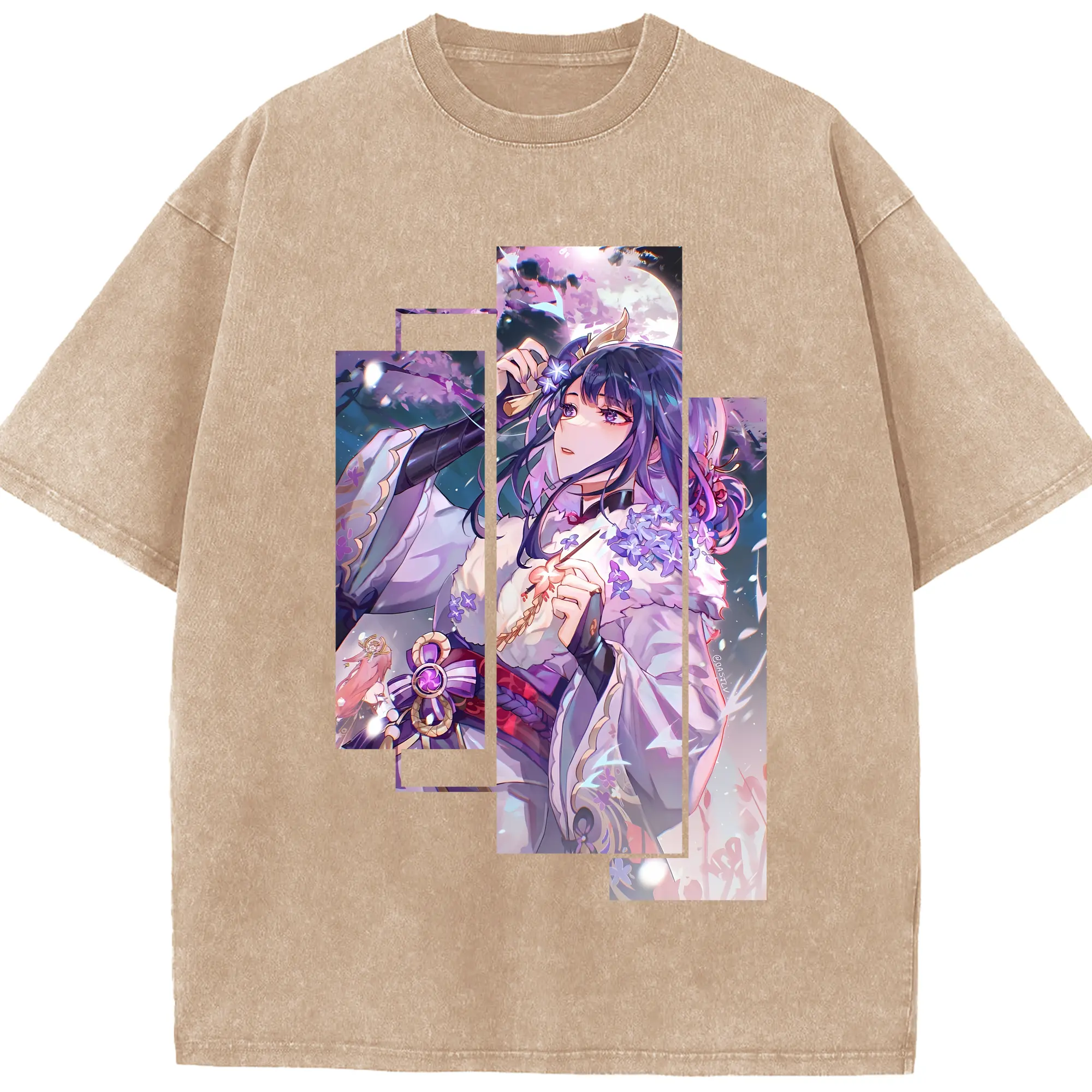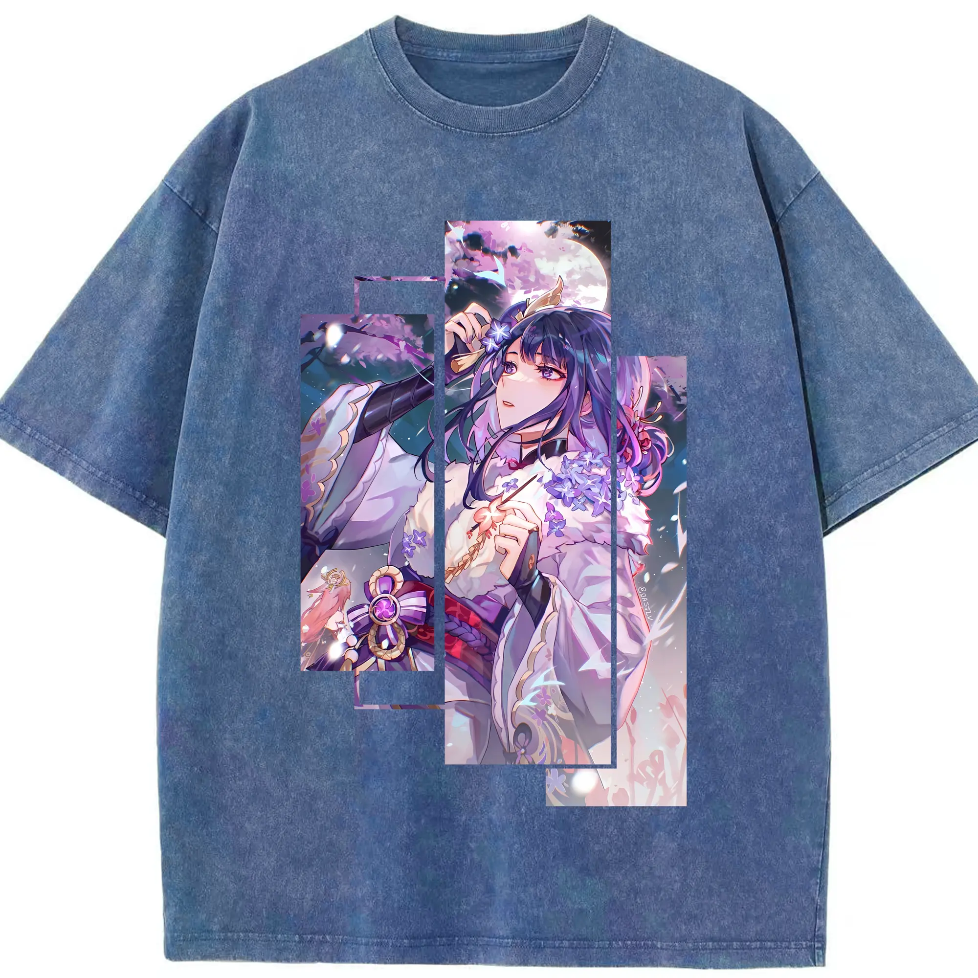 原 神 グッズ 雷電将軍 - 綿100% ヴィンテージ風 半袖Tシャツ ・ 背面プリント ・ 柔らか肌触り ・ 通気性 快適 ・ スポーツ カジュアル 外出用