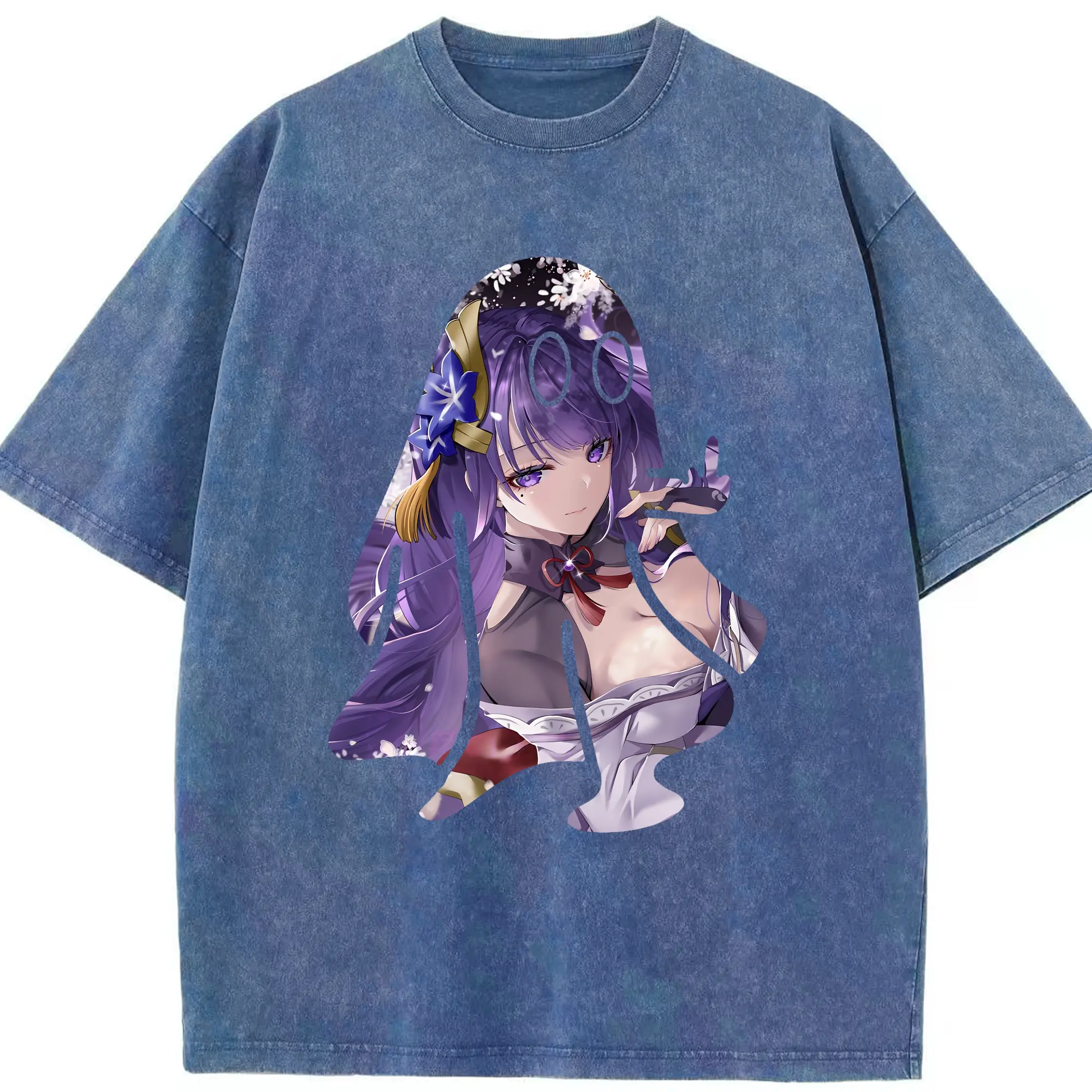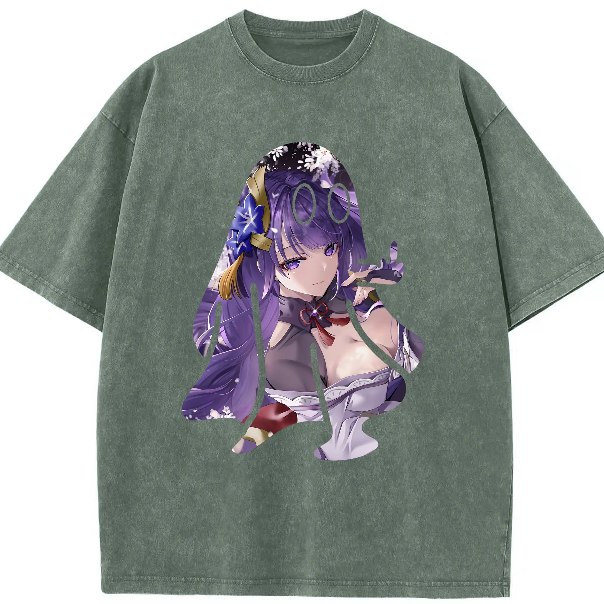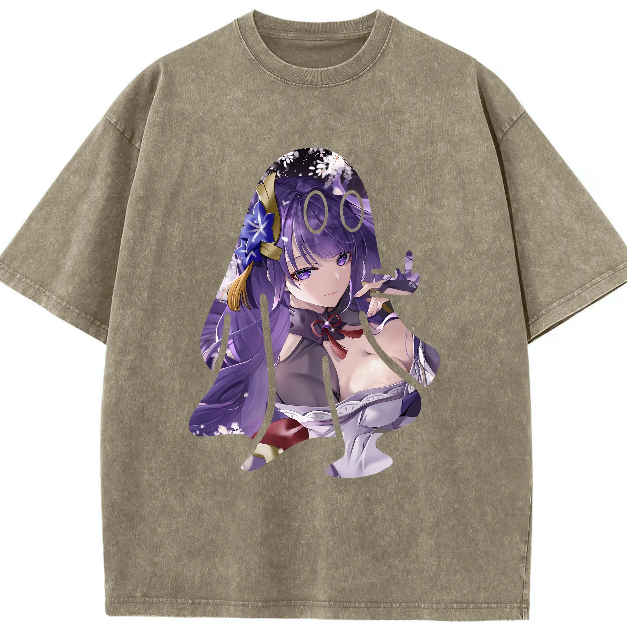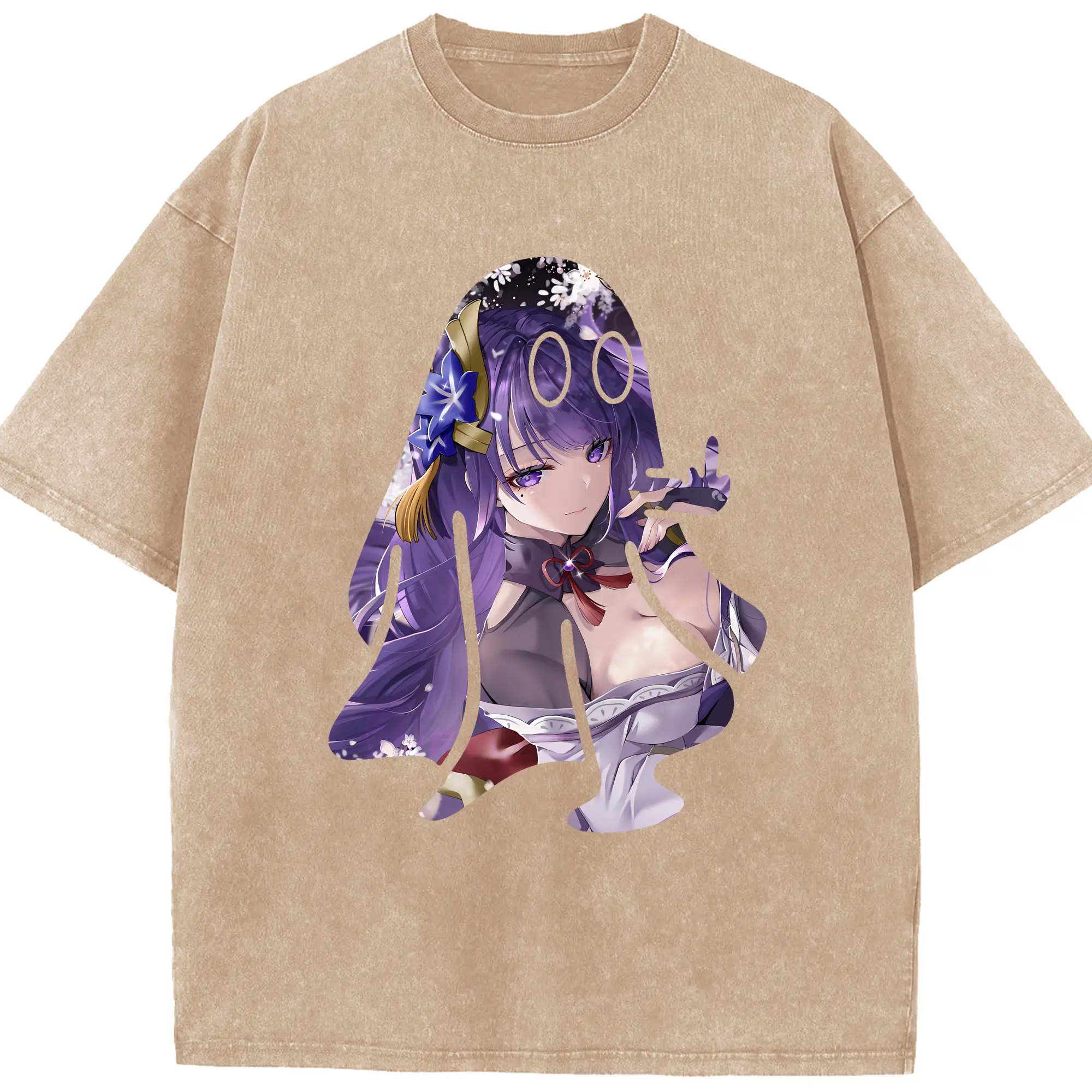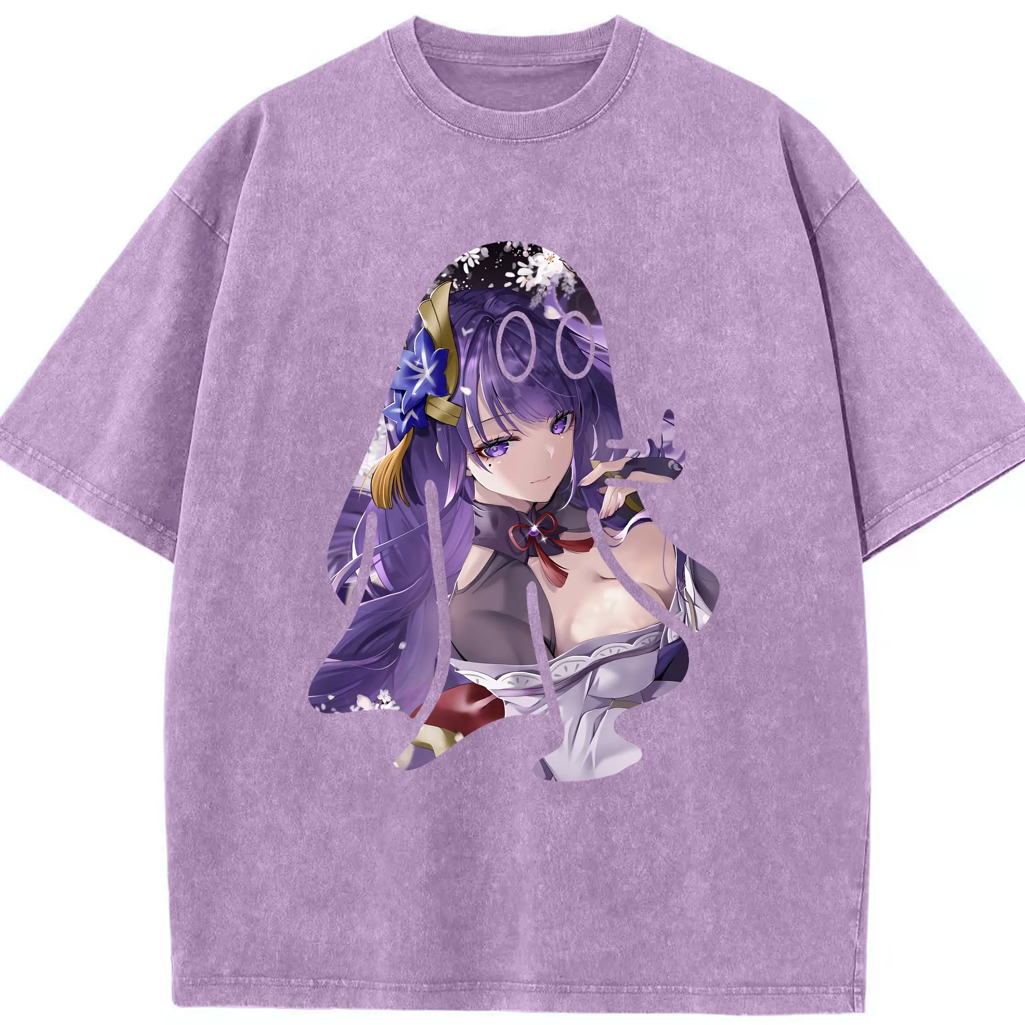 原 神 グッズ 雷電将軍 - 綿100% ヴィンテージ風 半袖Tシャツ ・ 背面プリント ・ 柔らか肌触り ・ 通気性 快適 ・ スポーツ カジュアル 外出用