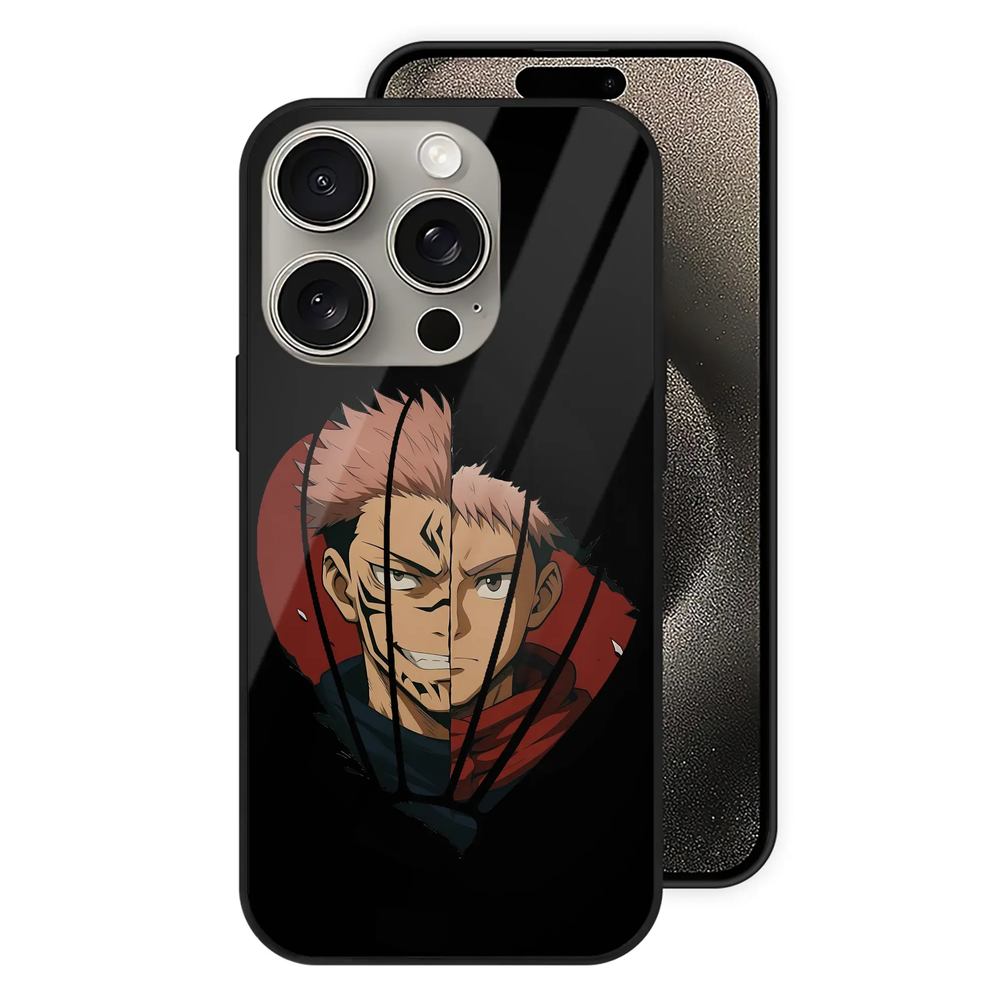 呪術廻戦 グッズ,両面宿儺 - IPhone15Pro対応 ・ スマホケース ・ 背面ガラス ・ TPU+強化ガラス ・ 耐衝撃 ・ 黄変防止 ・ ワイヤレス充電対応 ・ 3D立体ボタン