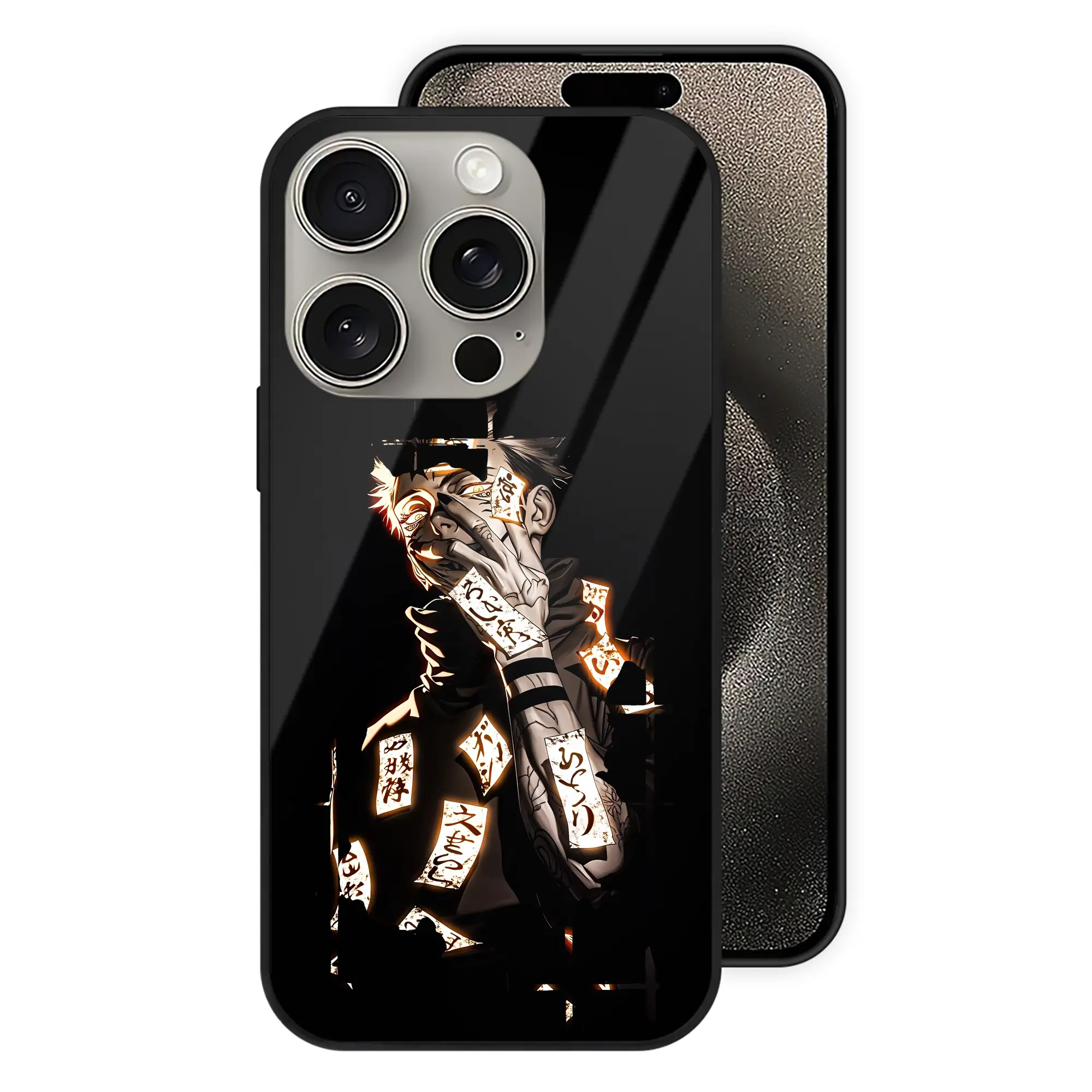 呪術廻戦 グッズ,両面宿儺 - IPhone15Pro対応 ・ スマホケース ・ 背面ガラス ・ TPU+強化ガラス ・ 耐衝撃 ・ 黄変防止 ・ ワイヤレス充電対応 ・ 3D立体ボタン