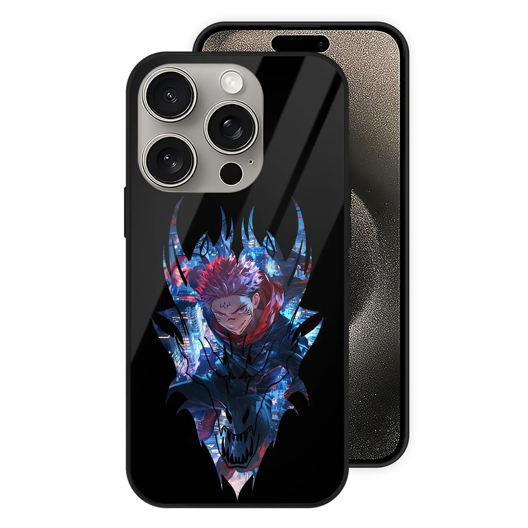 呪術廻戦 グッズ,両面宿儺 - IPhone15Pro対応 ・ スマホケース ・ 背面ガラス ・ TPU+強化ガラス ・ 耐衝撃 ・ 黄変防止 ・ ワイヤレス充電対応 ・ 3D立体ボタン
