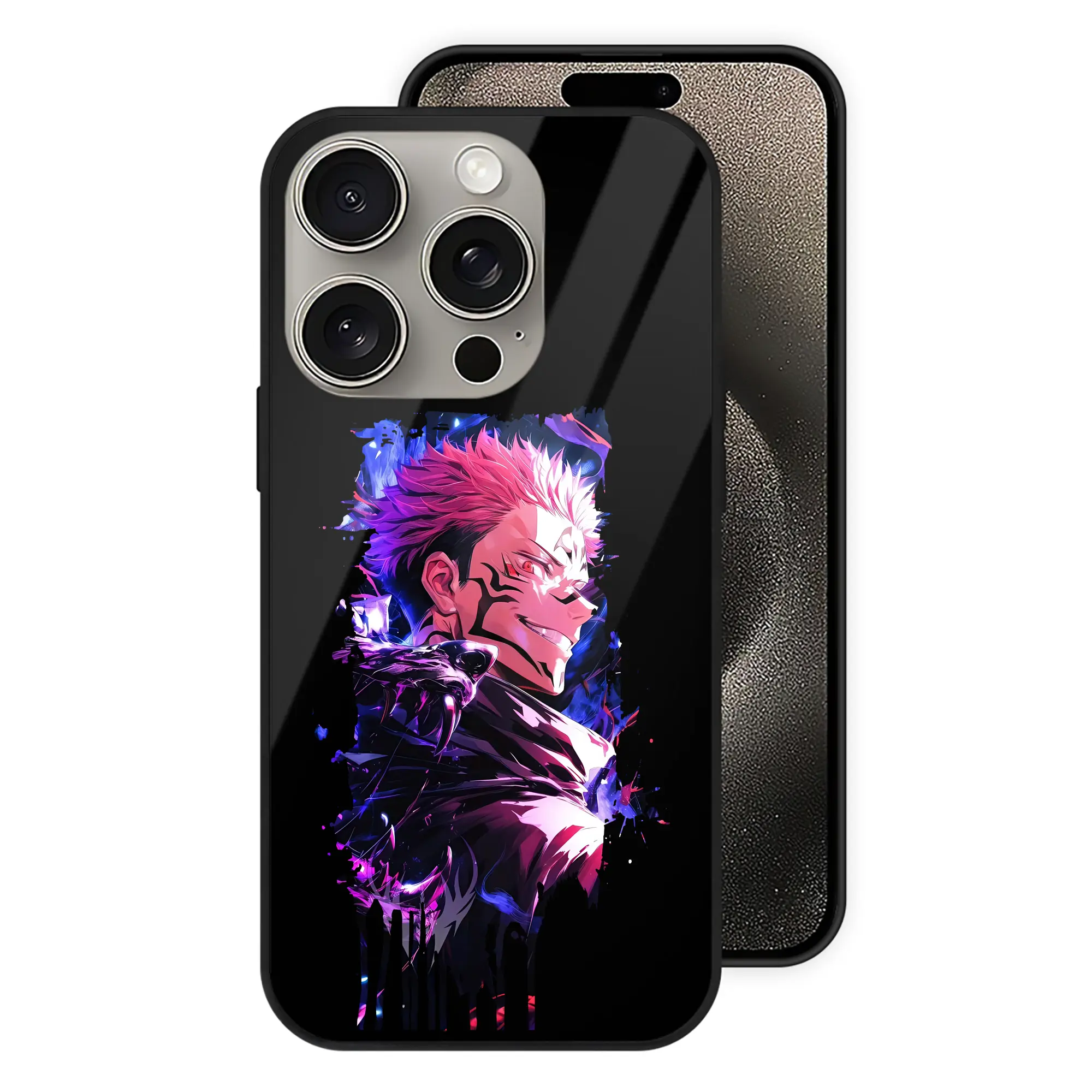 呪術廻戦 グッズ,両面宿儺 - IPhone15Pro対応 ・ スマホケース ・ 背面ガラス ・ TPU+強化ガラス ・ 耐衝撃 ・ 黄変防止 ・ ワイヤレス充電対応 ・ 3D立体ボタン
