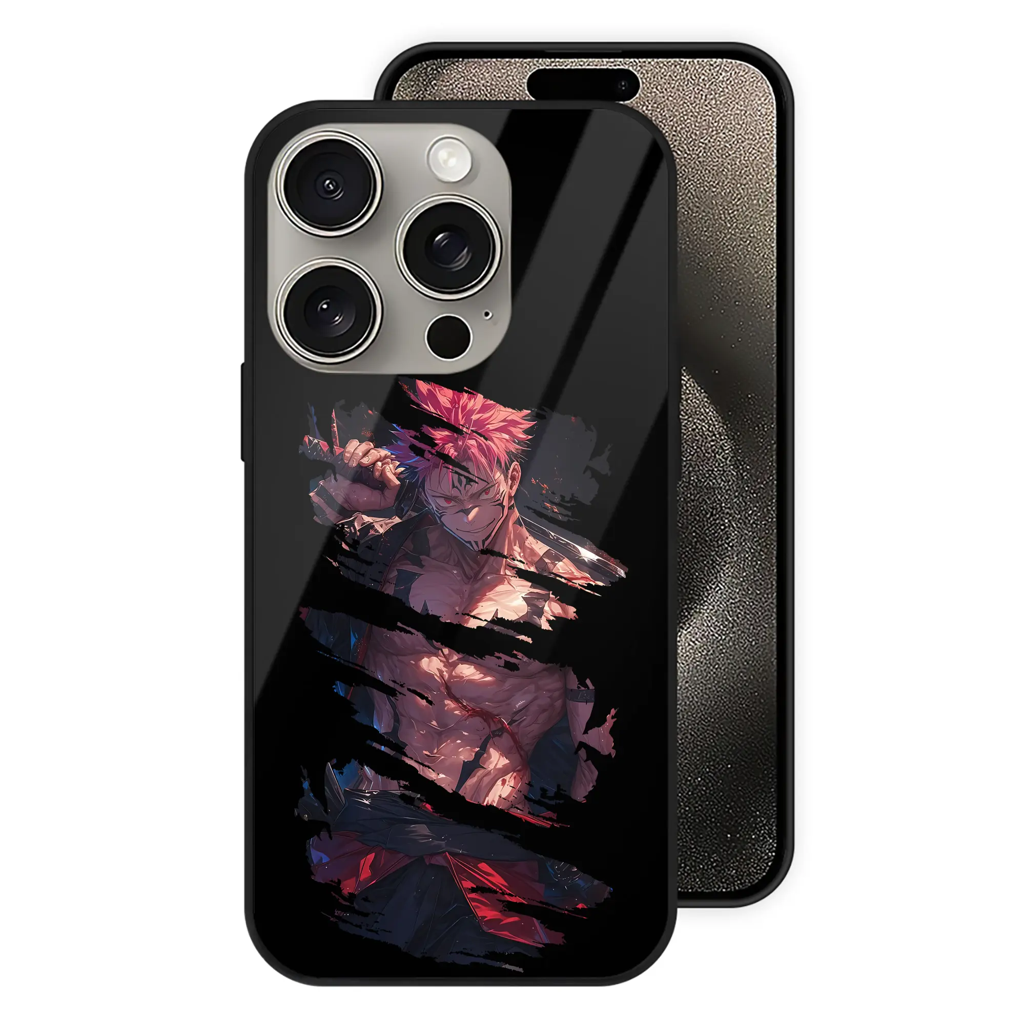 呪術廻戦 グッズ,両面宿儺 - IPhone15Pro対応 ・ スマホケース ・ 背面ガラス ・ TPU+強化ガラス ・ 耐衝撃 ・ 黄変防止 ・ ワイヤレス充電対応 ・ 3D立体ボタン