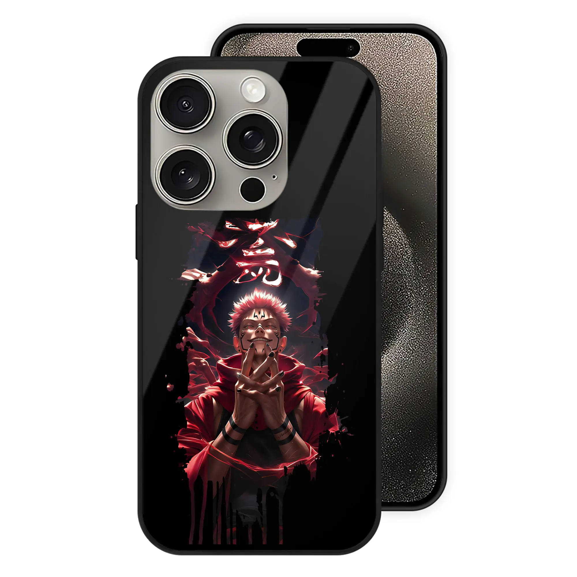 呪術廻戦 グッズ,両面宿儺 - IPhone15Pro対応 ・ スマホケース ・ 背面ガラス ・ TPU+強化ガラス ・ 耐衝撃 ・ 黄変防止 ・ ワイヤレス充電対応 ・ 3D立体ボタン