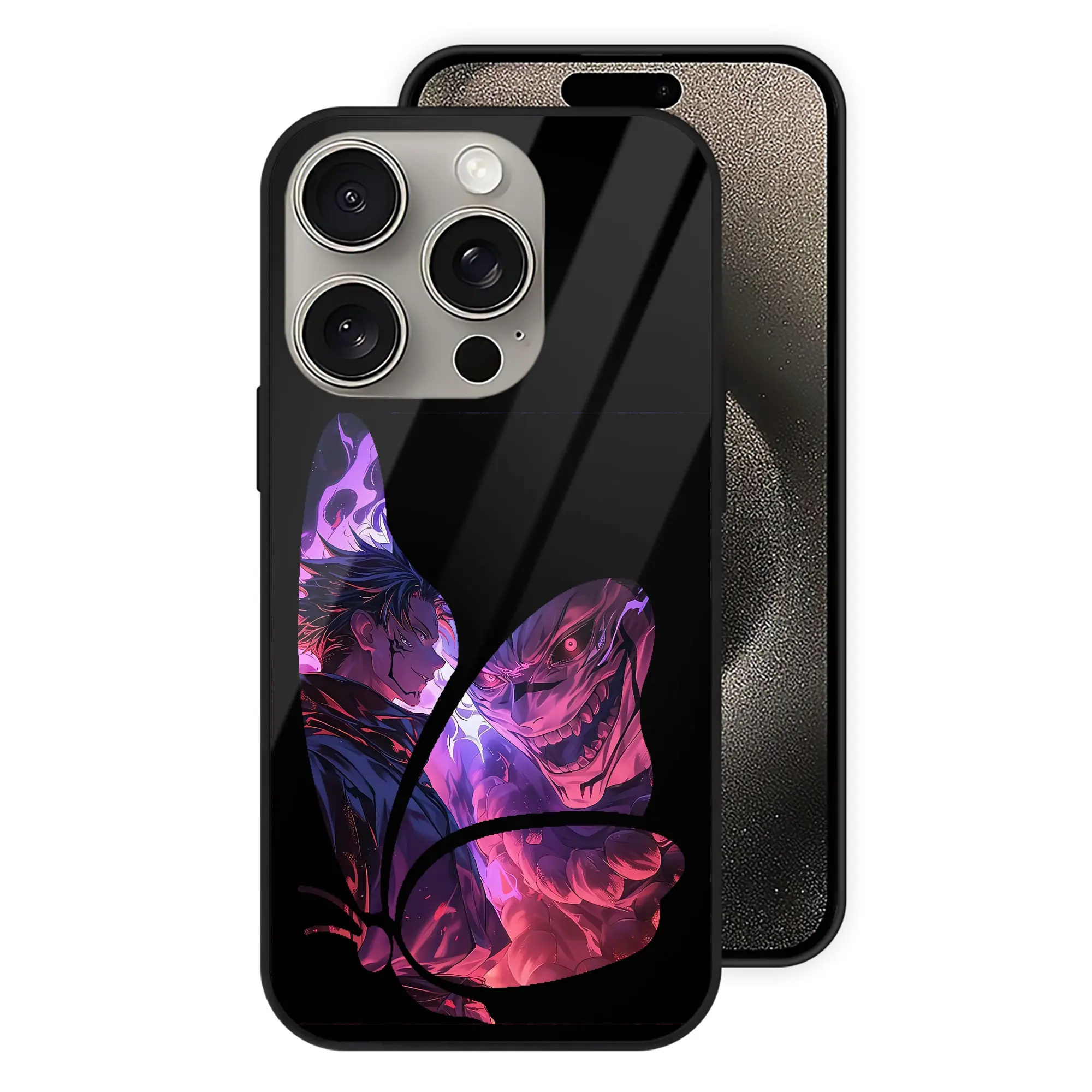 呪術廻戦 グッズ,両面宿儺 - IPhone15Pro対応 ・ スマホケース ・ 背面ガラス ・ TPU+強化ガラス ・ 耐衝撃 ・ 黄変防止 ・ ワイヤレス充電対応 ・ 3D立体ボタン