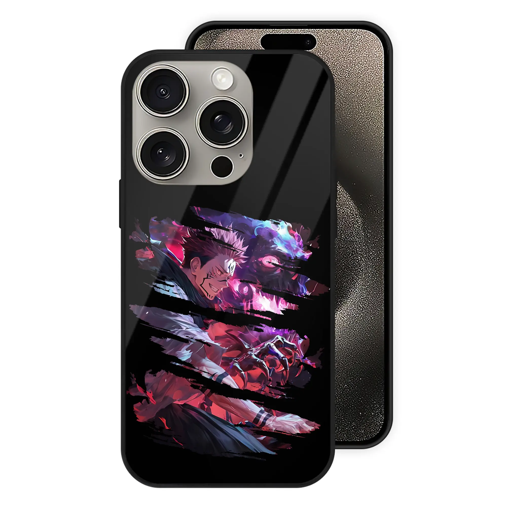呪術廻戦 グッズ,両面宿儺 - IPhone15Pro対応 ・ スマホケース ・ 背面ガラス ・ TPU+強化ガラス ・ 耐衝撃 ・ 黄変防止 ・ ワイヤレス充電対応 ・ 3D立体ボタン