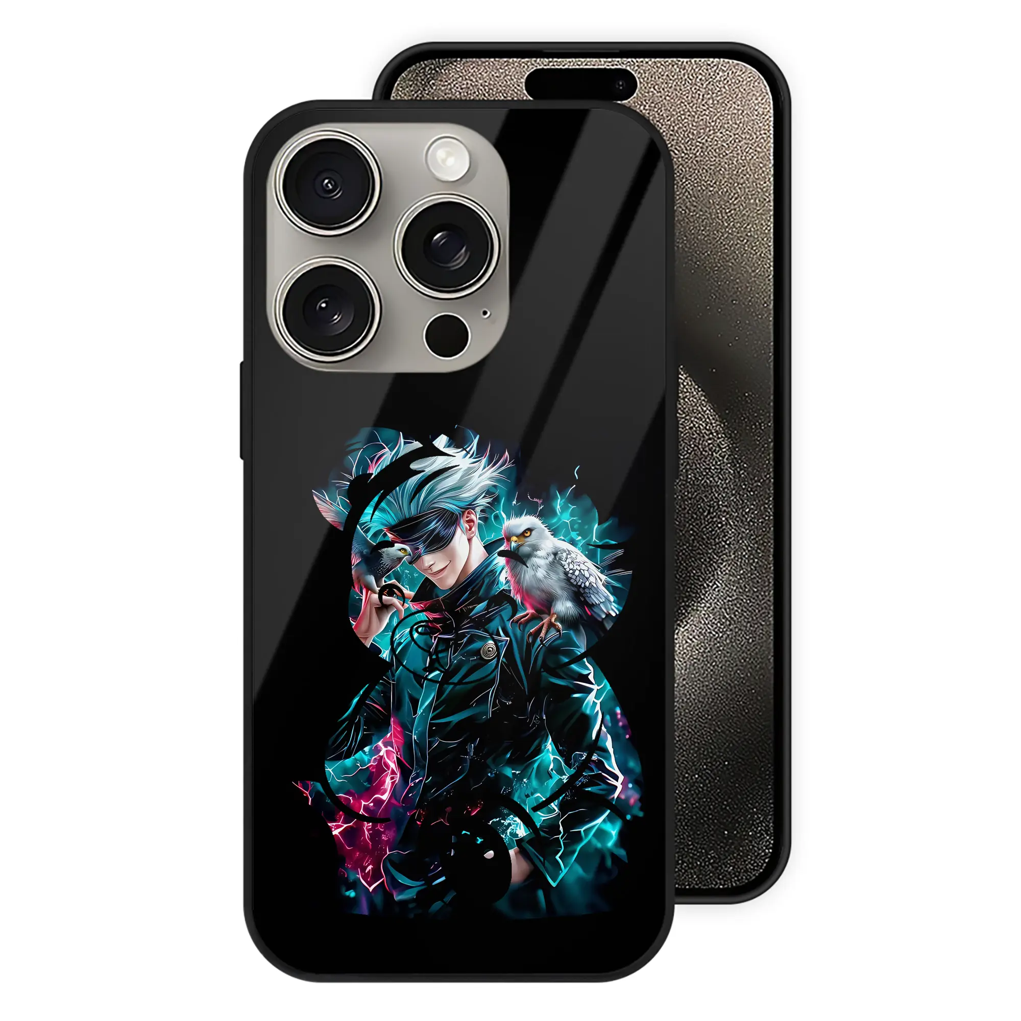 呪術廻戦 グッズ,五条 悟 - IPhone15Pro対応 ・ スマホケース ・ 背面ガラス ・ TPU+強化ガラス ・ 耐衝撃 ・ 黄変防止 ・ ワイヤレス充電対応 ・ 3D立体ボタン