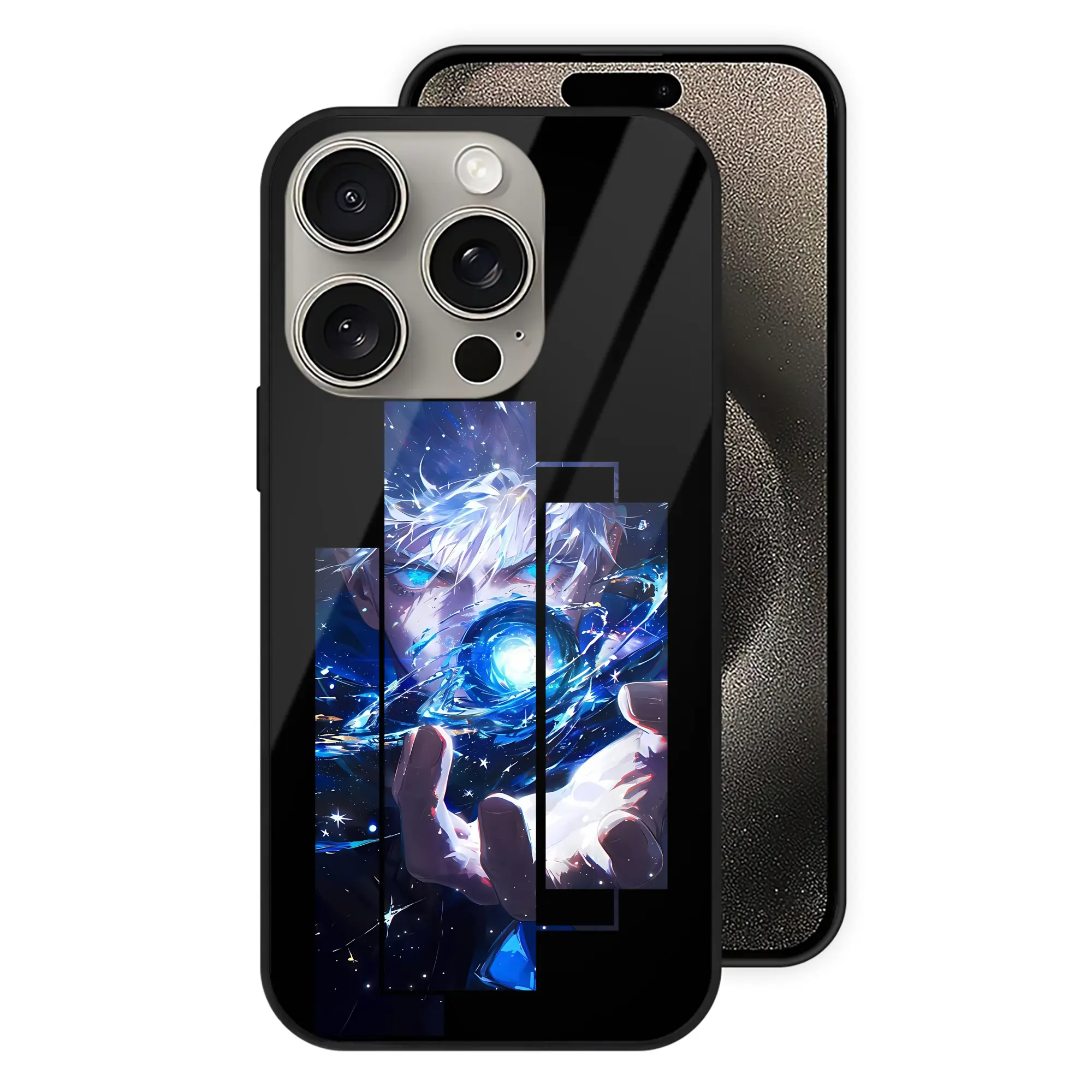 呪術廻戦 グッズ,五条 悟 - IPhone15Pro対応 ・ スマホケース ・ 背面ガラス ・ TPU+強化ガラス ・ 耐衝撃 ・ 黄変防止 ・ ワイヤレス充電対応 ・ 3D立体ボタン