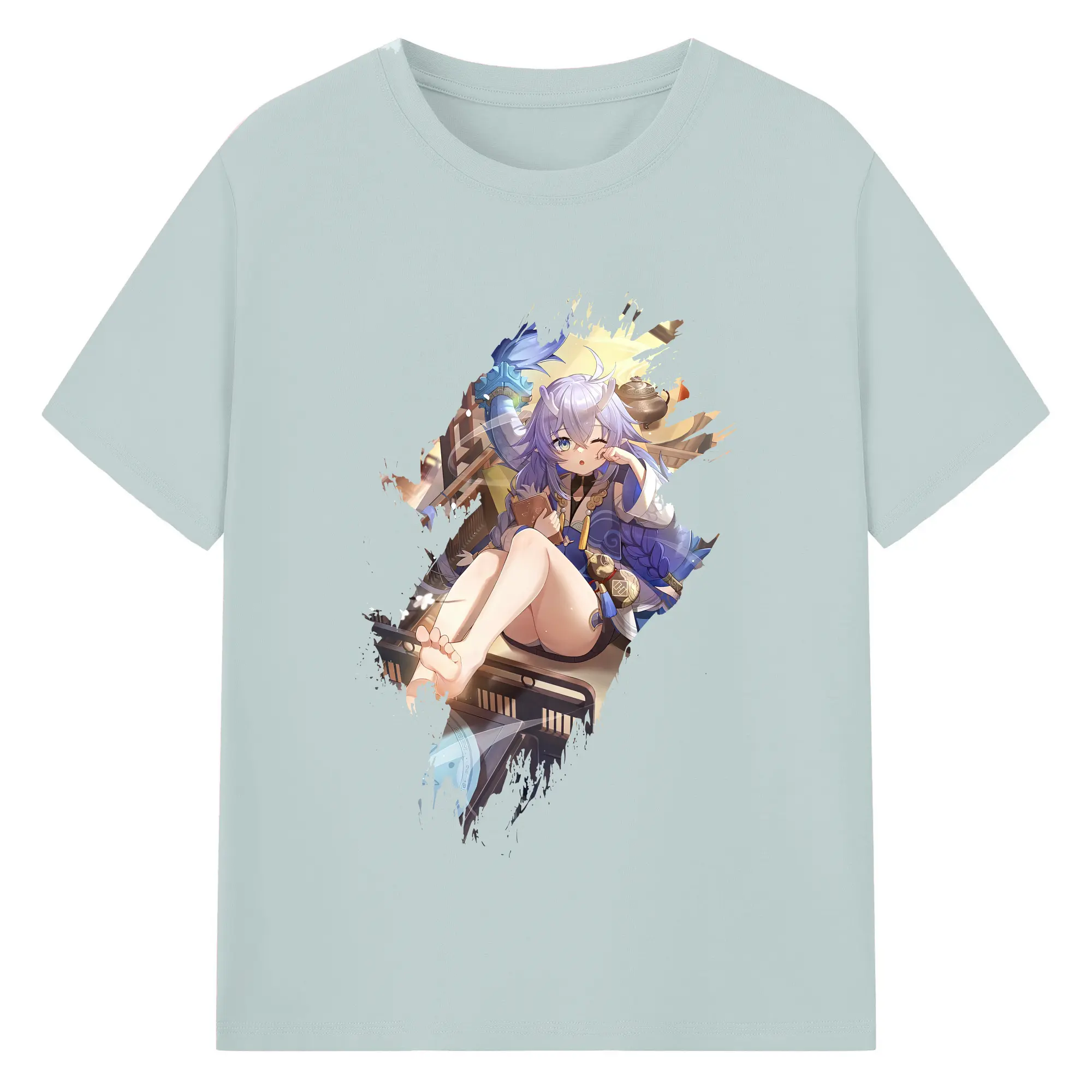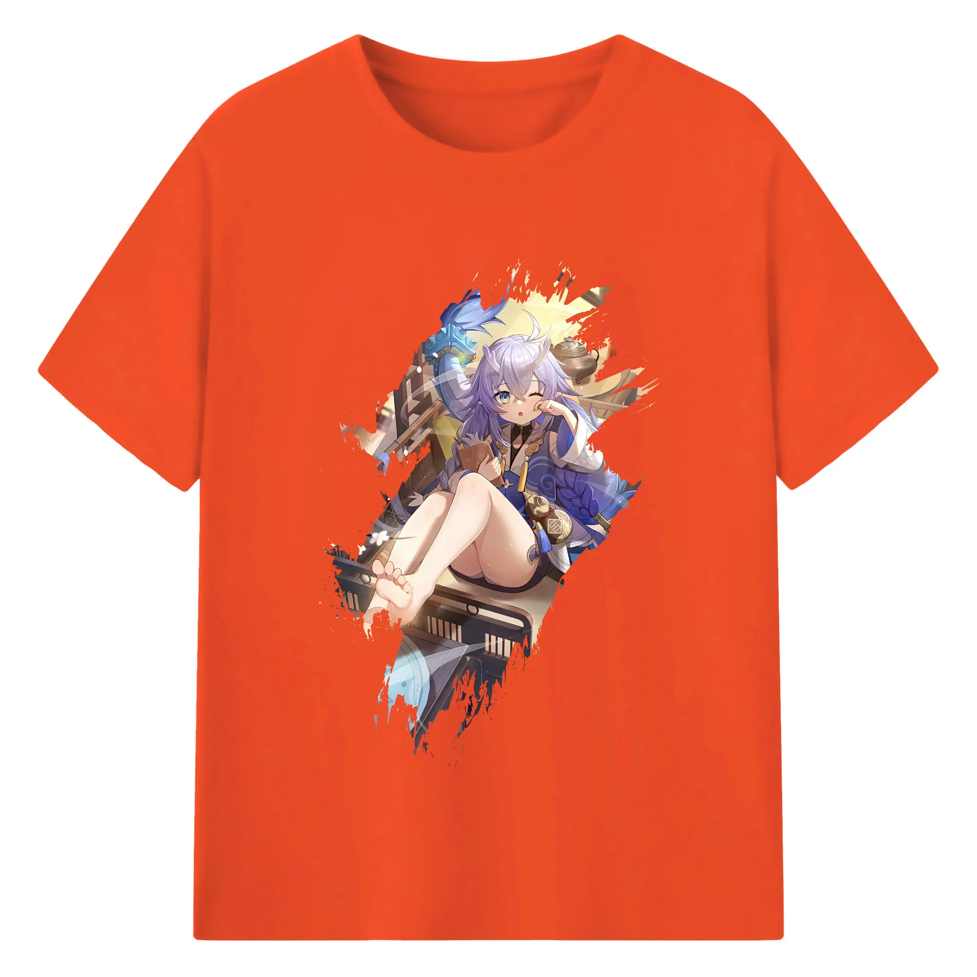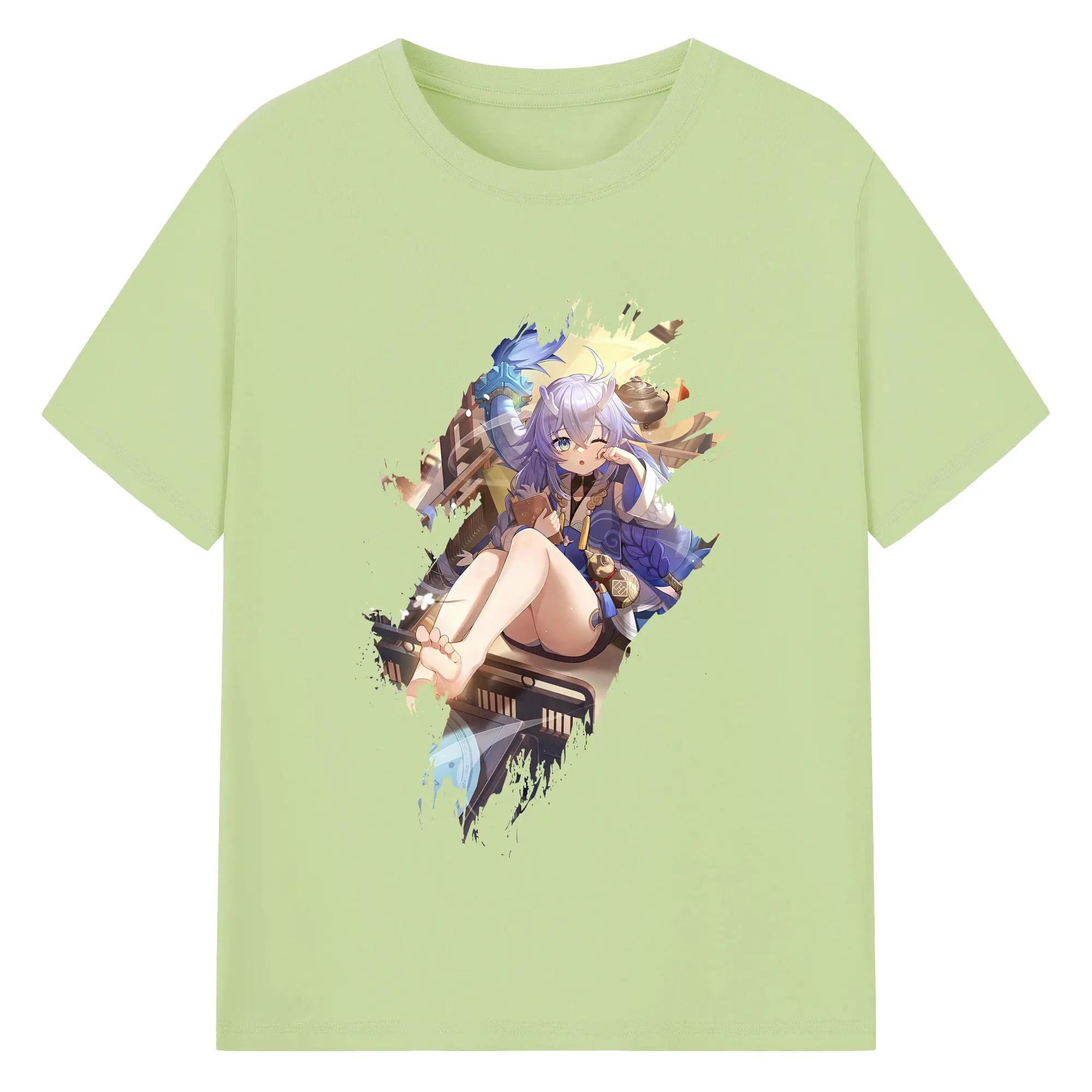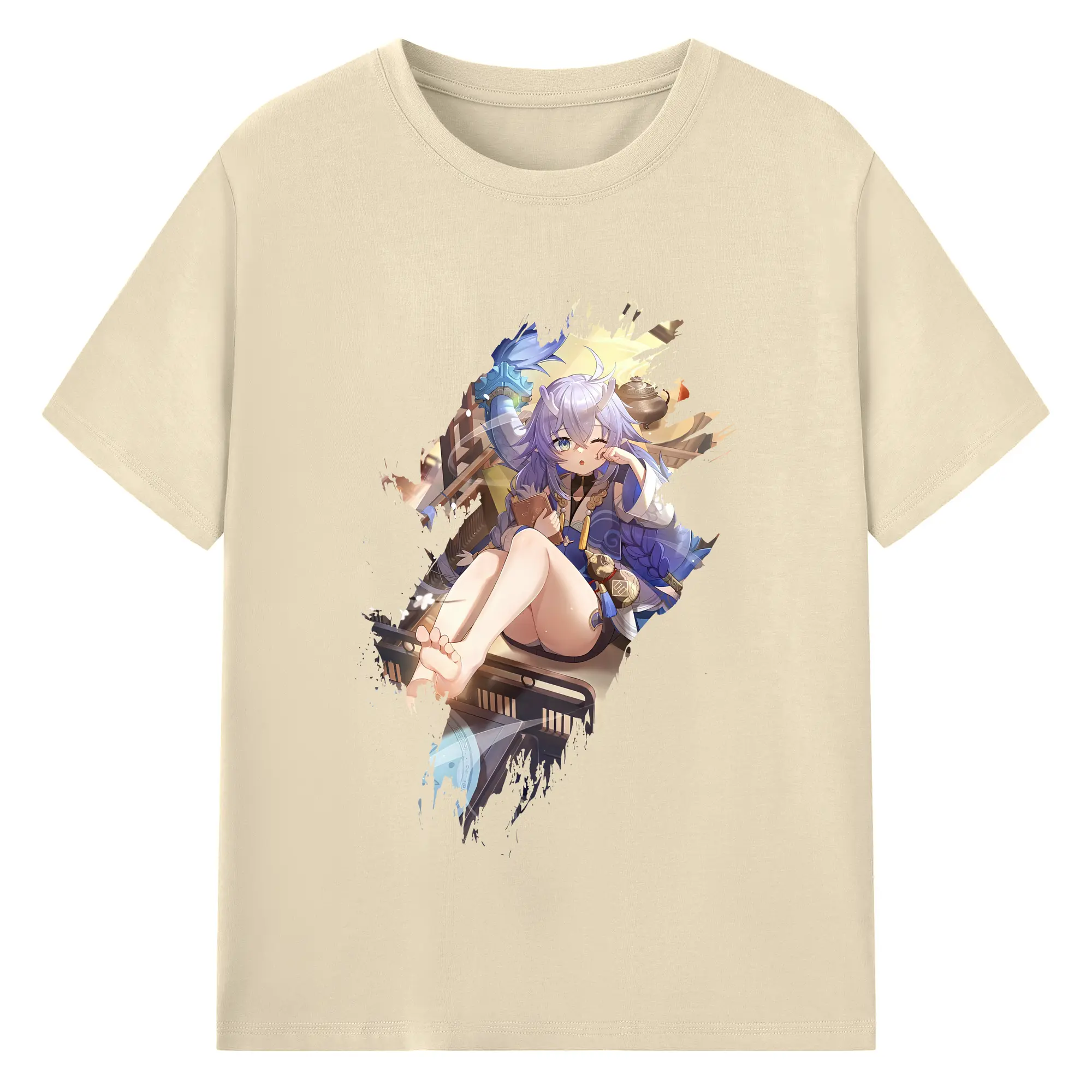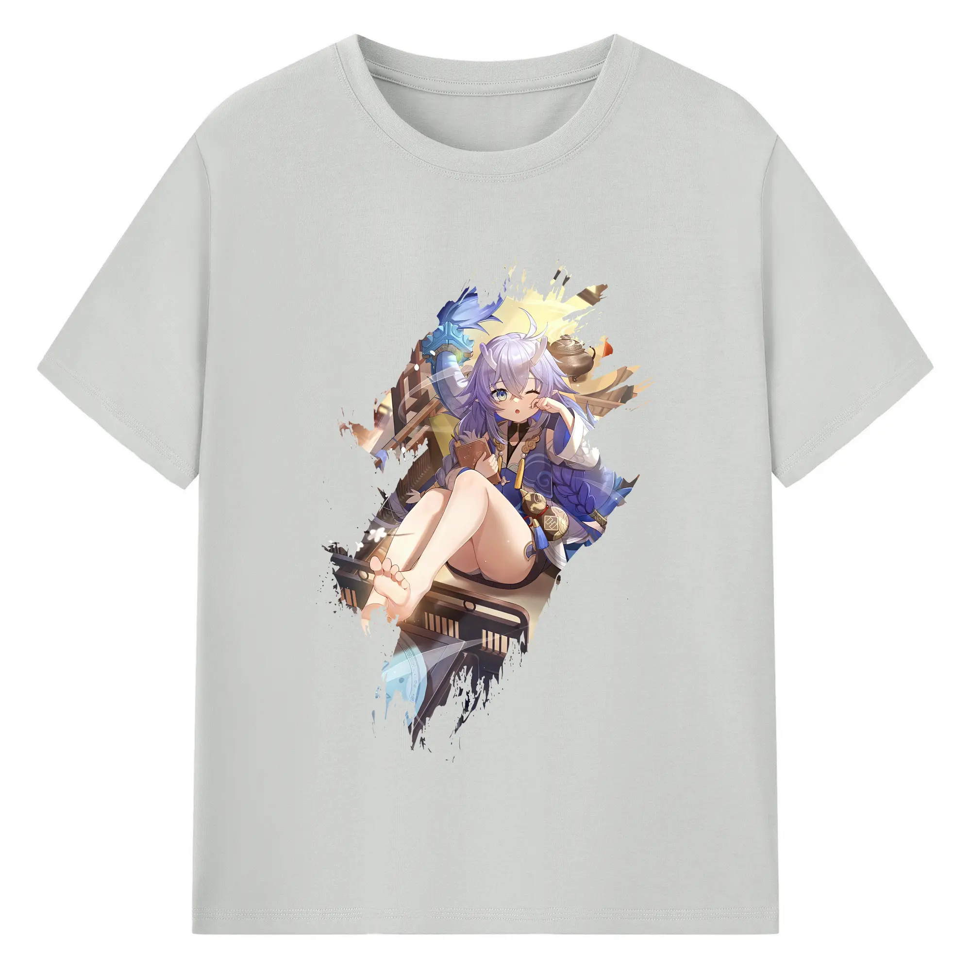 崩壊:スターレイル グッズ 白露 - 綿100% ヴィンテージ風 半袖Tシャツ ・ フロントプリント ・ 柔らか肌触り ・ 通気性 快適 ・ スポーツ カジュアル 外出用