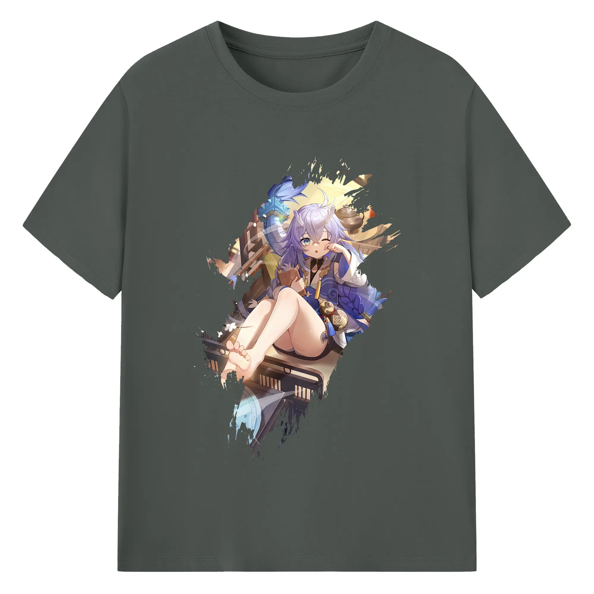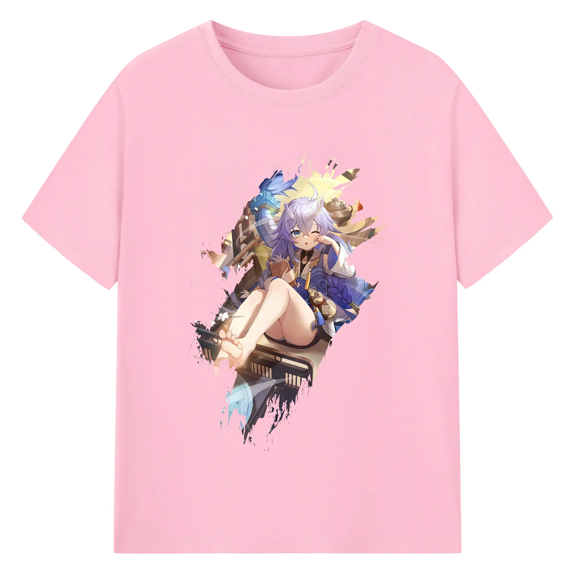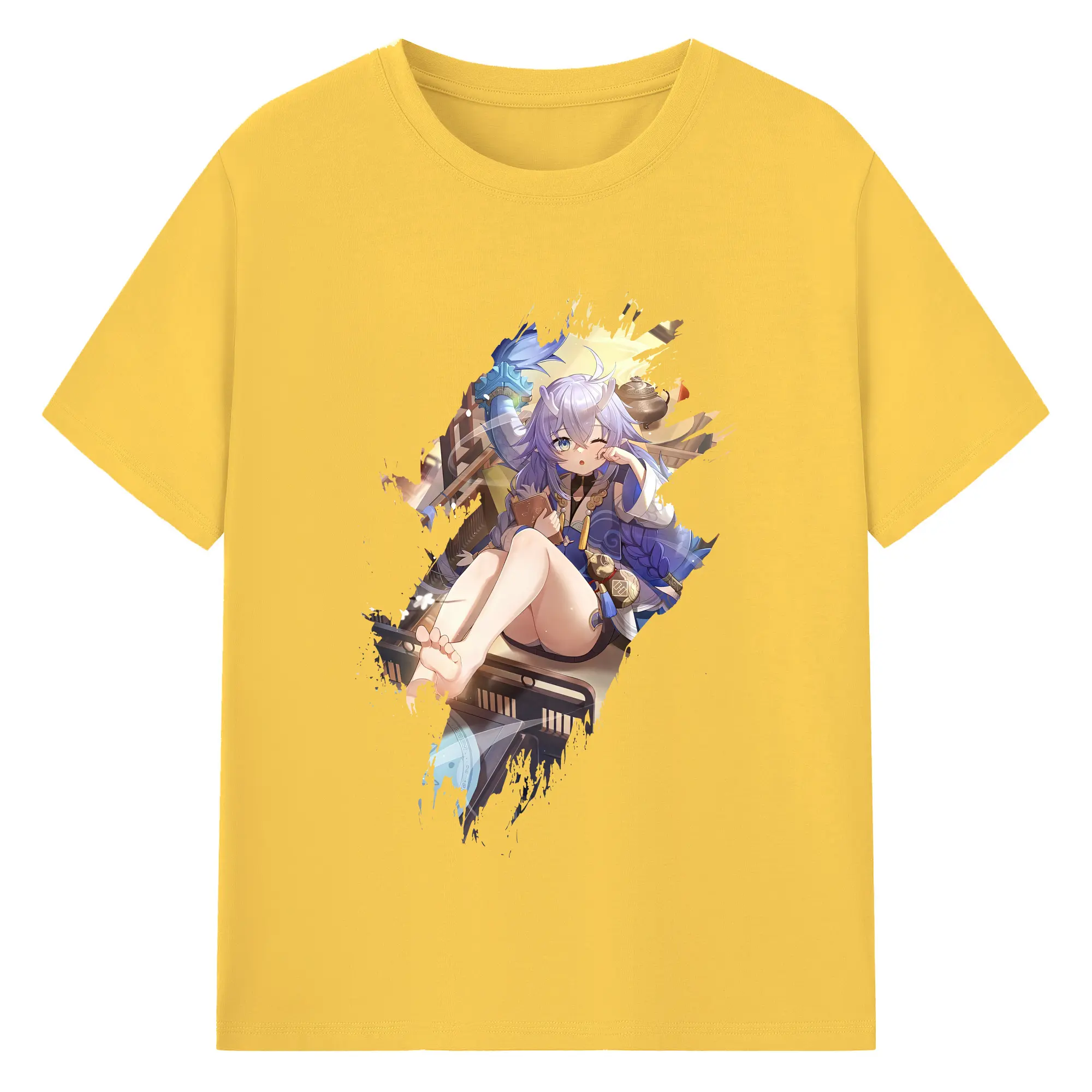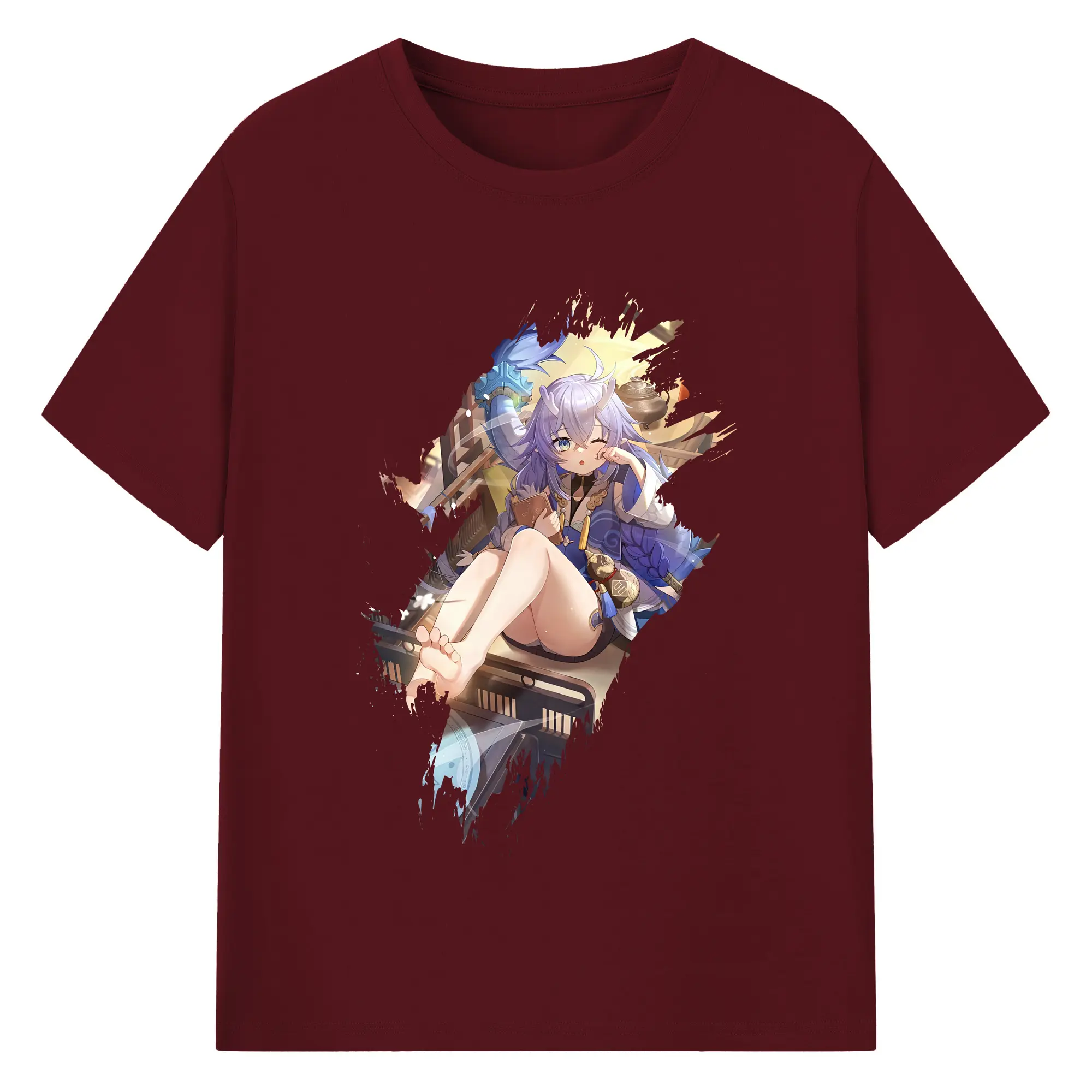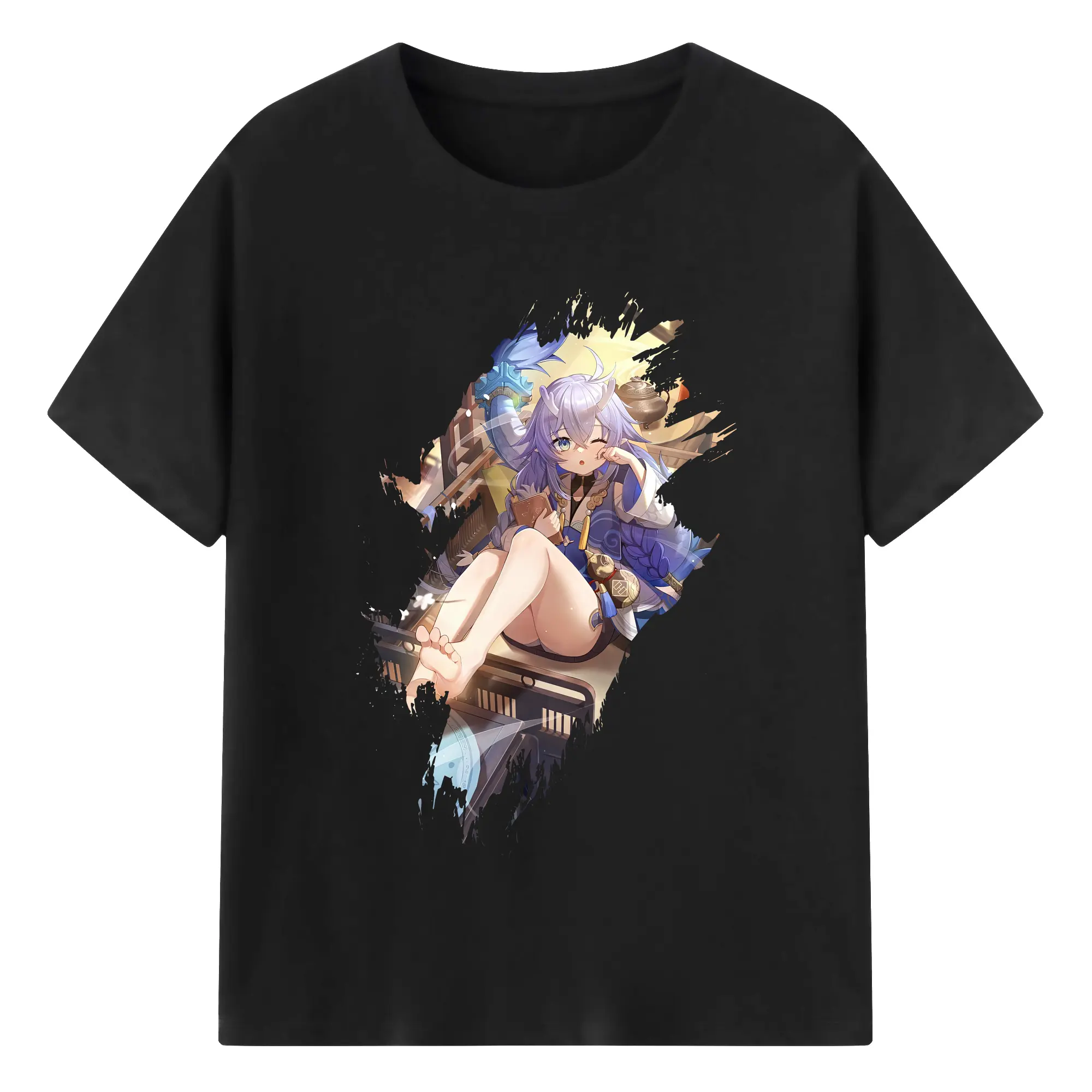 崩壊:スターレイル グッズ 白露 - 綿100% ヴィンテージ風 半袖Tシャツ ・ フロントプリント ・ 柔らか肌触り ・ 通気性 快適 ・ スポーツ カジュアル 外出用