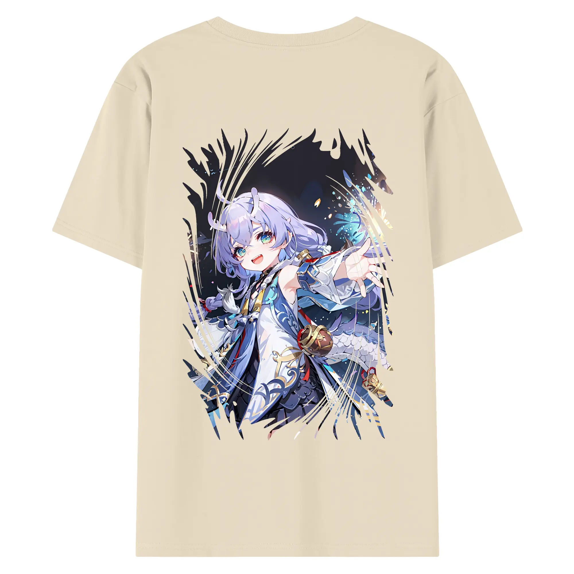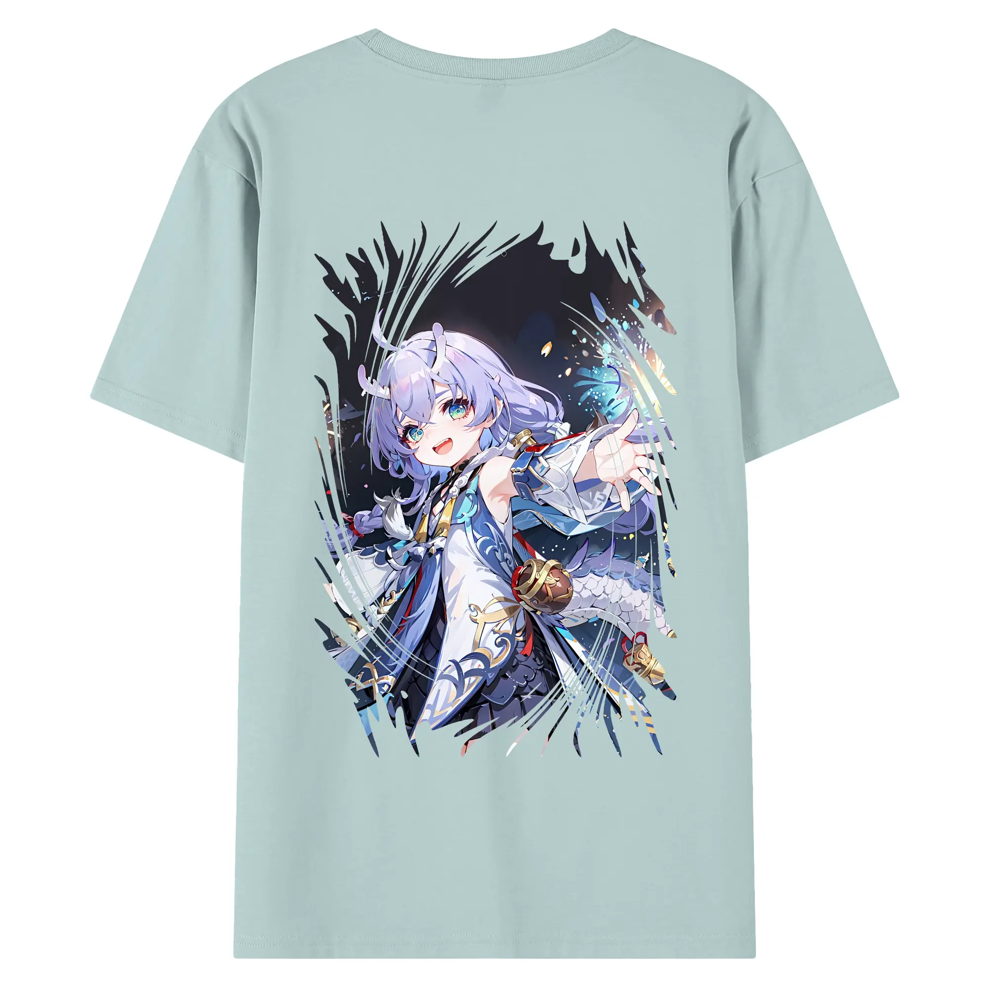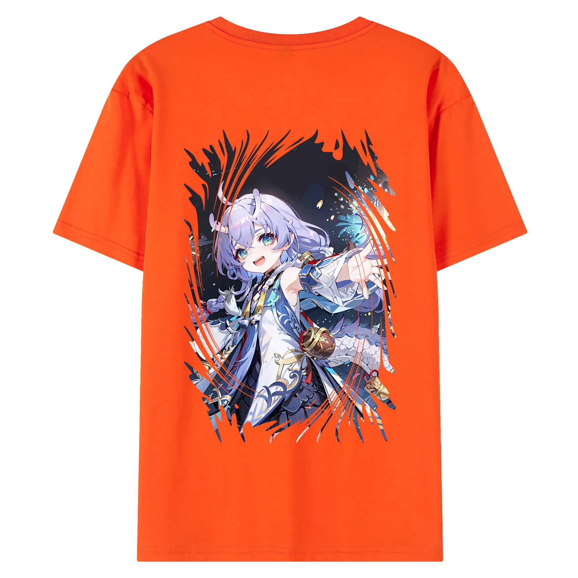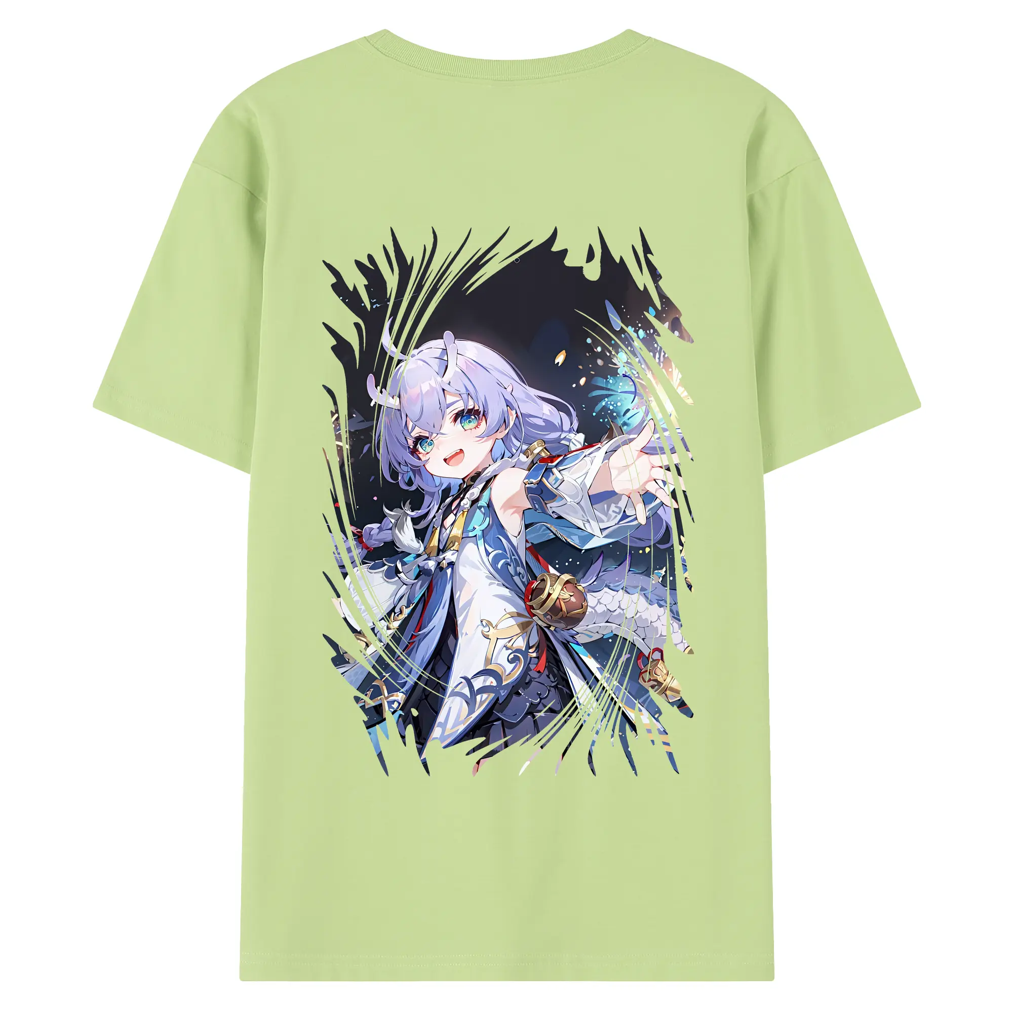 崩壊:スターレイル グッズ 白露 - 綿100% ヴィンテージ風 半袖Tシャツ ・ 背面プリント ・ 柔らか肌触り ・ 通気性 快適 ・ スポーツ カジュアル 外出用