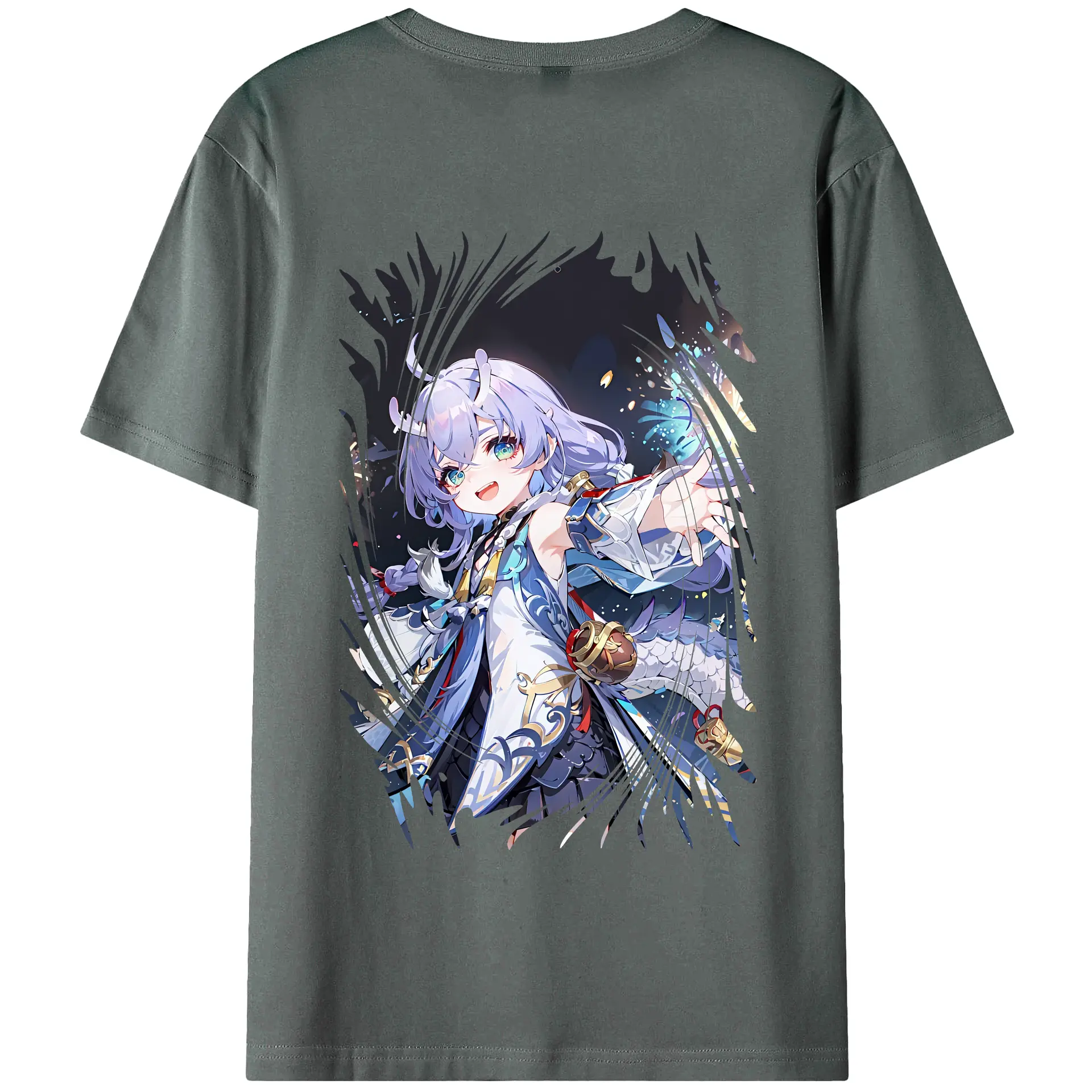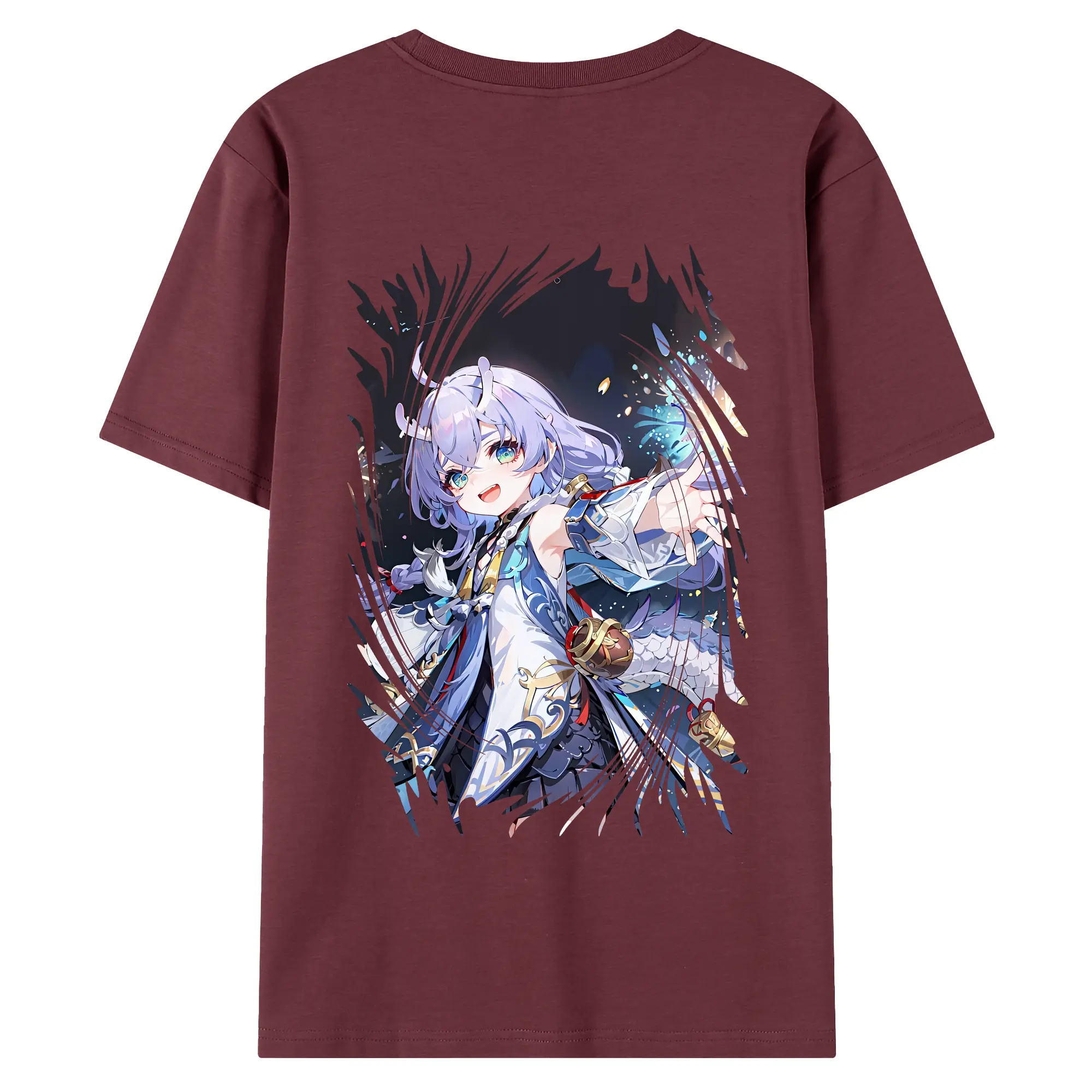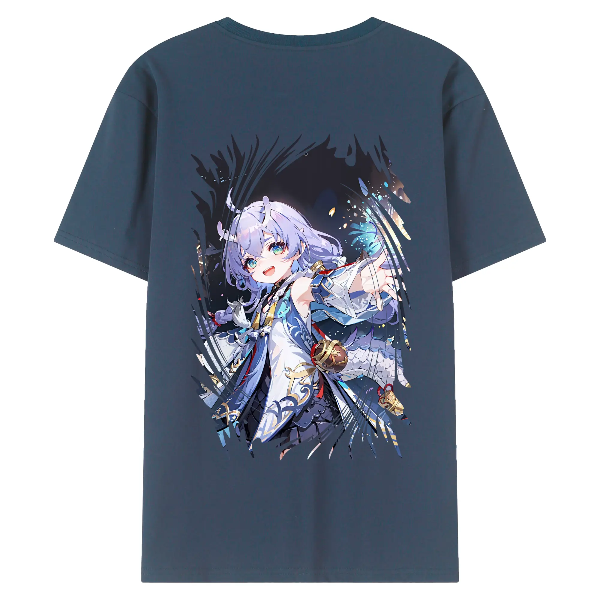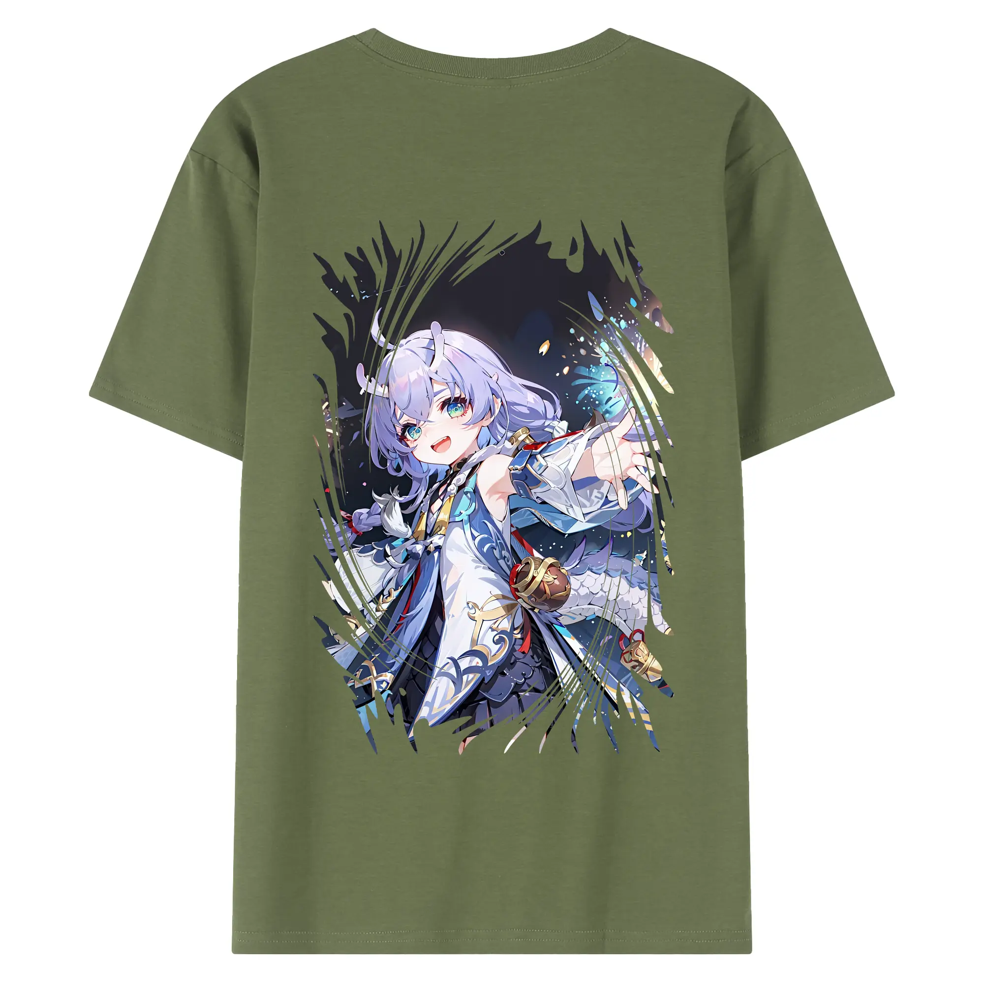 崩壊:スターレイル グッズ 白露 - 綿100% ヴィンテージ風 半袖Tシャツ ・ 背面プリント ・ 柔らか肌触り ・ 通気性 快適 ・ スポーツ カジュアル 外出用