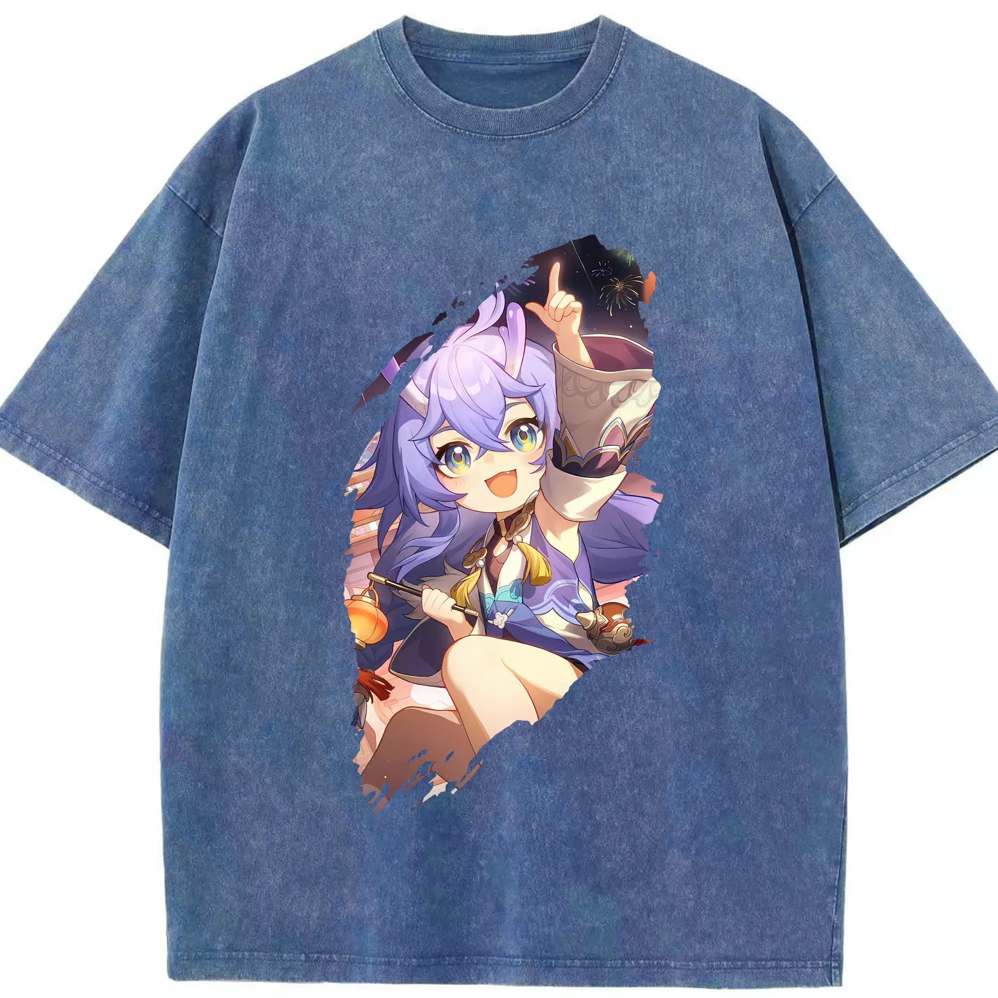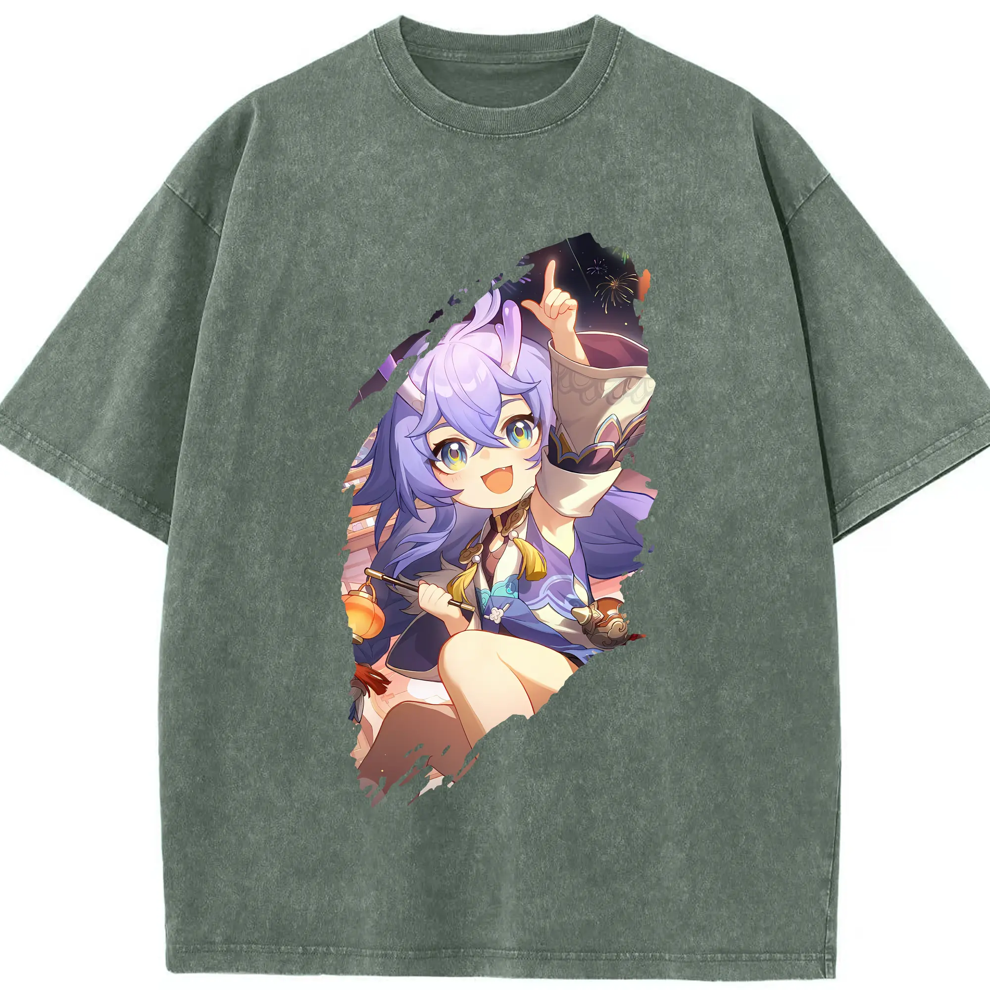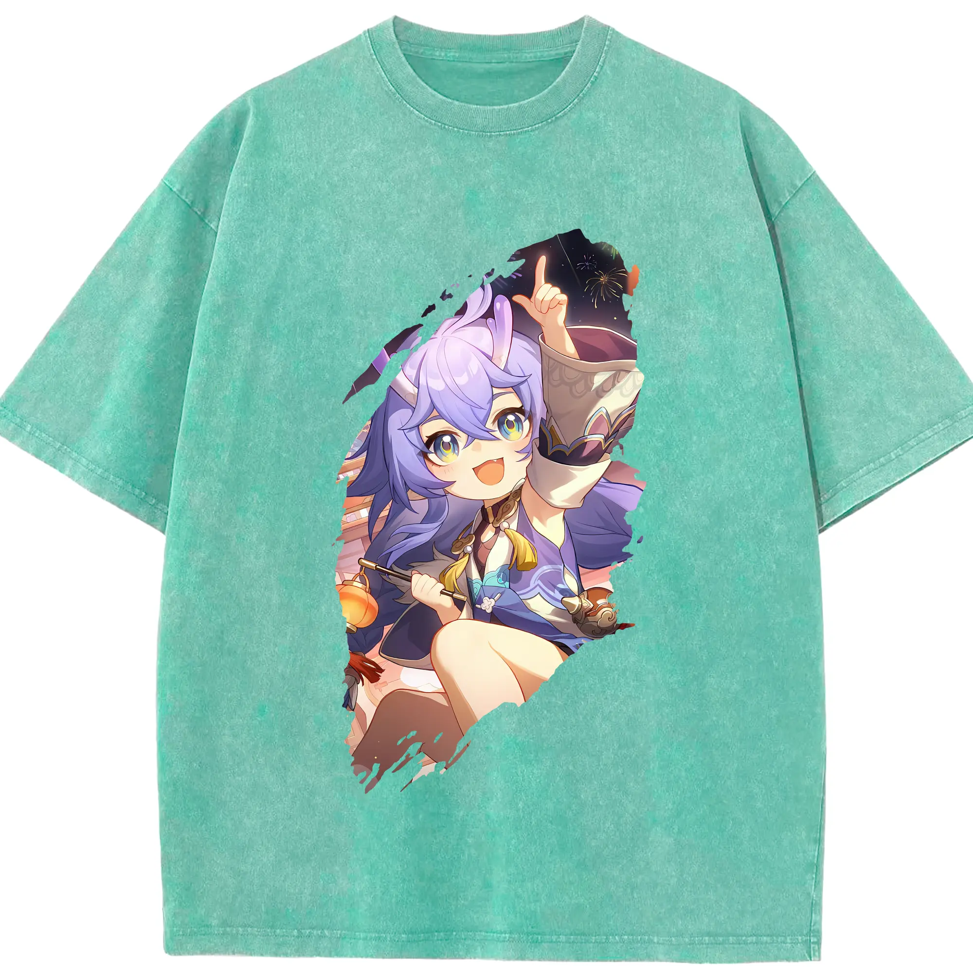 崩壊:スターレイル グッズ 白露 - 綿100% ヴィンテージ風 半袖Tシャツ ・ 背面プリント ・ 柔らか肌触り ・ 通気性 快適 ・ スポーツ カジュアル 外出用