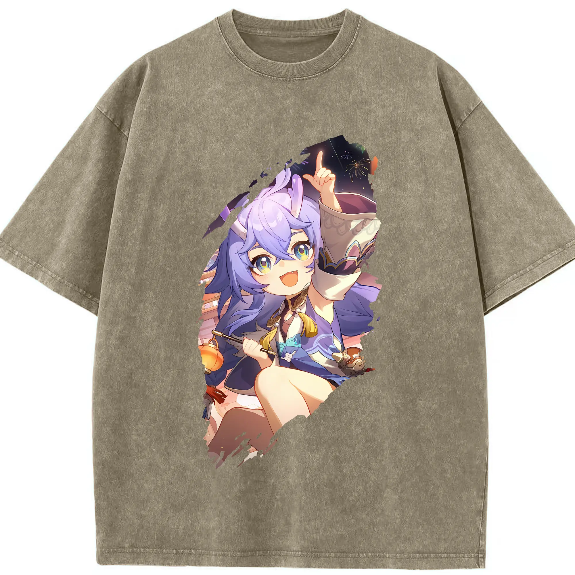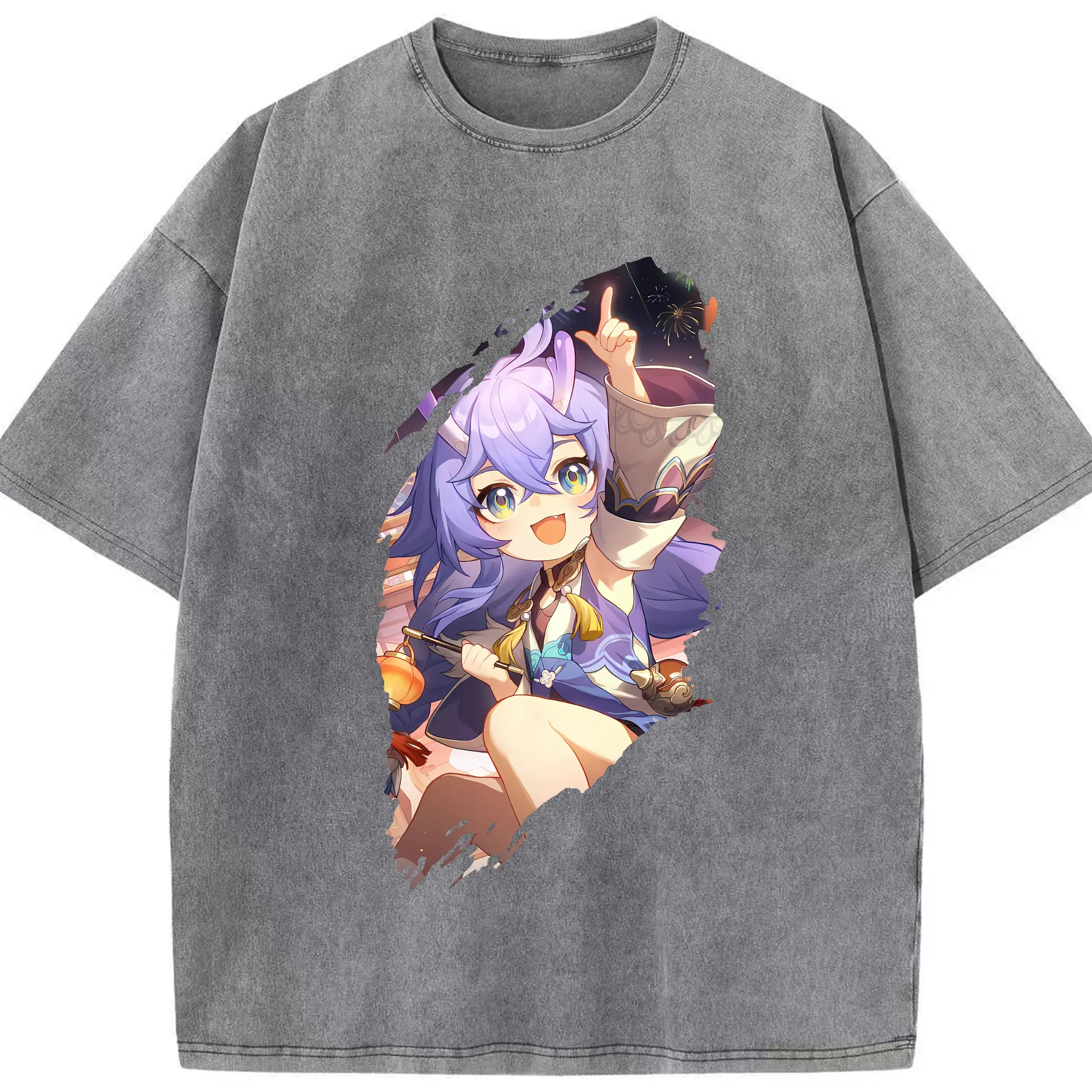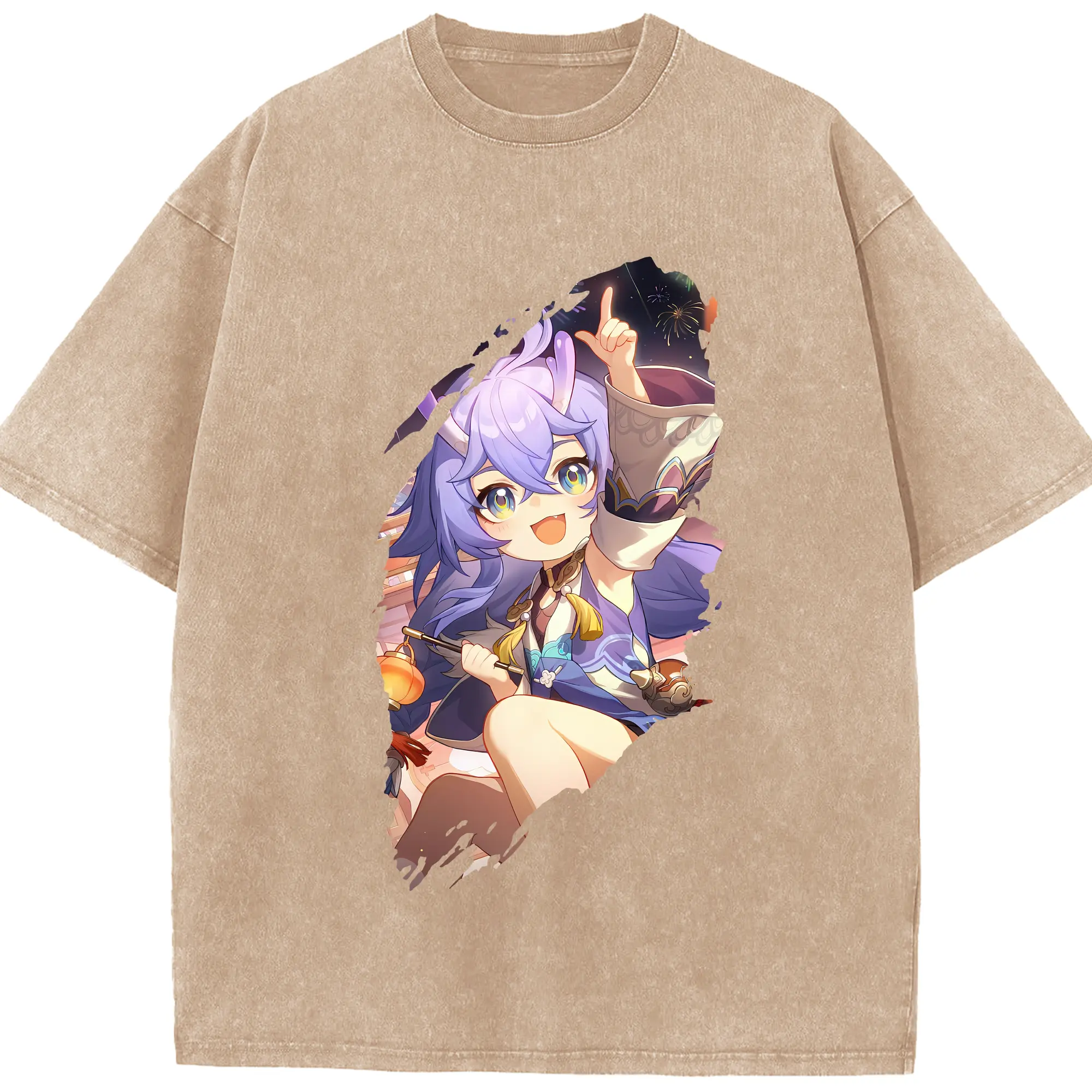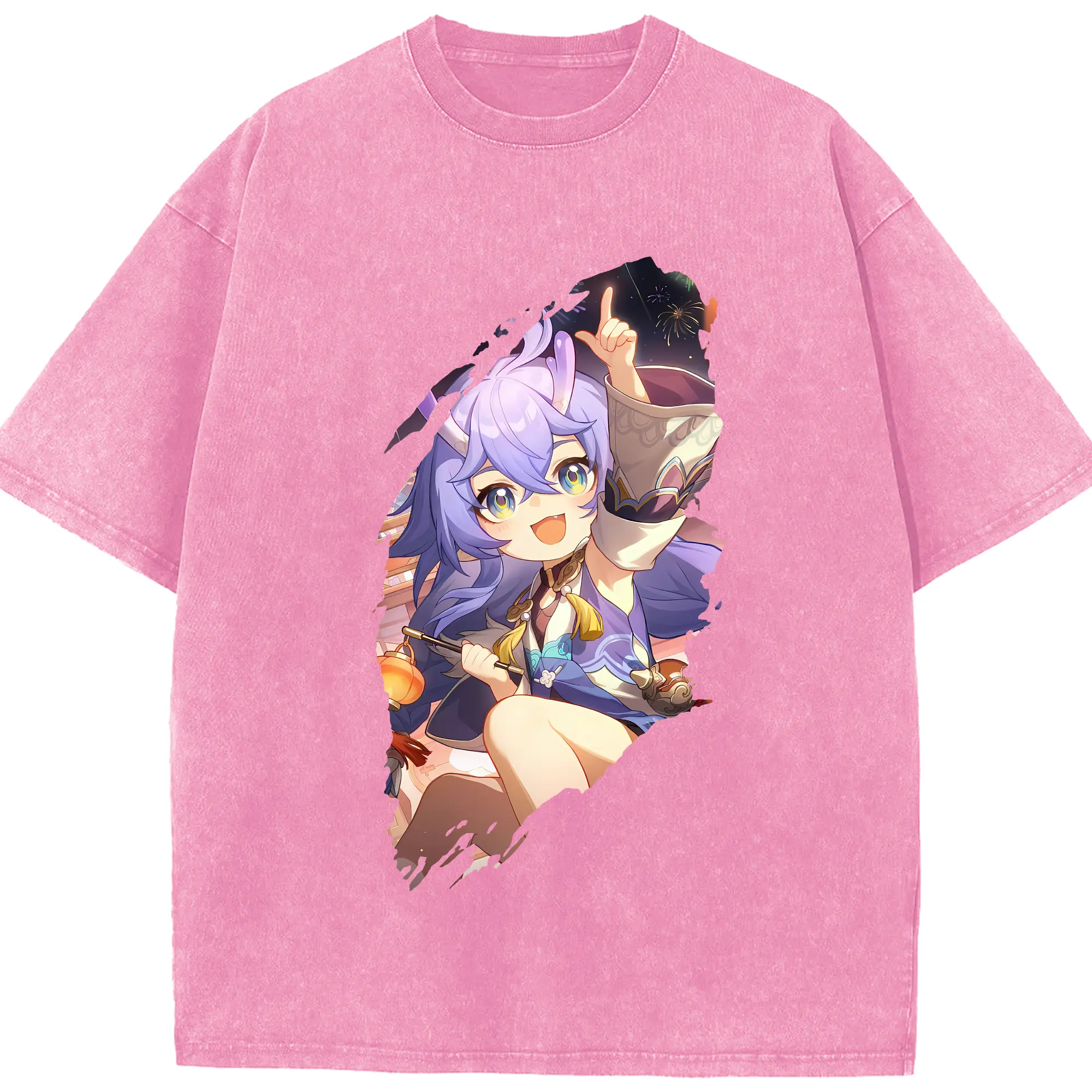 崩壊:スターレイル グッズ 白露 - 綿100% ヴィンテージ風 半袖Tシャツ ・ 背面プリント ・ 柔らか肌触り ・ 通気性 快適 ・ スポーツ カジュアル 外出用