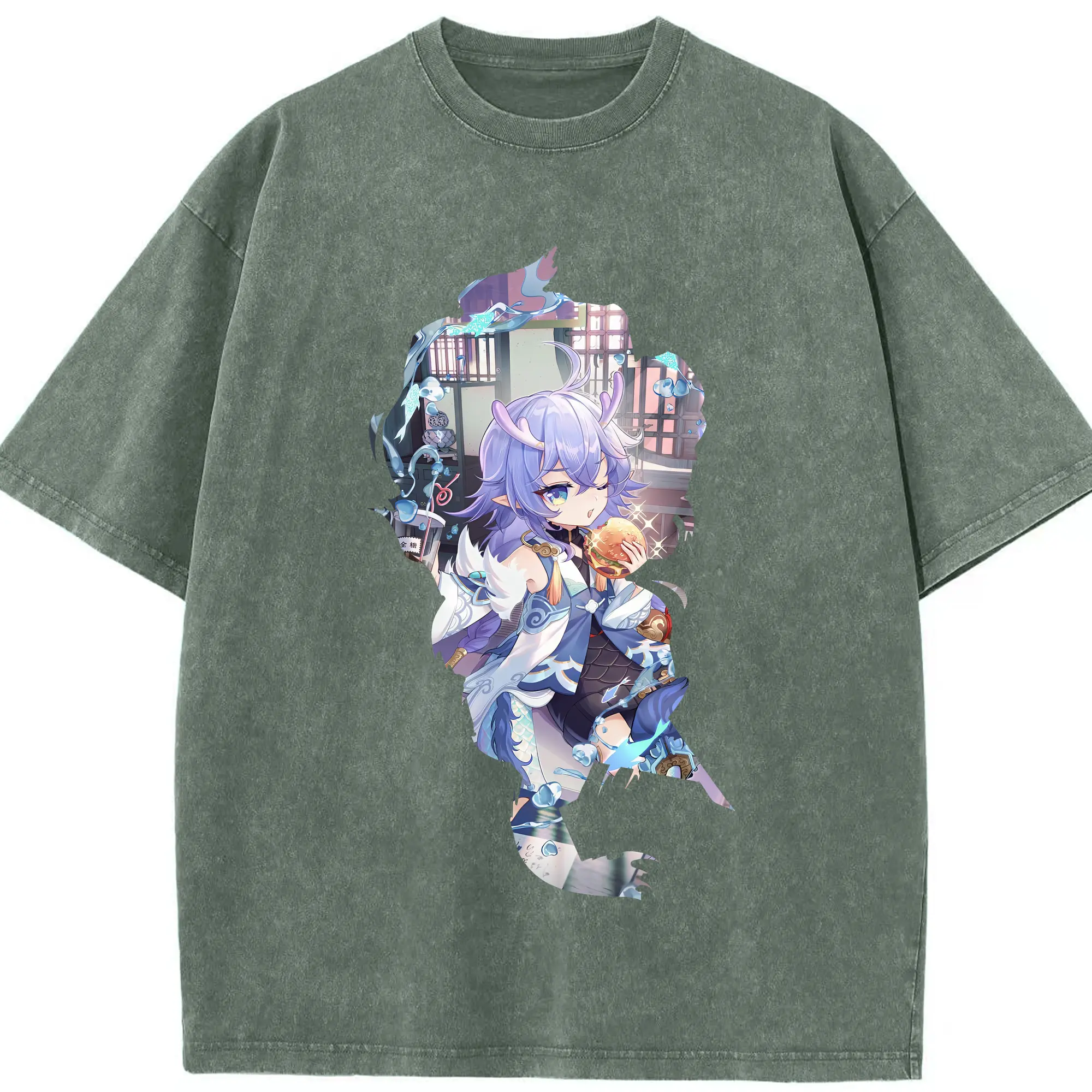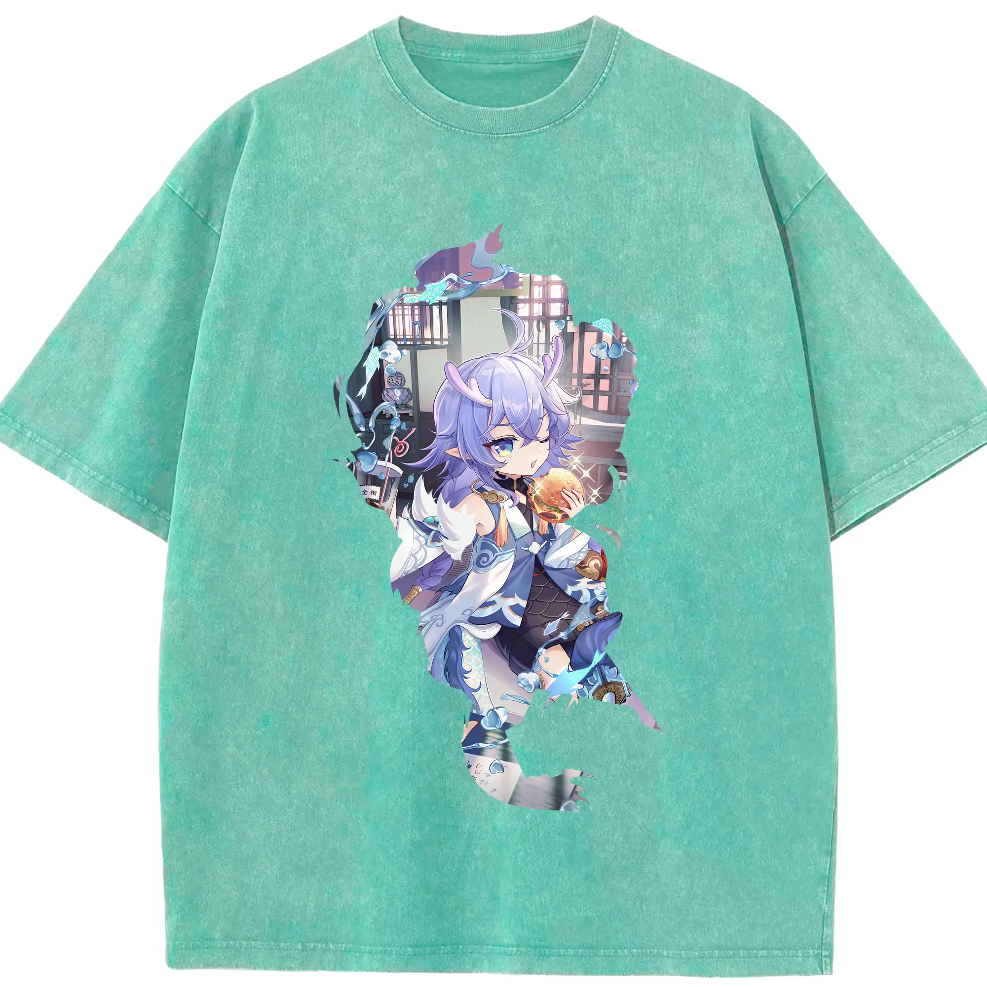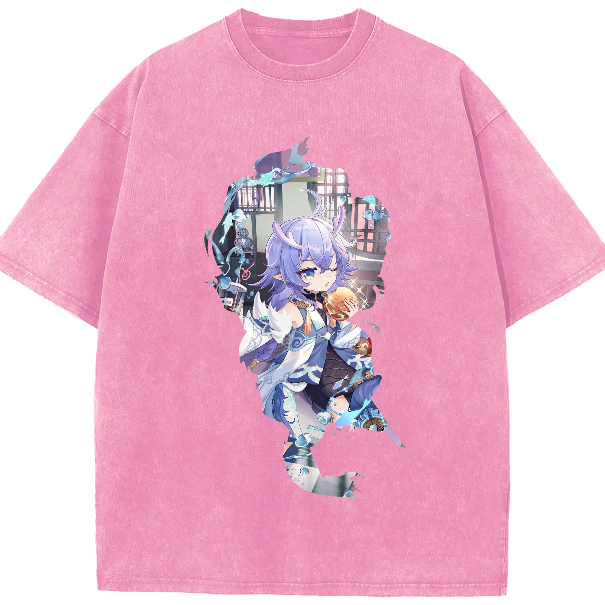 崩壊:スターレイル グッズ 白露 - 綿100% ヴィンテージ風 半袖Tシャツ ・ 背面プリント ・ 柔らか肌触り ・ 通気性 快適 ・ スポーツ カジュアル 外出用