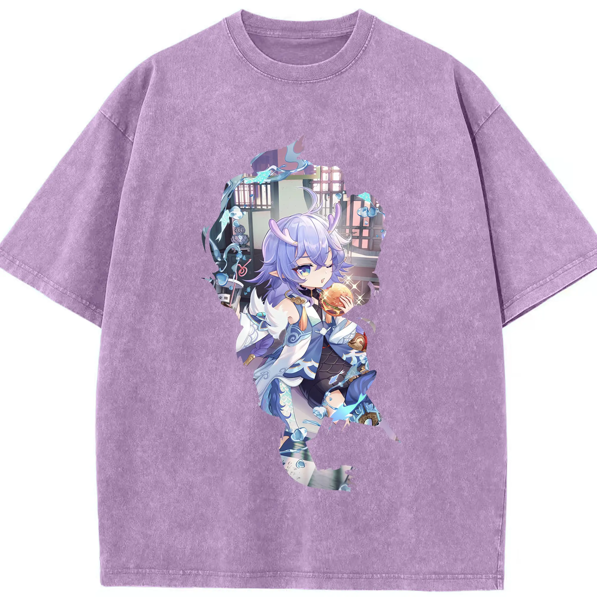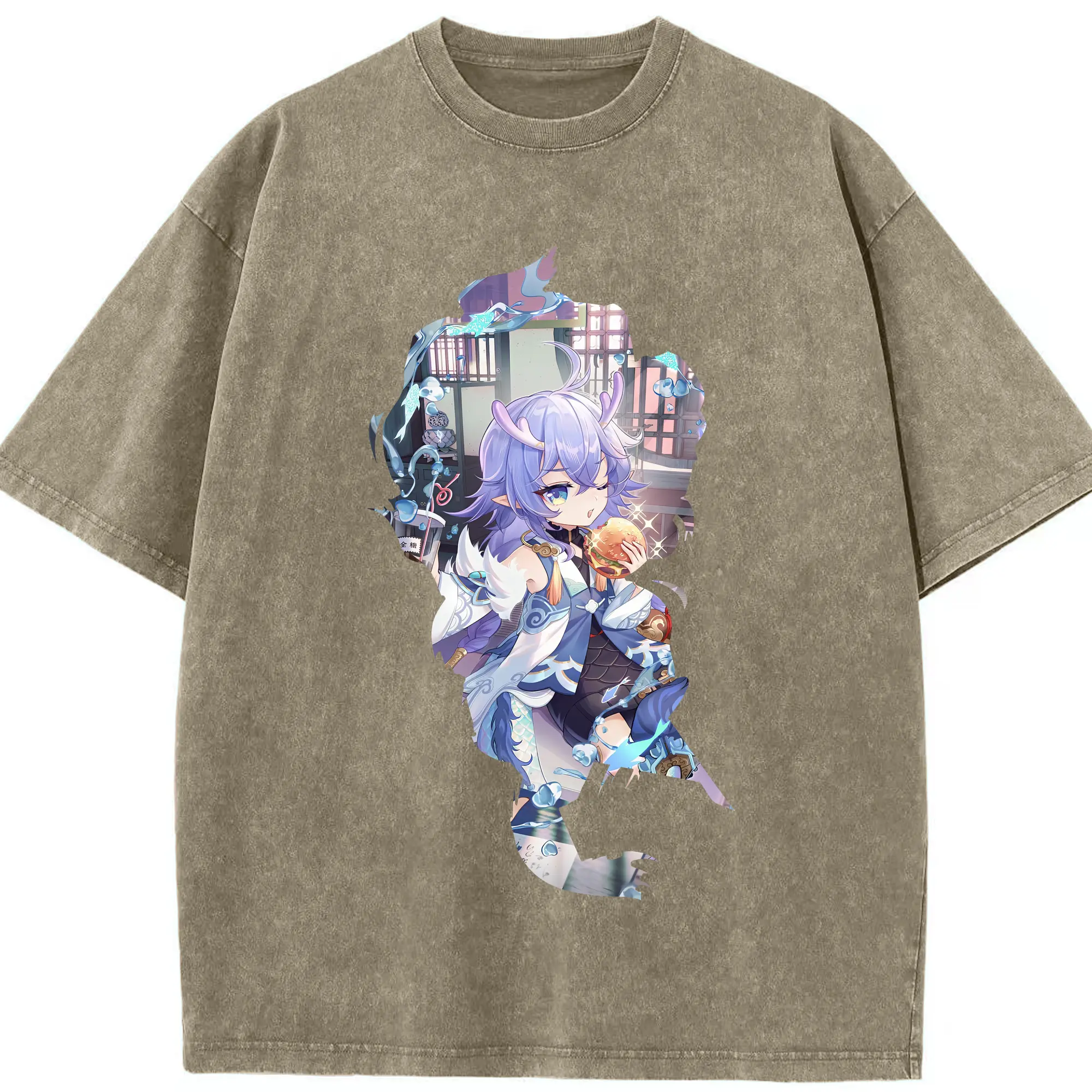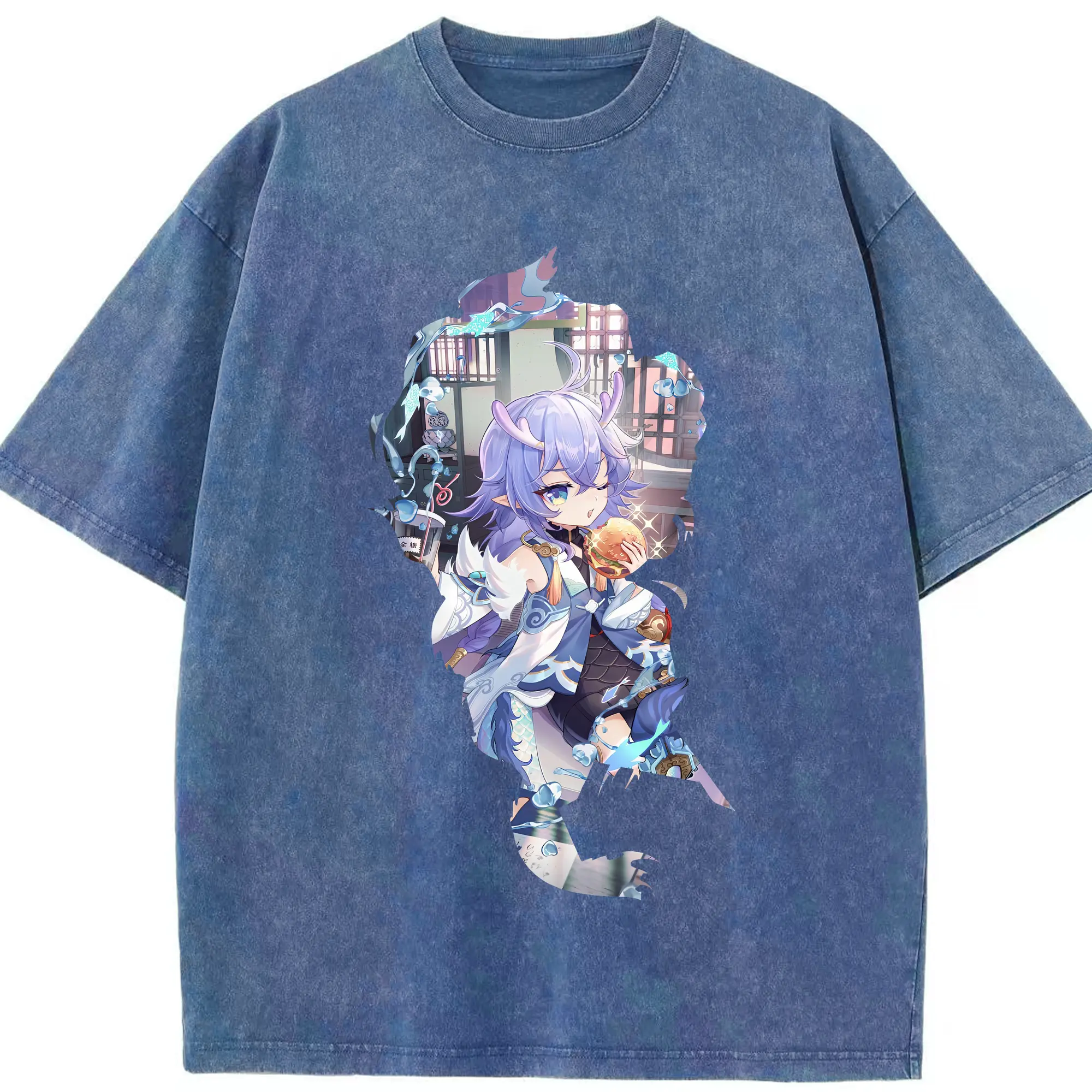 崩壊:スターレイル グッズ 白露 - 綿100% ヴィンテージ風 半袖Tシャツ ・ 背面プリント ・ 柔らか肌触り ・ 通気性 快適 ・ スポーツ カジュアル 外出用